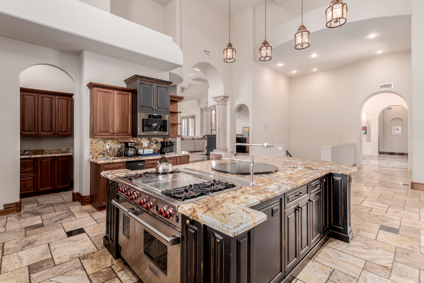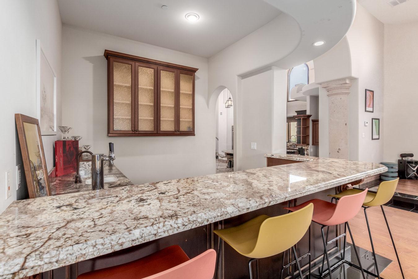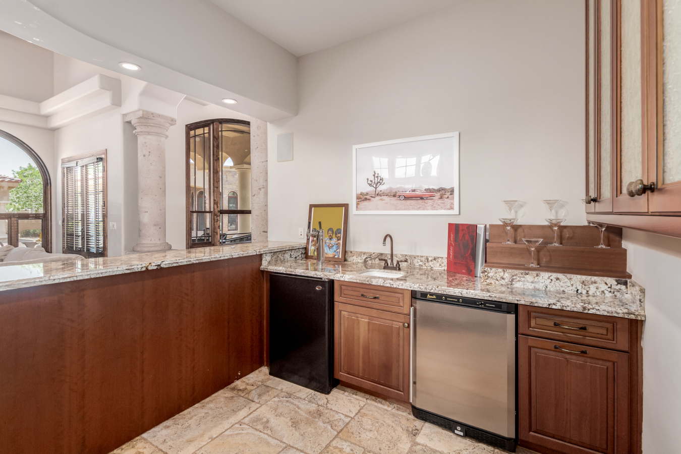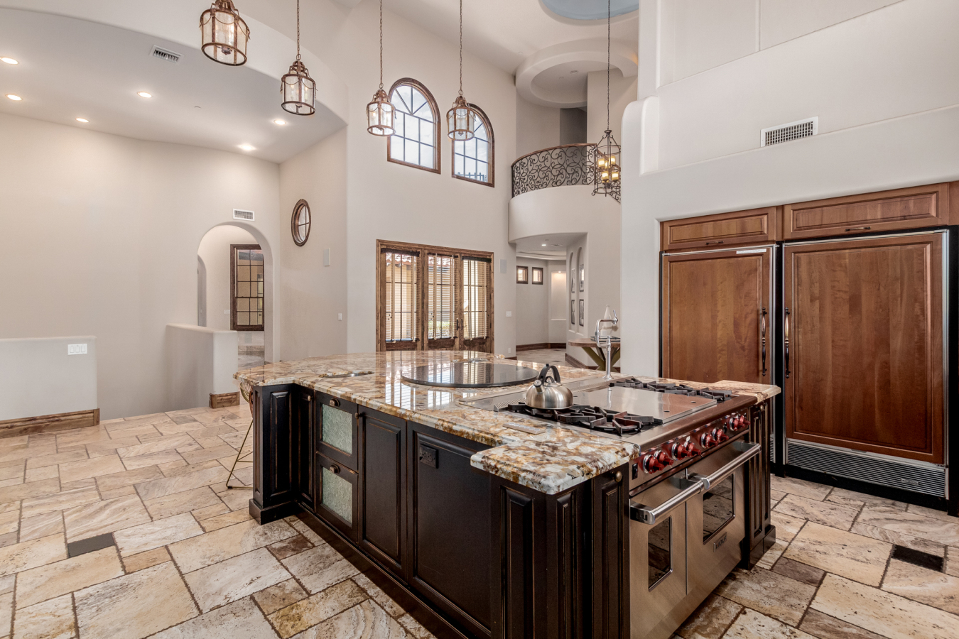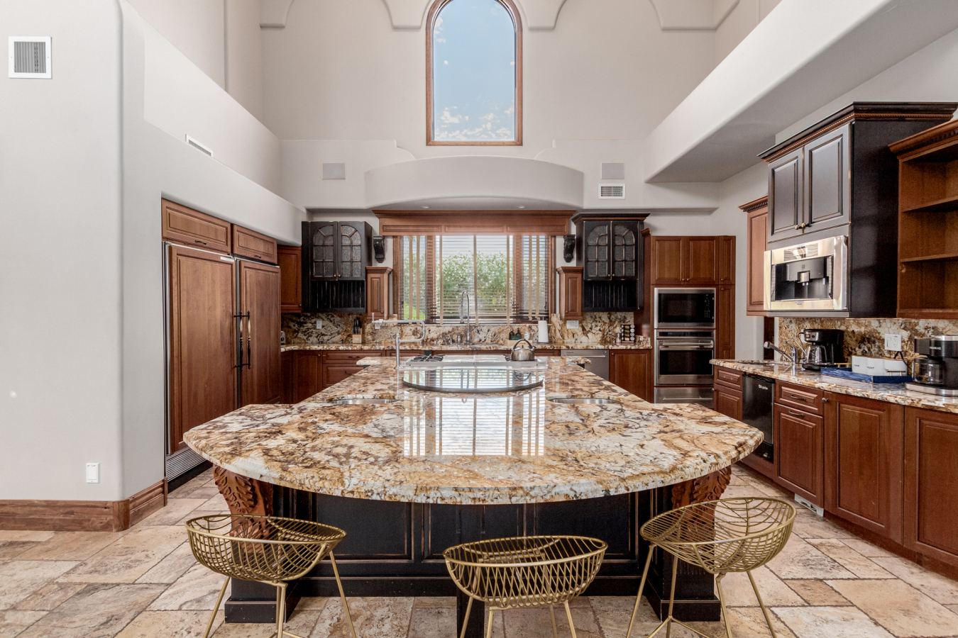 Nestled within the prestigious enclave of Paradise Valley, this home is luxury living at its finest. Grand courtyard entrance w/outdoor gas fireplace. Gourmet kitchen outfitted with Wolff gas stove, Miele Espresso machine, Sub-Zero Refrigerator, granite countertops with built in beverage ice tubs, pantry. Office w/private entrance, & ensuite. Lavish private primary retreat featuring jet tub, double entrance steam shower, his and hers walk-in closets. Basement (1,745 sqft) equipped w/media room, climate-controlled 900 bottle wine cellar, billiard room with bar, bathroom and bedroom. Outdoor living w/putting green, sports court, grotto slide pool, spa, gazebo w/kitchen. Detached casita w/fitness room, infrared sauna, hair salon, 2 baths,1 bdrm, kitchen. Also, for lease $19,000. The chef's kitchen is comprised of wood cabinetry w/crown moulding, travertine stone flooring, a butler's pantry, granite counters, heavy duty stainless steel appliances, and a large prep island w/a breakfast bar.