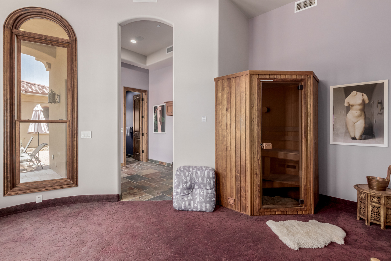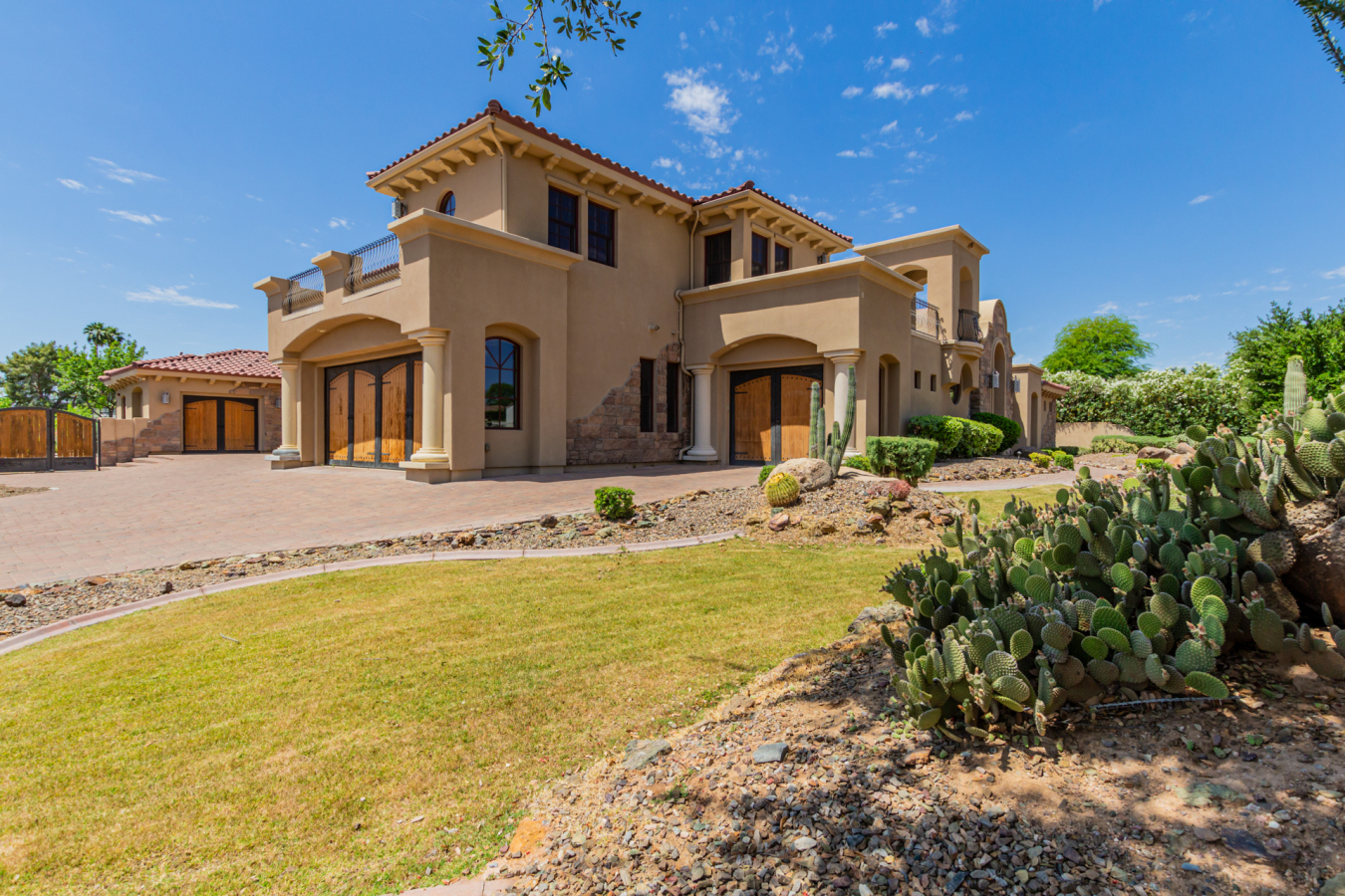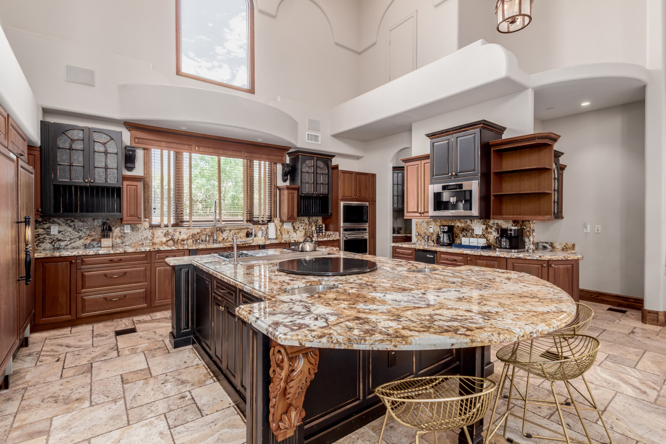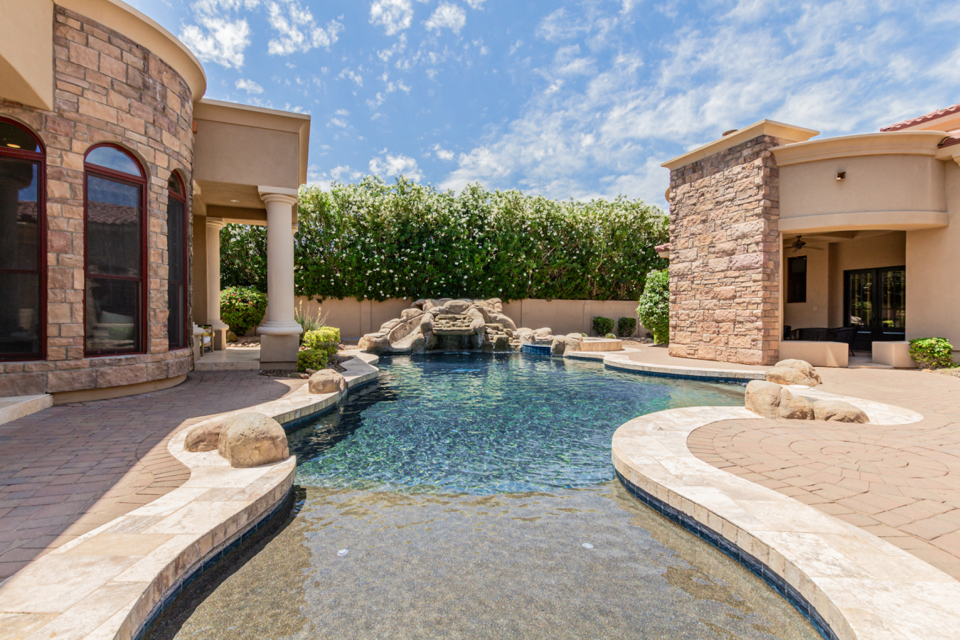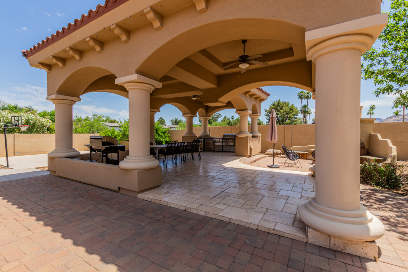 Nestled within the prestigious enclave of Paradise Valley, this home is luxury living at its finest. Grand courtyard entrance w/outdoor gas fireplace. Gourmet kitchen outfitted with Wolff gas stove, Miele Espresso machine, Sub-Zero Refrigerator, granite countertops with built in beverage ice tubs, pantry. Office w/private entrance, & ensuite. Lavish private primary retreat featuring jet tub, double entrance steam shower, his and hers walk-in closets. Basement (1,745 sqft) equipped w/media room, climate-controlled 900 bottle wine cellar, billiard room with bar, bathroom and bedroom. Outdoor living w/putting green, sports court, grotto slide pool, spa, gazebo w/kitchen. Detached casita w/fitness room, infrared sauna, hair salon, 2 baths,1 bdrm, kitchen. Also, for lease $19,000. The chef's kitchen is comprised of wood cabinetry w/crown moulding, travertine stone flooring, a butler's pantry, granite counters, heavy duty stainless steel appliances, and a large prep island w/a breakfast bar.