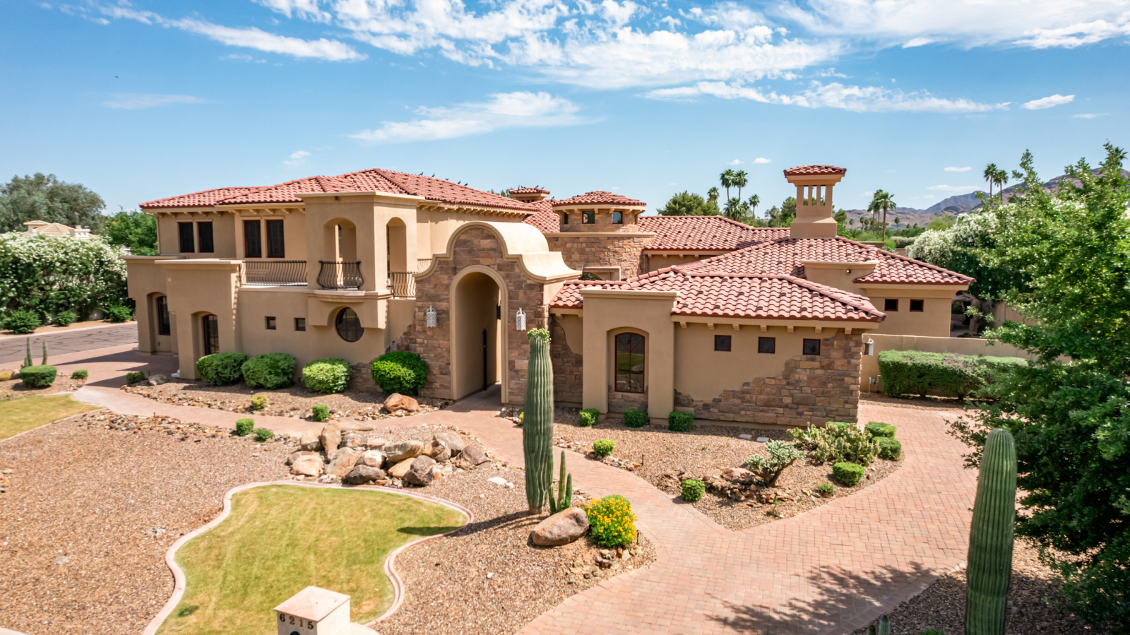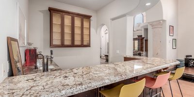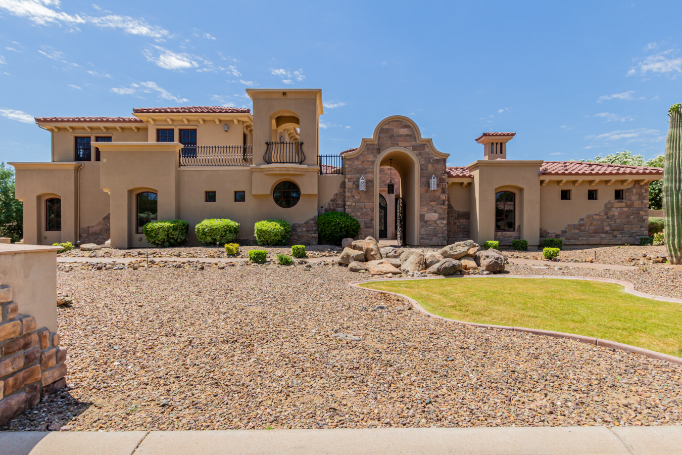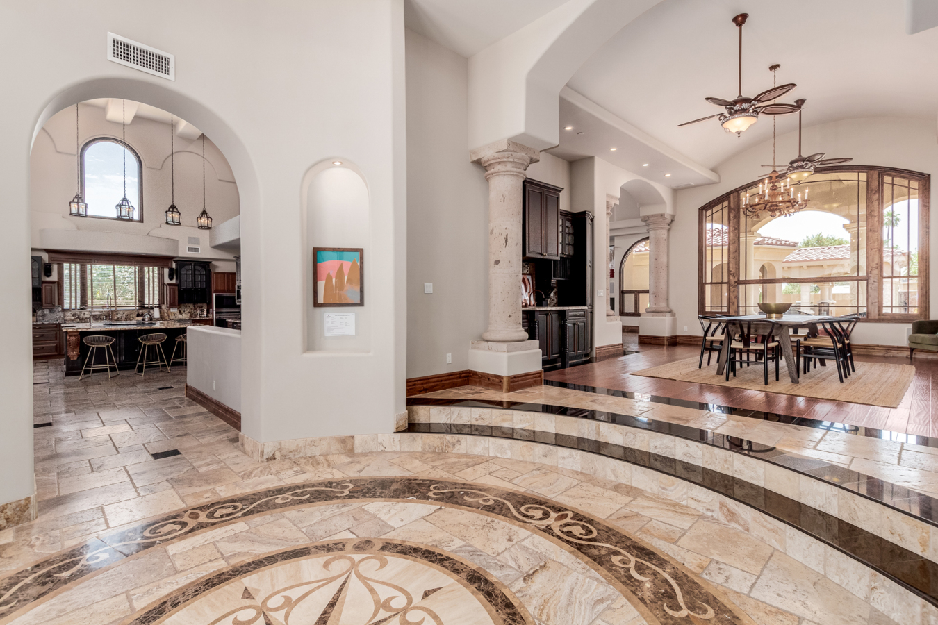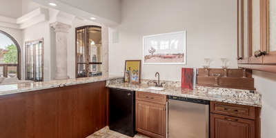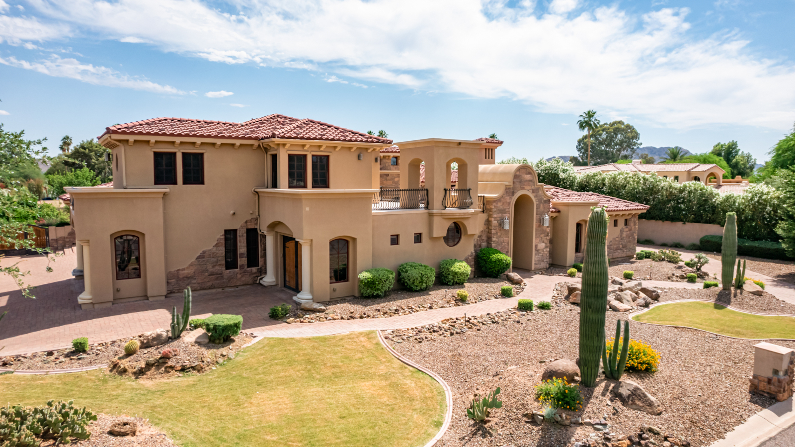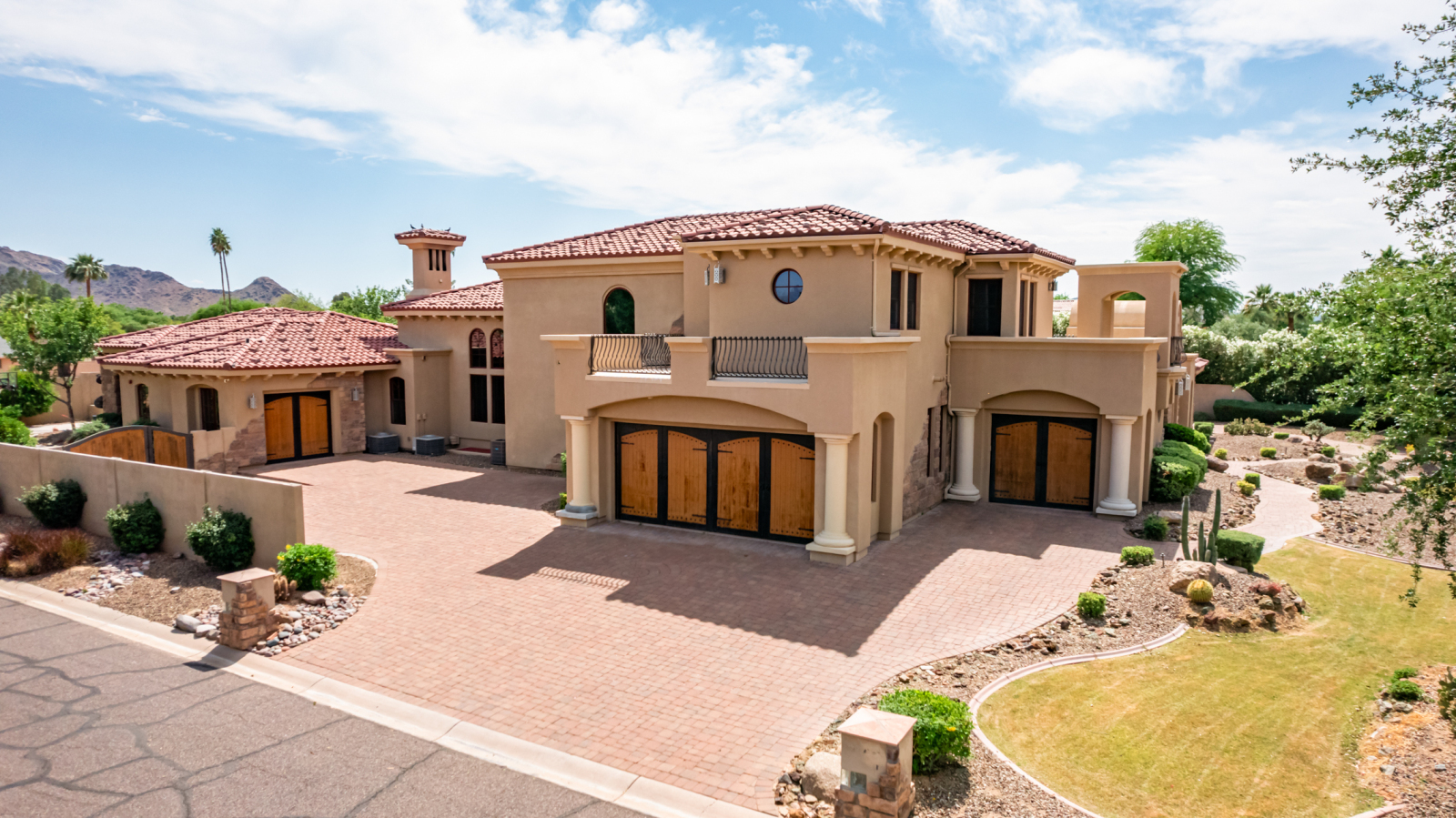 Nestled within the prestigious enclave of Paradise Valley, this home is luxury living at its finest. Grand courtyard entrance w/outdoor gas fireplace. Gourmet kitchen outfitted with Wolff gas stove, Miele Espresso machine, Sub-Zero Refrigerator, granite countertops with built in beverage ice tubs, pantry. Office w/private entrance, & ensuite. Lavish private primary retreat featuring jet tub, double entrance steam shower, his and hers walk-in closets. Basement (1,745 sqft) equipped w/media room, climate-controlled 900 bottle wine cellar, billiard room with bar, bathroom and bedroom. Outdoor living w/putting green, sports court, grotto slide pool, spa, gazebo w/kitchen. Detached casita w/fitness room, infrared sauna, hair salon, 2 baths,1 bdrm, kitchen. Also, for lease $19,000. The chef's kitchen is comprised of wood cabinetry w/crown moulding, travertine stone flooring, a butler's pantry, granite counters, heavy duty stainless steel appliances, and a large prep island w/a breakfast bar.