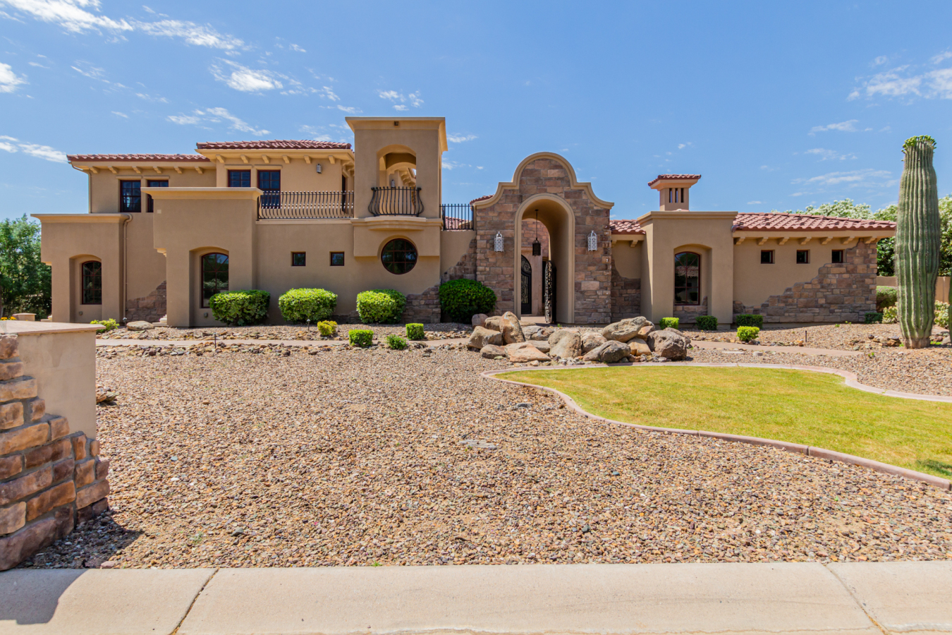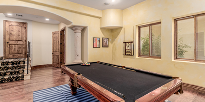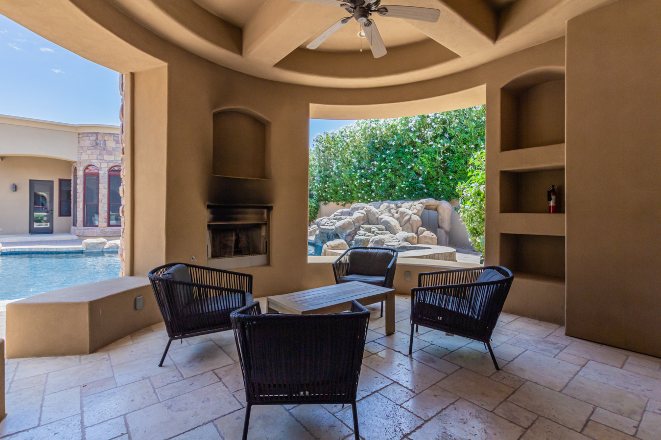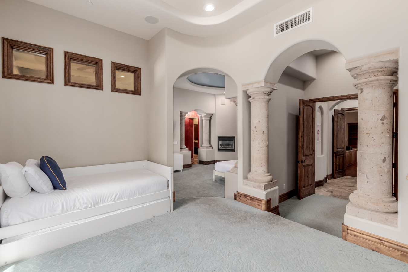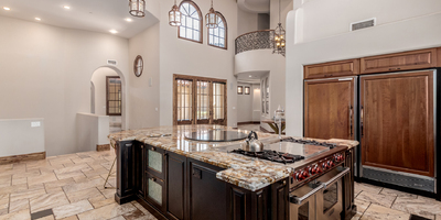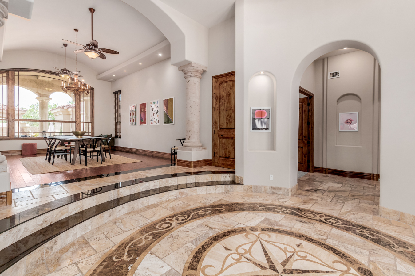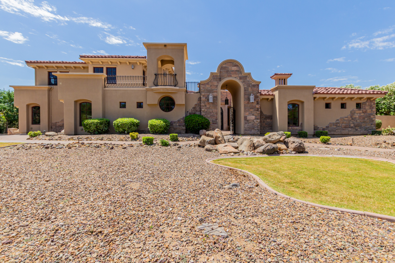 Nestled within the prestigious enclave of Paradise Valley, this home is luxury living at its finest. Grand courtyard entrance w/outdoor gas fireplace. Gourmet kitchen outfitted with Wolff gas stove, Miele Espresso machine, Sub-Zero Refrigerator, granite countertops with built in beverage ice tubs, pantry. Office w/private entrance, & ensuite. Lavish private primary retreat featuring jet tub, double entrance steam shower, his and hers walk-in closets. Basement (1,745 sqft) equipped w/media room, climate-controlled 900 bottle wine cellar, billiard room with bar, bathroom and bedroom. Outdoor living w/putting green, sports court, grotto slide pool, spa, gazebo w/kitchen. Detached casita w/fitness room, infrared sauna, hair salon, 2 baths,1 bdrm, kitchen. Also, for lease $19,000. The chef's kitchen is comprised of wood cabinetry w/crown moulding, travertine stone flooring, a butler's pantry, granite counters, heavy duty stainless steel appliances, and a large prep island w/a breakfast bar.