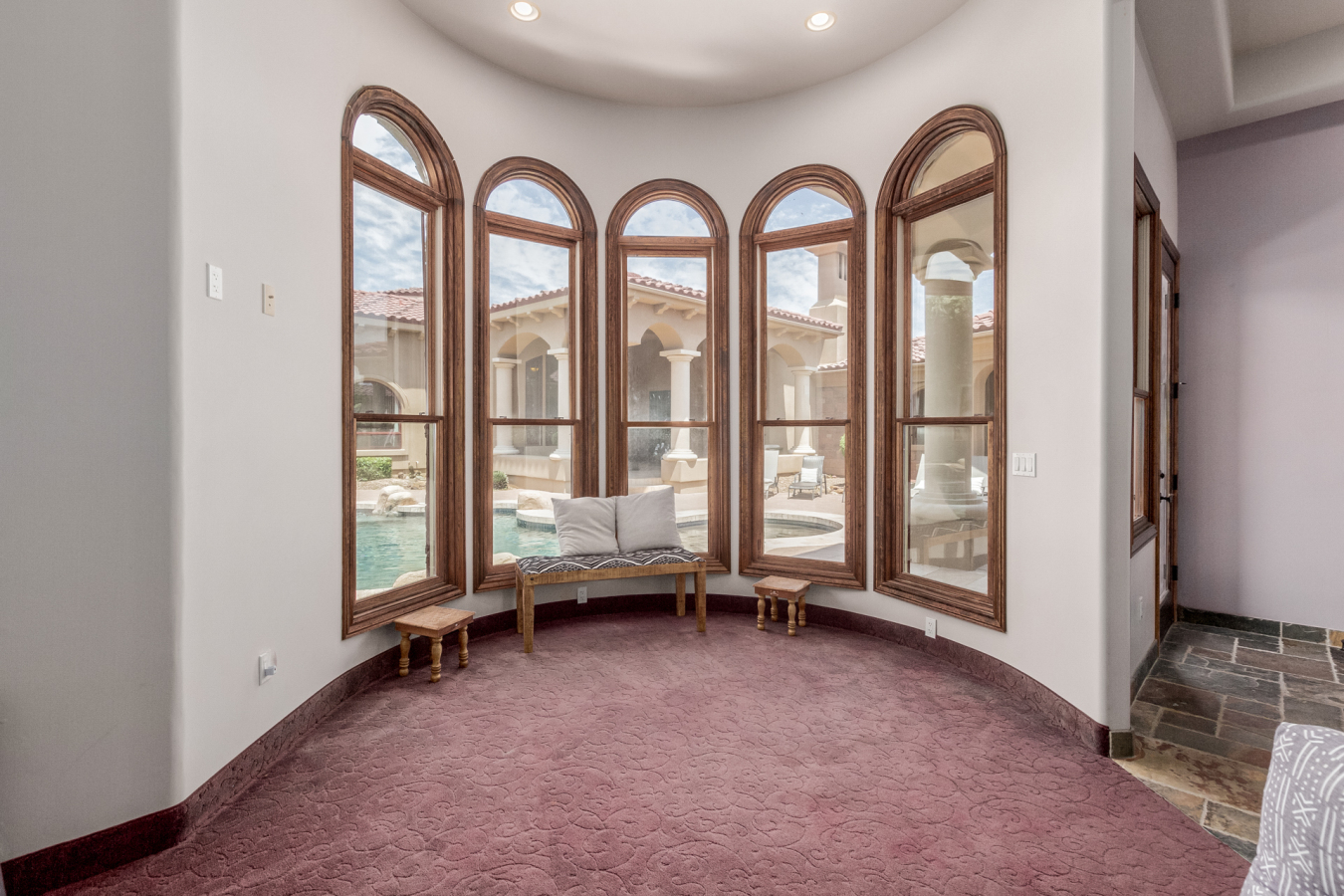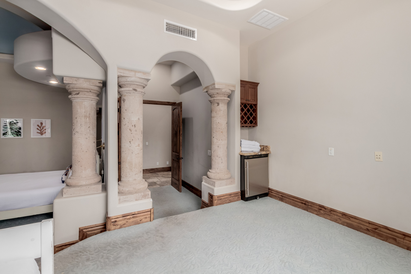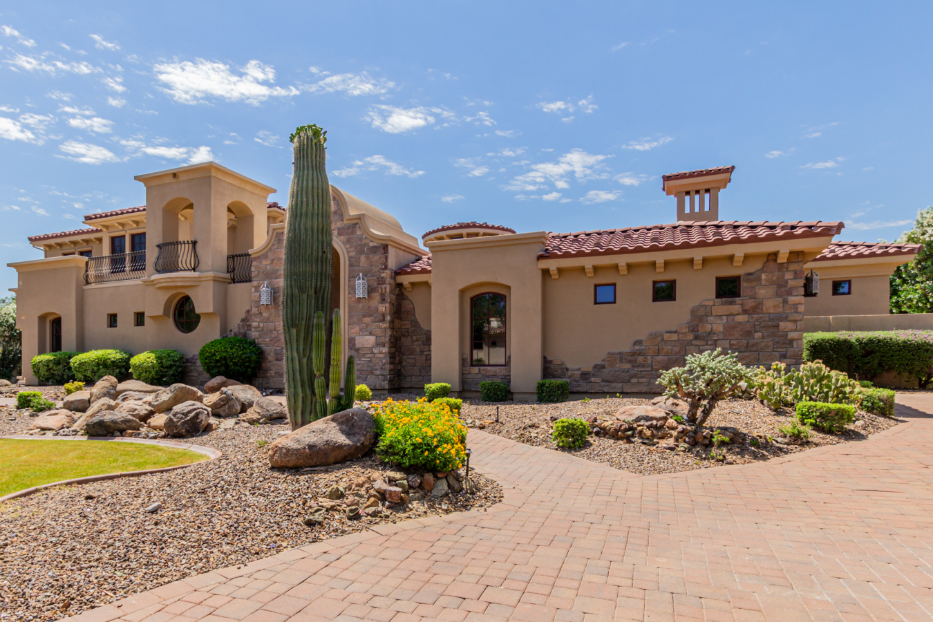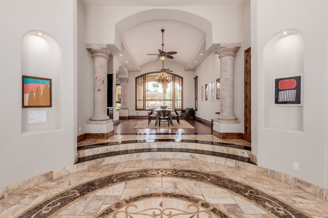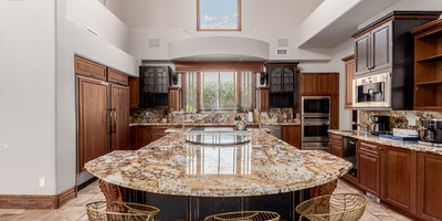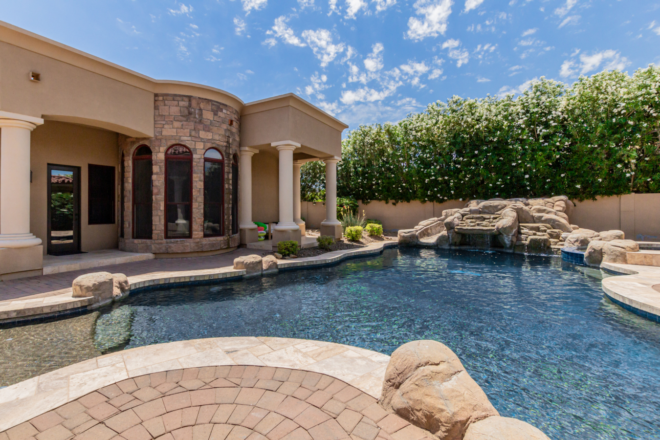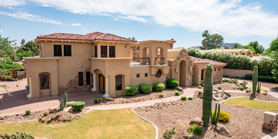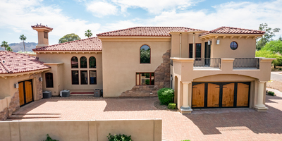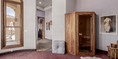 Nestled within the prestigious enclave of Paradise Valley, this home is luxury living at its finest. Grand courtyard entrance w/outdoor gas fireplace. Gourmet kitchen outfitted with Wolff gas stove, Miele Espresso machine, Sub-Zero Refrigerator, granite countertops with built in beverage ice tubs, pantry. Office w/private entrance, & ensuite. Lavish private primary retreat featuring jet tub, double entrance steam shower, his and hers walk-in closets. Basement (1,745 sqft) equipped w/media room, climate-controlled 900 bottle wine cellar, billiard room with bar, bathroom and bedroom. Outdoor living w/putting green, sports court, grotto slide pool, spa, gazebo w/kitchen. Detached casita w/fitness room, infrared sauna, hair salon, 2 baths,1 bdrm, kitchen. Also, for lease $19,000. The chef's kitchen is comprised of wood cabinetry w/crown moulding, travertine stone flooring, a butler's pantry, granite counters, heavy duty stainless steel appliances, and a large prep island w/a breakfast bar.