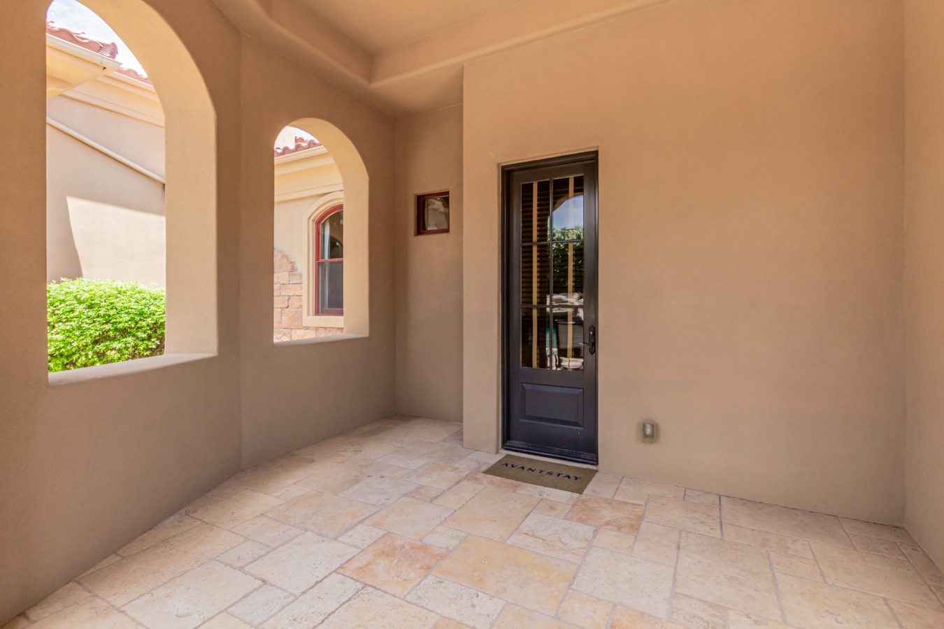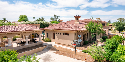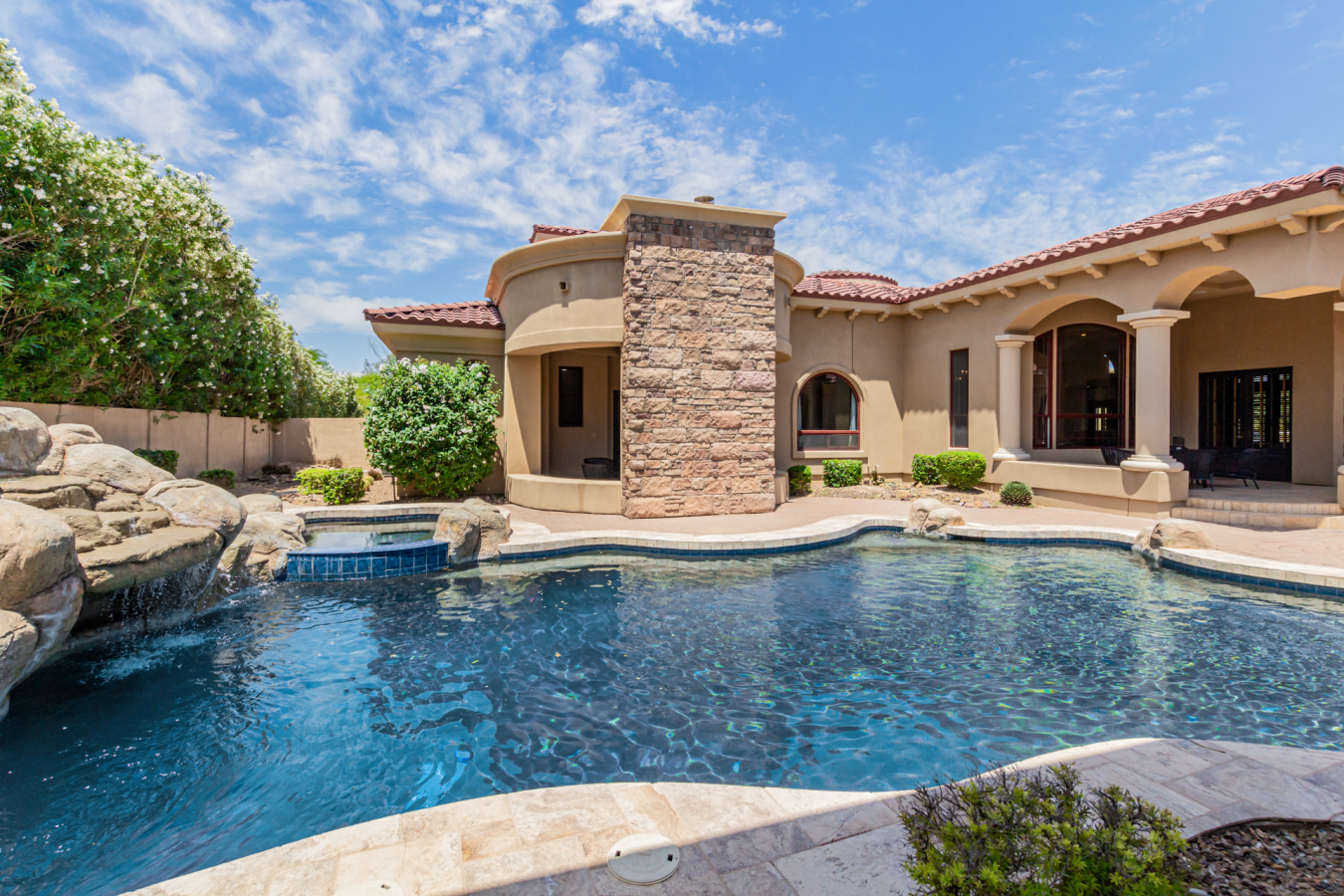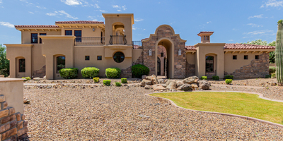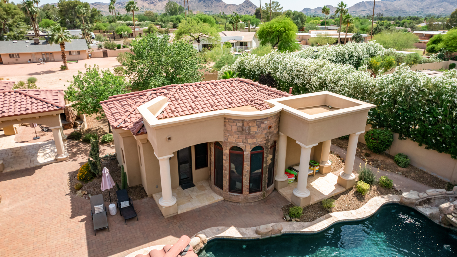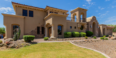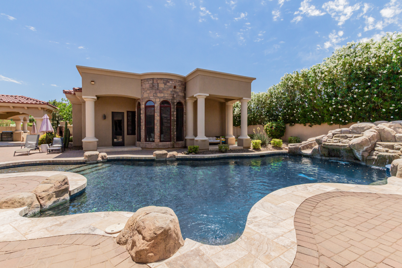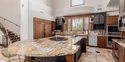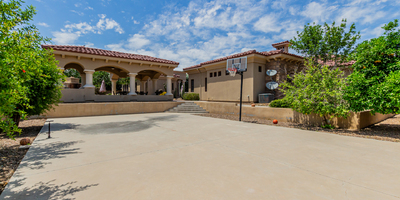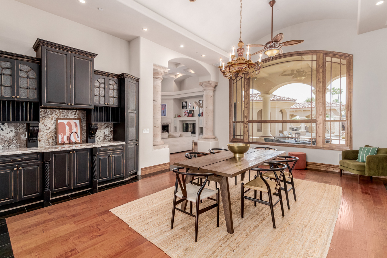 Nestled within the prestigious enclave of Paradise Valley, this home is luxury living at its finest. Grand courtyard entrance w/outdoor gas fireplace. Gourmet kitchen outfitted with Wolff gas stove, Miele Espresso machine, Sub-Zero Refrigerator, granite countertops with built in beverage ice tubs, pantry. Office w/private entrance, & ensuite. Lavish private primary retreat featuring jet tub, double entrance steam shower, his and hers walk-in closets. Basement (1,745 sqft) equipped w/media room, climate-controlled 900 bottle wine cellar, billiard room with bar, bathroom and bedroom. Outdoor living w/putting green, sports court, grotto slide pool, spa, gazebo w/kitchen. Detached casita w/fitness room, infrared sauna, hair salon, 2 baths,1 bdrm, kitchen. Also, for lease $19,000. The chef's kitchen is comprised of wood cabinetry w/crown moulding, travertine stone flooring, a butler's pantry, granite counters, heavy duty stainless steel appliances, and a large prep island w/a breakfast bar.