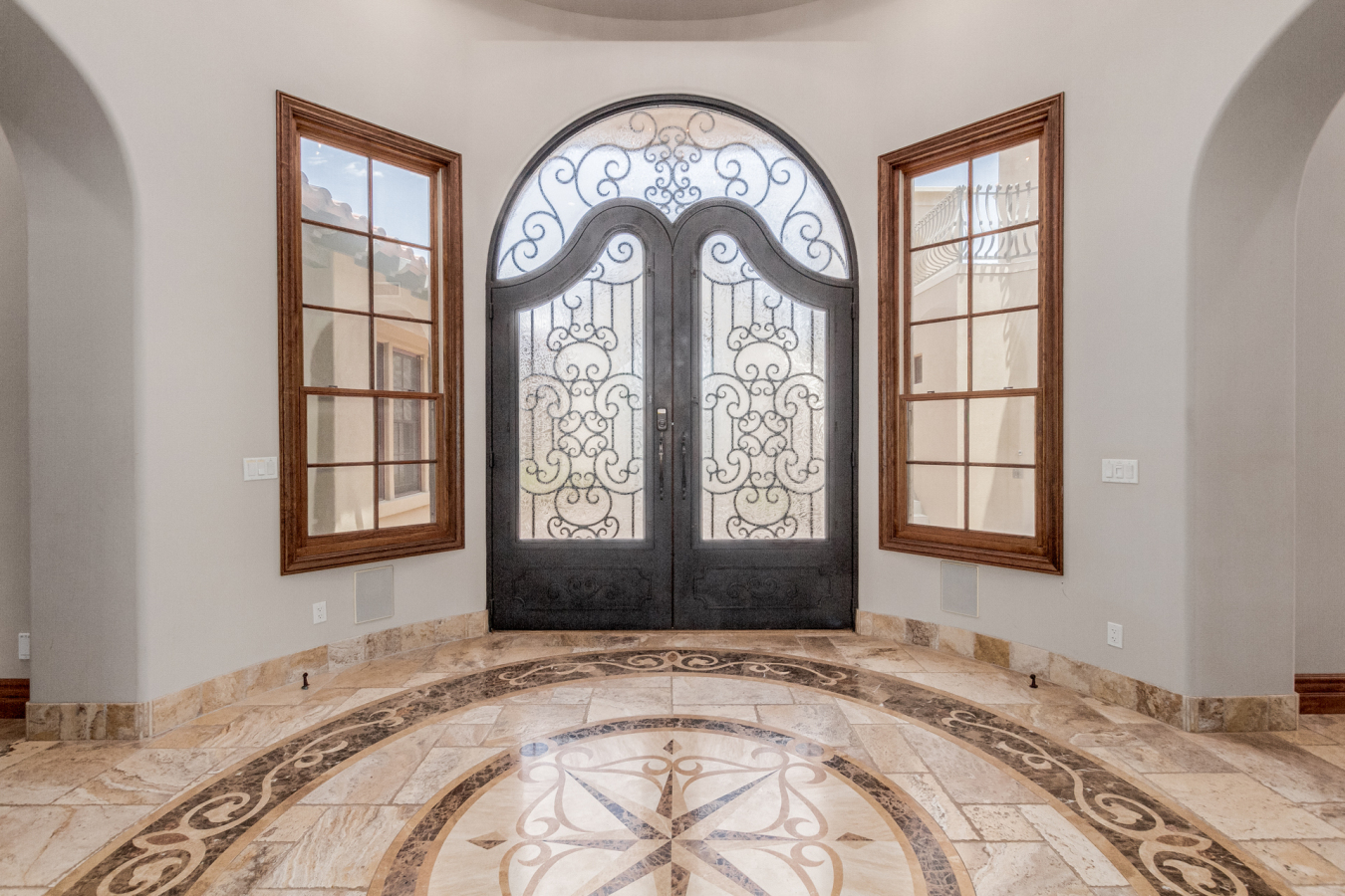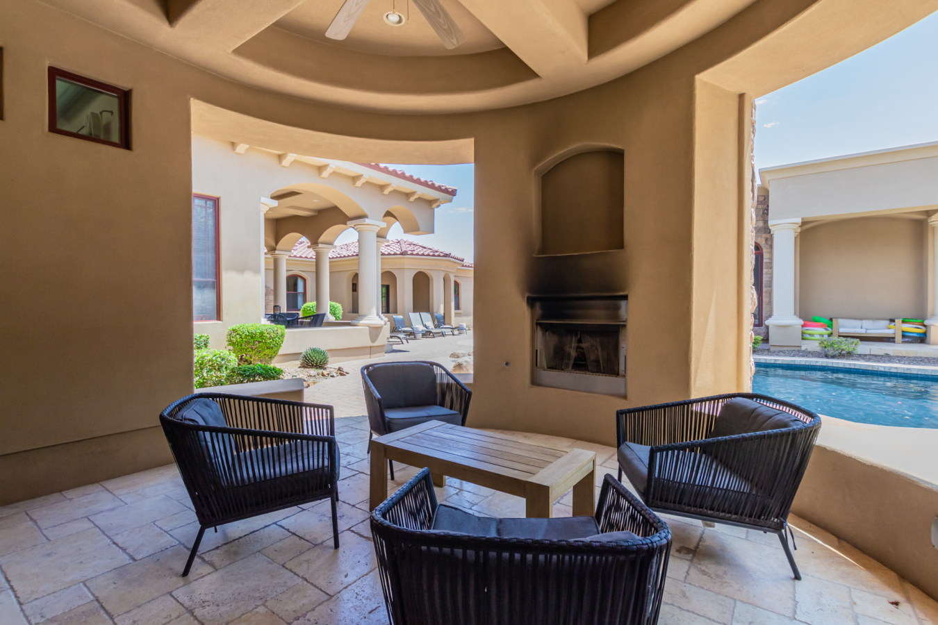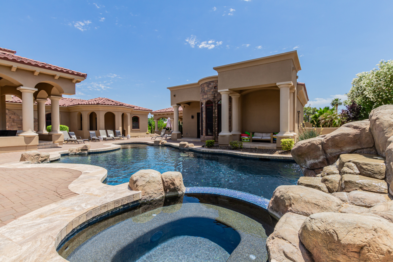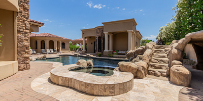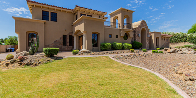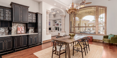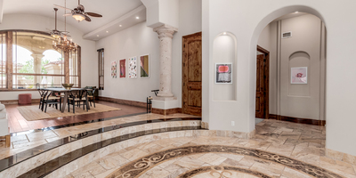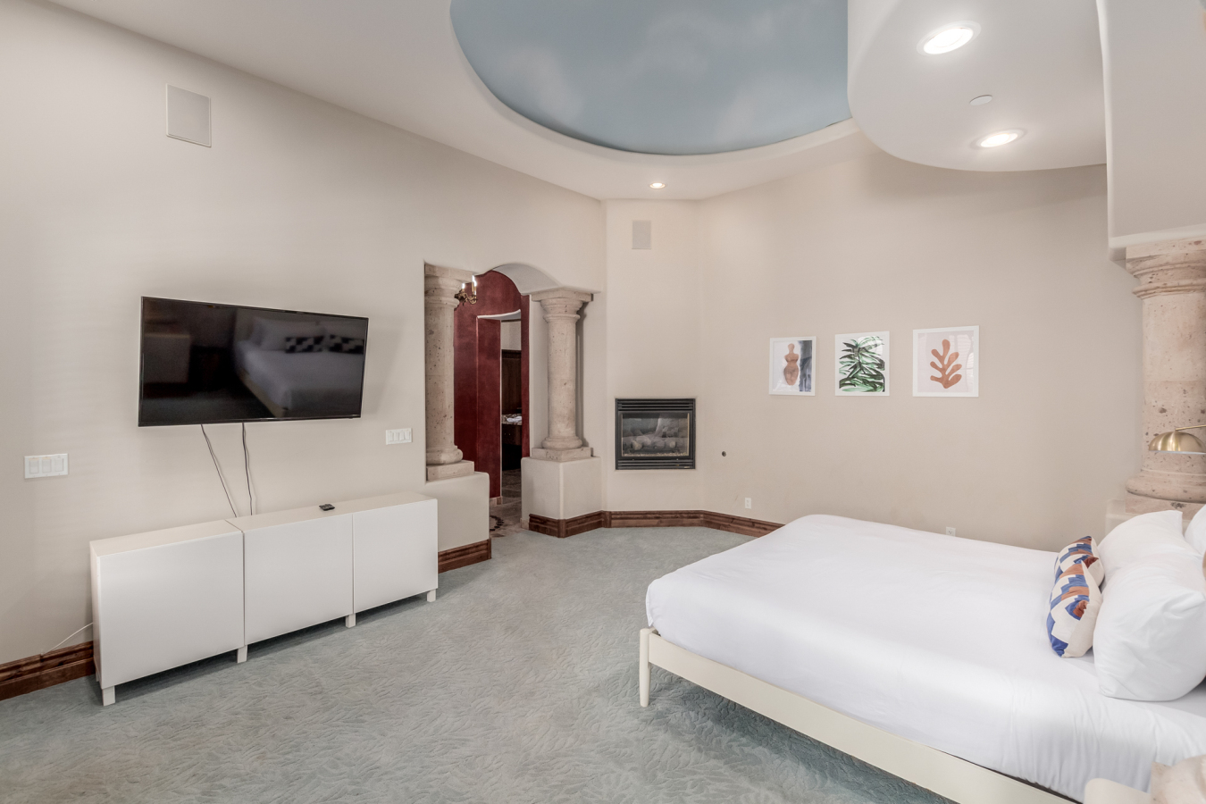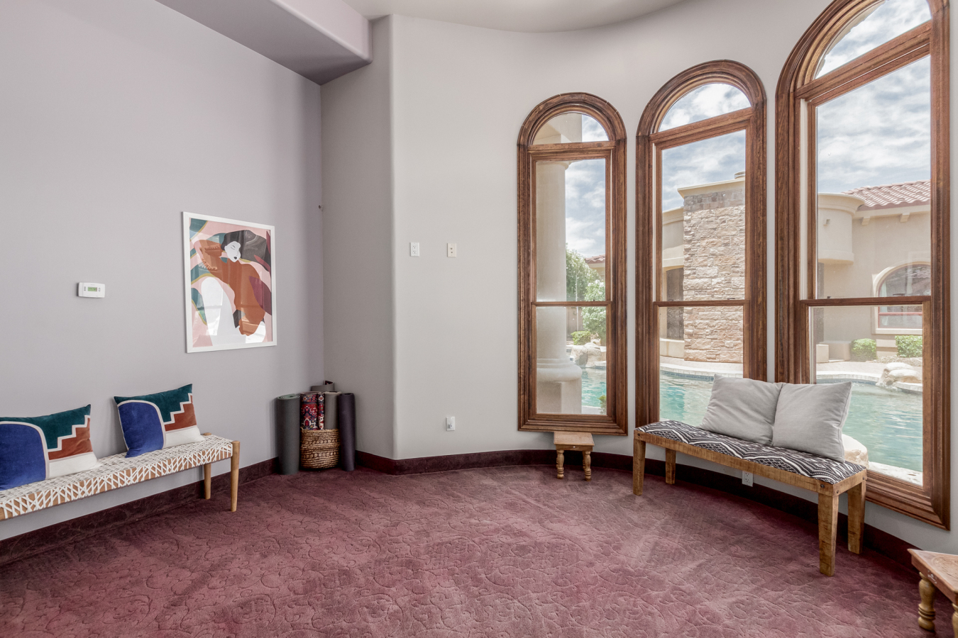 Nestled within the prestigious enclave of Paradise Valley, this home is luxury living at its finest. Grand courtyard entrance w/outdoor gas fireplace. Gourmet kitchen outfitted with Wolff gas stove, Miele Espresso machine, Sub-Zero Refrigerator, granite countertops with built in beverage ice tubs, pantry. Office w/private entrance, & ensuite. Lavish private primary retreat featuring jet tub, double entrance steam shower, his and hers walk-in closets. Basement (1,745 sqft) equipped w/media room, climate-controlled 900 bottle wine cellar, billiard room with bar, bathroom and bedroom. Outdoor living w/putting green, sports court, grotto slide pool, spa, gazebo w/kitchen. Detached casita w/fitness room, infrared sauna, hair salon, 2 baths,1 bdrm, kitchen. Also, for lease $19,000. The chef's kitchen is comprised of wood cabinetry w/crown moulding, travertine stone flooring, a butler's pantry, granite counters, heavy duty stainless steel appliances, and a large prep island w/a breakfast bar.