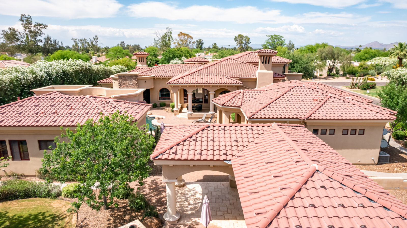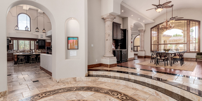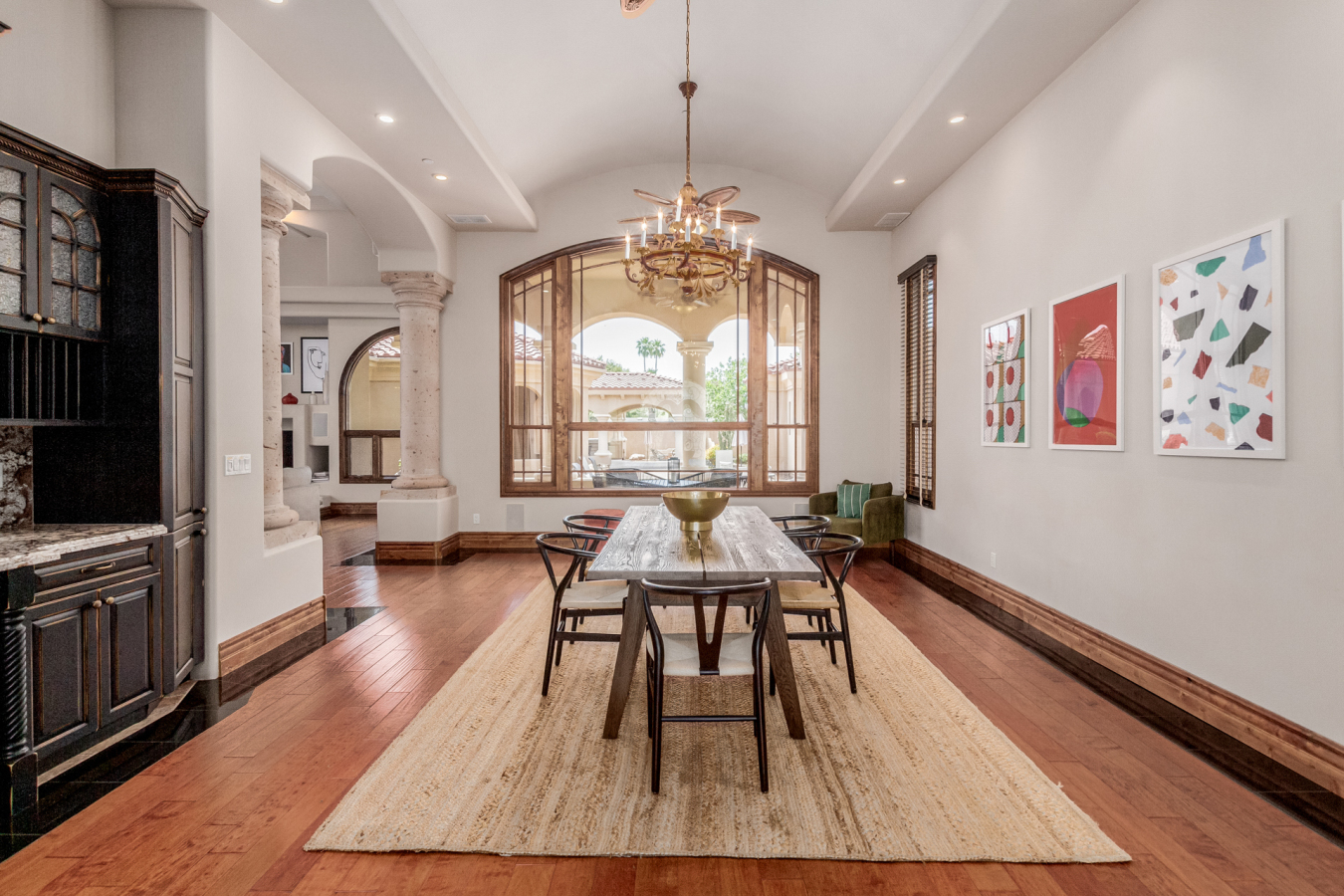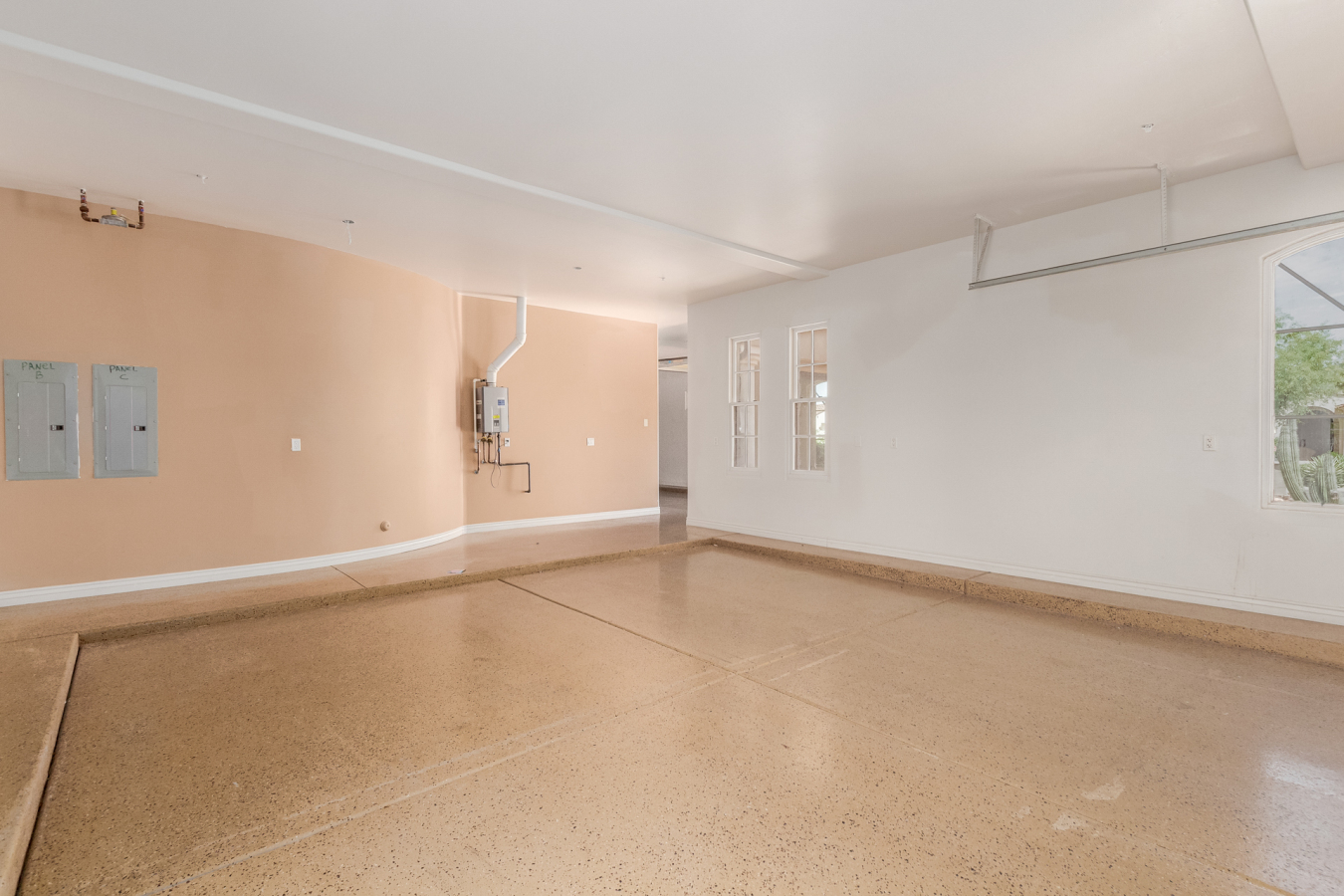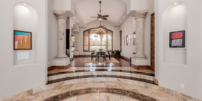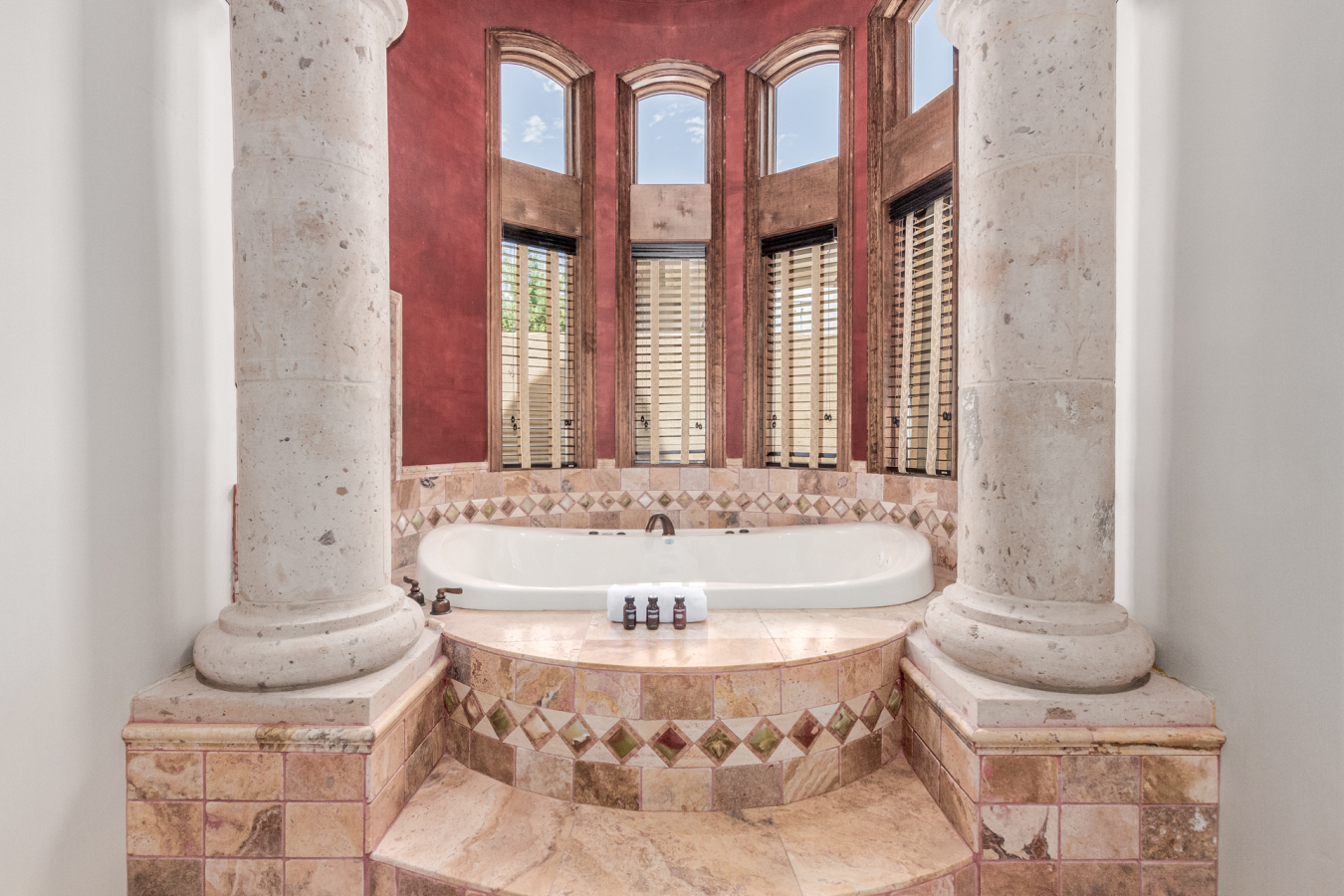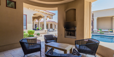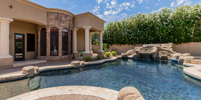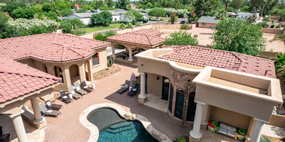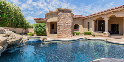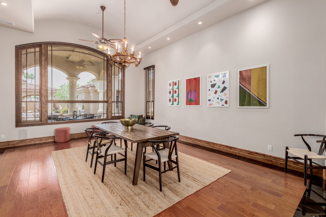 Nestled within the prestigious enclave of Paradise Valley, this home is luxury living at its finest. Grand courtyard entrance w/outdoor gas fireplace. Gourmet kitchen outfitted with Wolff gas stove, Miele Espresso machine, Sub-Zero Refrigerator, granite countertops with built in beverage ice tubs, pantry. Office w/private entrance, & ensuite. Lavish private primary retreat featuring jet tub, double entrance steam shower, his and hers walk-in closets. Basement (1,745 sqft) equipped w/media room, climate-controlled 900 bottle wine cellar, billiard room with bar, bathroom and bedroom. Outdoor living w/putting green, sports court, grotto slide pool, spa, gazebo w/kitchen. Detached casita w/fitness room, infrared sauna, hair salon, 2 baths,1 bdrm, kitchen. Also, for lease $19,000. The chef's kitchen is comprised of wood cabinetry w/crown moulding, travertine stone flooring, a butler's pantry, granite counters, heavy duty stainless steel appliances, and a large prep island w/a breakfast bar.