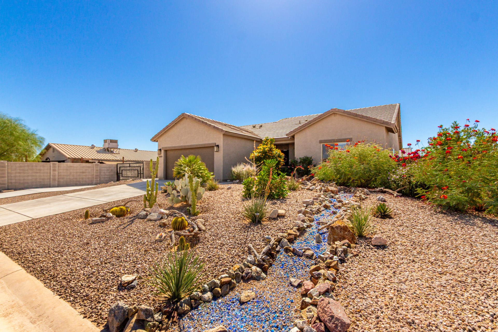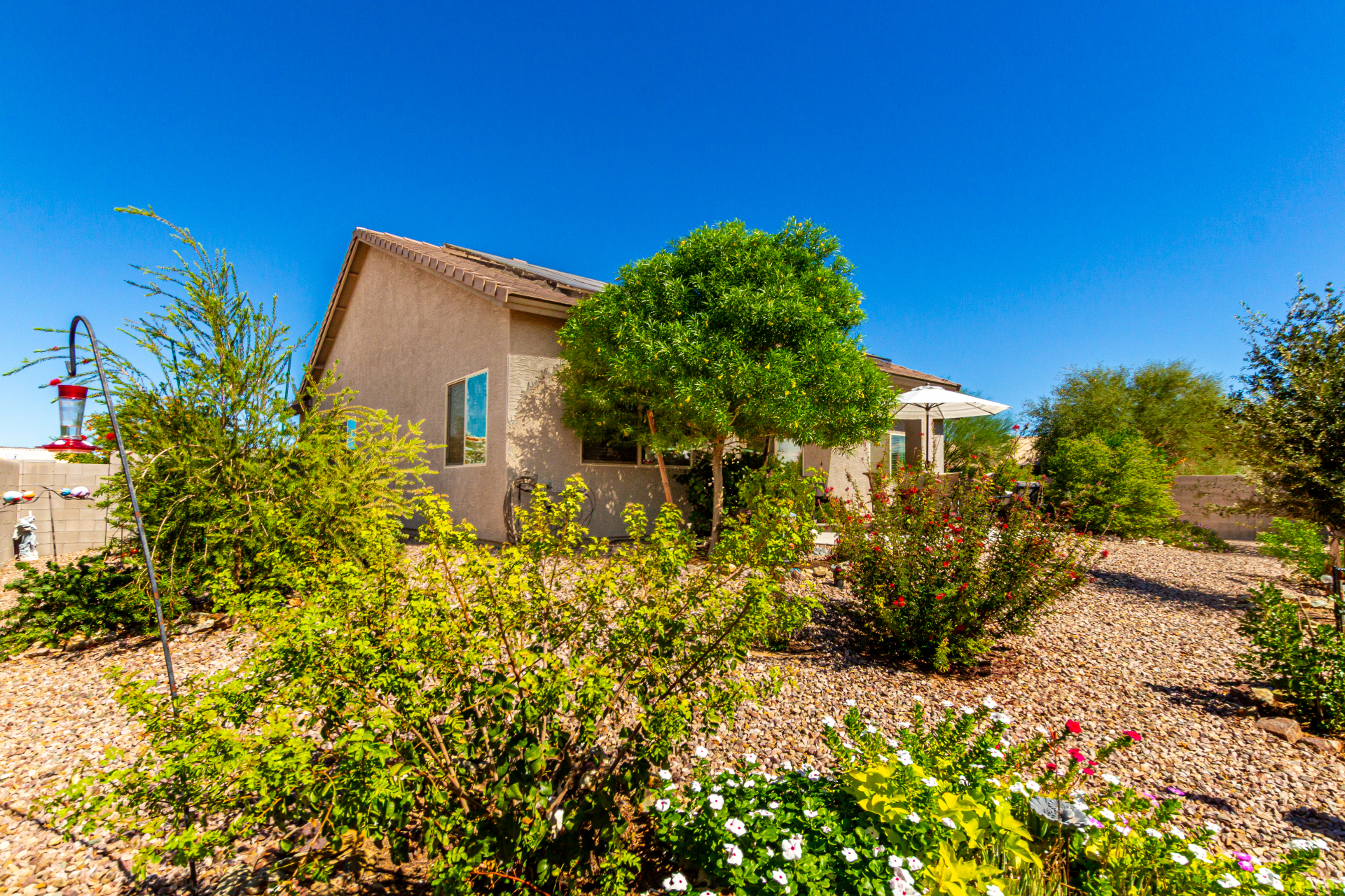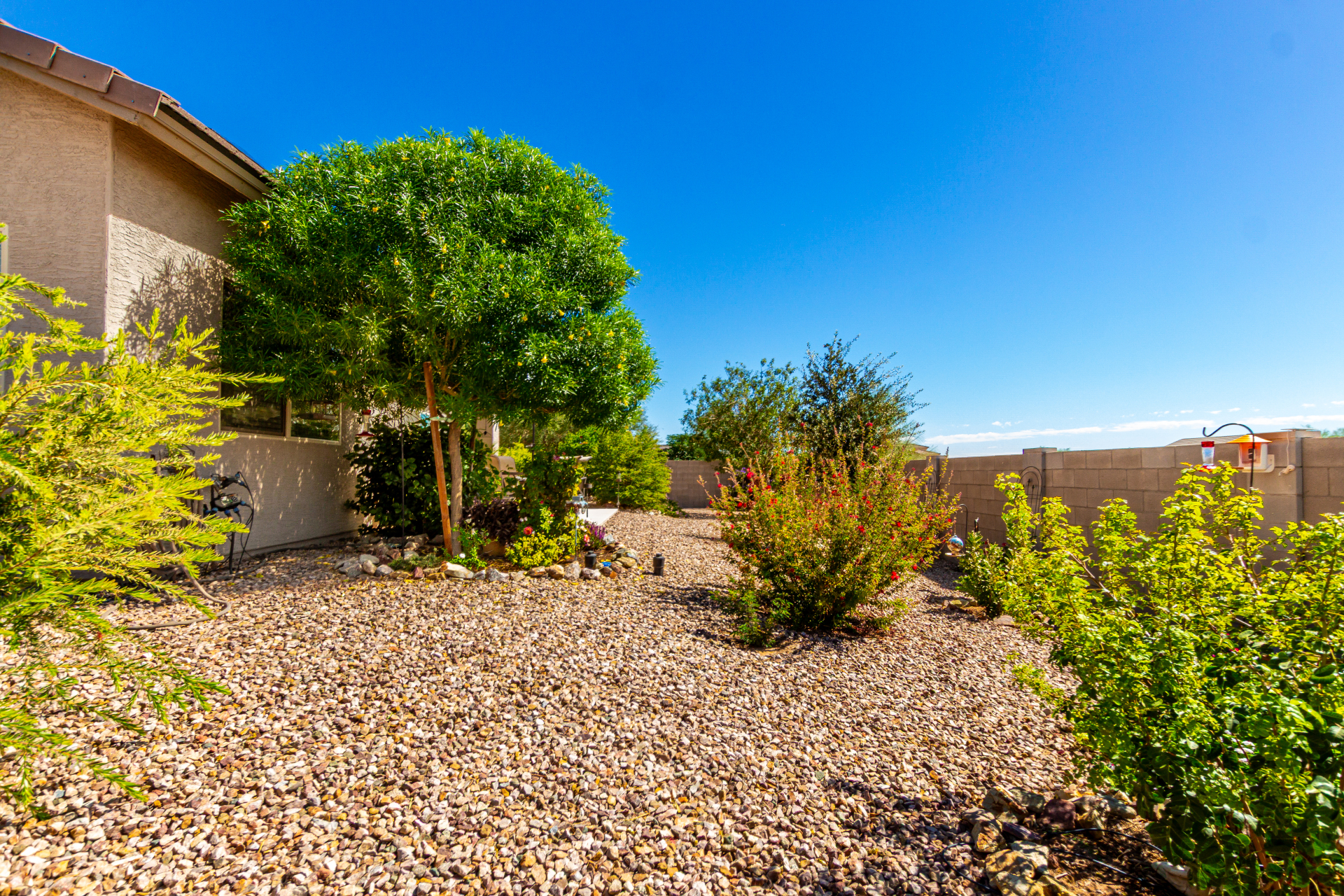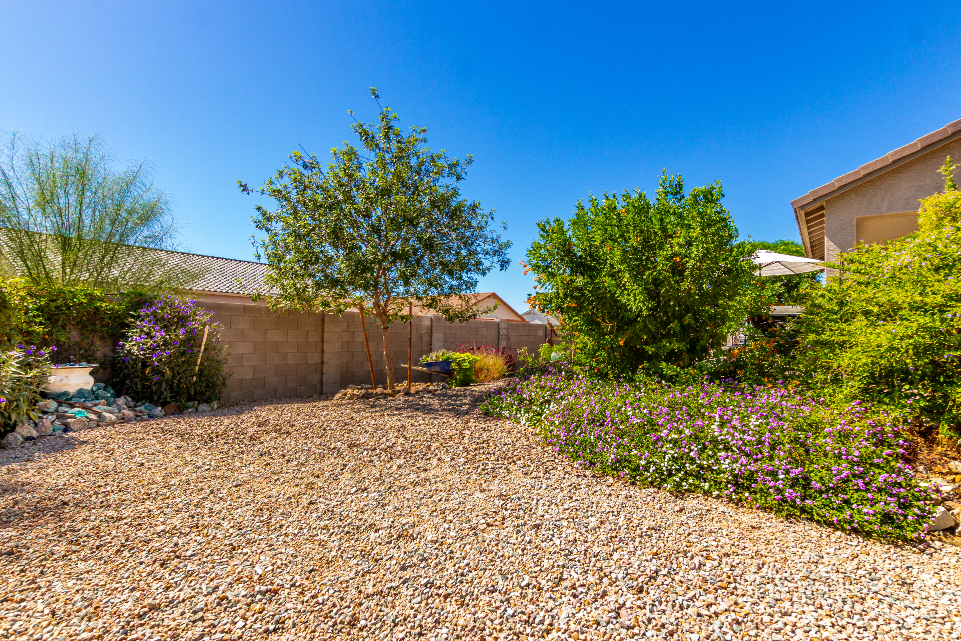 Move-in ready 2021-built home featuring 3 bedrooms and 2 baths with modern elegance throughout. Enjoy custom paint, wooden blinds, ceiling fans in every room, and tile flooring across the entire house. The kitchen shines with stainless steel appliances, slow close cabinets granite countertops. The finished garage offers custom built-in shelving for added storage and organization. Relax on extended front and back patios with a beautiful, custom steel security door. RV-ready with lighting, electricity, a concrete slab, and a custom steel gate. The beautifully landscaped yard includes mature orange and pomegranate trees on a full watering system within a private, walled backyard. One of the nicest homes and yard in the area. Don't miss out on this fantastic home!