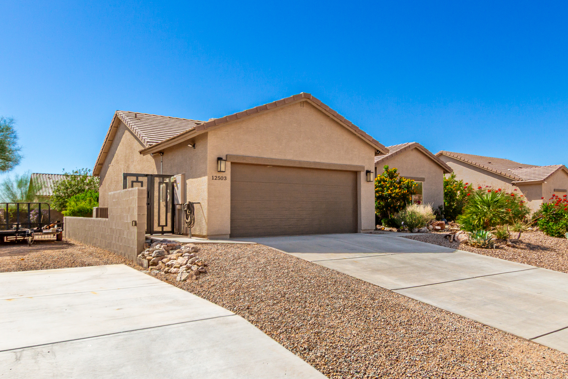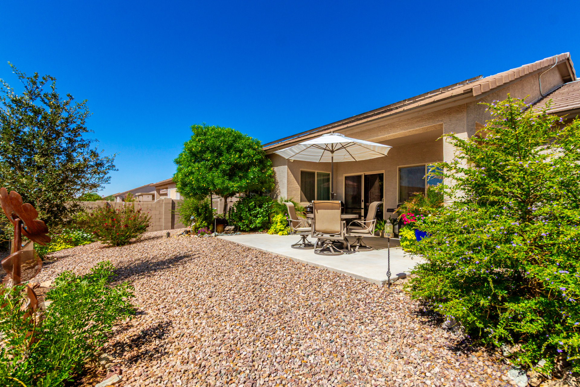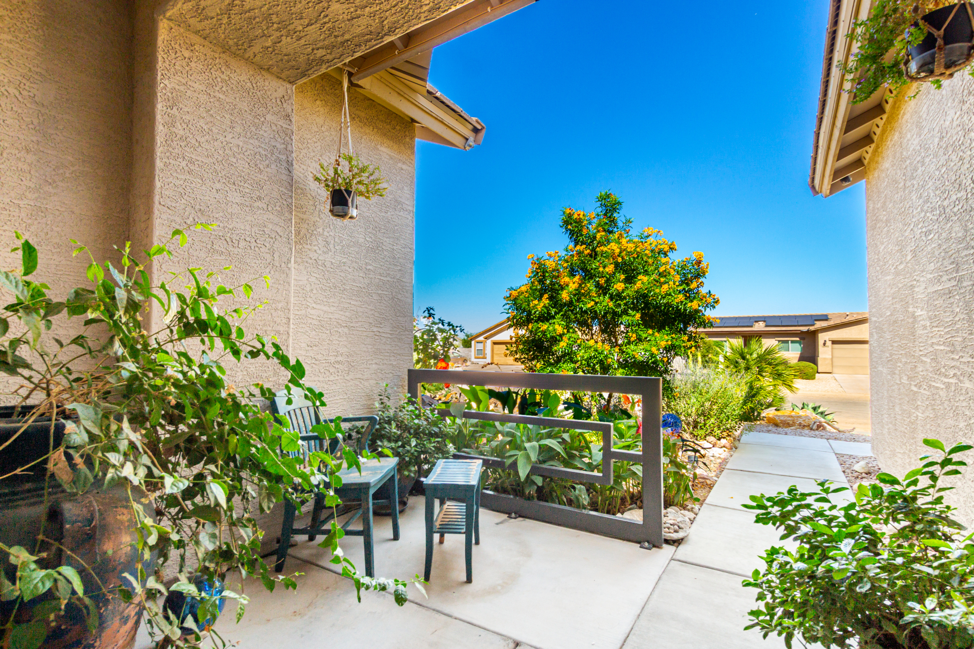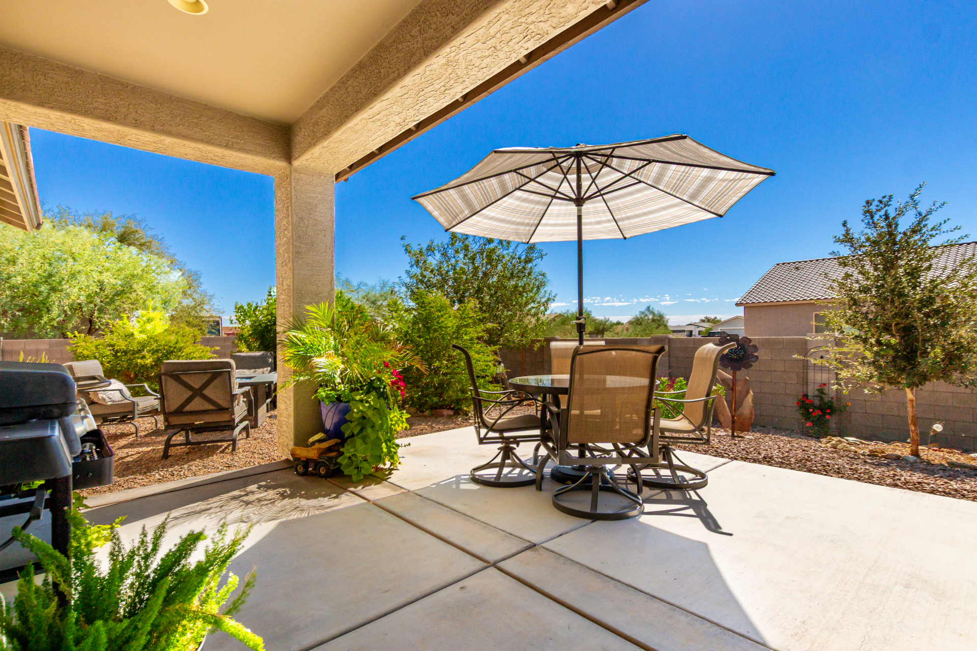 Move-in ready 2021-built home featuring 3 bedrooms and 2 baths with modern elegance throughout. Enjoy custom paint, wooden blinds, ceiling fans in every room, and tile flooring across the entire house. The kitchen shines with stainless steel appliances, slow close cabinets granite countertops. The finished garage offers custom built-in shelving for added storage and organization. Relax on extended front and back patios with a beautiful, custom steel security door. RV-ready with lighting, electricity, a concrete slab, and a custom steel gate. The beautifully landscaped yard includes mature orange and pomegranate trees on a full watering system within a private, walled backyard. One of the nicest homes and yard in the area. Don't miss out on this fantastic home!
