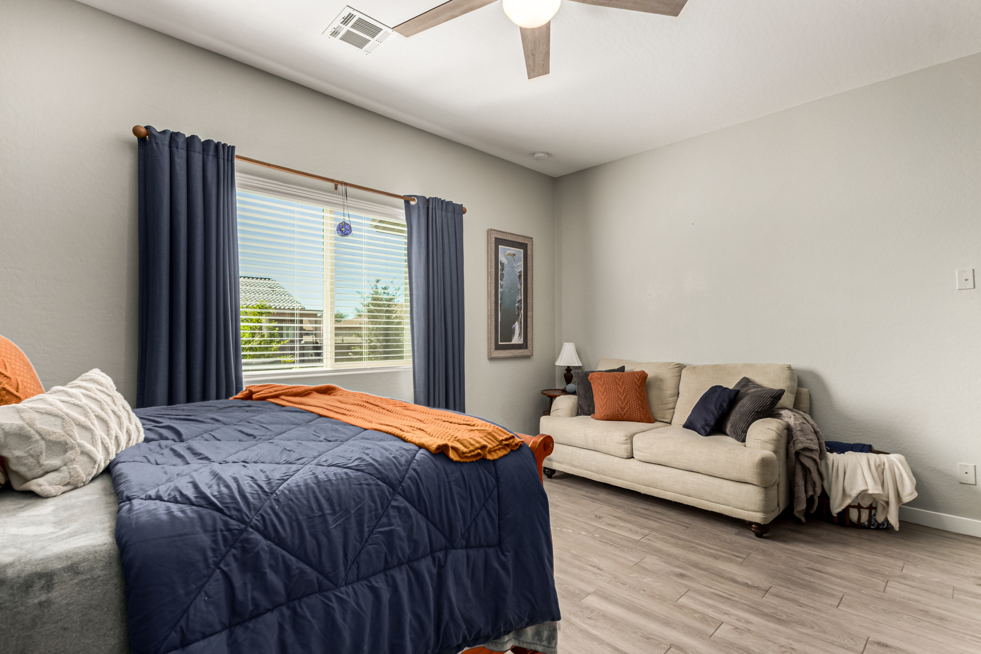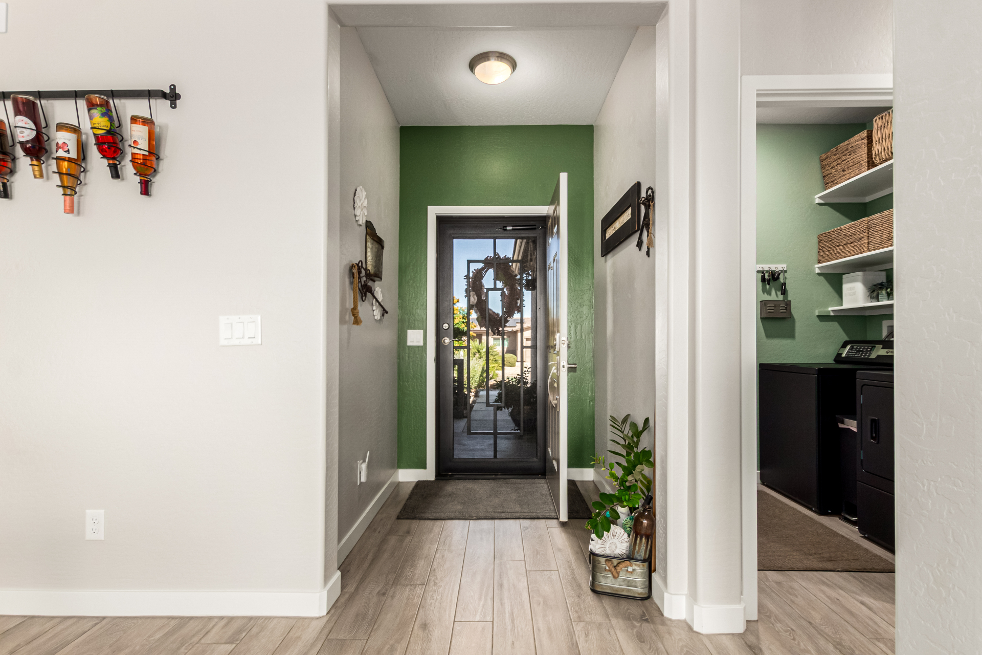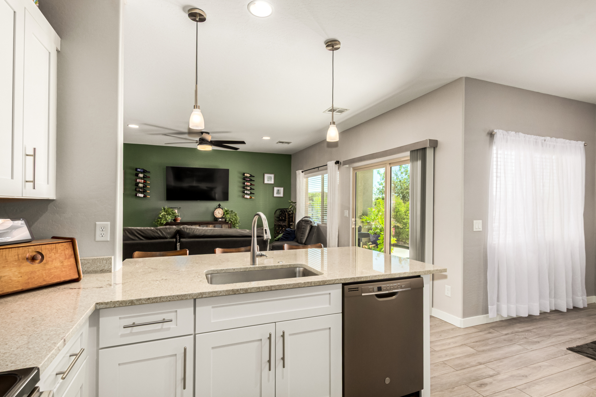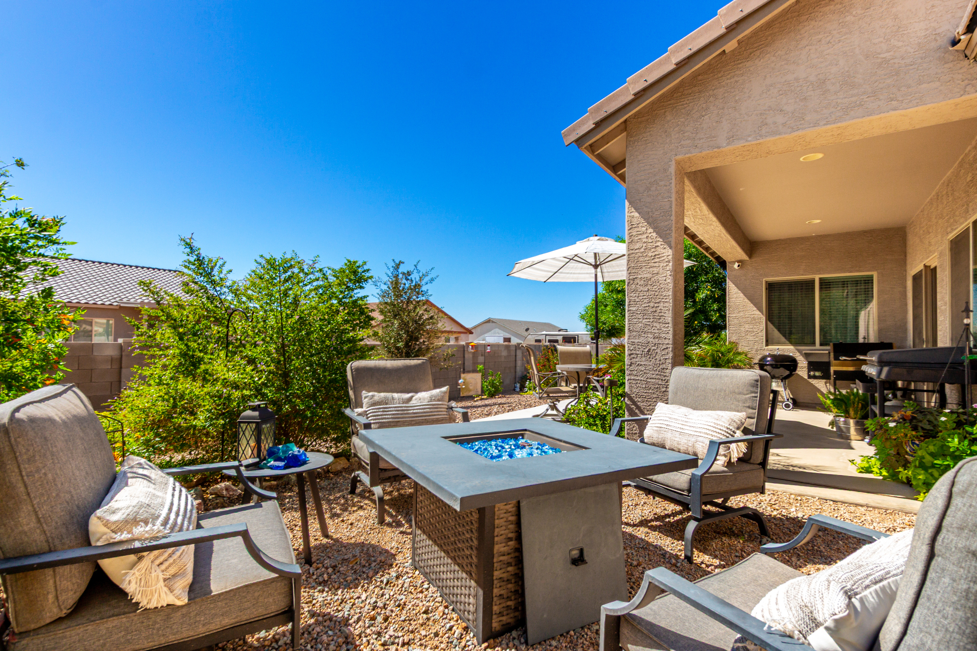 Move-in ready 2021-built home featuring 3 bedrooms and 2 baths with modern elegance throughout. Enjoy custom paint, wooden blinds, ceiling fans in every room, and tile flooring across the entire house. The kitchen shines with stainless steel appliances, slow close cabinets granite countertops. The finished garage offers custom built-in shelving for added storage and organization. Relax on extended front and back patios with a beautiful, custom steel security door. RV-ready with lighting, electricity, a concrete slab, and a custom steel gate. The beautifully landscaped yard includes mature orange and pomegranate trees on a full watering system within a private, walled backyard. One of the nicest homes and yard in the area. Don't miss out on this fantastic home!