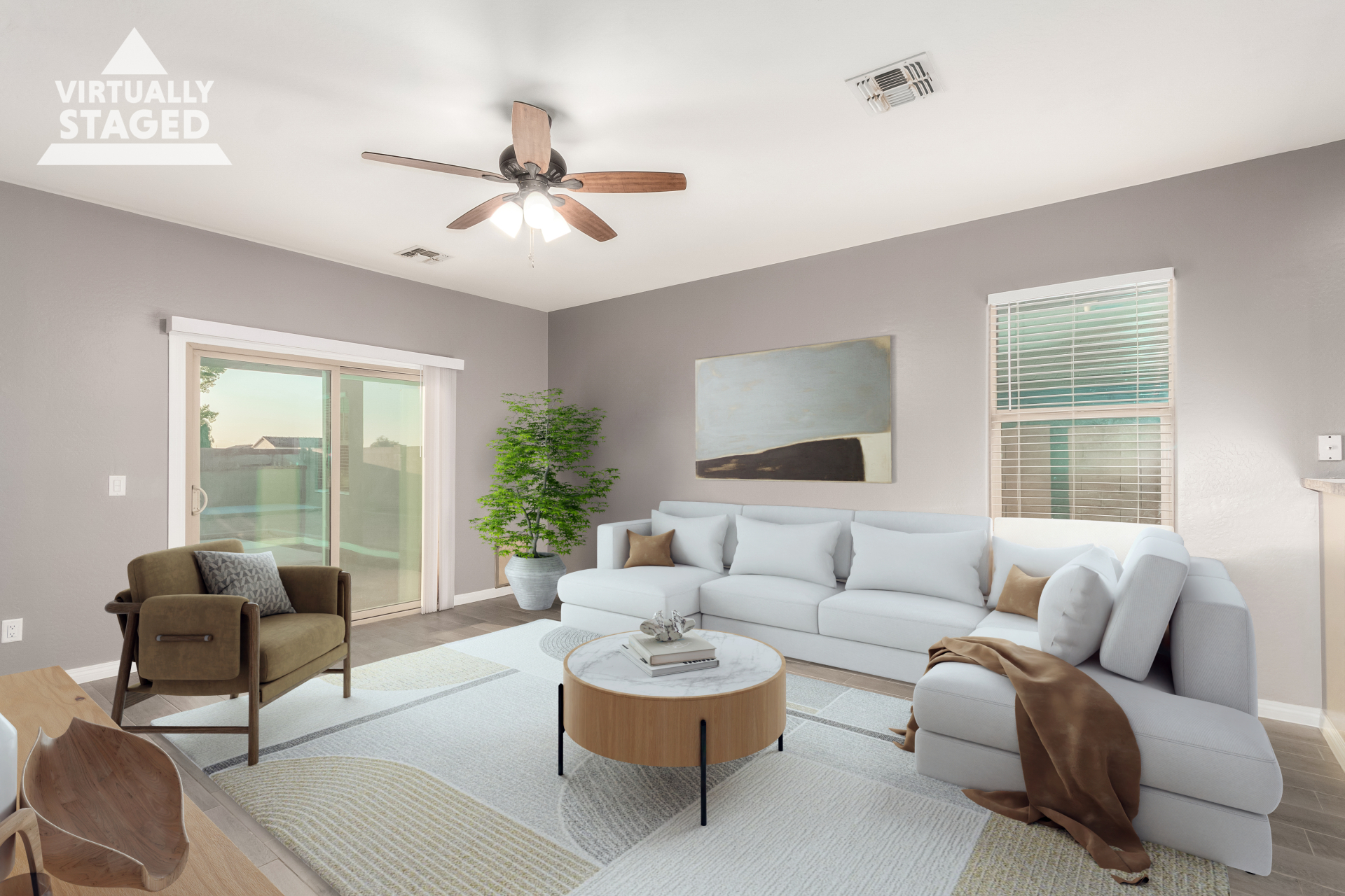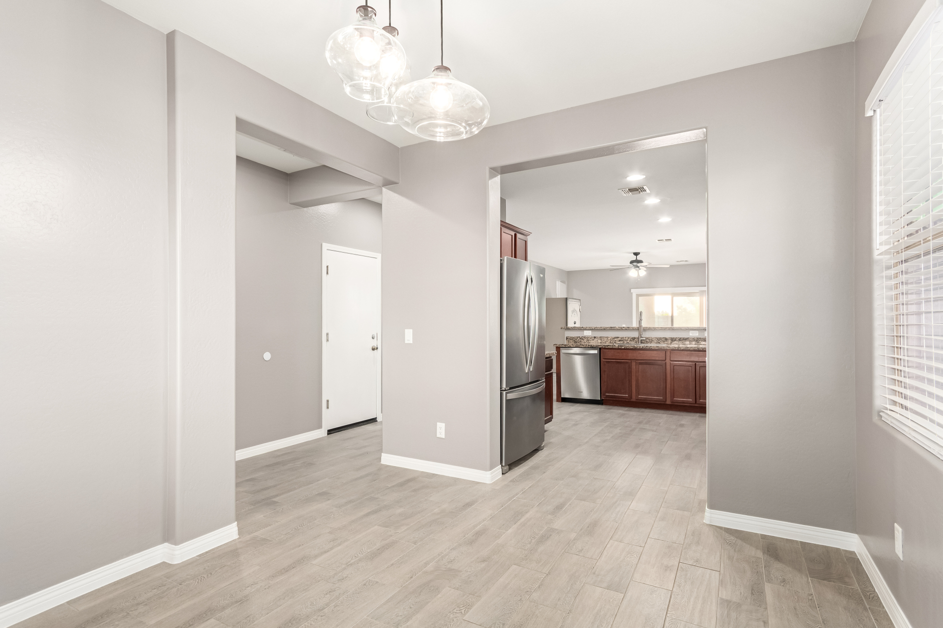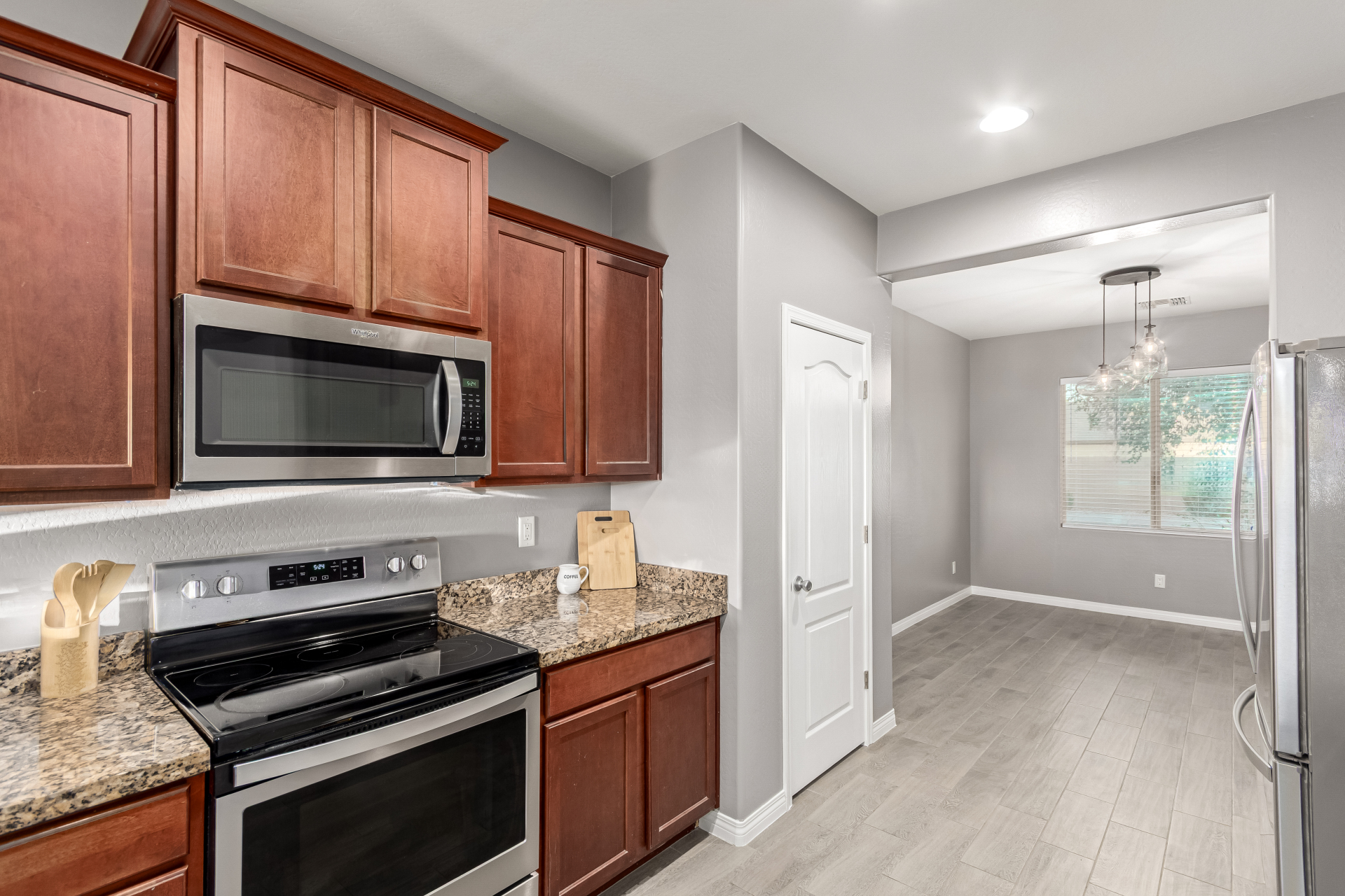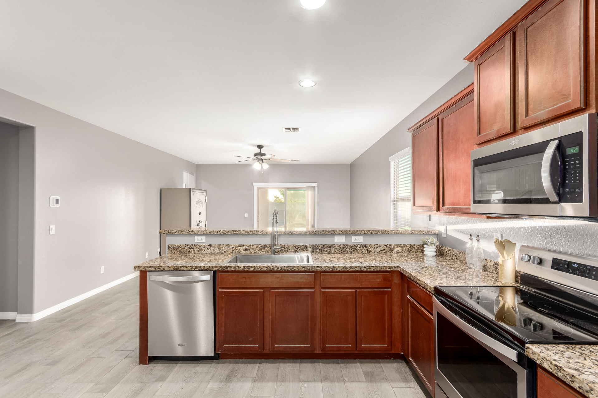 The search is over! Move-in ready home featuring a 2-car garage, RV gate. Explore the spacious living room with recessed lighting, thick baseboards, & wood-style tile floors. Enjoy gatherings in the formal dining room! Chef's kitchen has beautiful cabinetry with crown molding, granite counters, a breakfast bar, SS appliances, & a pantry for added storage. Discover a main bedroom complete with a walk-in closet & a stylish ensuite featuring updated flooring, a soaking tub, & a grab bar in the shower. The huge backyard is a blank canvas ready for your creativity, offering covered patio & a paved area ideal for adding a Ramada, BBQ, or firepit. With no neighbors behind, you'll enjoy extra privacy! This home is ready for you to make it your own!