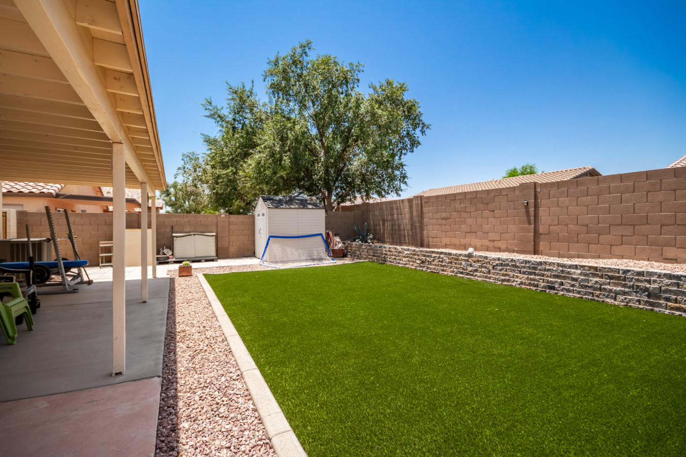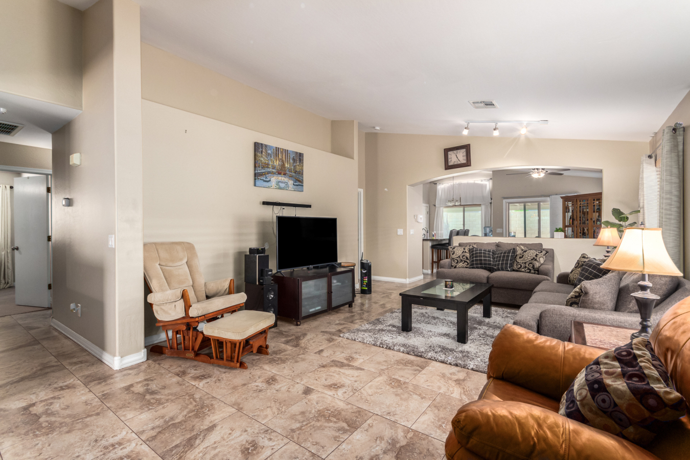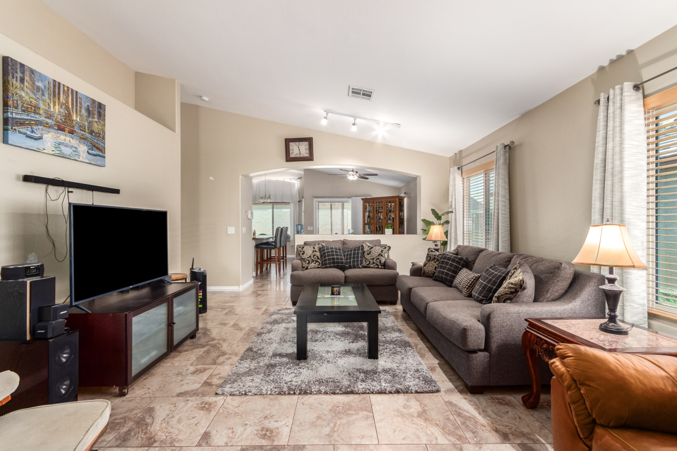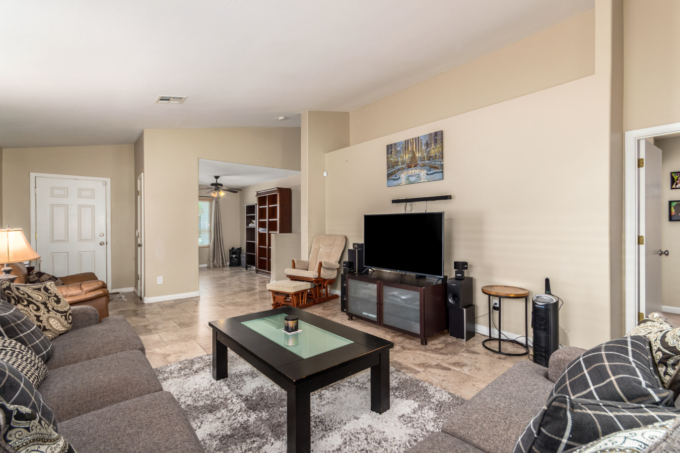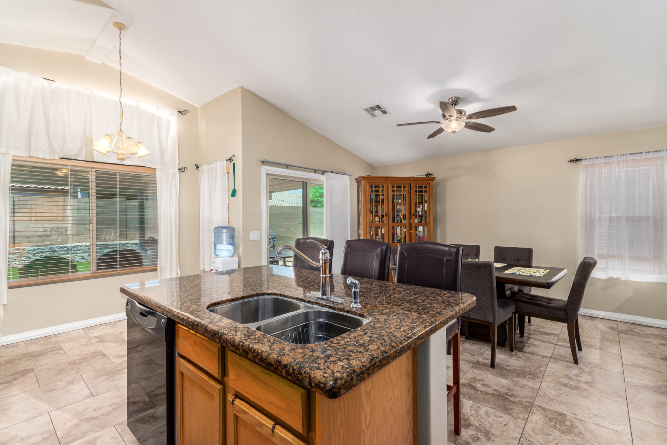 Welcome to this charming single-level home in the desirable Ashton Ranch! Featuring 3 beds, 2 baths, a 2-car garage, & an easy-care landscape. Come inside to find a large living room and an inviting family room that opens to the kitchen! Vaulted ceilings add to the airy feel, complemented by neutral paint and tile flooring w/soft carpet in bedrooms. The kitchen features built-in appliances, granite counters, a pantry, ample wood cabinetry, and an island w/breakfast bar. The den is a versatile space, ideal for an office or reading nook. Primary bedroom boasts a walk-in closet and a full bathroom for added comfort. Discover the perfectly sized backyard, excellent for relaxing or enjoying BBQ! A covered patio, storage shed, & artificial turf complete the picture. 3 community pools to enjoy.-