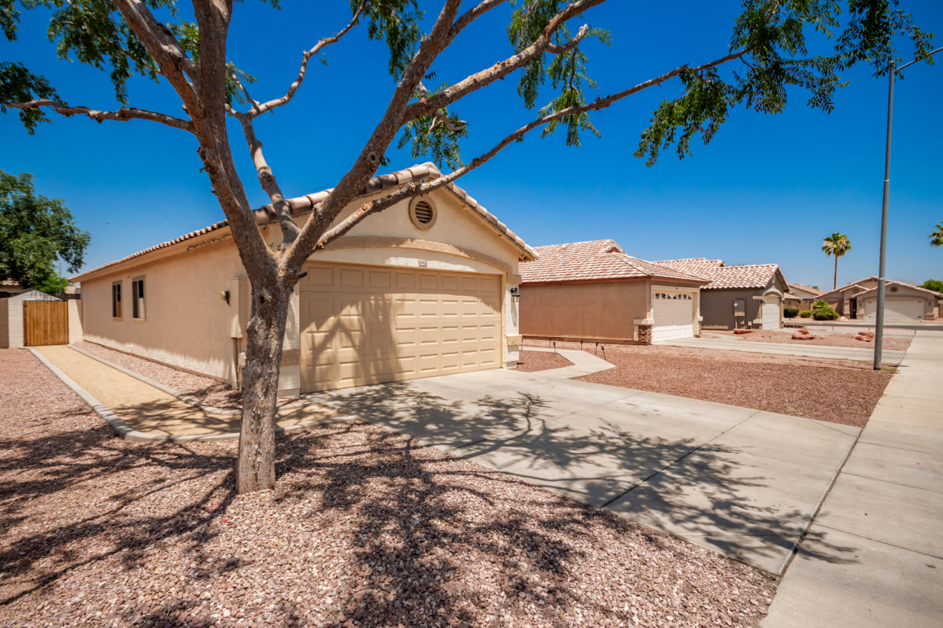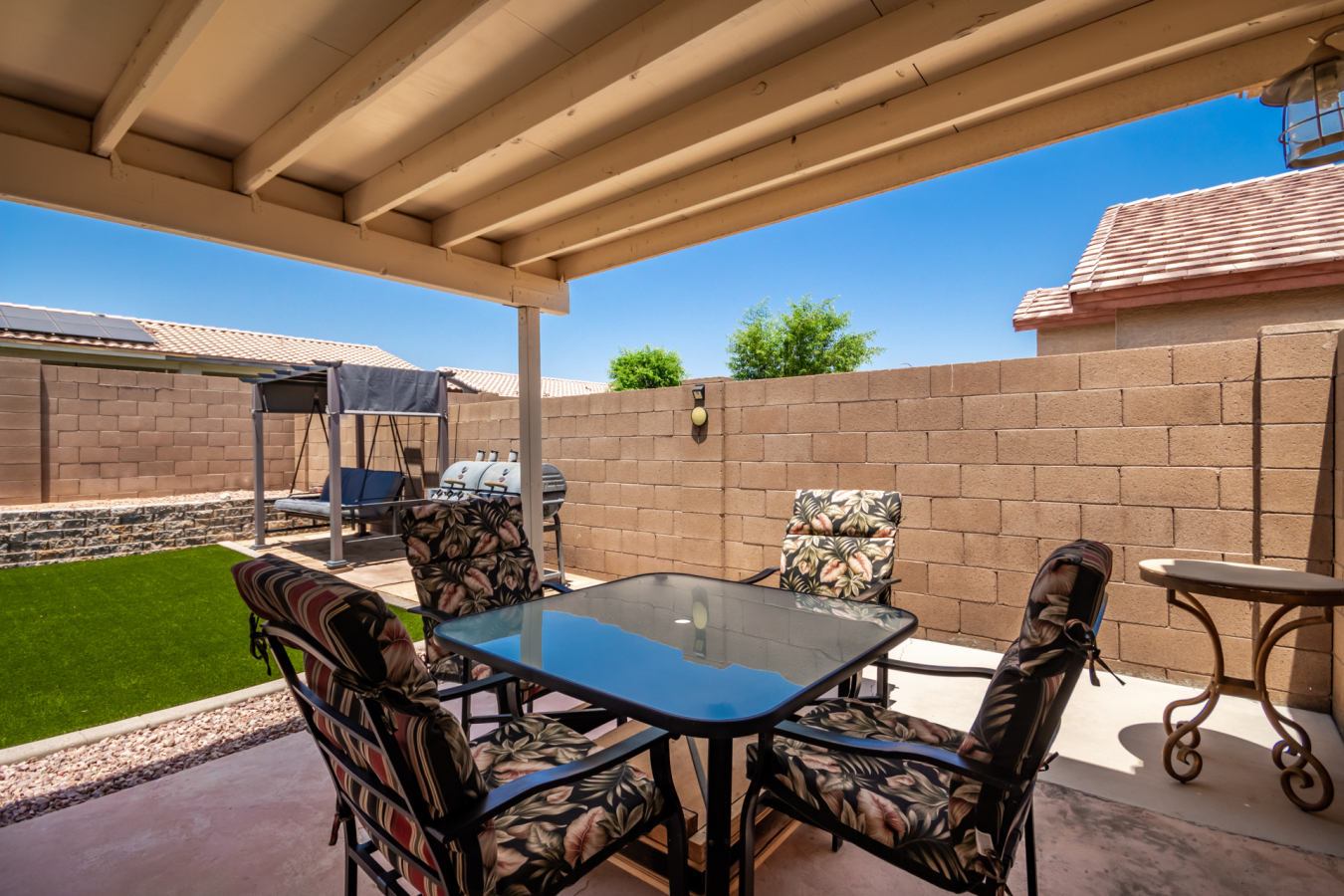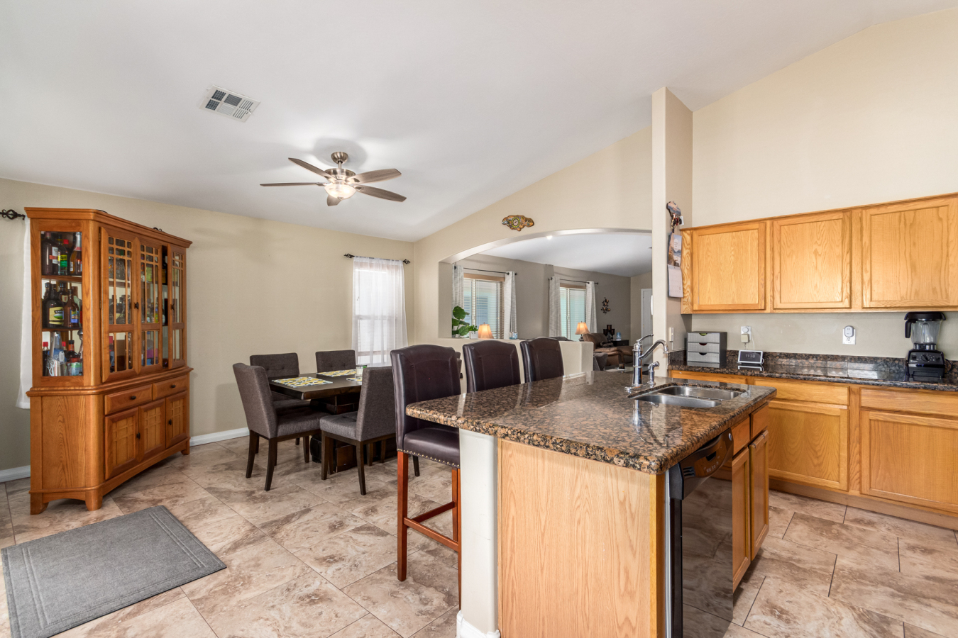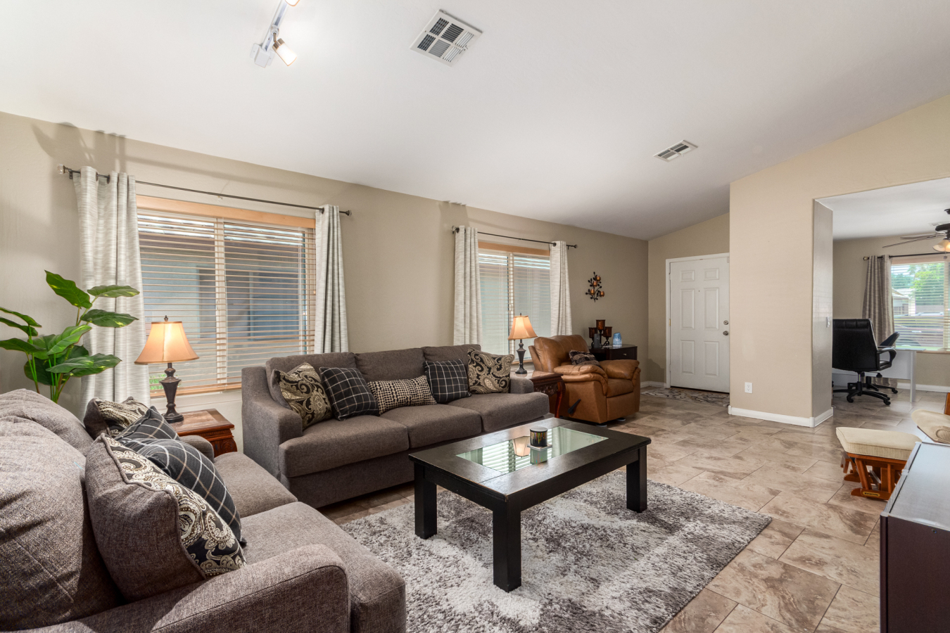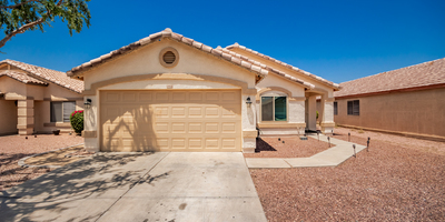 Welcome to this charming single-level home in the desirable Ashton Ranch! Featuring 3 beds, 2 baths, a 2-car garage, & an easy-care landscape. Come inside to find a large living room and an inviting family room that opens to the kitchen! Vaulted ceilings add to the airy feel, complemented by neutral paint and tile flooring w/soft carpet in bedrooms. The kitchen features built-in appliances, granite counters, a pantry, ample wood cabinetry, and an island w/breakfast bar. The den is a versatile space, ideal for an office or reading nook. Primary bedroom boasts a walk-in closet and a full bathroom for added comfort. Discover the perfectly sized backyard, excellent for relaxing or enjoying BBQ! A covered patio, storage shed, & artificial turf complete the picture. 3 community pools to enjoy.-