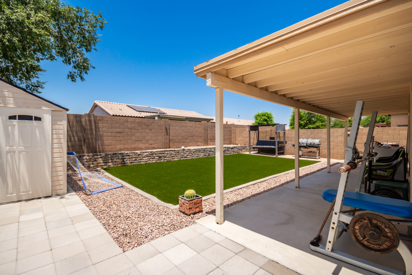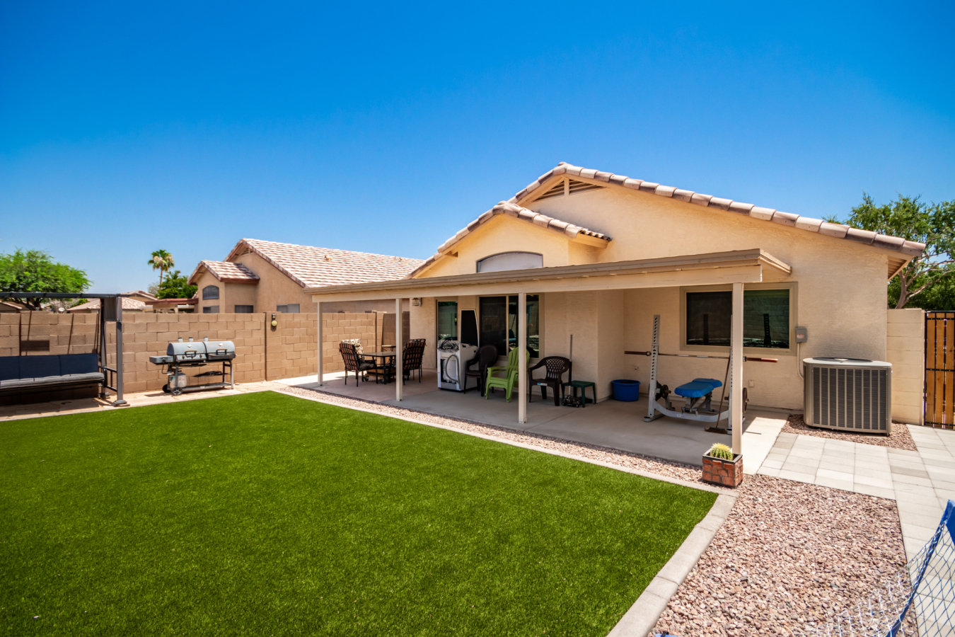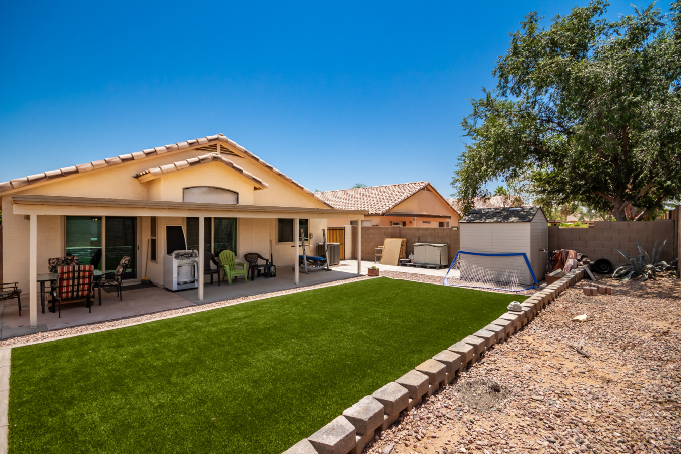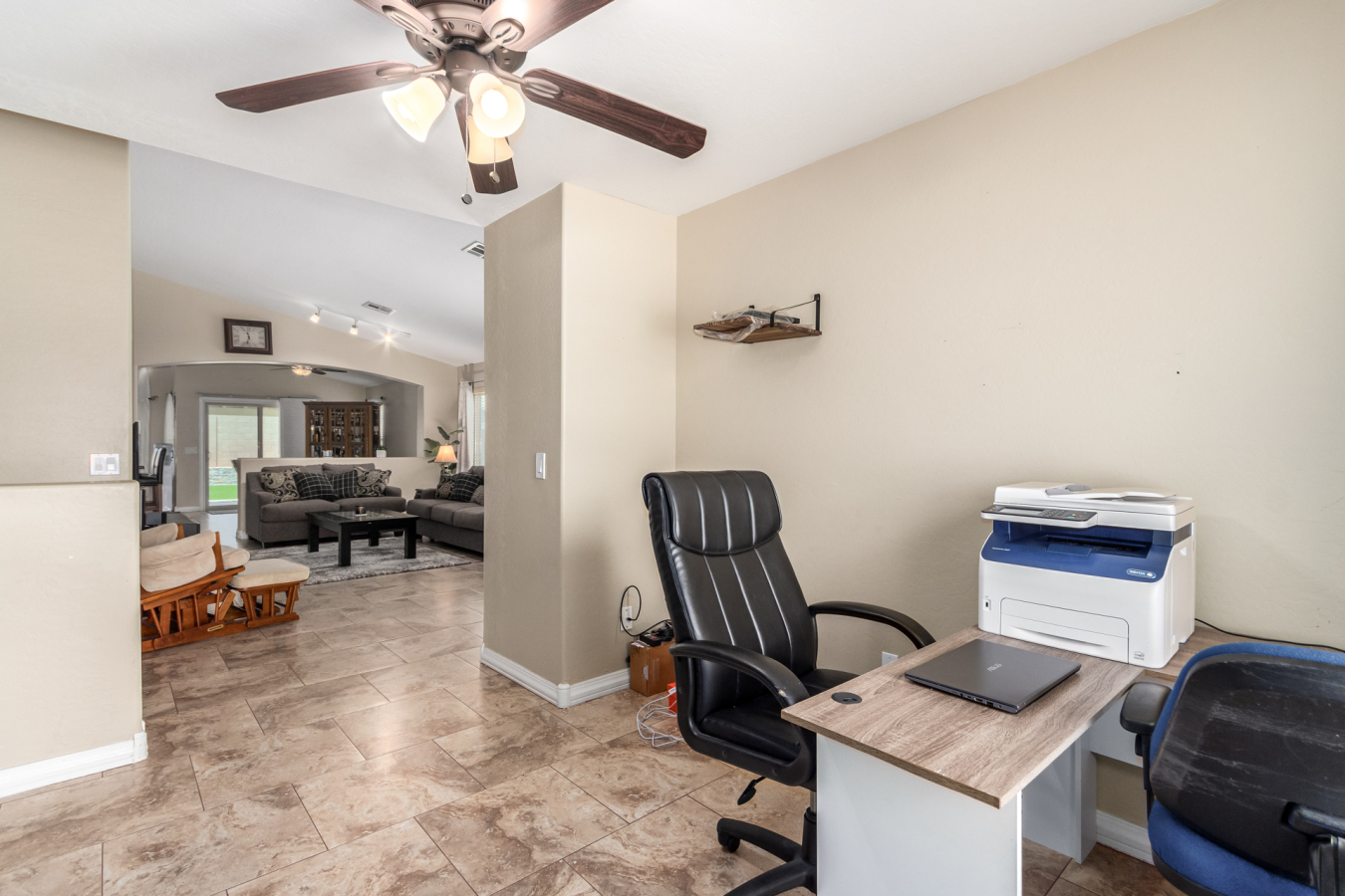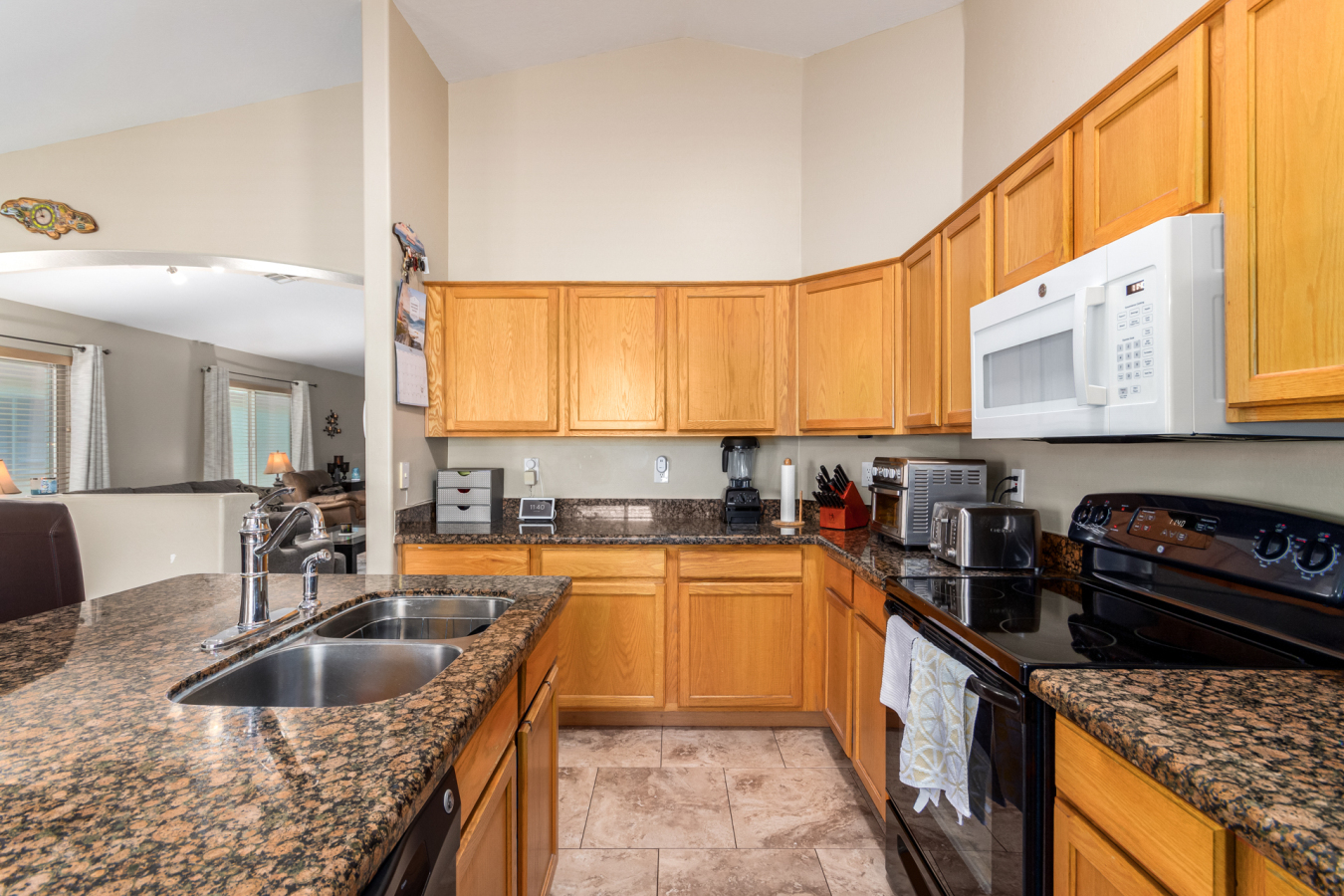 Welcome to this charming single-level home in the desirable Ashton Ranch! Featuring 3 beds, 2 baths, a 2-car garage, & an easy-care landscape. Come inside to find a large living room and an inviting family room that opens to the kitchen! Vaulted ceilings add to the airy feel, complemented by neutral paint and tile flooring w/soft carpet in bedrooms. The kitchen features built-in appliances, granite counters, a pantry, ample wood cabinetry, and an island w/breakfast bar. The den is a versatile space, ideal for an office or reading nook. Primary bedroom boasts a walk-in closet and a full bathroom for added comfort. Discover the perfectly sized backyard, excellent for relaxing or enjoying BBQ! A covered patio, storage shed, & artificial turf complete the picture. 3 community pools to enjoy.-