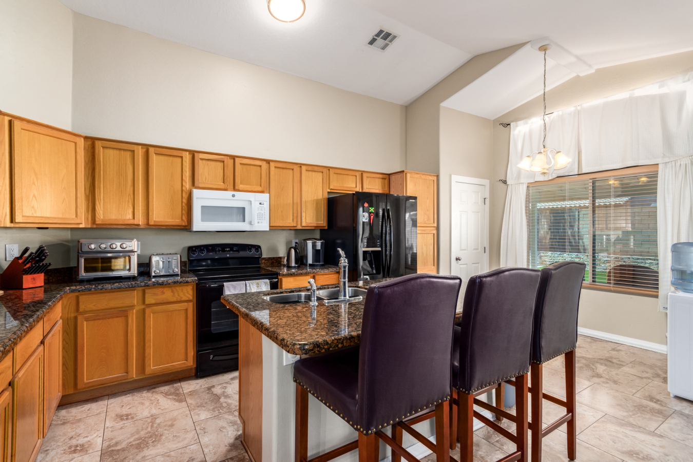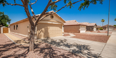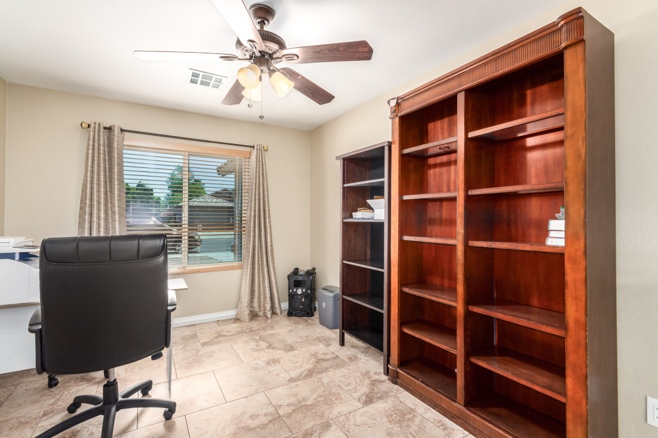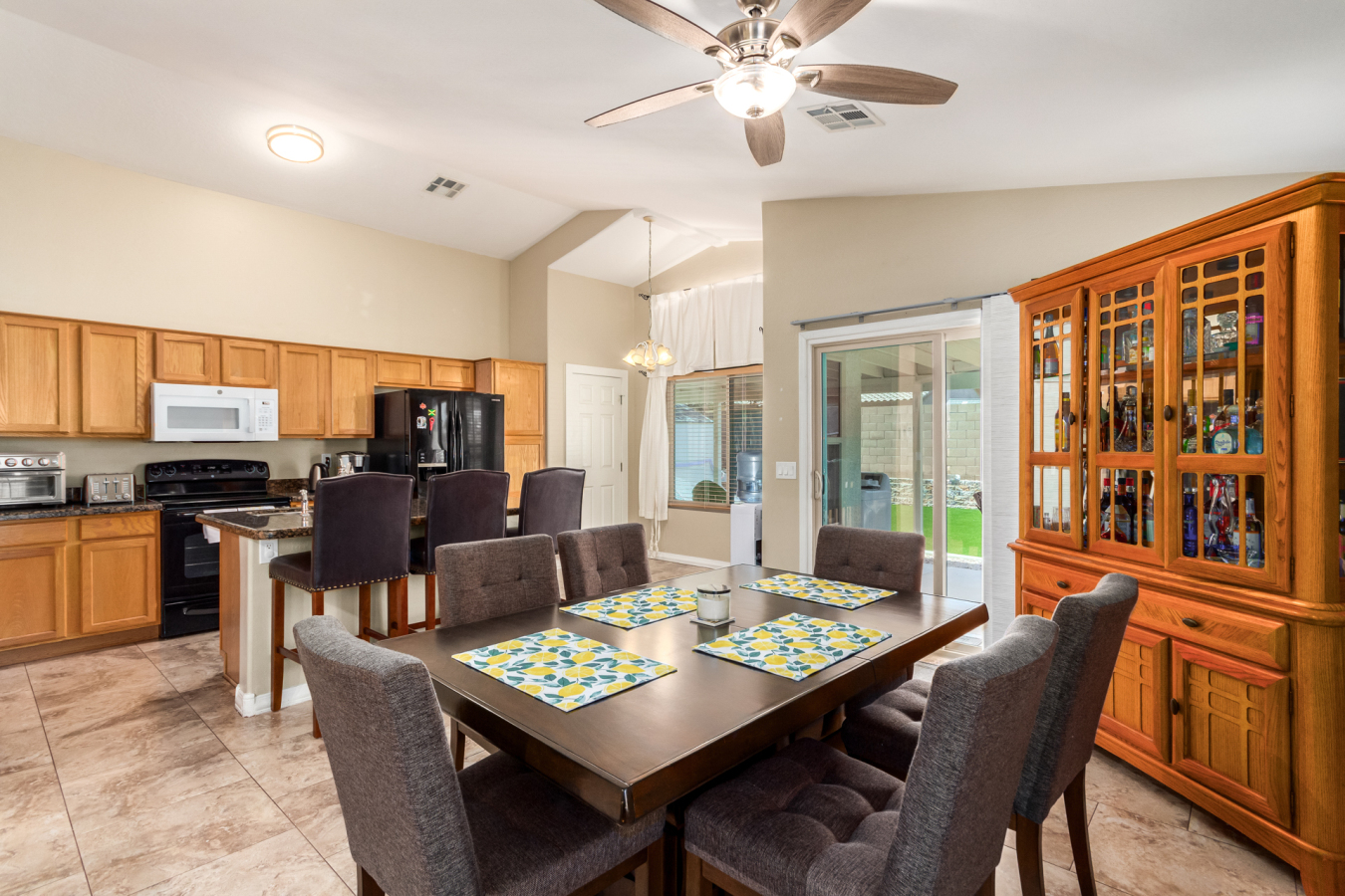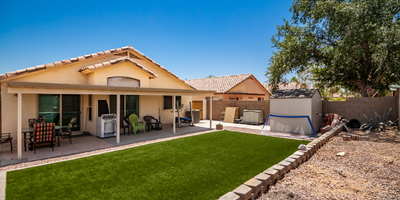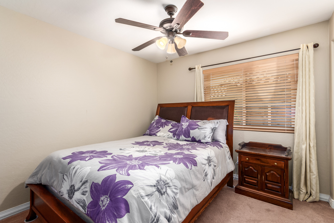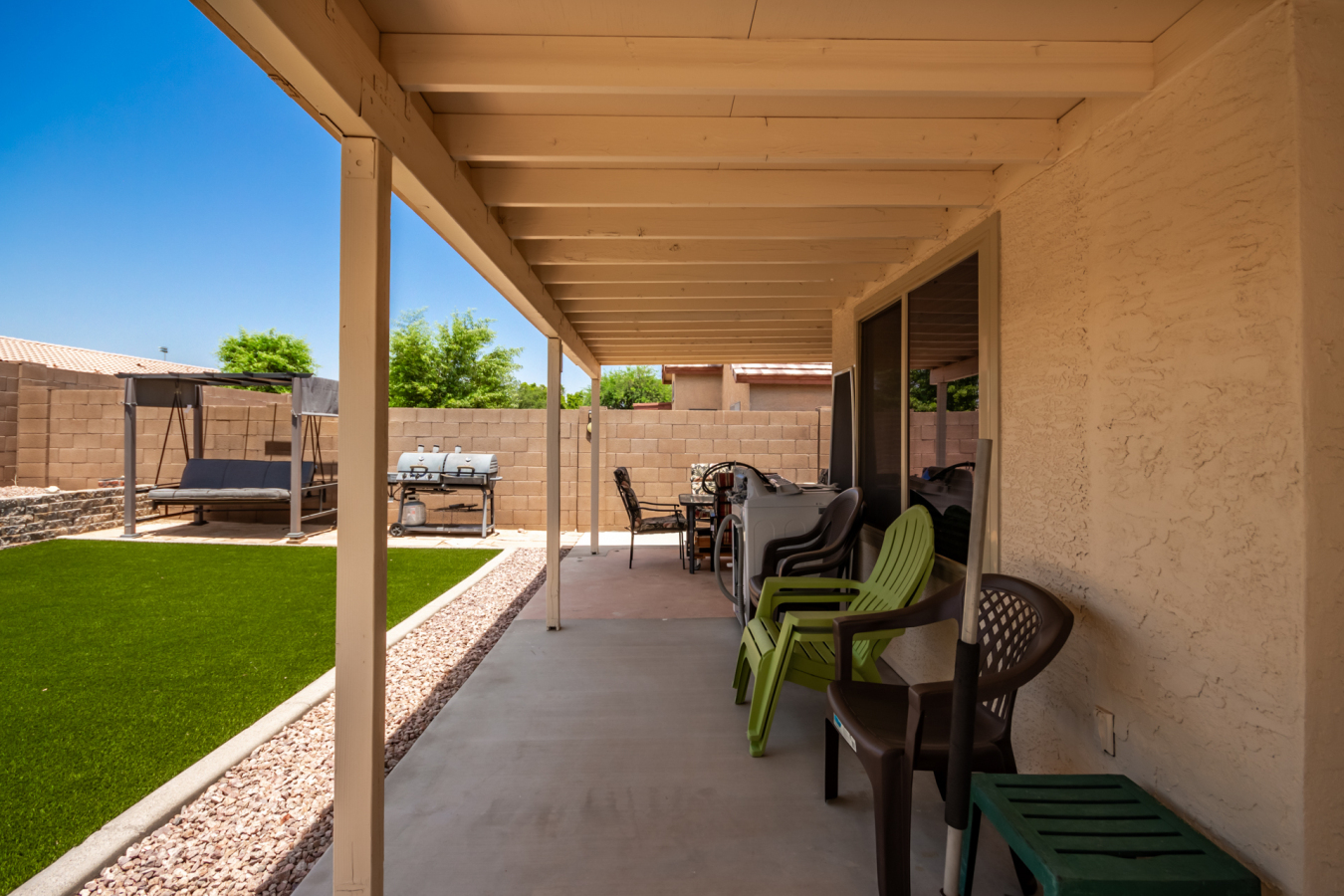 Welcome to this charming single-level home in the desirable Ashton Ranch! Featuring 3 beds, 2 baths, a 2-car garage, & an easy-care landscape. Come inside to find a large living room and an inviting family room that opens to the kitchen! Vaulted ceilings add to the airy feel, complemented by neutral paint and tile flooring w/soft carpet in bedrooms. The kitchen features built-in appliances, granite counters, a pantry, ample wood cabinetry, and an island w/breakfast bar. The den is a versatile space, ideal for an office or reading nook. Primary bedroom boasts a walk-in closet and a full bathroom for added comfort. Discover the perfectly sized backyard, excellent for relaxing or enjoying BBQ! A covered patio, storage shed, & artificial turf complete the picture. 3 community pools to enjoy.-