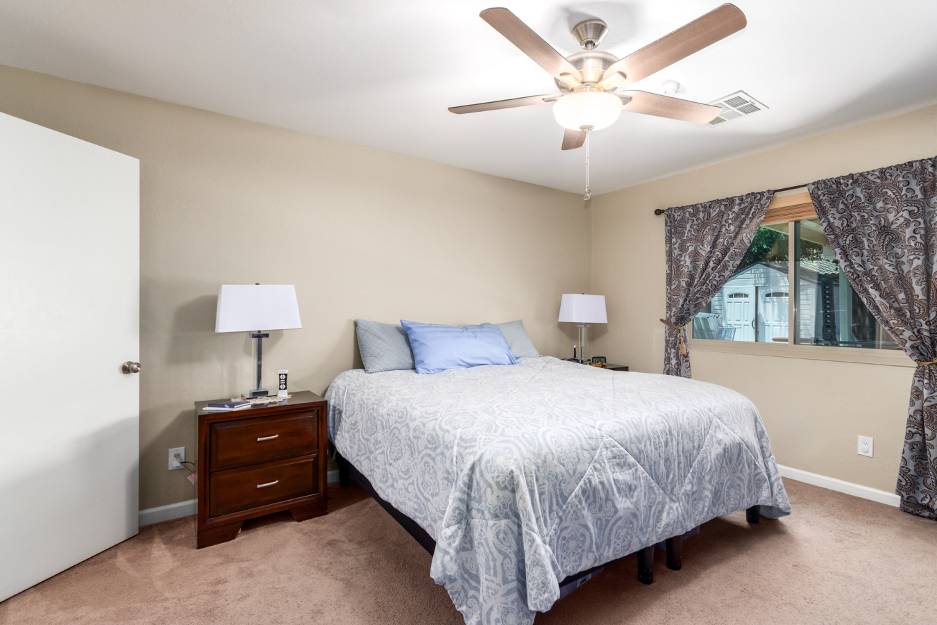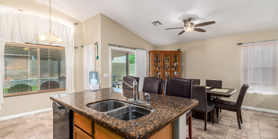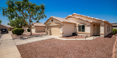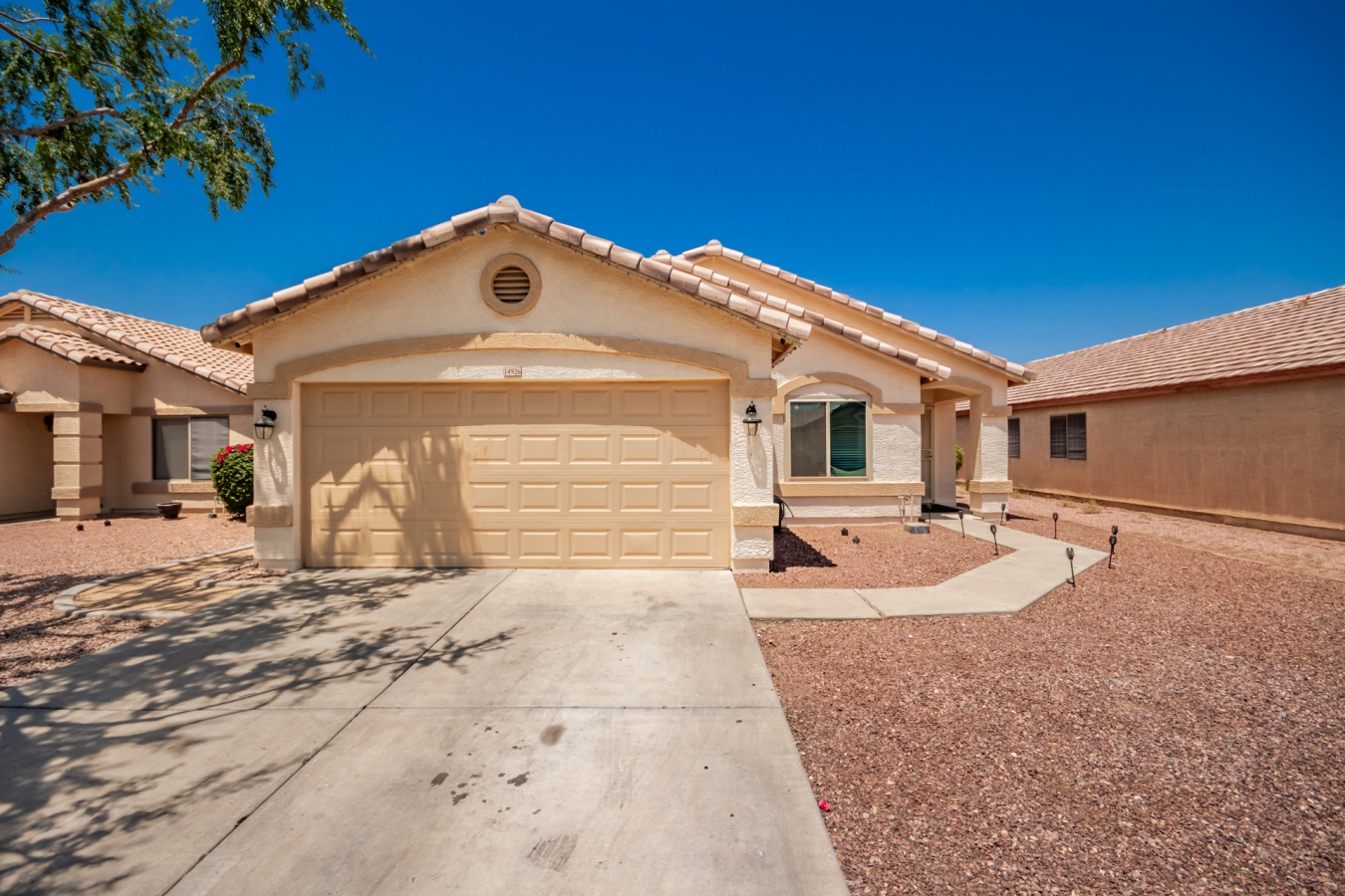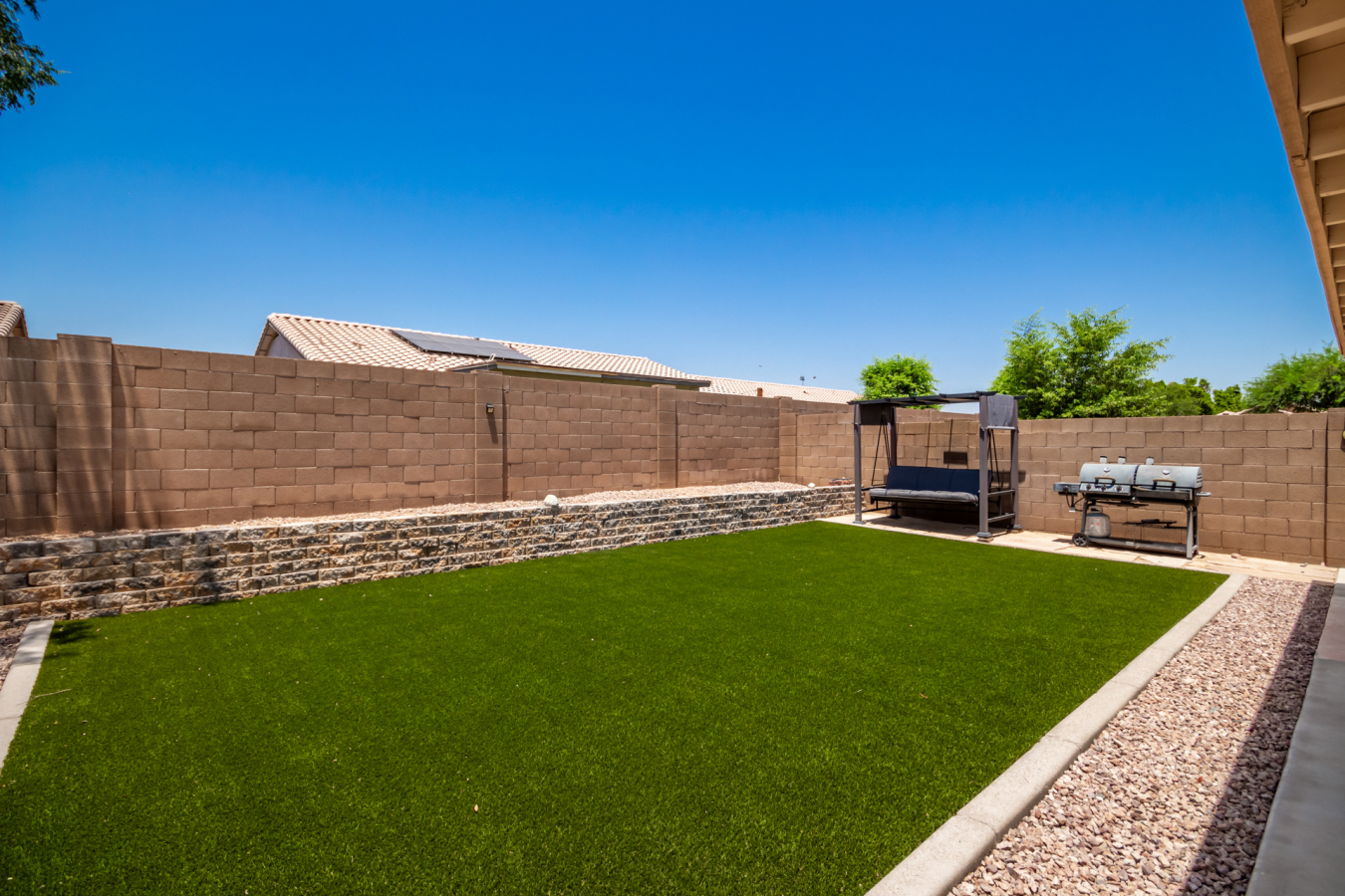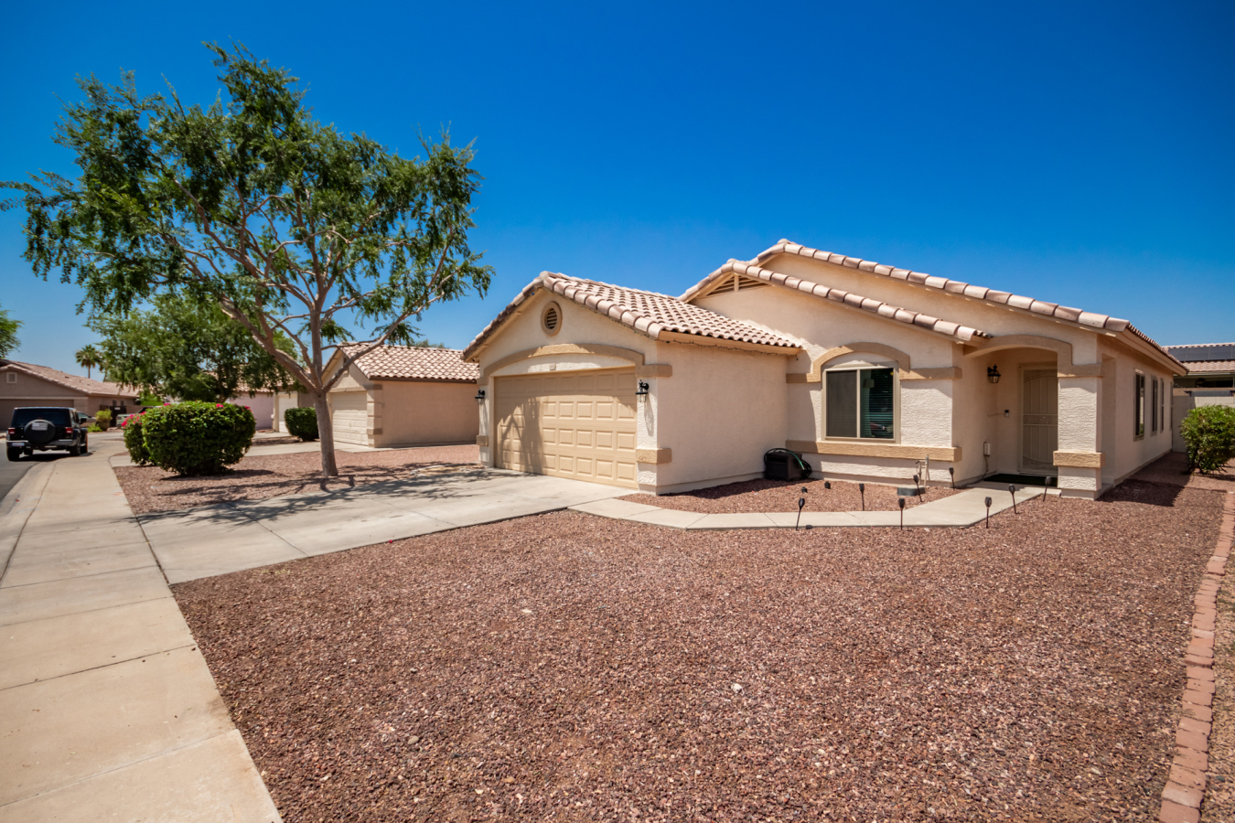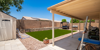 Welcome to this charming single-level home in the desirable Ashton Ranch! Featuring 3 beds, 2 baths, a 2-car garage, & an easy-care landscape. Come inside to find a large living room and an inviting family room that opens to the kitchen! Vaulted ceilings add to the airy feel, complemented by neutral paint and tile flooring w/soft carpet in bedrooms. The kitchen features built-in appliances, granite counters, a pantry, ample wood cabinetry, and an island w/breakfast bar. The den is a versatile space, ideal for an office or reading nook. Primary bedroom boasts a walk-in closet and a full bathroom for added comfort. Discover the perfectly sized backyard, excellent for relaxing or enjoying BBQ! A covered patio, storage shed, & artificial turf complete the picture. 3 community pools to enjoy.-