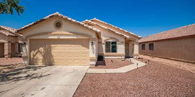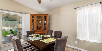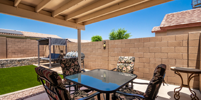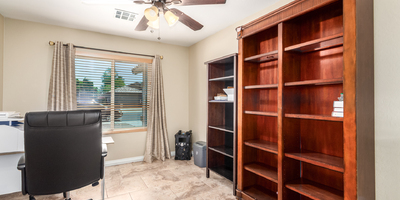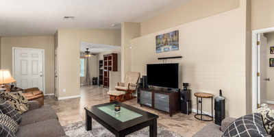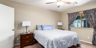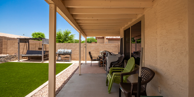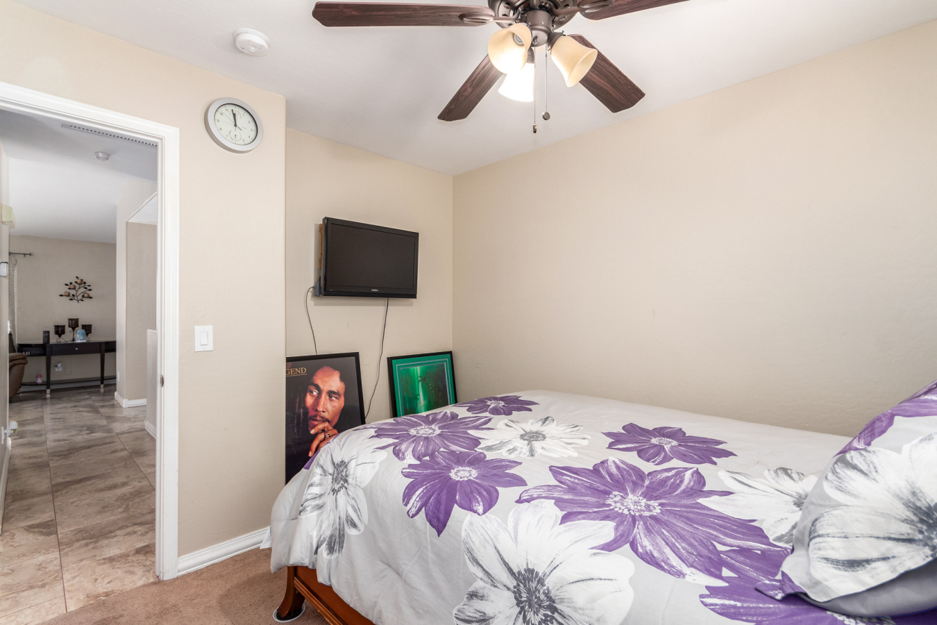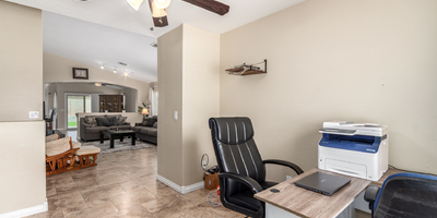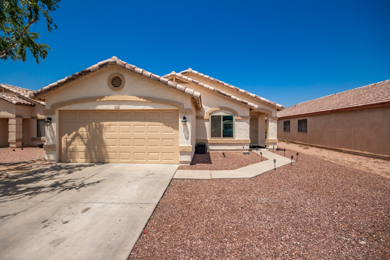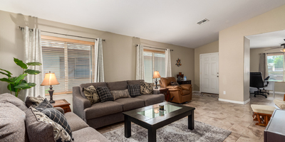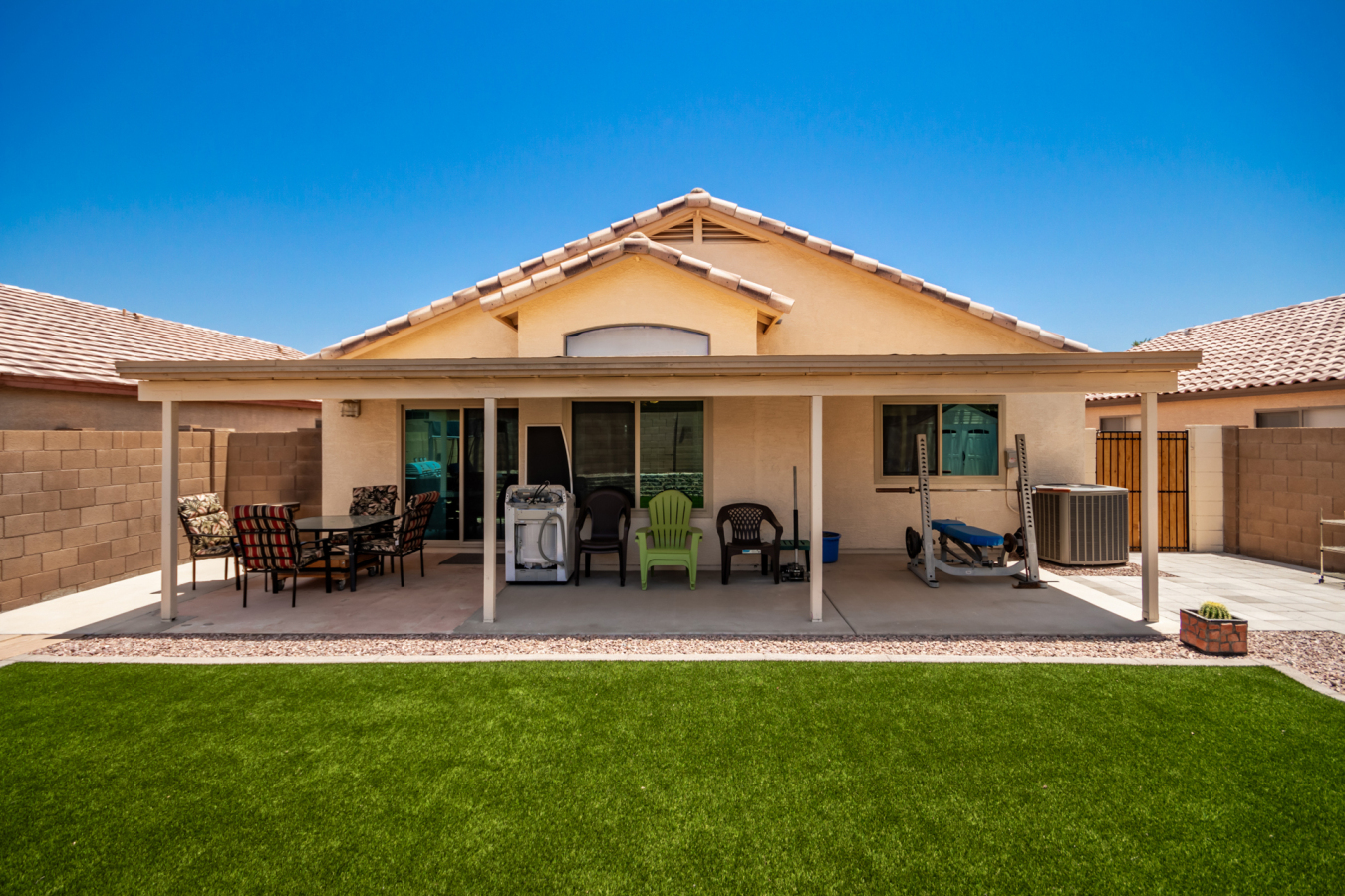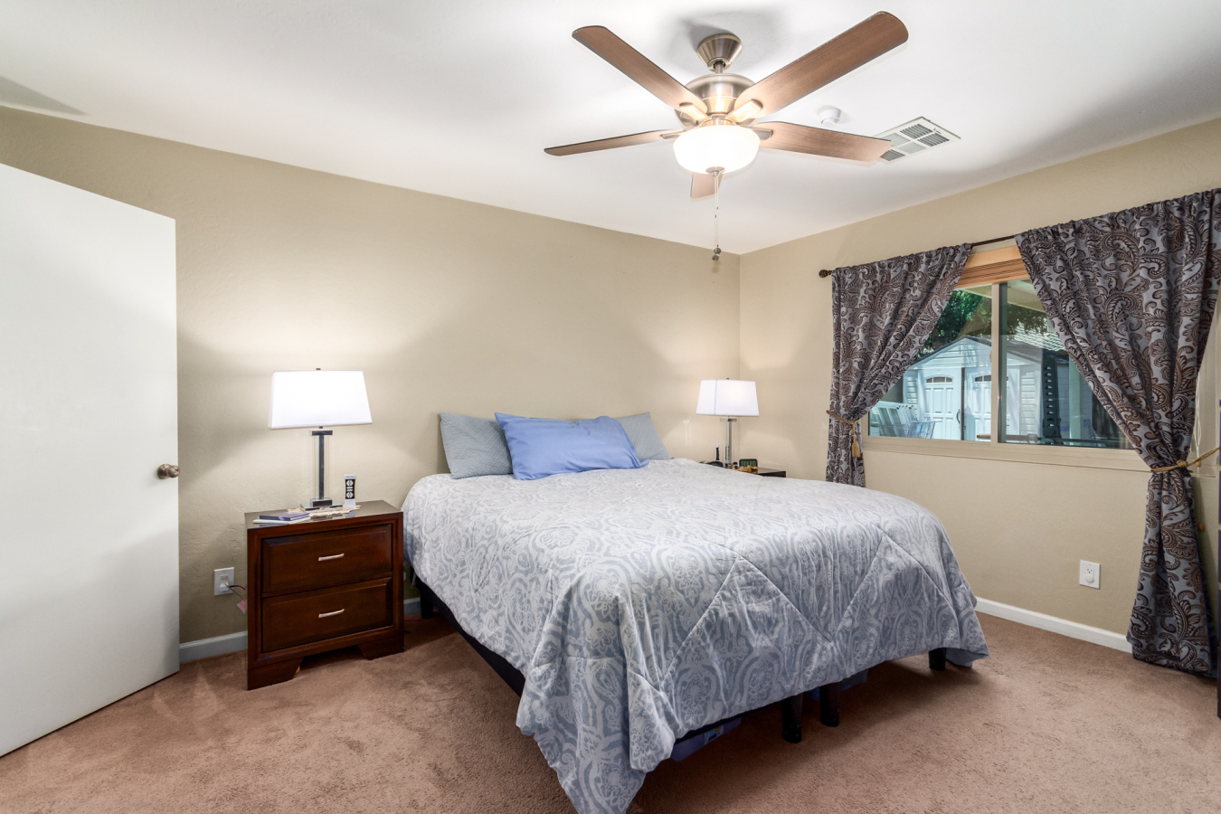 Welcome to this charming single-level home in the desirable Ashton Ranch! Featuring 3 beds, 2 baths, a 2-car garage, & an easy-care landscape. Come inside to find a large living room and an inviting family room that opens to the kitchen! Vaulted ceilings add to the airy feel, complemented by neutral paint and tile flooring w/soft carpet in bedrooms. The kitchen features built-in appliances, granite counters, a pantry, ample wood cabinetry, and an island w/breakfast bar. The den is a versatile space, ideal for an office or reading nook. Primary bedroom boasts a walk-in closet and a full bathroom for added comfort. Discover the perfectly sized backyard, excellent for relaxing or enjoying BBQ! A covered patio, storage shed, & artificial turf complete the picture. 3 community pools to enjoy.-