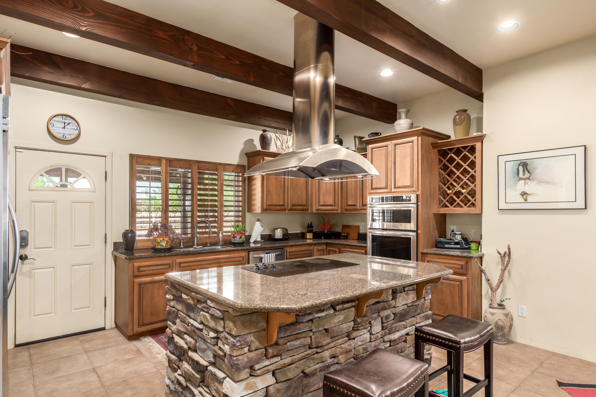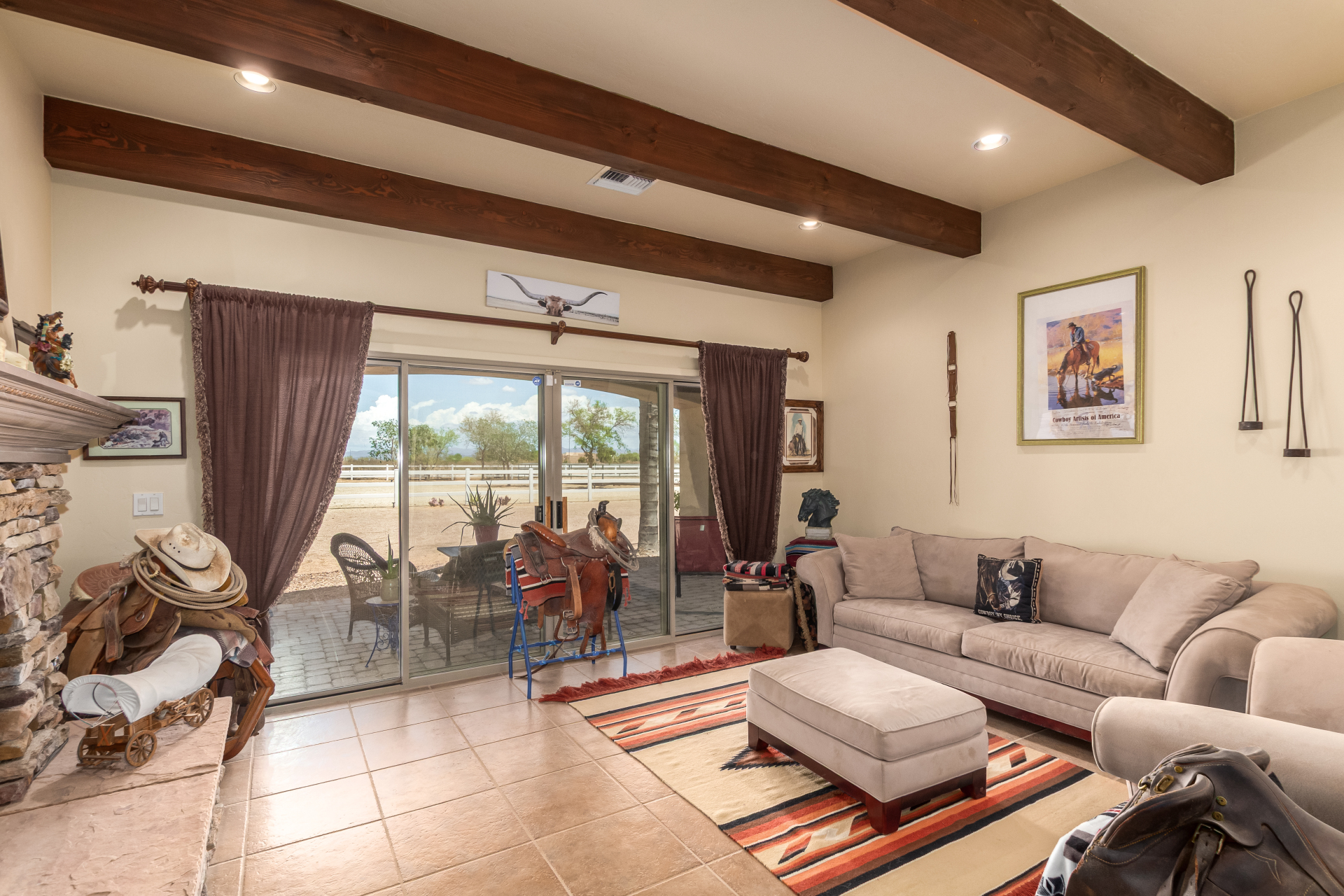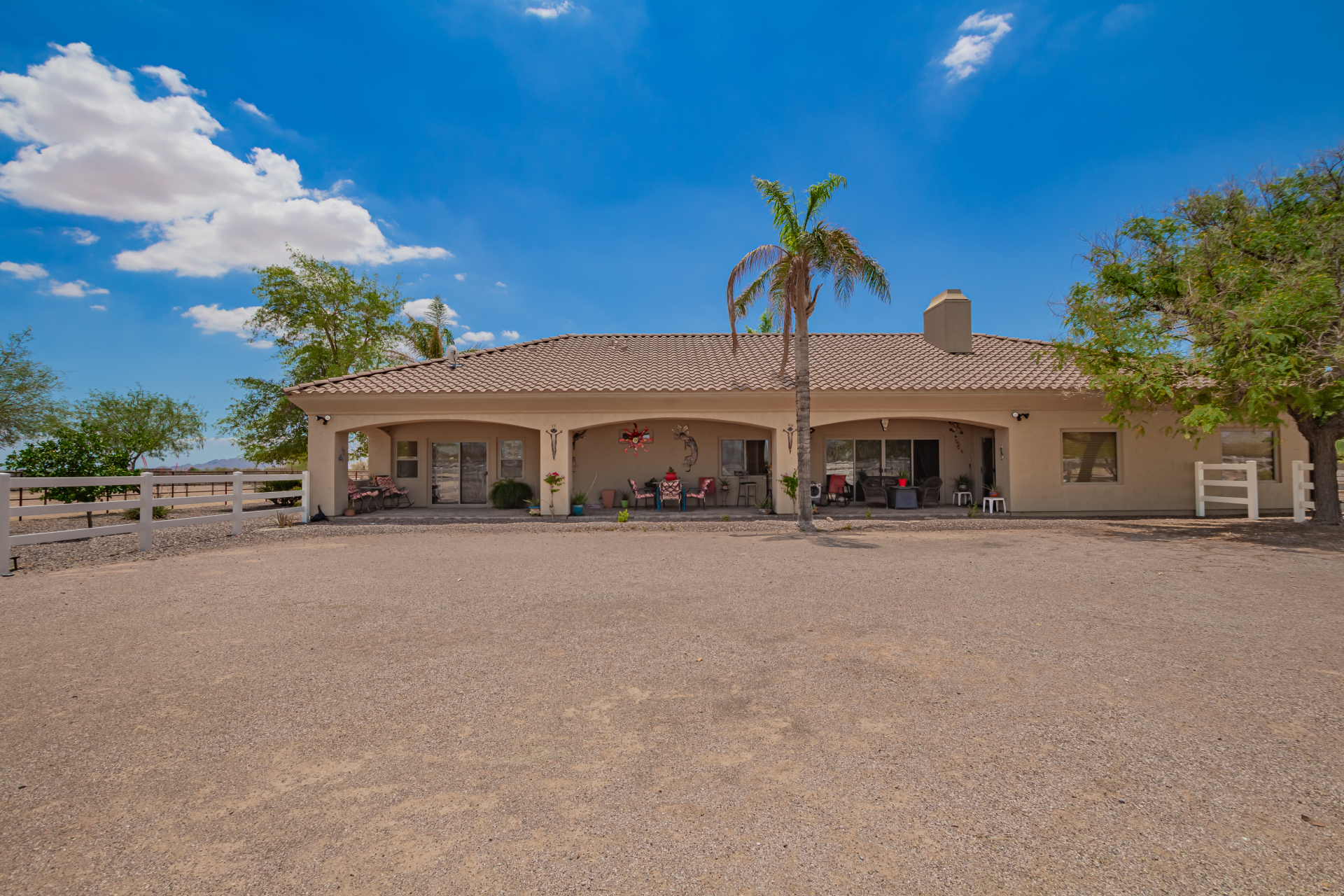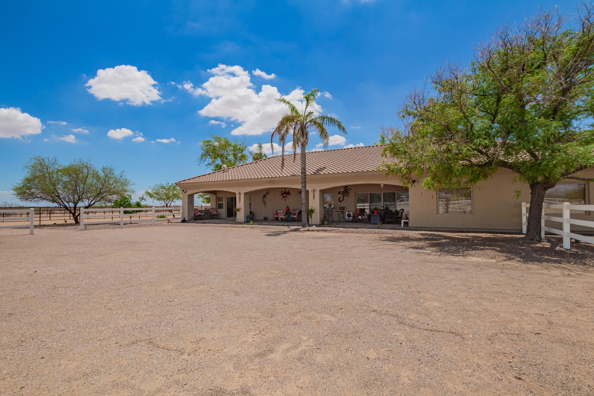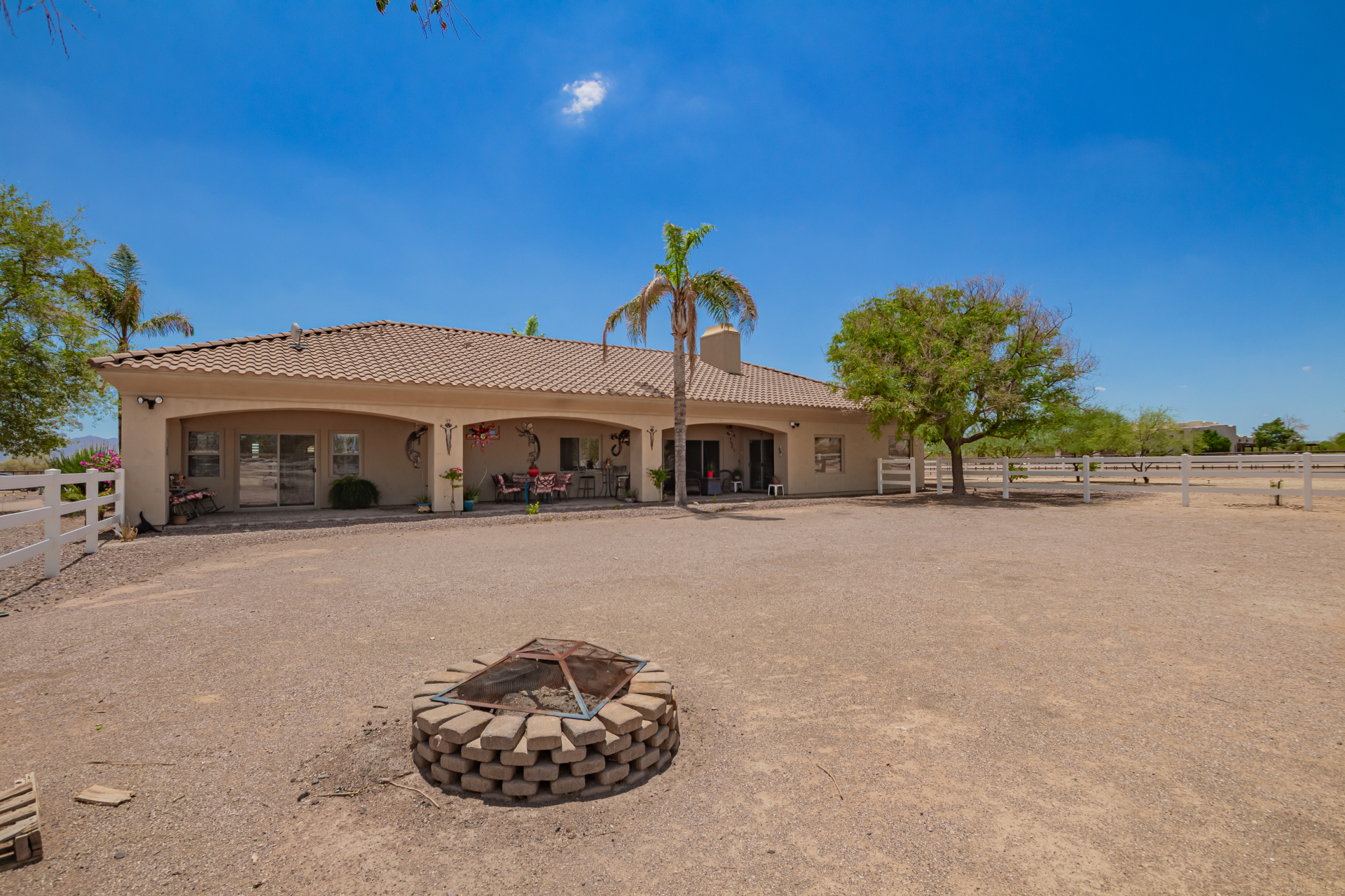 A rare find! Remarkable 4-bed, 2.5-bath masterpiece, situated on 5 acres of PRIME land, is an equestrian enthusiast's dream come true! Captivating interior boasts a bright living room w/a stone fireplace & a family room ideal for gatherings. Timeless details like an inviting foyer, tile flooring, exposed ceiling beams, graceful archways, & plantation shutters elevate the elegance throughout. Gourmet eat-in kitchen is a cook's delight, fully equipped w/recessed lighting, ample cabinetry topped w/crown molding, granite counters, a center island w/a breakfast bar, & high-end SS appliances such as a wall oven, cooktop electric, & range hood. Retreat to the grand owner's suite featuring plush carpet, outdoor access, a walk-in closet, & a spa-like ensuite w/dual vanities & a jetted tub.