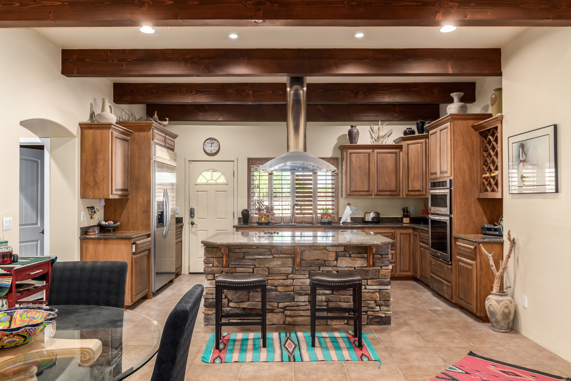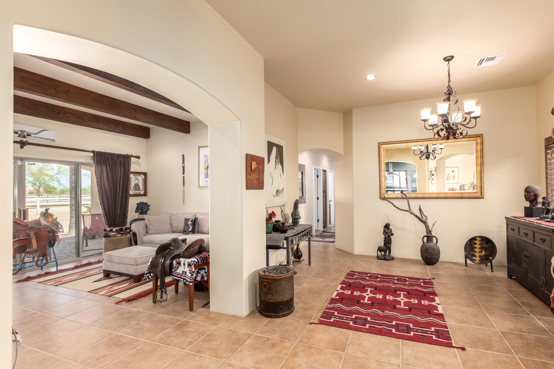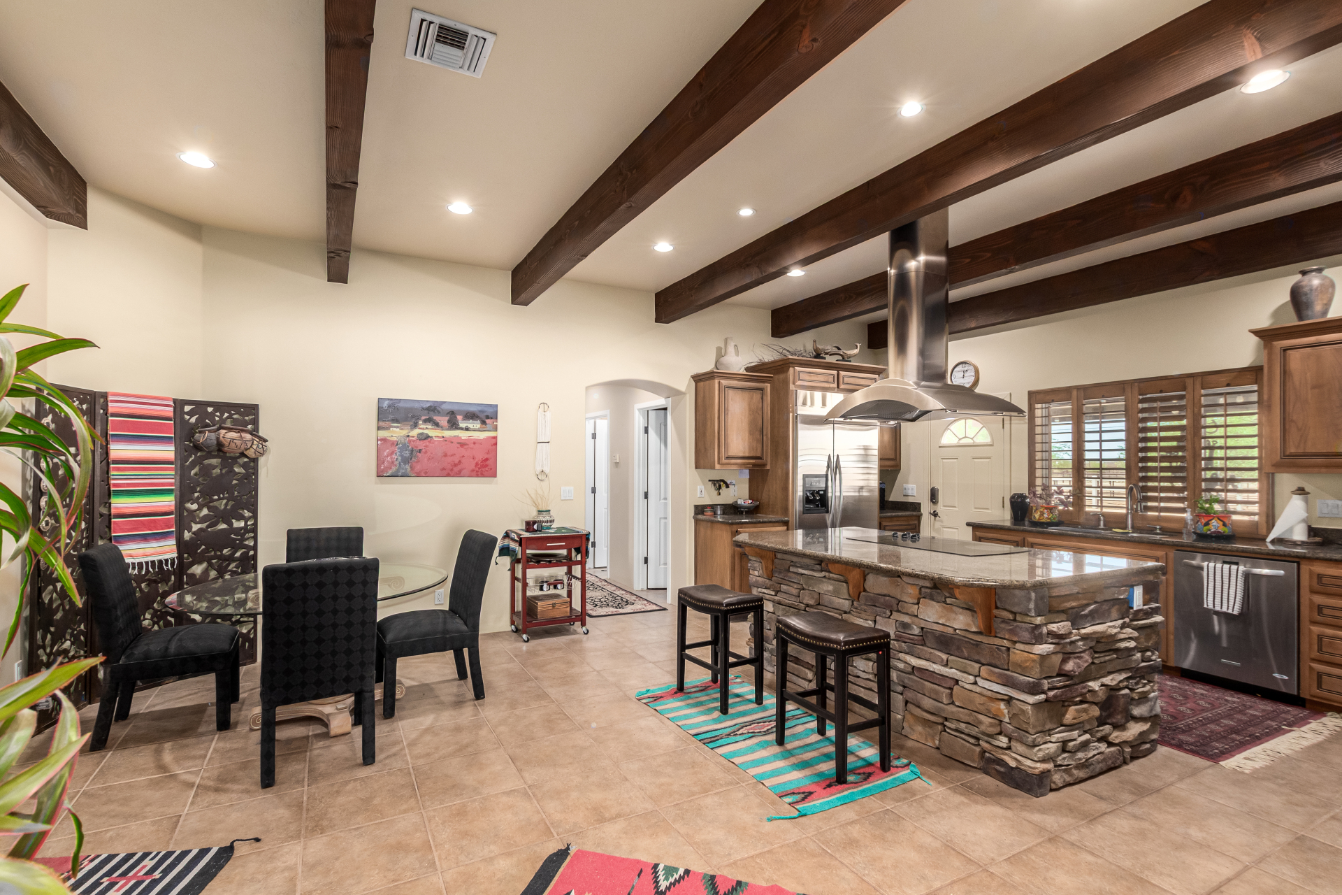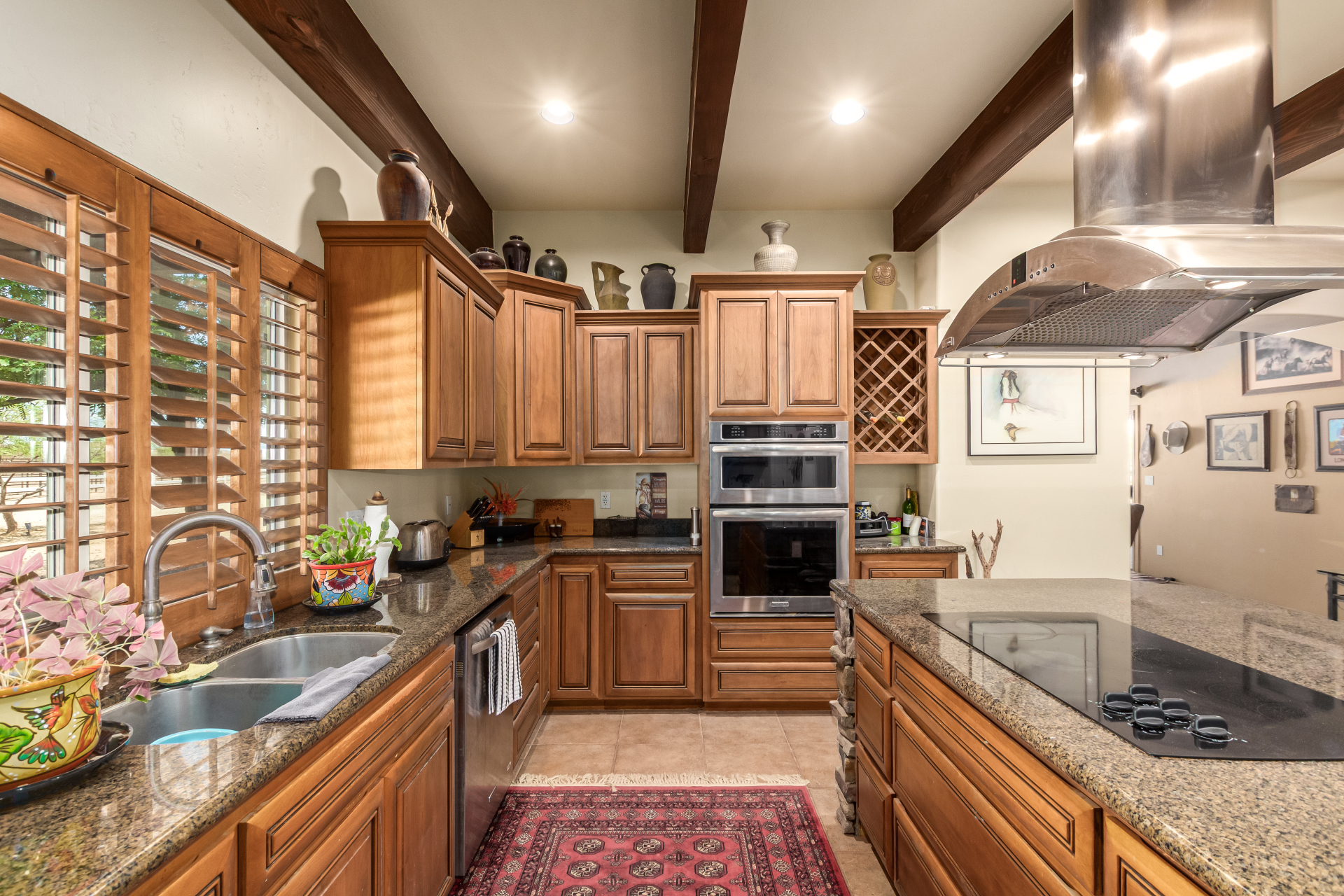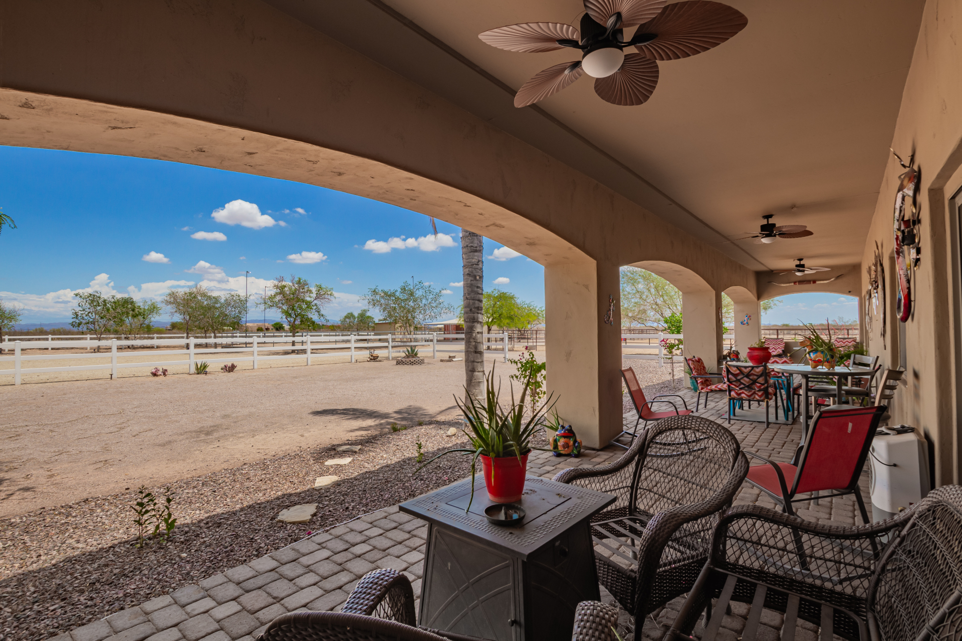 A rare find! Remarkable 4-bed, 2.5-bath masterpiece, situated on 5 acres of PRIME land, is an equestrian enthusiast's dream come true! Captivating interior boasts a bright living room w/a stone fireplace & a family room ideal for gatherings. Timeless details like an inviting foyer, tile flooring, exposed ceiling beams, graceful archways, & plantation shutters elevate the elegance throughout. Gourmet eat-in kitchen is a cook's delight, fully equipped w/recessed lighting, ample cabinetry topped w/crown molding, granite counters, a center island w/a breakfast bar, & high-end SS appliances such as a wall oven, cooktop electric, & range hood. Retreat to the grand owner's suite featuring plush carpet, outdoor access, a walk-in closet, & a spa-like ensuite w/dual vanities & a jetted tub.