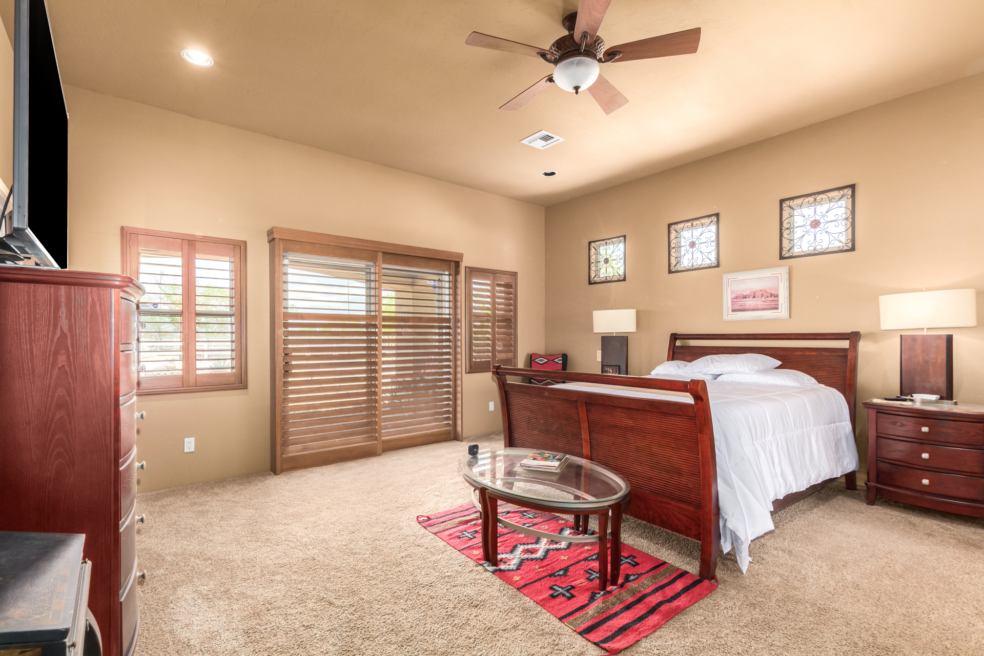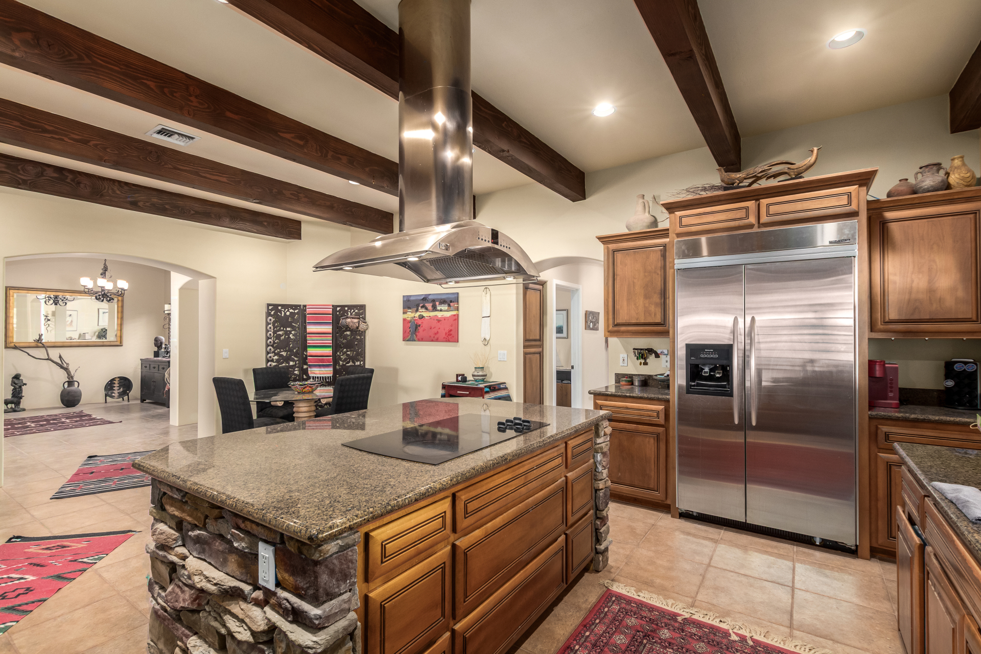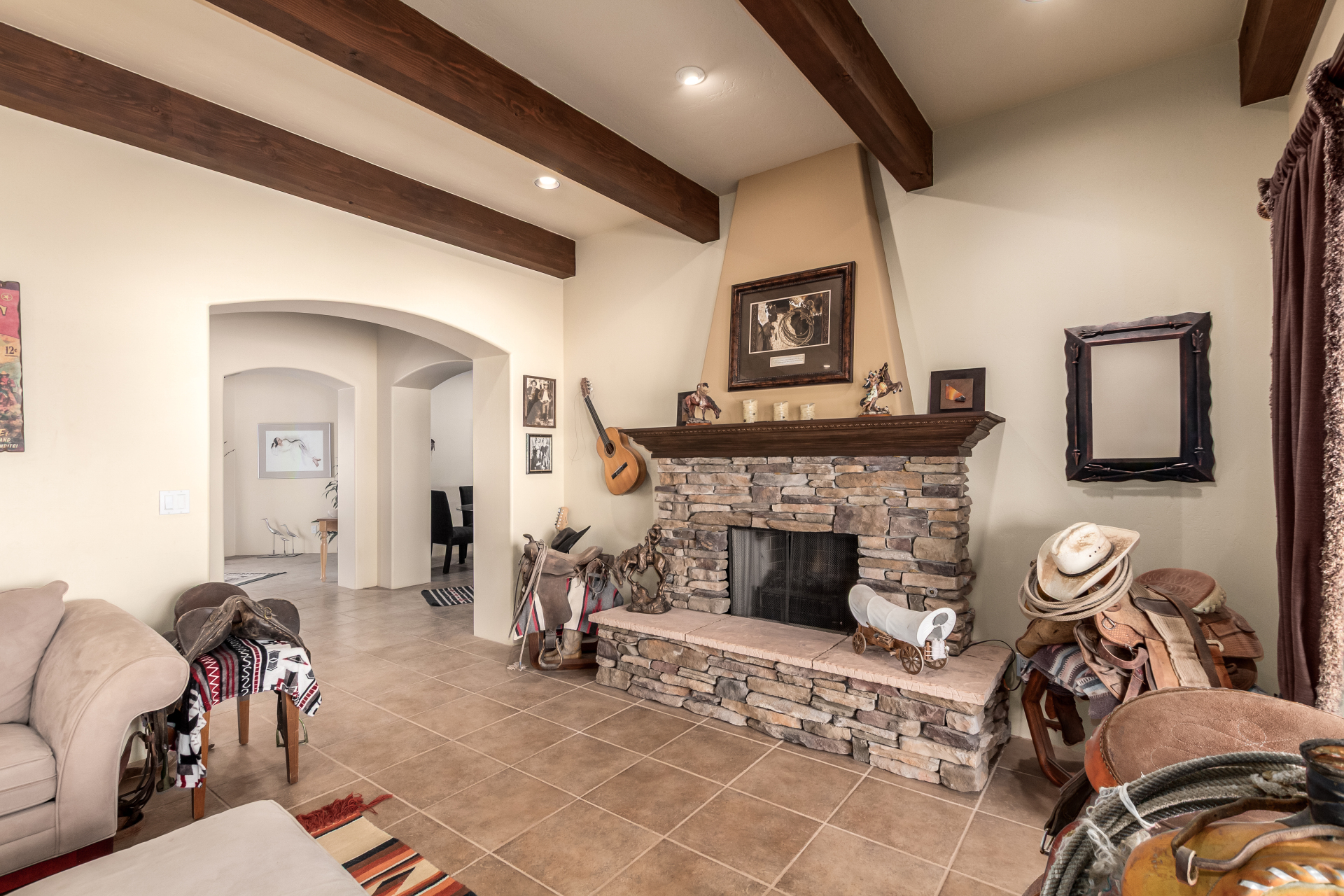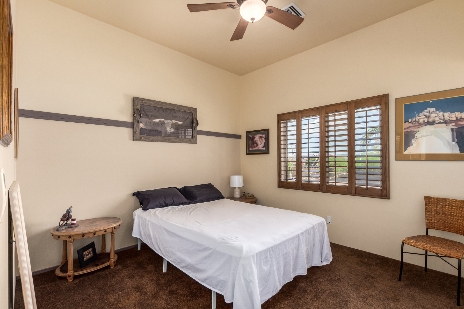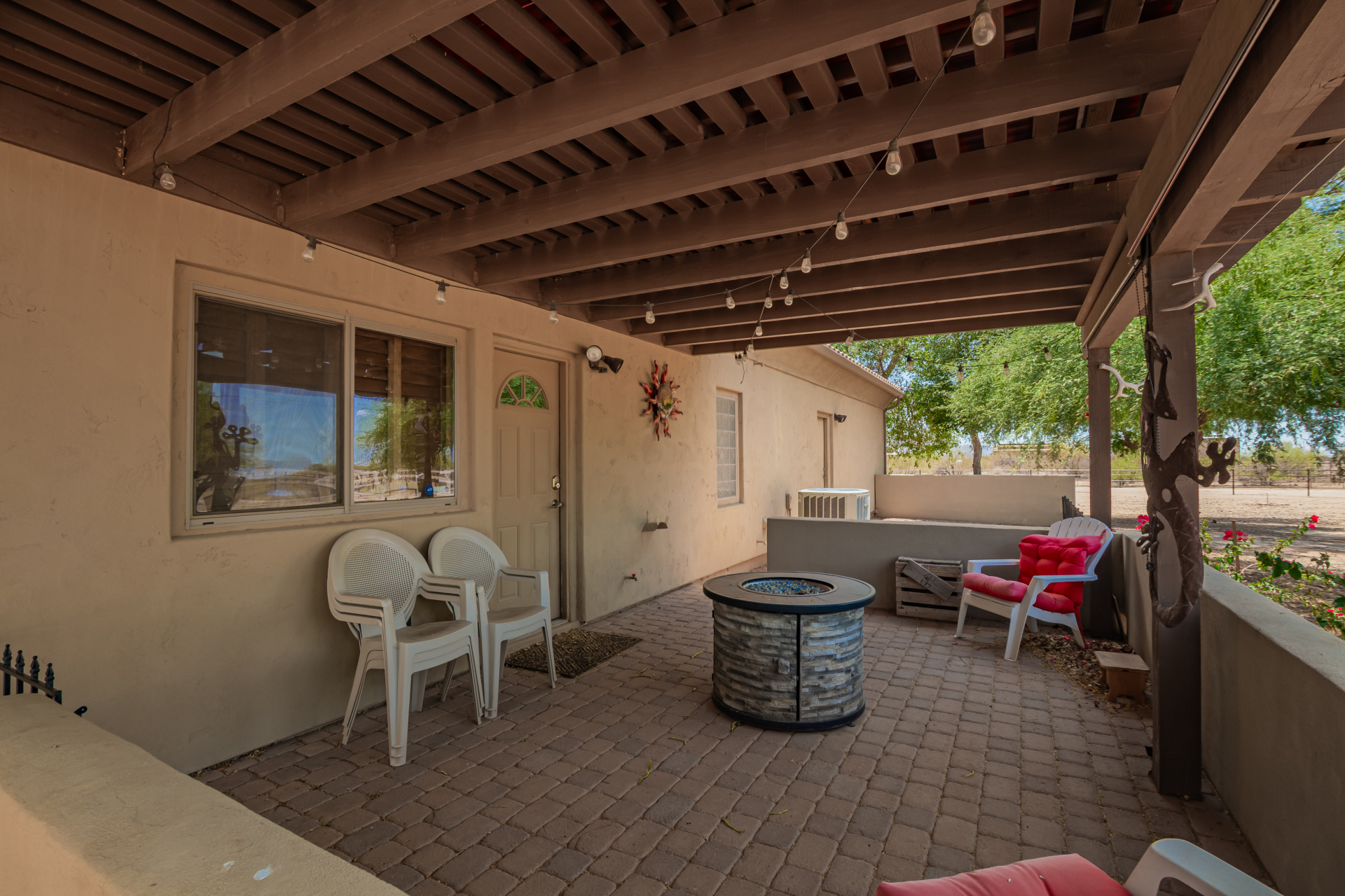 A rare find! Remarkable 4-bed, 2.5-bath masterpiece, situated on 5 acres of PRIME land, is an equestrian enthusiast's dream come true! Captivating interior boasts a bright living room w/a stone fireplace & a family room ideal for gatherings. Timeless details like an inviting foyer, tile flooring, exposed ceiling beams, graceful archways, & plantation shutters elevate the elegance throughout. Gourmet eat-in kitchen is a cook's delight, fully equipped w/recessed lighting, ample cabinetry topped w/crown molding, granite counters, a center island w/a breakfast bar, & high-end SS appliances such as a wall oven, cooktop electric, & range hood. Retreat to the grand owner's suite featuring plush carpet, outdoor access, a walk-in closet, & a spa-like ensuite w/dual vanities & a jetted tub.