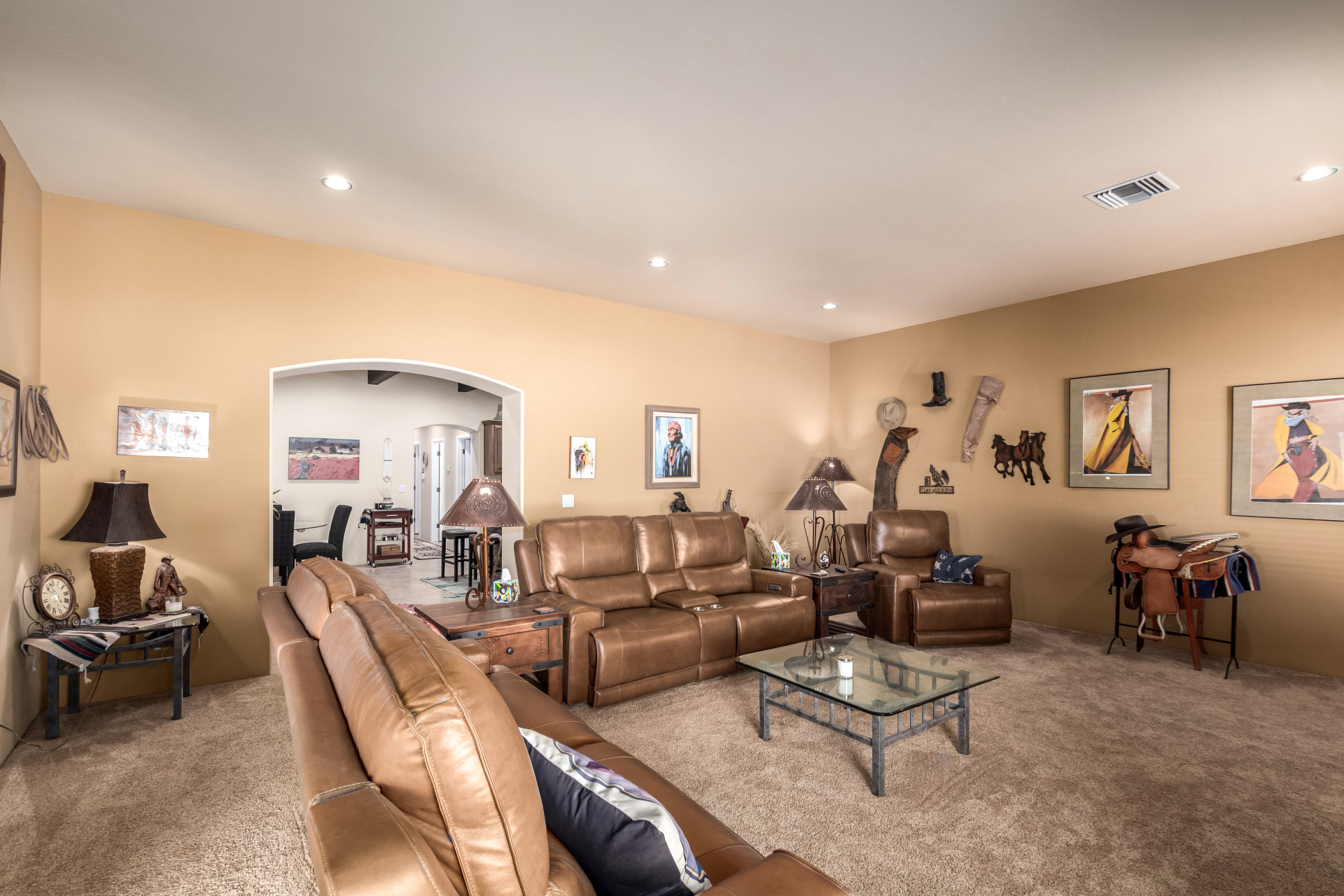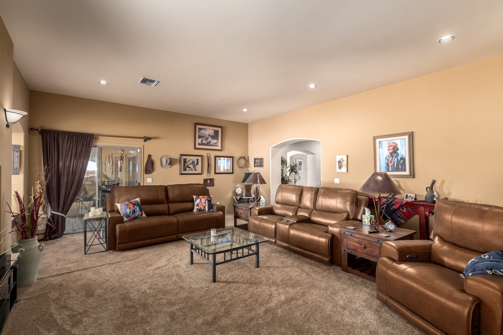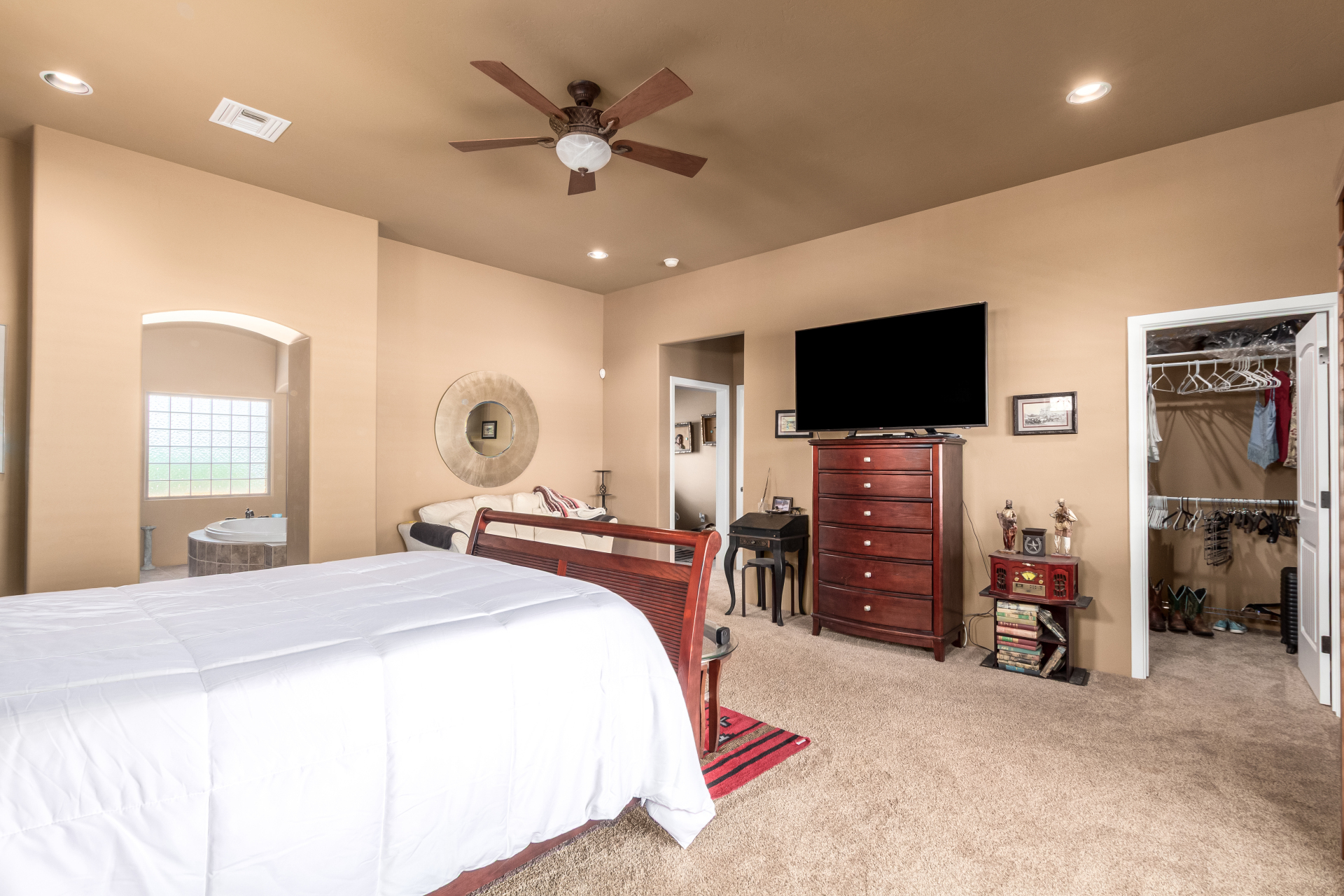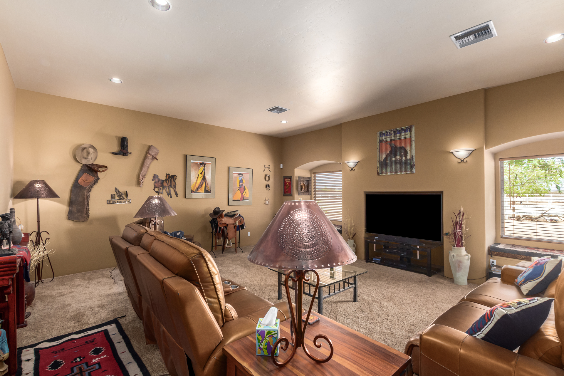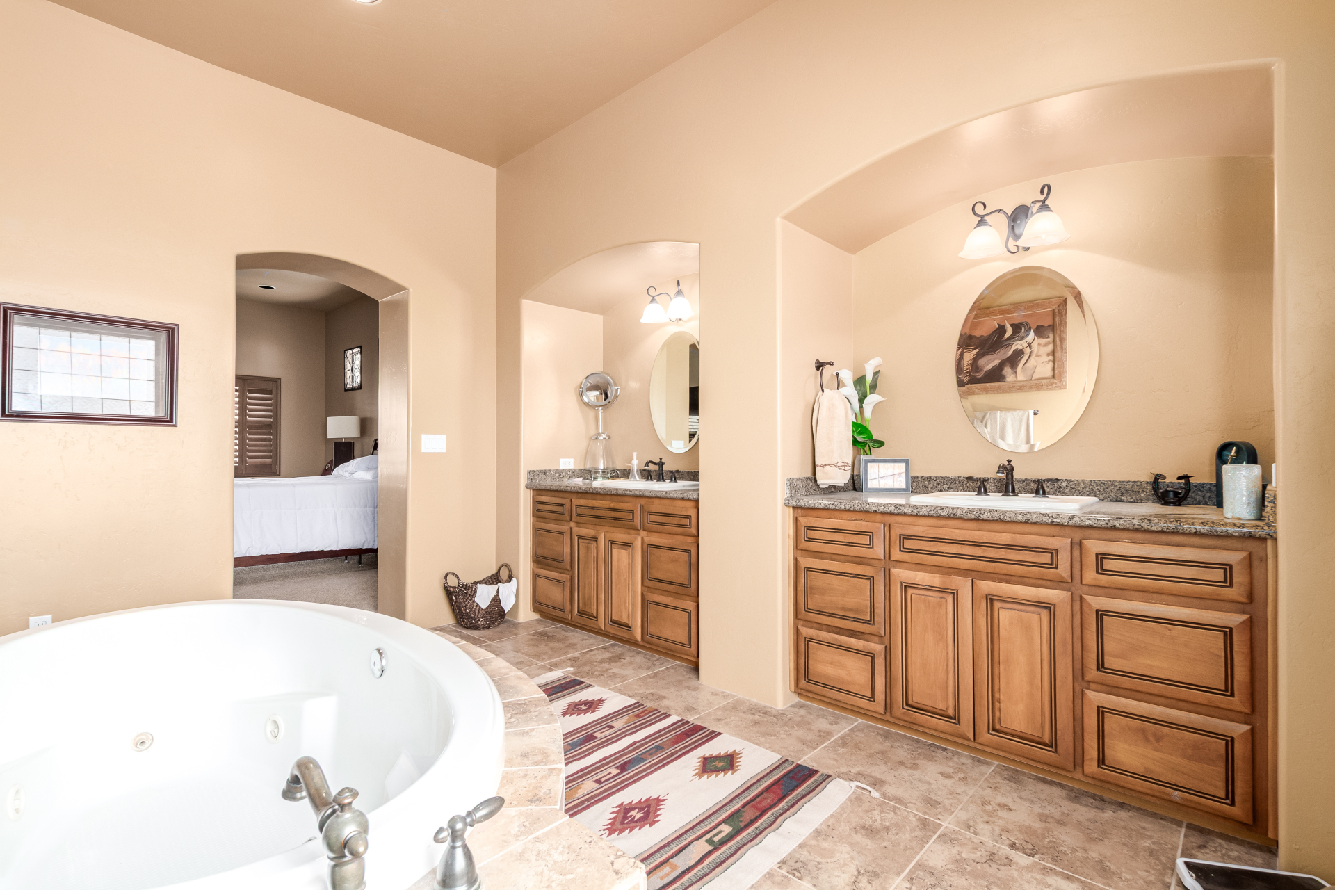 A rare find! Remarkable 4-bed, 2.5-bath masterpiece, situated on 5 acres of PRIME land, is an equestrian enthusiast's dream come true! Captivating interior boasts a bright living room w/a stone fireplace & a family room ideal for gatherings. Timeless details like an inviting foyer, tile flooring, exposed ceiling beams, graceful archways, & plantation shutters elevate the elegance throughout. Gourmet eat-in kitchen is a cook's delight, fully equipped w/recessed lighting, ample cabinetry topped w/crown molding, granite counters, a center island w/a breakfast bar, & high-end SS appliances such as a wall oven, cooktop electric, & range hood. Retreat to the grand owner's suite featuring plush carpet, outdoor access, a walk-in closet, & a spa-like ensuite w/dual vanities & a jetted tub.