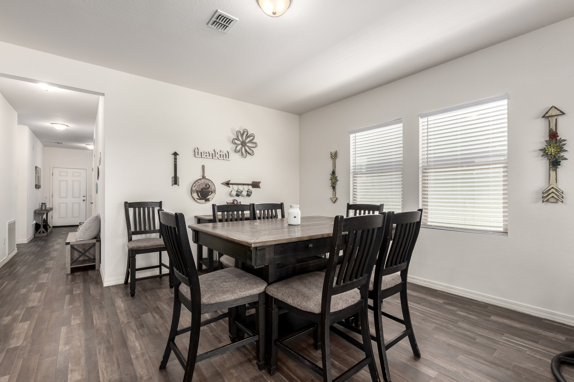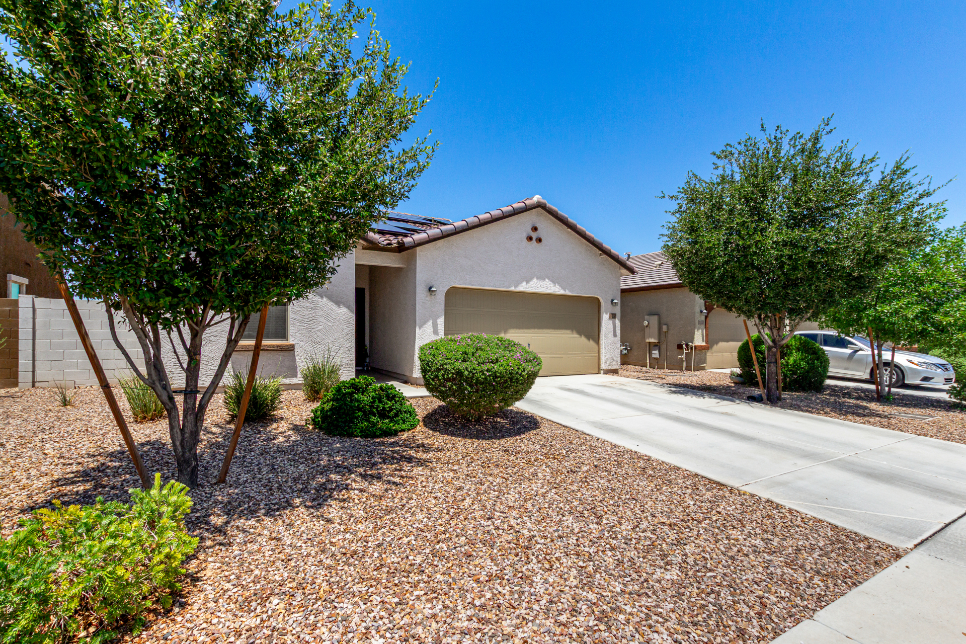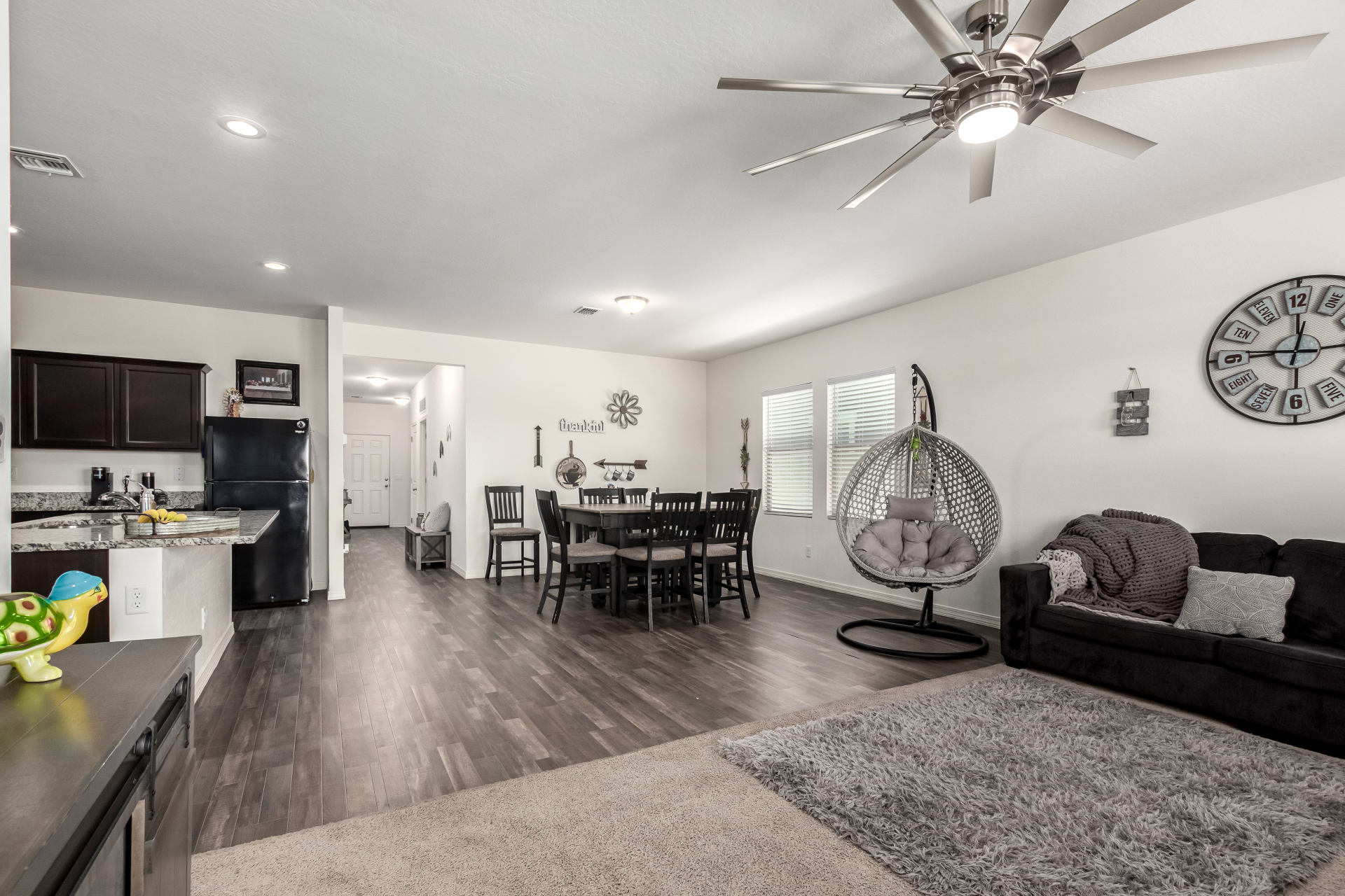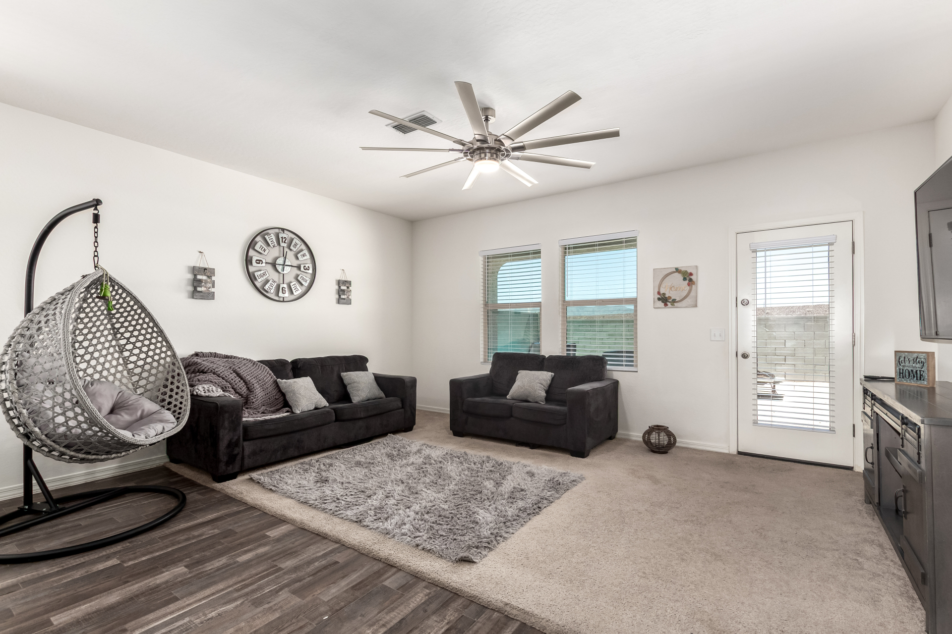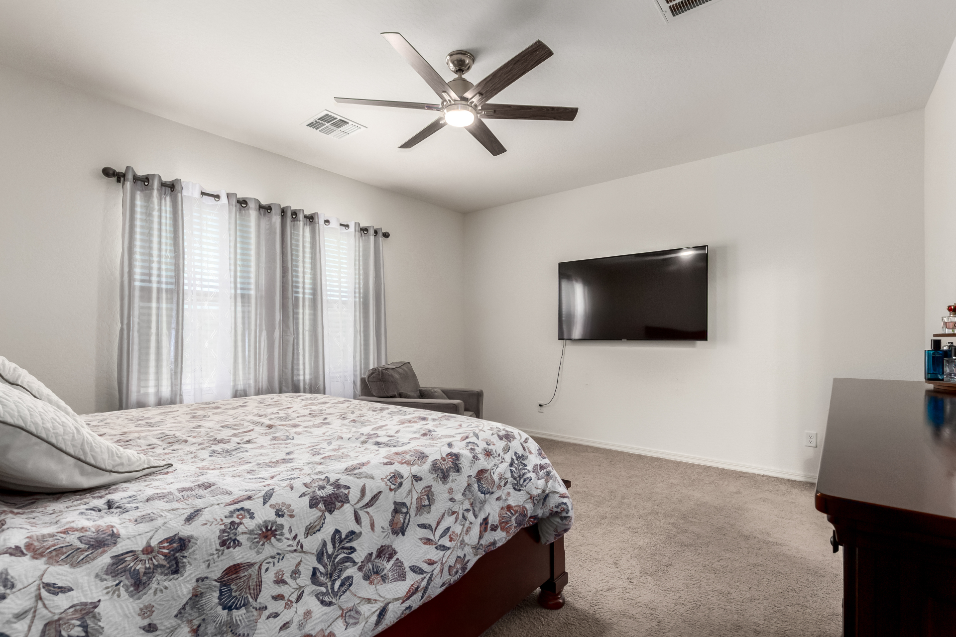 Become the proud owner of this charming 4-bedroom residence in Blue Horizons! You're welcomed by a captivating open layout with high ceilings, a soothing palette, blinds, and a harmonious blend of soft carpeting and wood-look flooring. The gourmet kitchen comes with granite counters, abundant wood cabinetry with crown moulding, recessed lighting, SS appliances, a pantry, and an island with a breakfast bar. The cozy primary bedroom includes a private bathroom and a practical walk-in closet for an organized wardrobe. Spend enchanting evenings in the backyard, complete with a covered patio for dining al fresco and breathtaking mountain views that provide a picturesque backdrop. Make this gem yours!