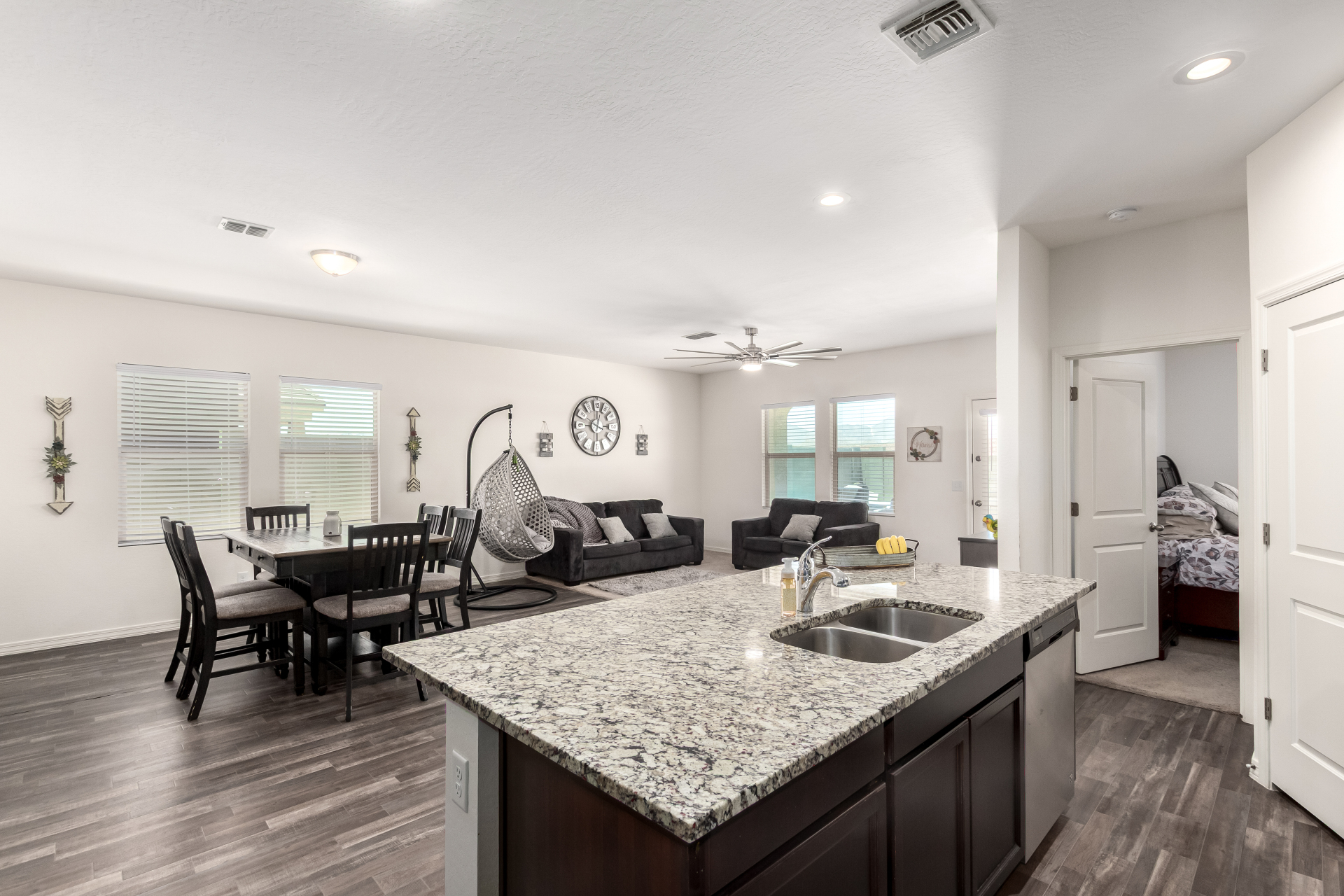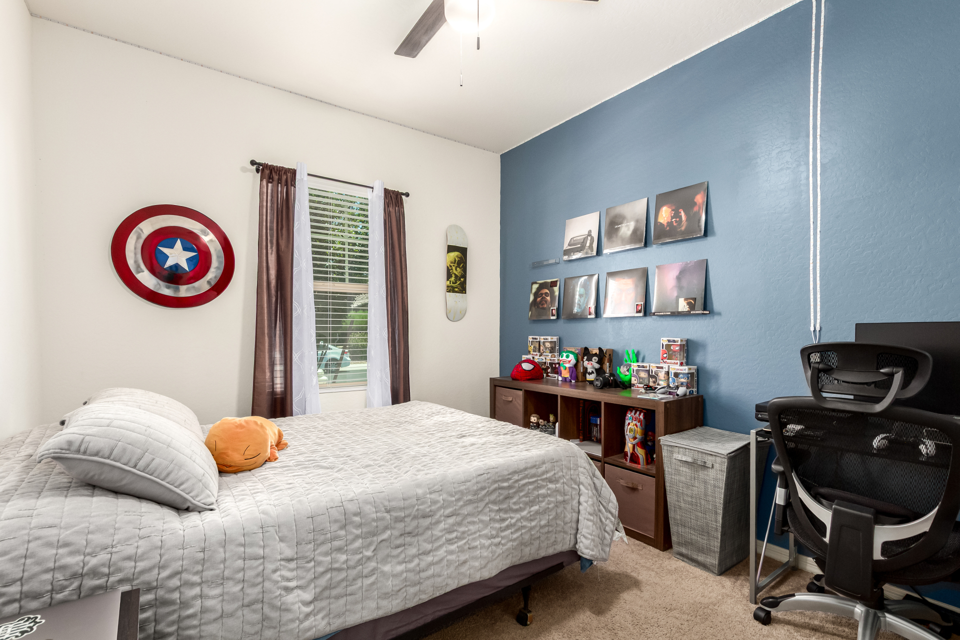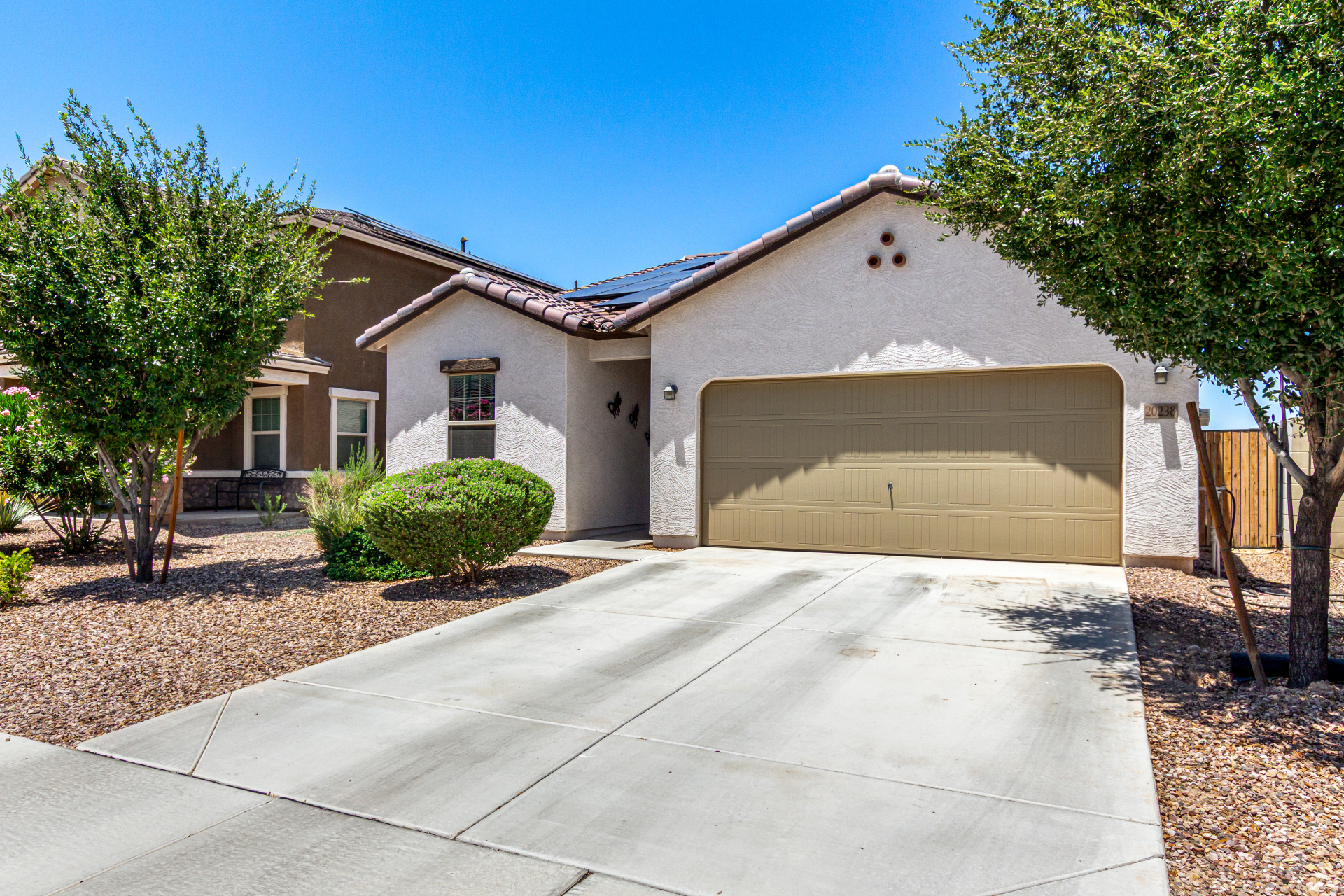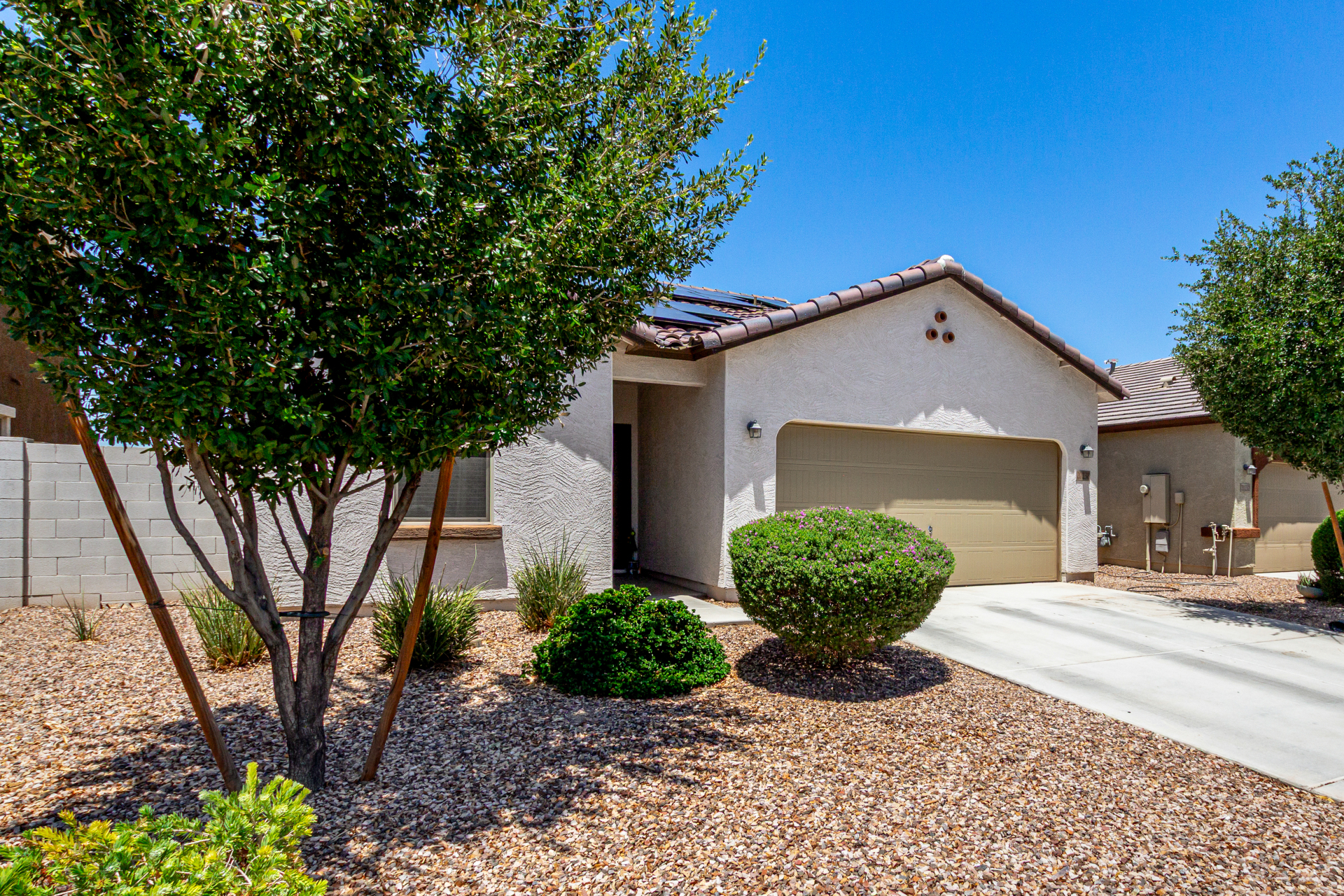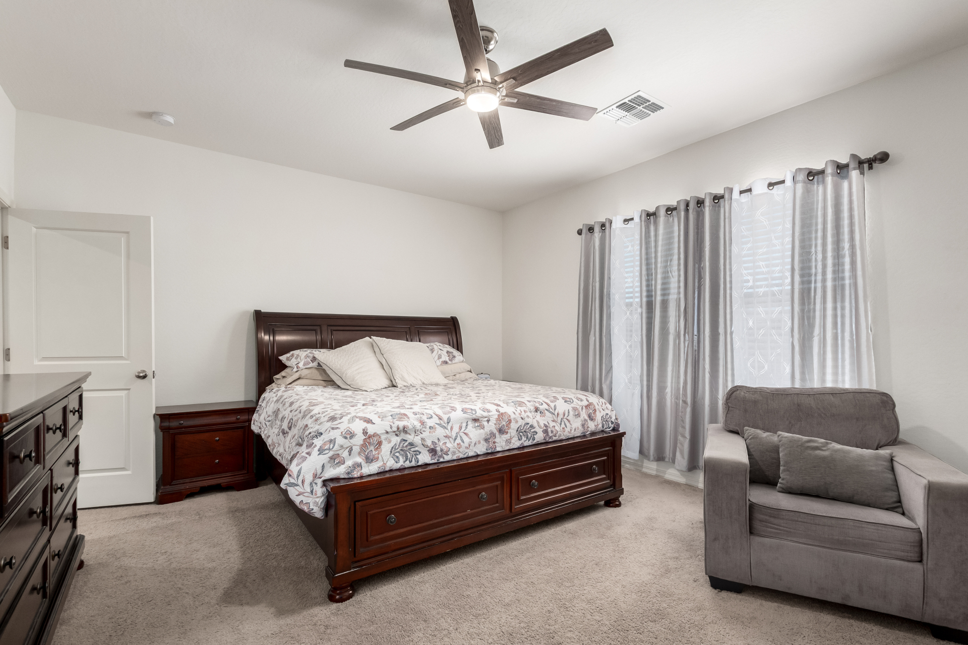 Become the proud owner of this charming 4-bedroom residence in Blue Horizons! You're welcomed by a captivating open layout with high ceilings, a soothing palette, blinds, and a harmonious blend of soft carpeting and wood-look flooring. The gourmet kitchen comes with granite counters, abundant wood cabinetry with crown moulding, recessed lighting, SS appliances, a pantry, and an island with a breakfast bar. The cozy primary bedroom includes a private bathroom and a practical walk-in closet for an organized wardrobe. Spend enchanting evenings in the backyard, complete with a covered patio for dining al fresco and breathtaking mountain views that provide a picturesque backdrop. Make this gem yours!