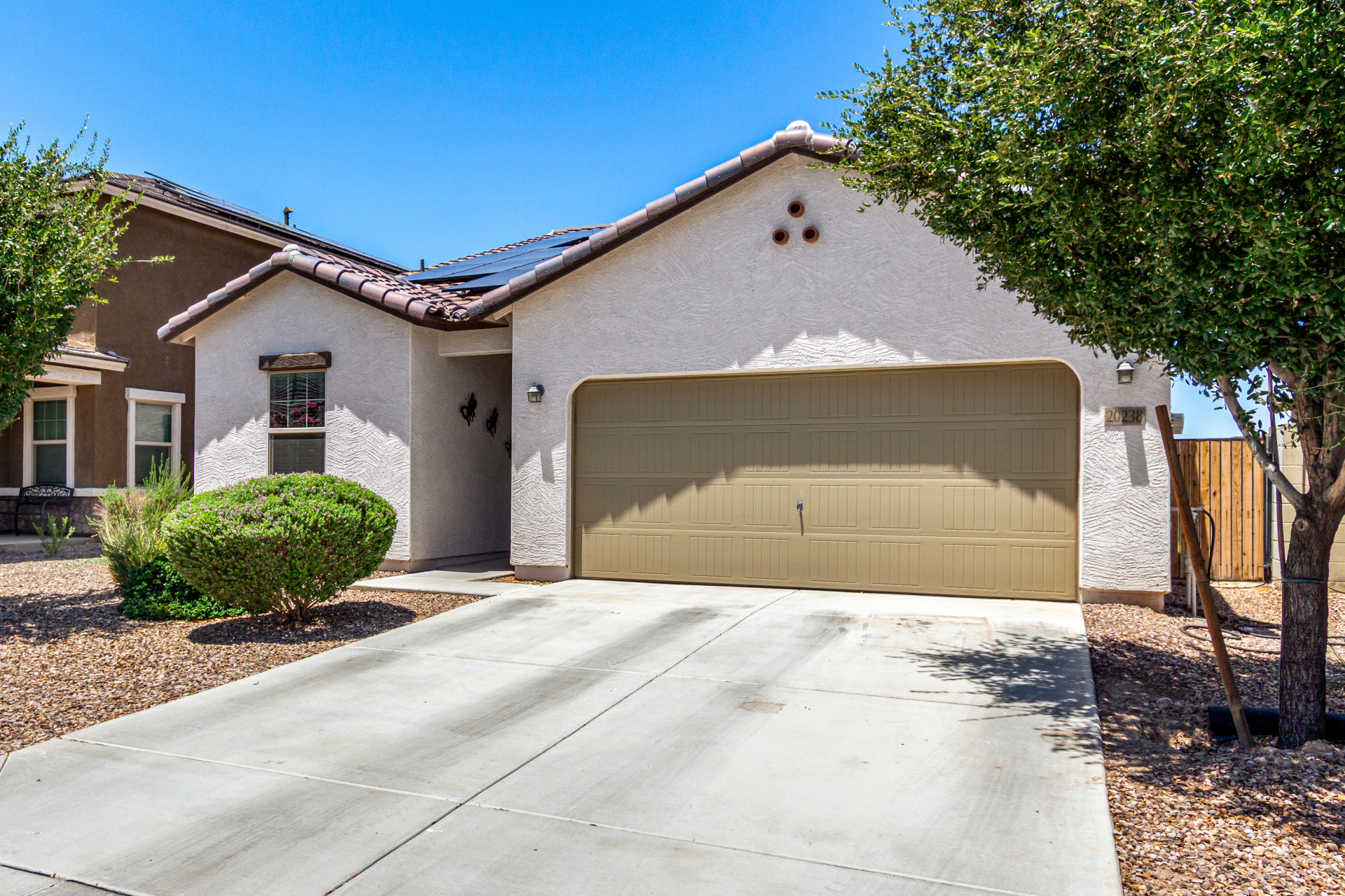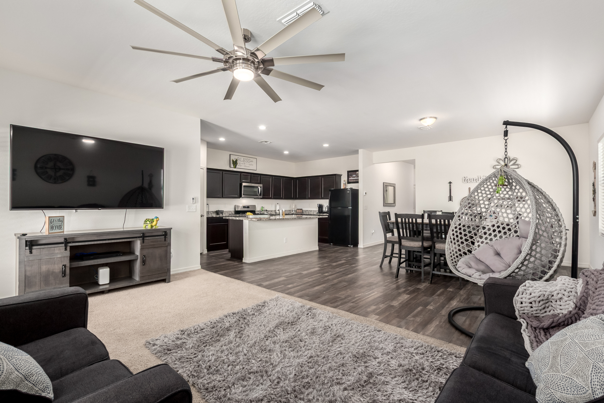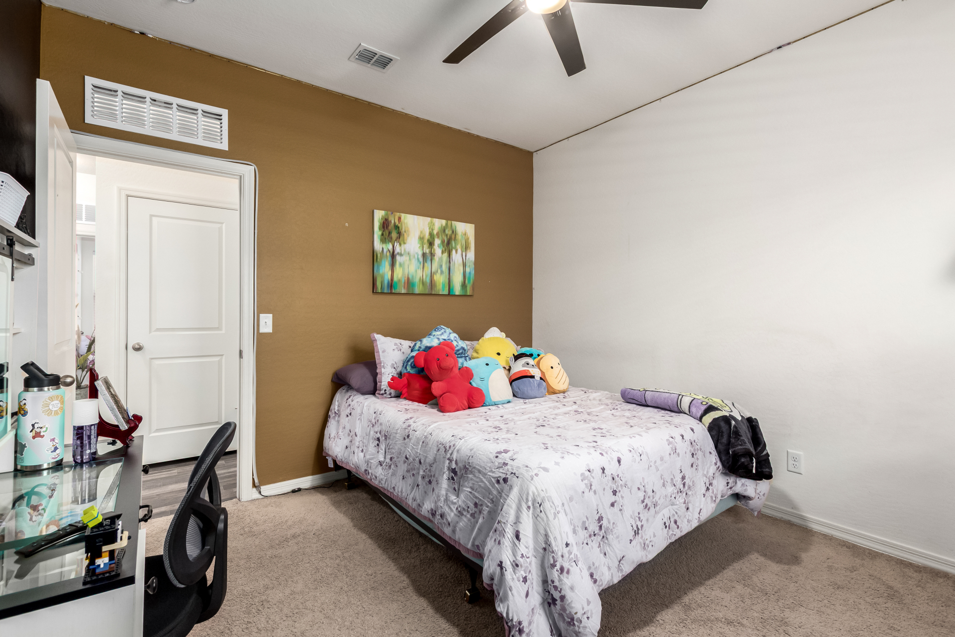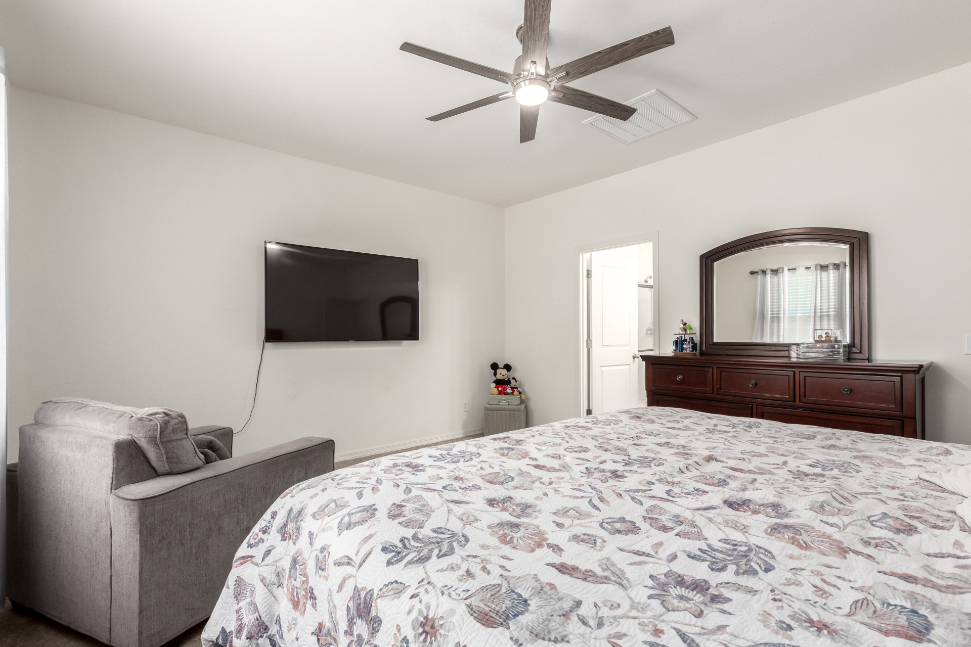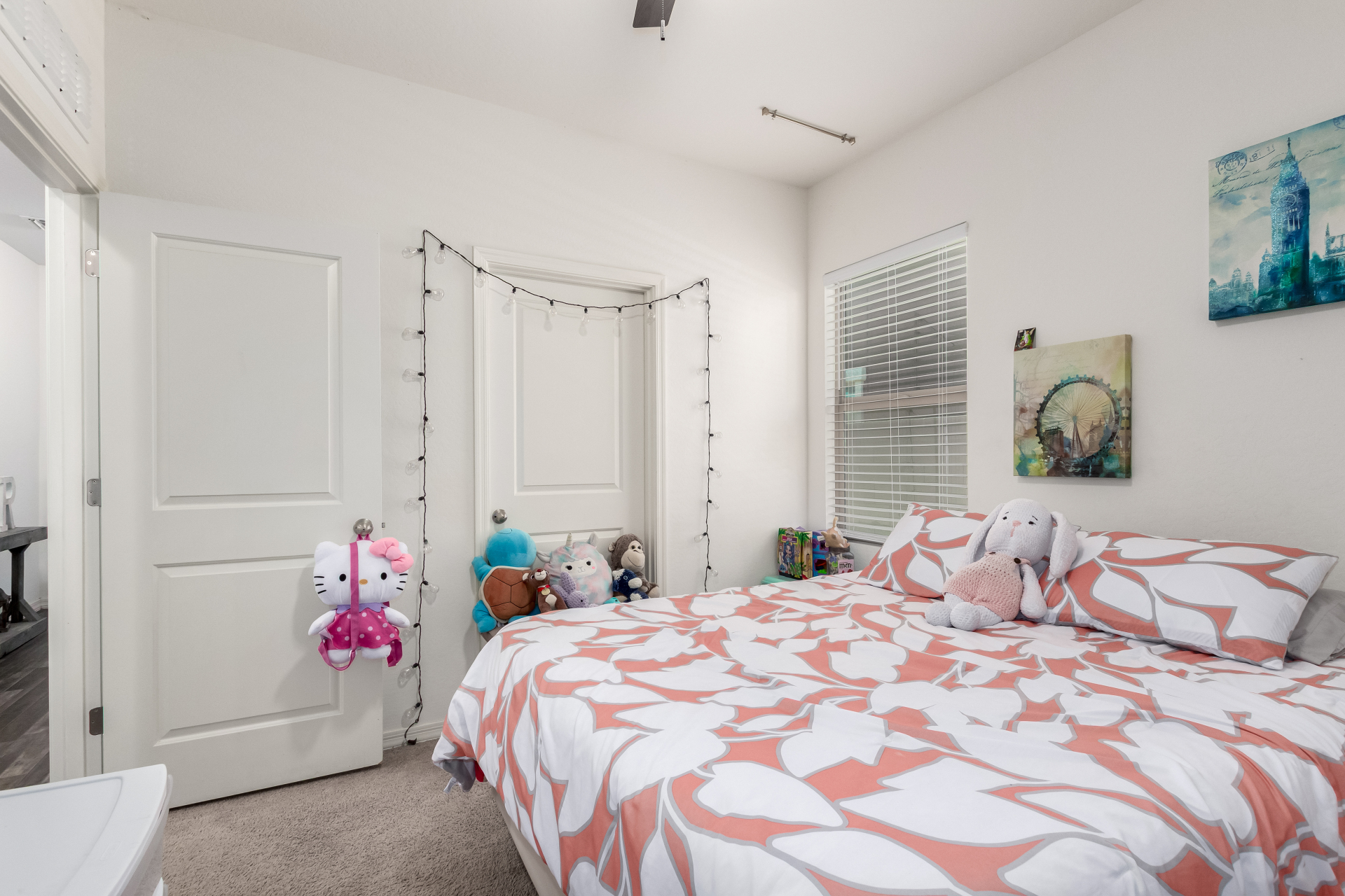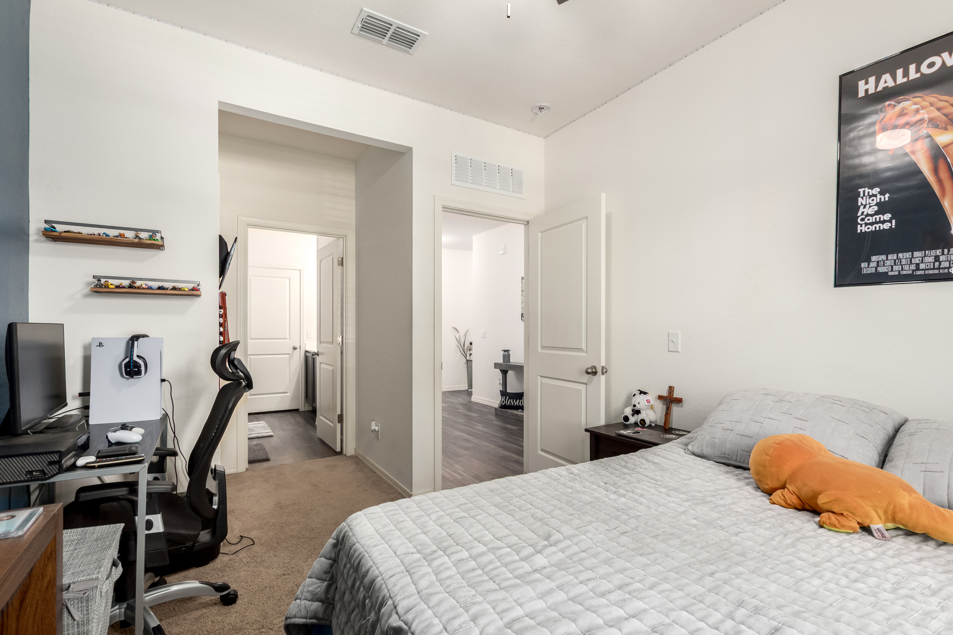 Become the proud owner of this charming 4-bedroom residence in Blue Horizons! You're welcomed by a captivating open layout with high ceilings, a soothing palette, blinds, and a harmonious blend of soft carpeting and wood-look flooring. The gourmet kitchen comes with granite counters, abundant wood cabinetry with crown moulding, recessed lighting, SS appliances, a pantry, and an island with a breakfast bar. The cozy primary bedroom includes a private bathroom and a practical walk-in closet for an organized wardrobe. Spend enchanting evenings in the backyard, complete with a covered patio for dining al fresco and breathtaking mountain views that provide a picturesque backdrop. Make this gem yours!