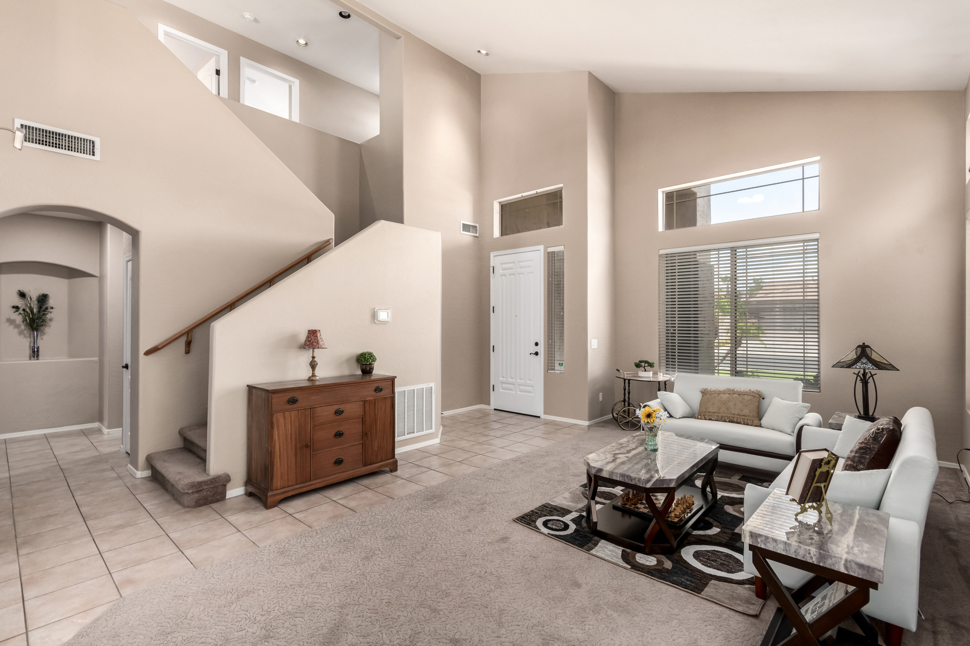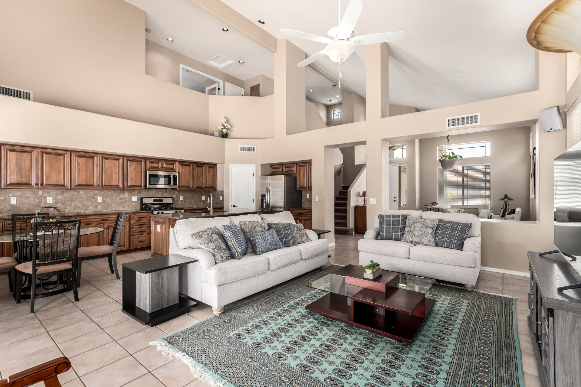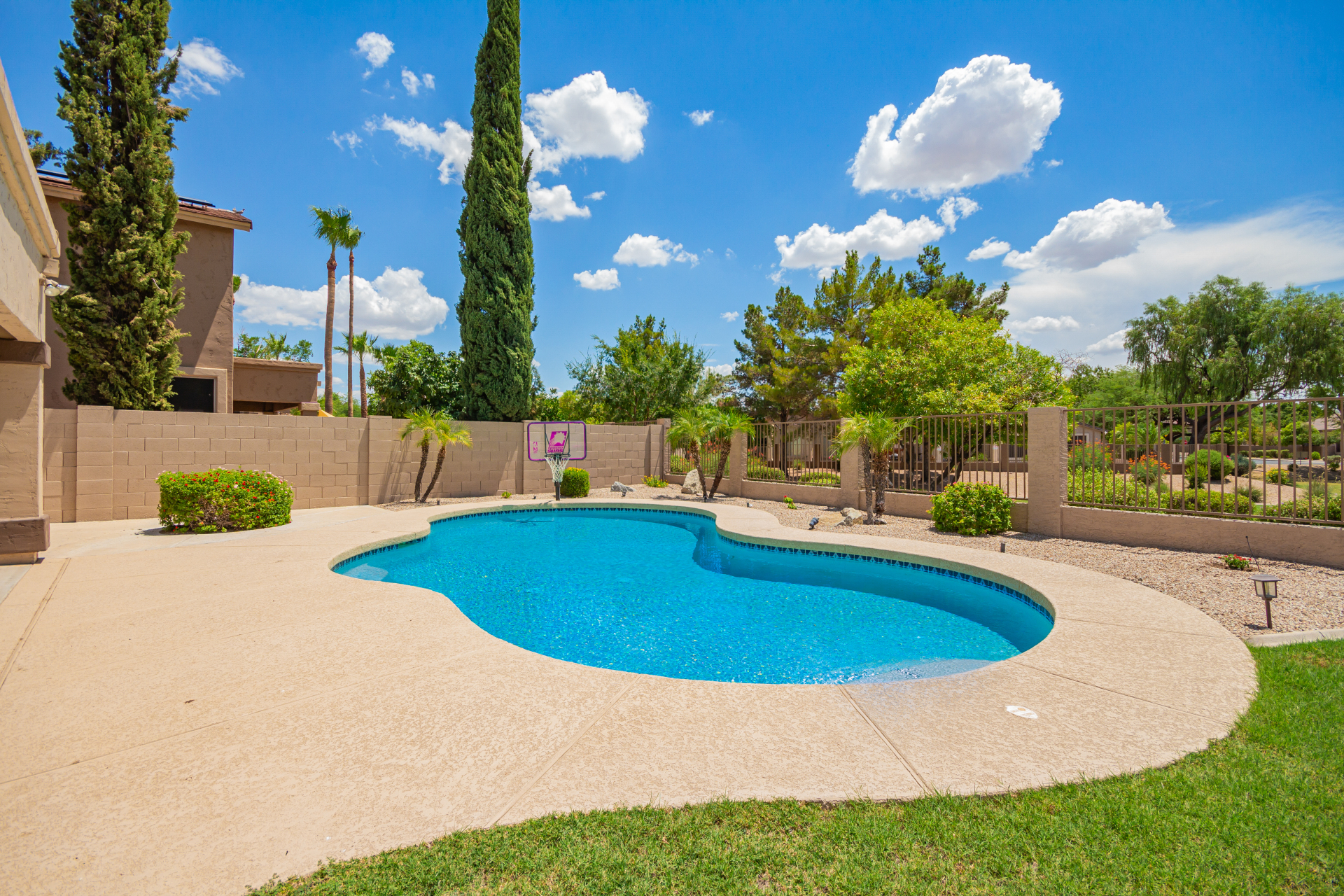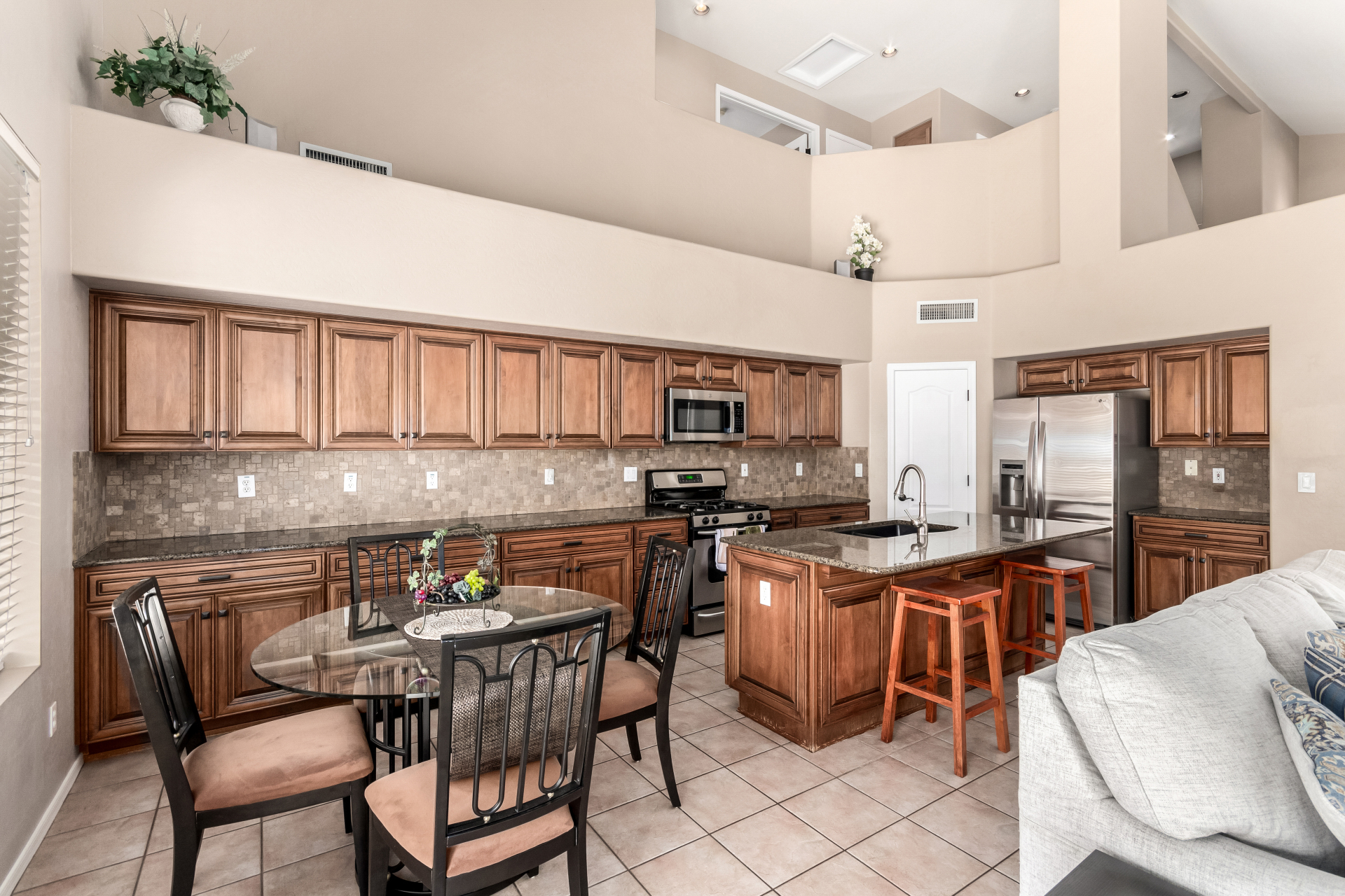 This stunning 2-level home with POOL awaits you nestled in a quiet cul-de-sac in the sought-after Highland Point! All the space you need, with 3 bedrooms plus den, 2.5 bathrooms, and a 2-car garage with attached cabinetry. The impressive interior showcases soft carpeting underfoot, tile flooring in high-traffic areas, soaring vaulted ceilings, plenty of natural light, and a neutral palette. The impeccable kitchen displays ample cabinets, custom backsplash, granite counters, a pantry, stainless steel appliances, and an island for those casual chats over quick meals. The airy primary bedroom has a walk-in closet and an ensuite with double sinks and a separate shower & tub. Double doors open to a spacious den perfect for an office or study room. The backyard will be your retreat, featuring a