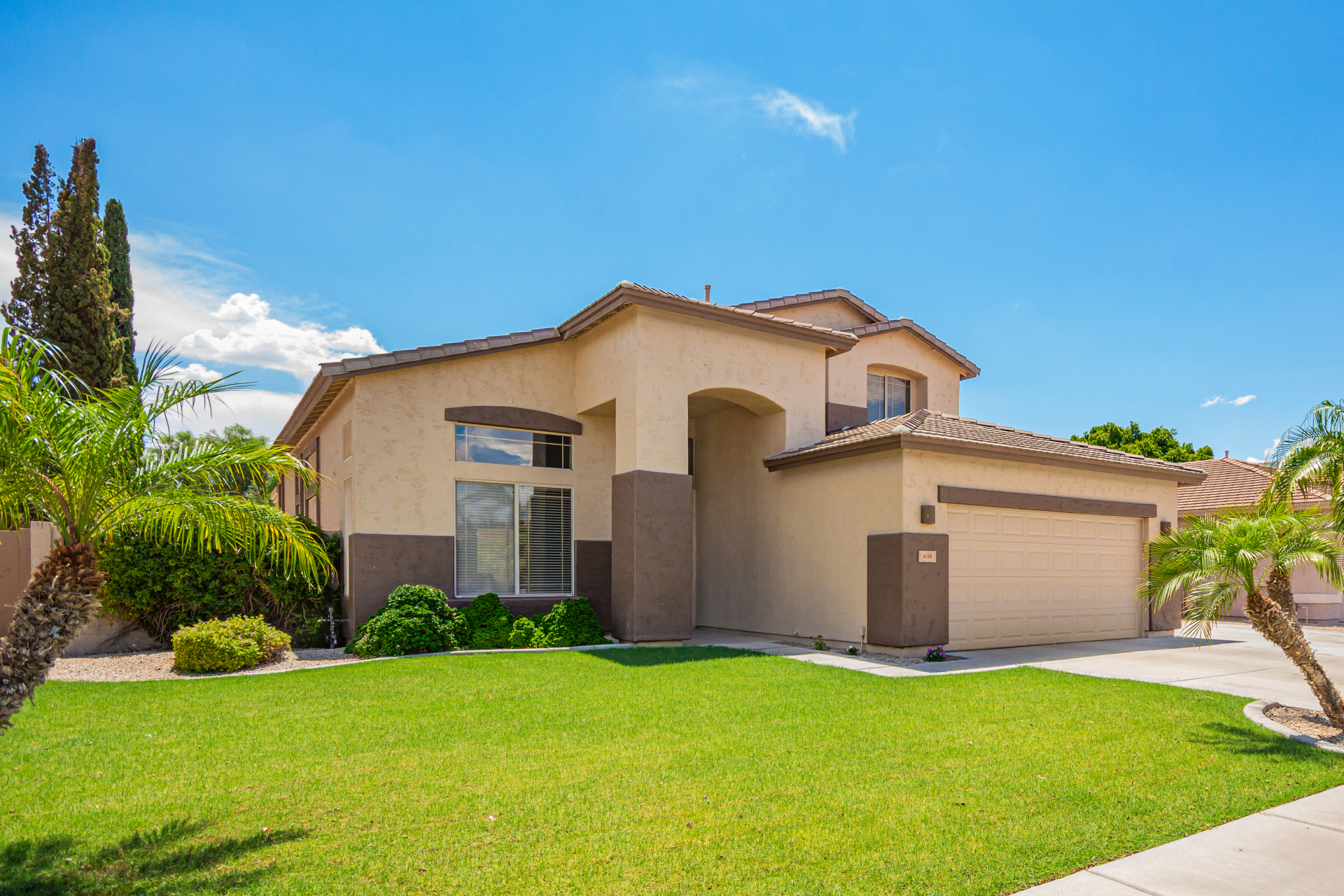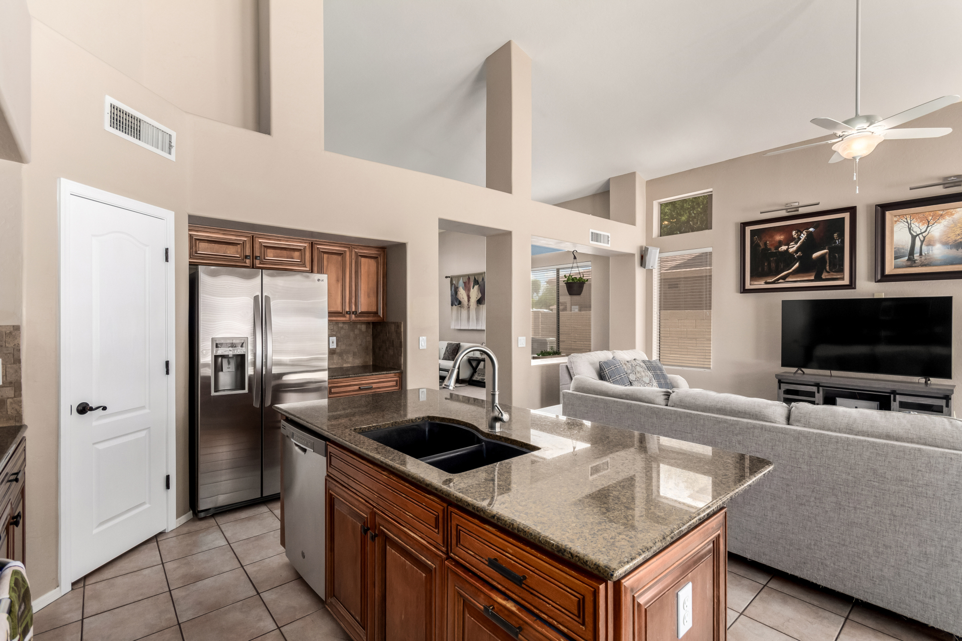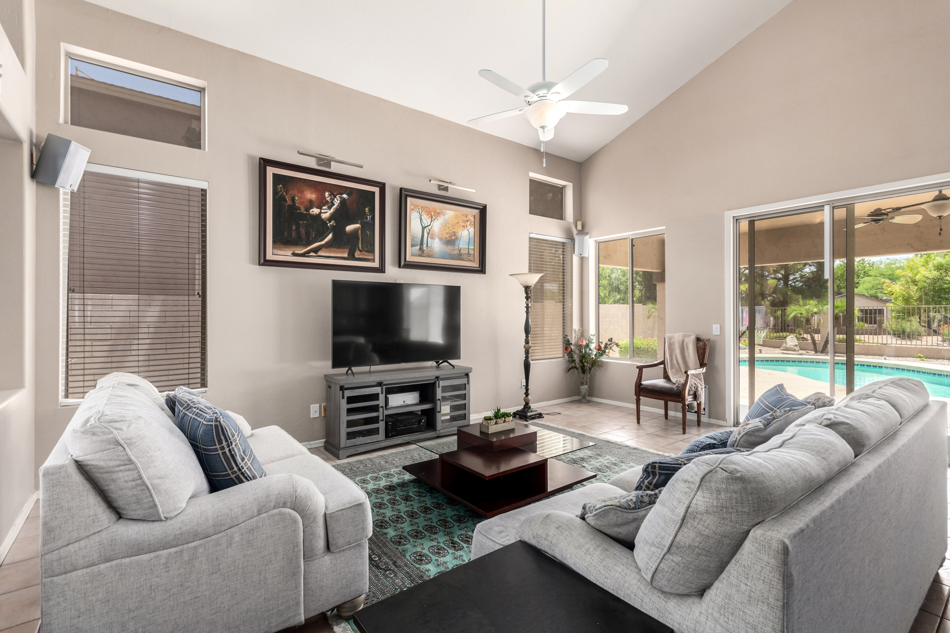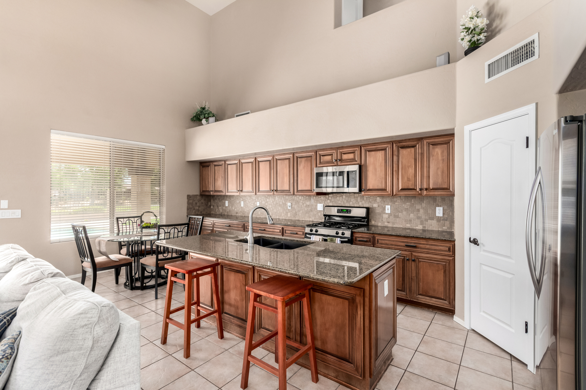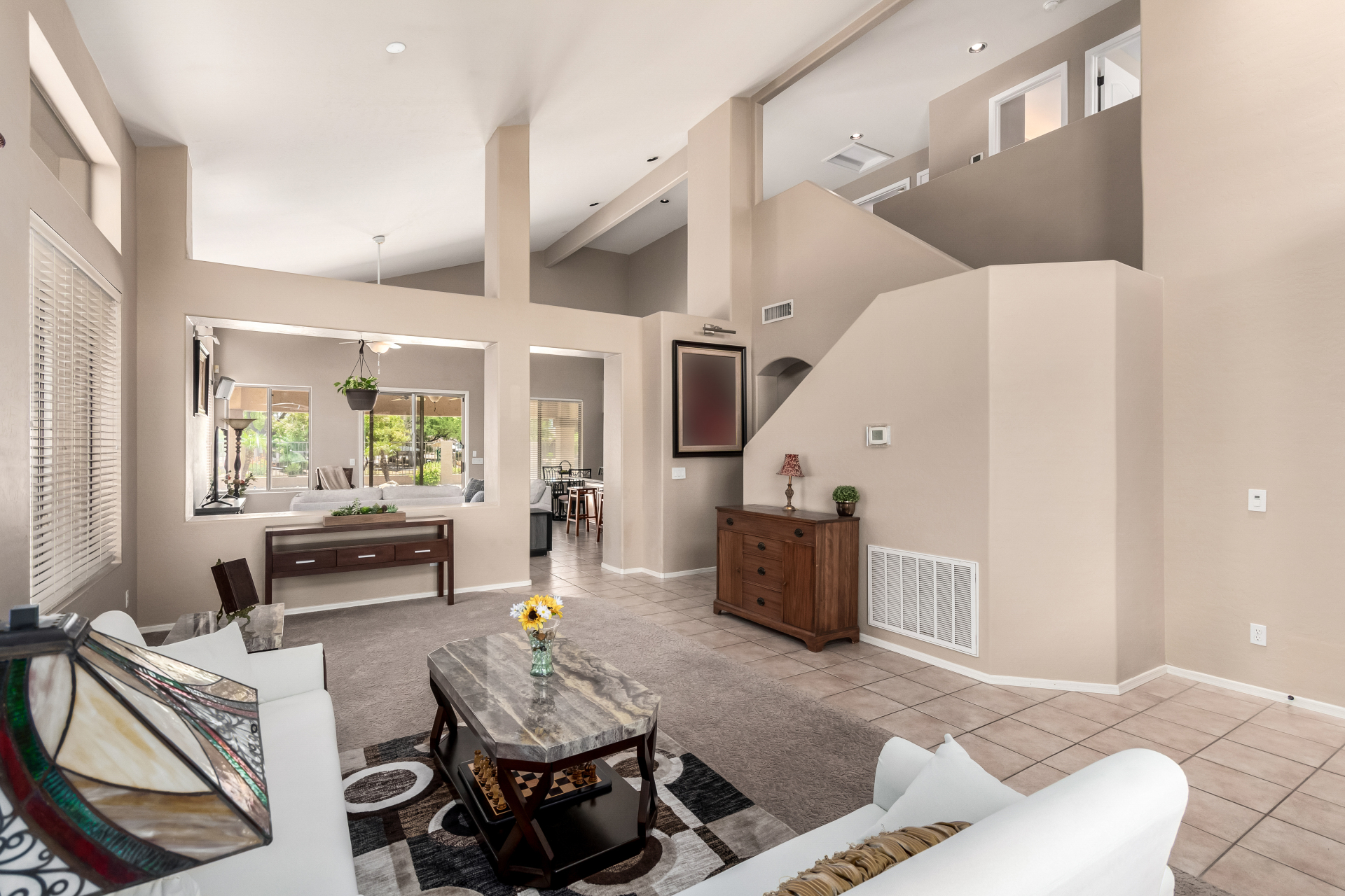 This stunning 2-level home with POOL awaits you nestled in a quiet cul-de-sac in the sought-after Highland Point! All the space you need, with 3 bedrooms plus den, 2.5 bathrooms, and a 2-car garage with attached cabinetry. The impressive interior showcases soft carpeting underfoot, tile flooring in high-traffic areas, soaring vaulted ceilings, plenty of natural light, and a neutral palette. The impeccable kitchen displays ample cabinets, custom backsplash, granite counters, a pantry, stainless steel appliances, and an island for those casual chats over quick meals. The airy primary bedroom has a walk-in closet and an ensuite with double sinks and a separate shower & tub. Double doors open to a spacious den perfect for an office or study room. The backyard will be your retreat, featuring a