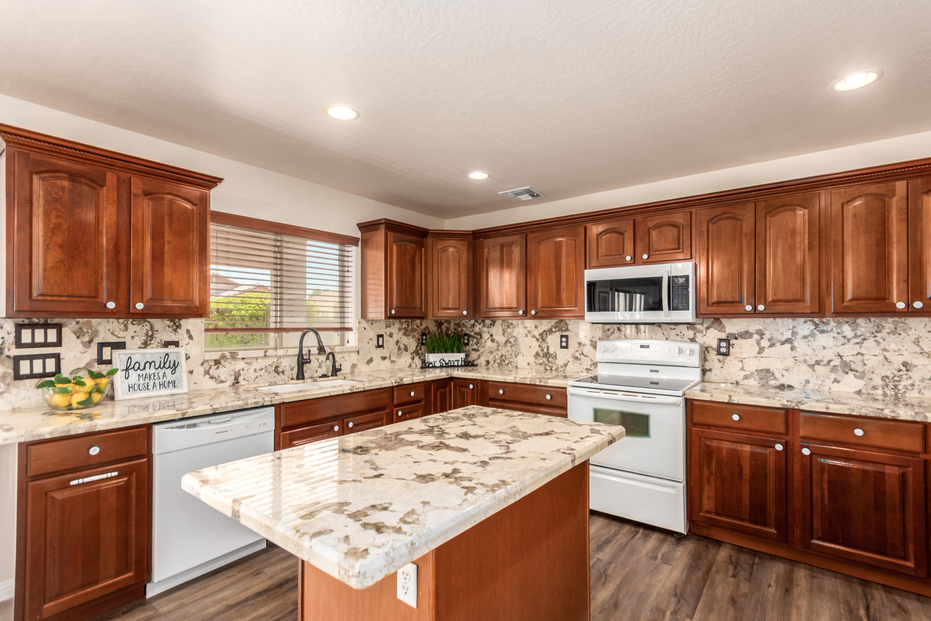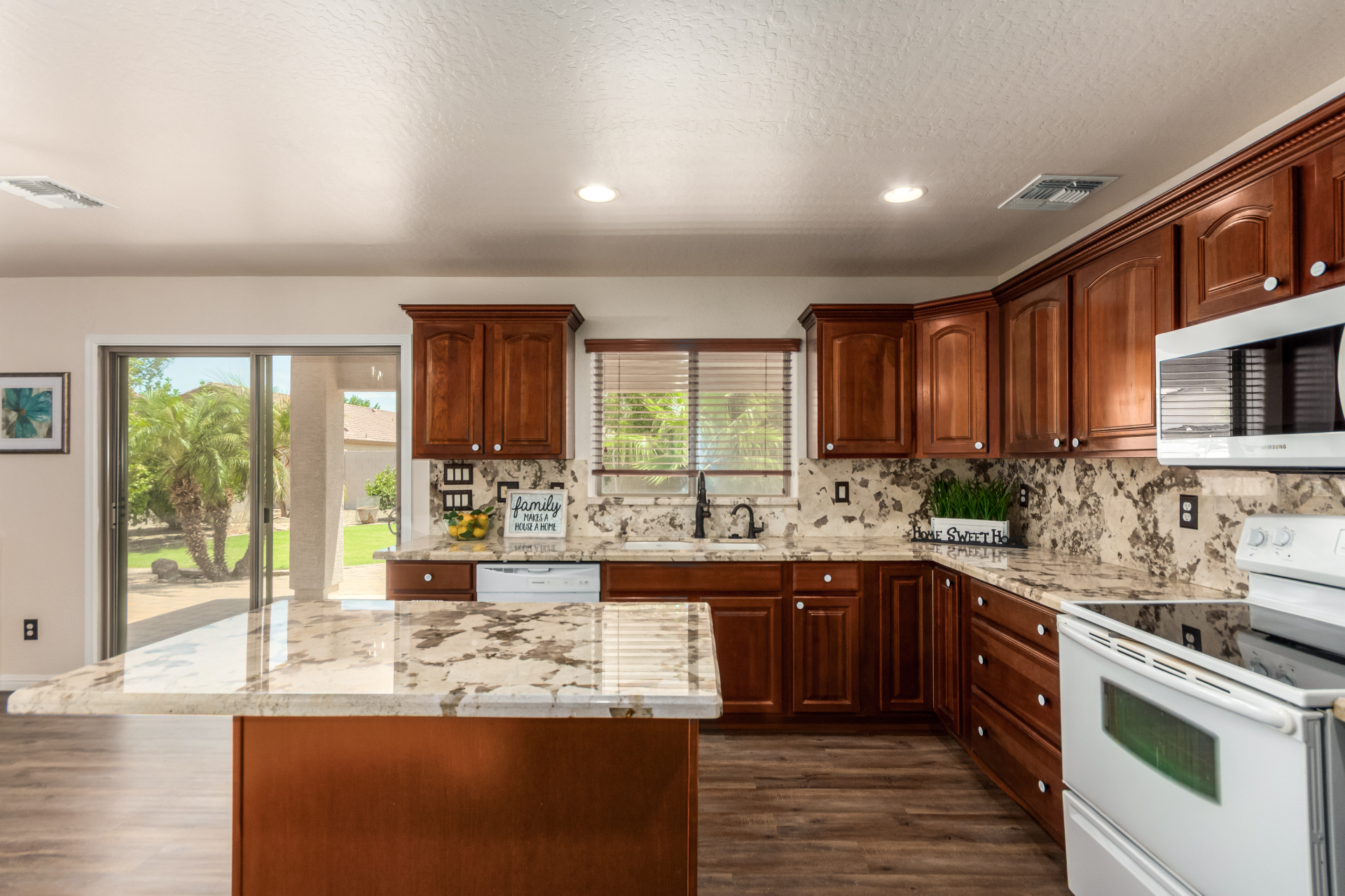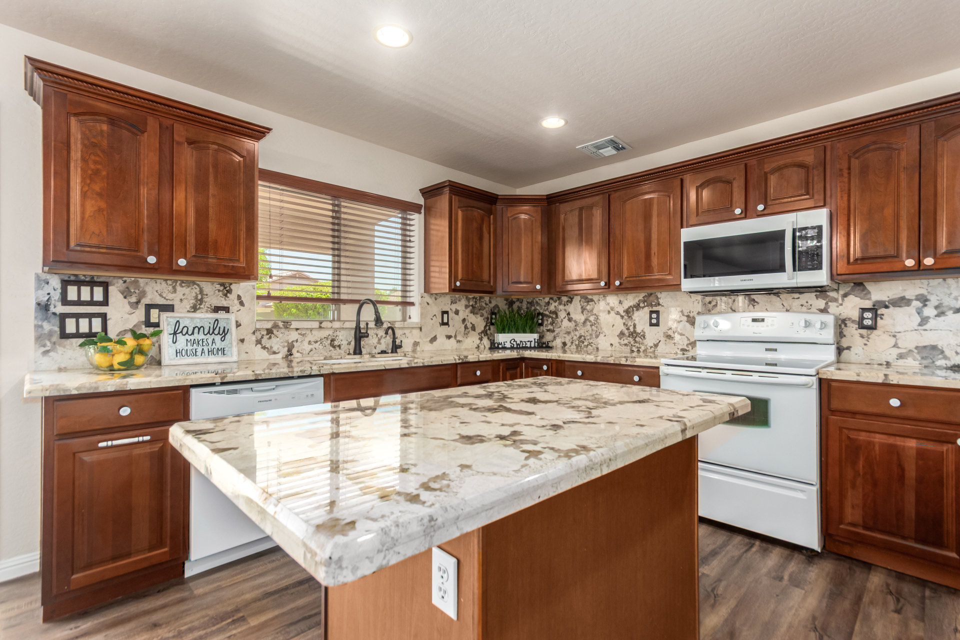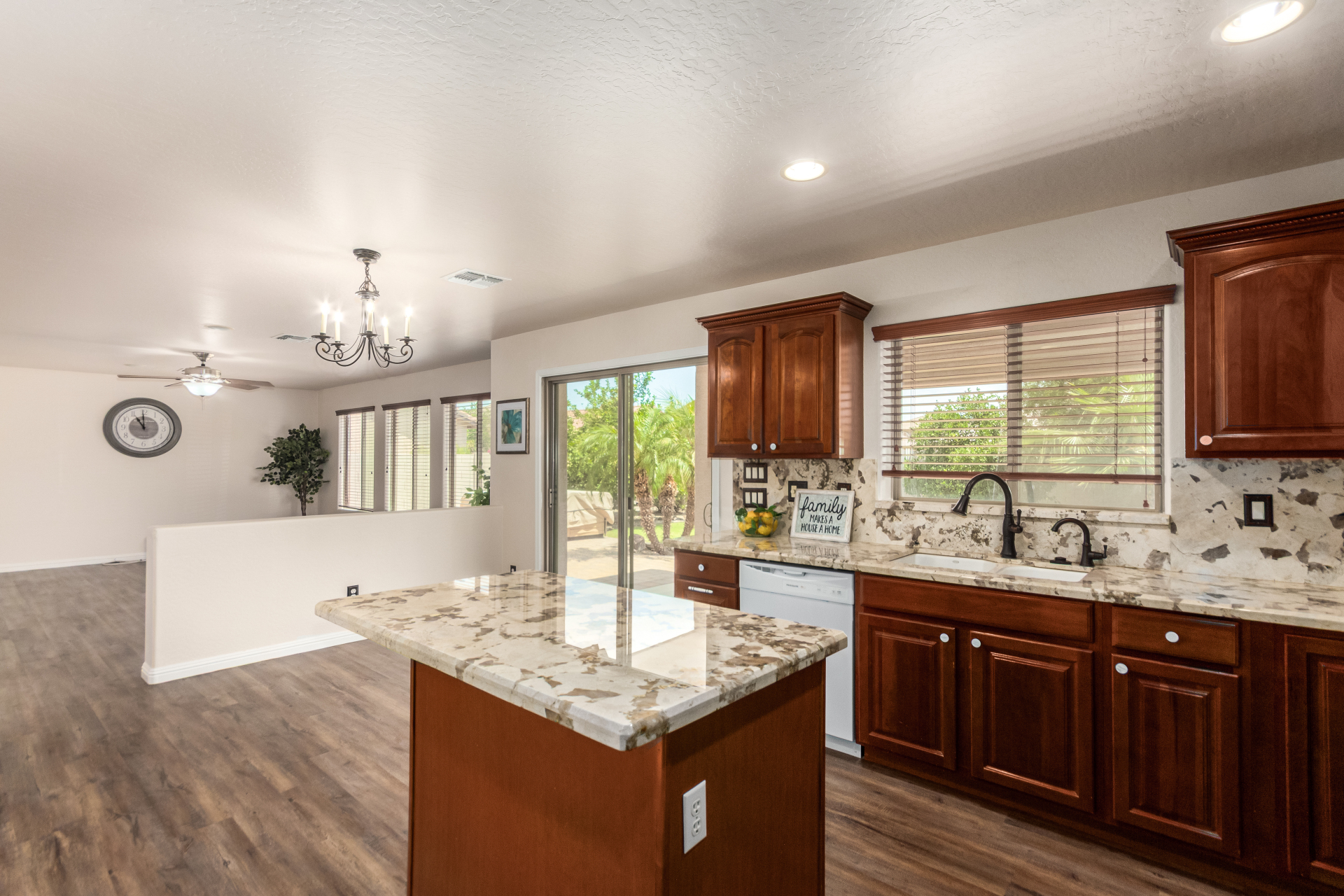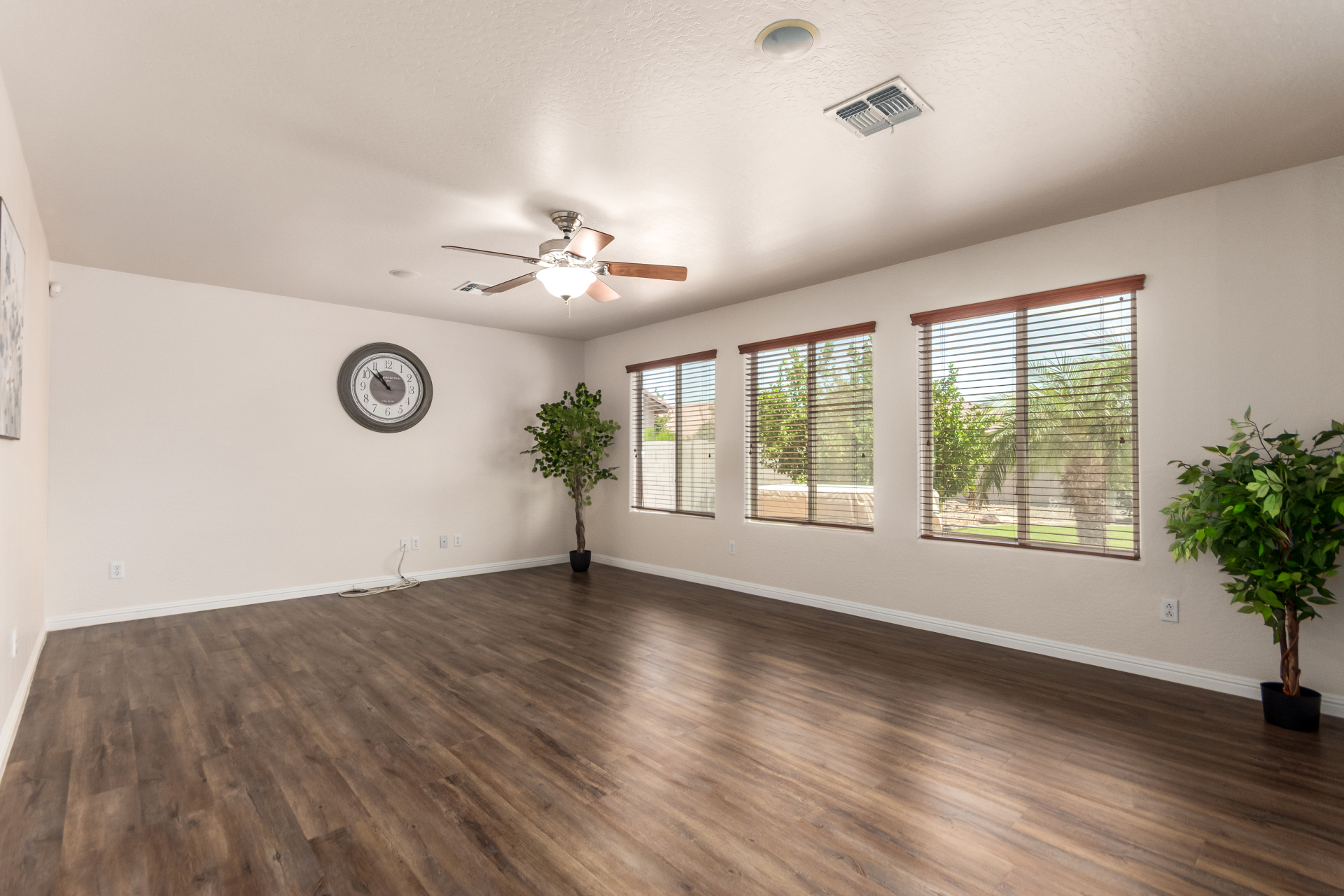 Gorgeous move-in ready residence at Rancho Bella Vista! This amazing home showcases a great curb appeal, a low-maintenance landscape, and a 2 car garage. The interior boasts a living/dining room with freshly cleaned carpet. The elegant wood-look floors flow throughout the large family room. The bright kitchen features recessed lighting, abundant cabinets, and granite backsplash & counters. The oversized loft has built-in desks & space for an entertainment area. The massive owner's suite has vaulted ceilings, plush carpet, and a full ensuite w/a dual granite vanity & a walk-in closet. The backyard offers a covered patio and lush greenery promoting easy entertaining. Close to the neighborhood's parks, easy access to major roads, and a short drive to restaurants & markets. Act now!