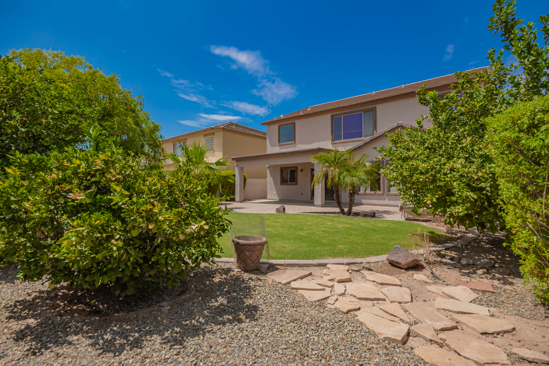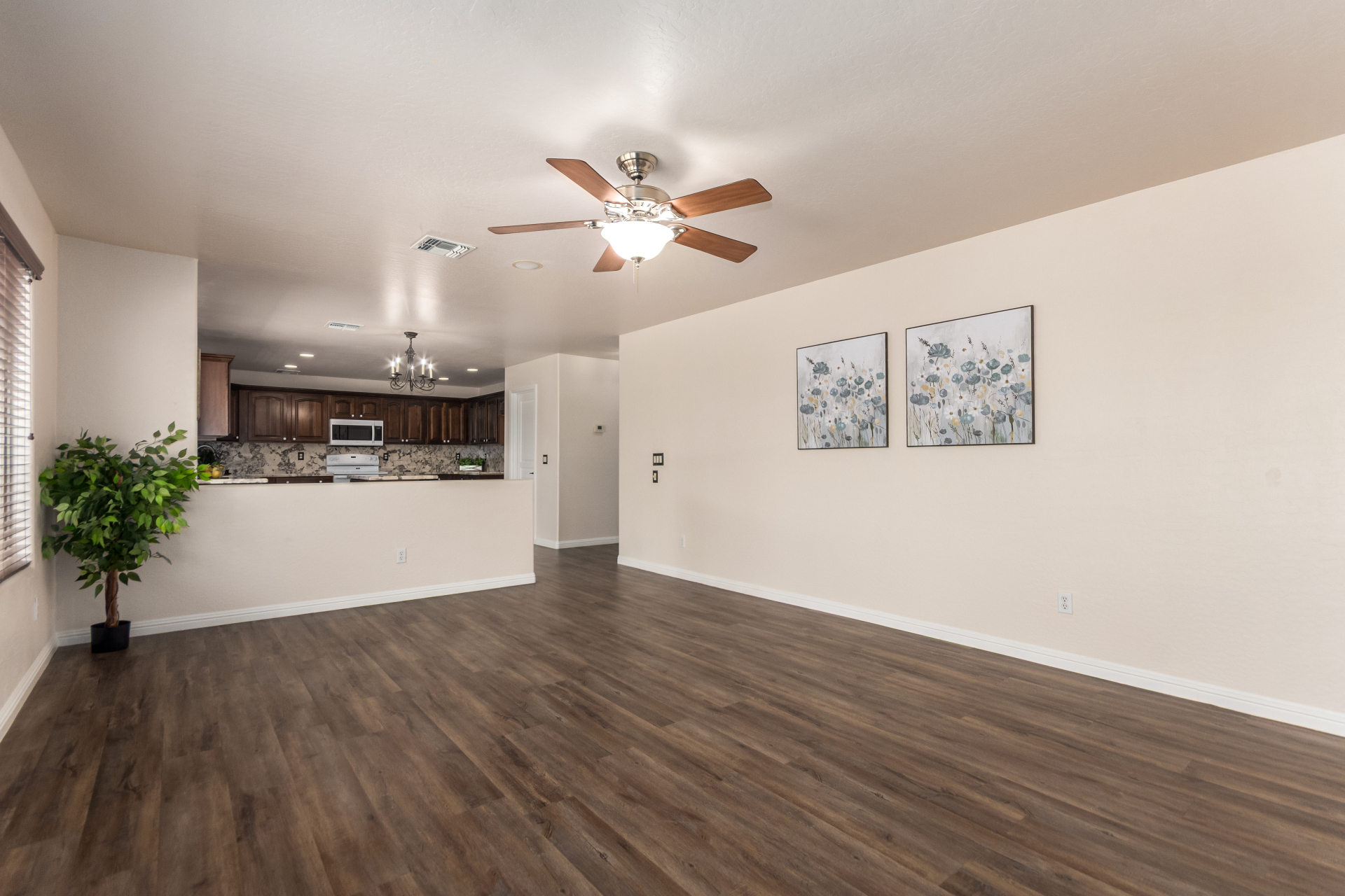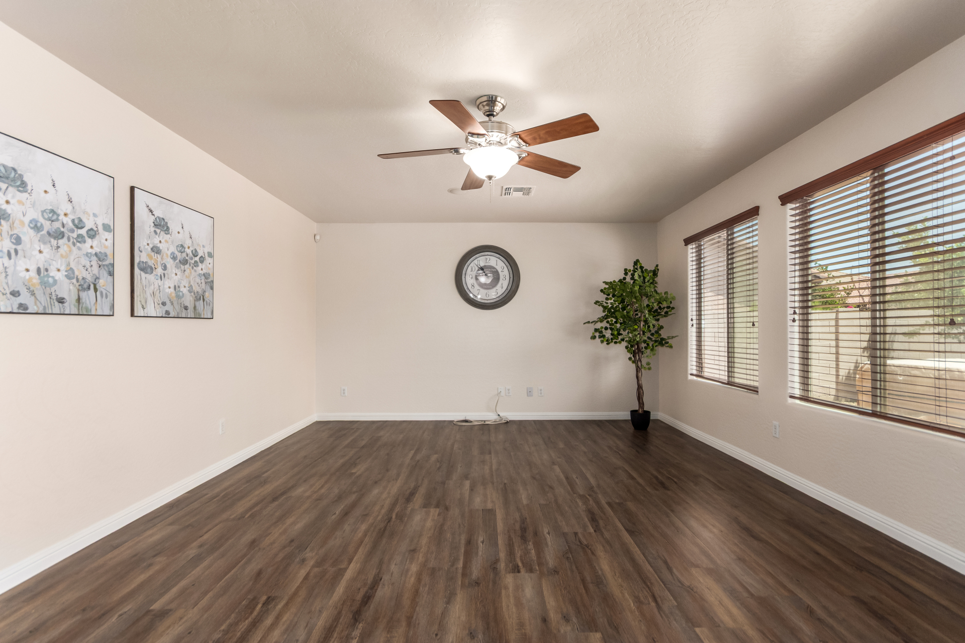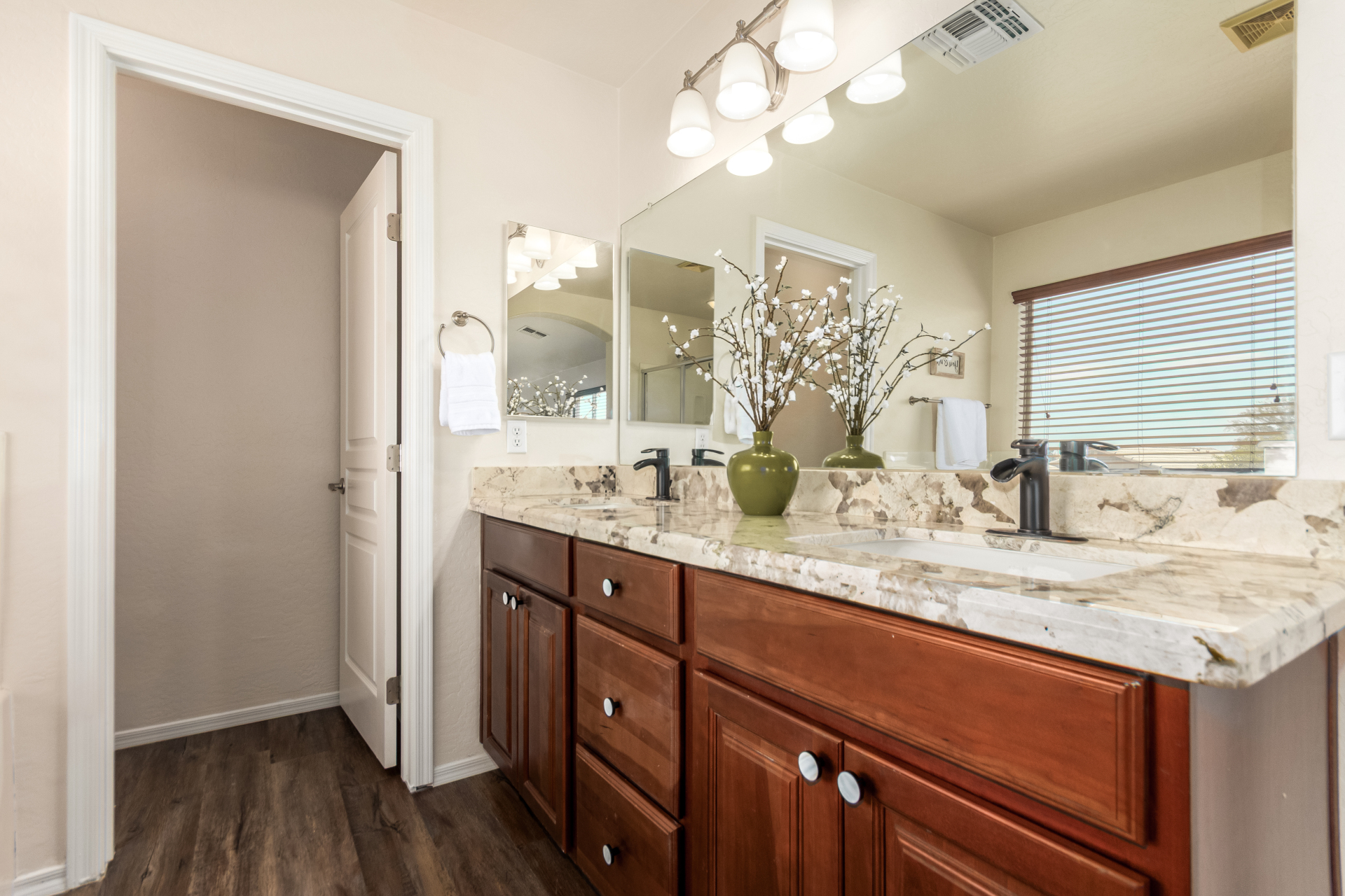 Gorgeous move-in ready residence at Rancho Bella Vista! This amazing home showcases a great curb appeal, a low-maintenance landscape, and a 2 car garage. The interior boasts a living/dining room with freshly cleaned carpet. The elegant wood-look floors flow throughout the large family room. The bright kitchen features recessed lighting, abundant cabinets, and granite backsplash & counters. The oversized loft has built-in desks & space for an entertainment area. The massive owner's suite has vaulted ceilings, plush carpet, and a full ensuite w/a dual granite vanity & a walk-in closet. The backyard offers a covered patio and lush greenery promoting easy entertaining. Close to the neighborhood's parks, easy access to major roads, and a short drive to restaurants & markets. Act now!