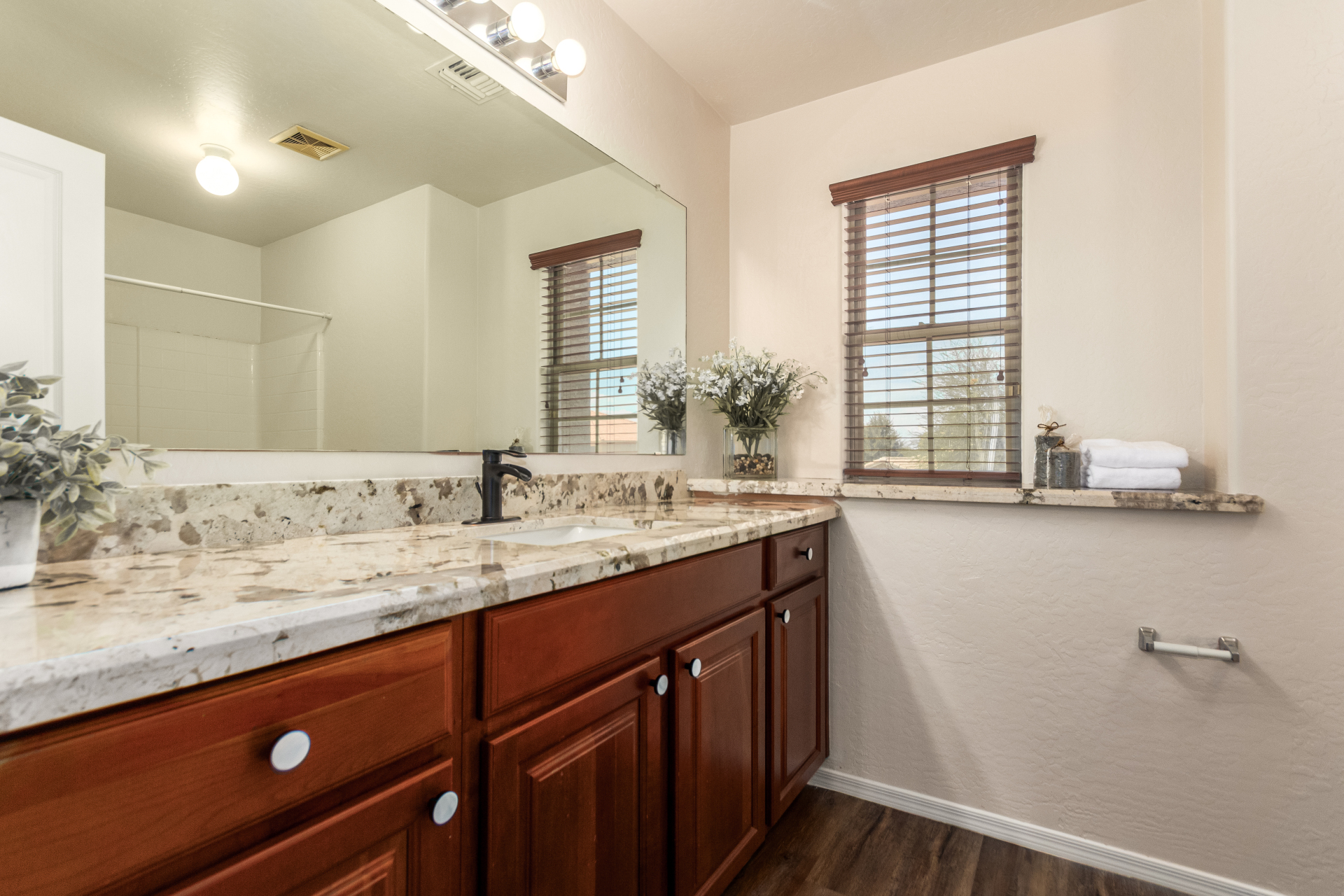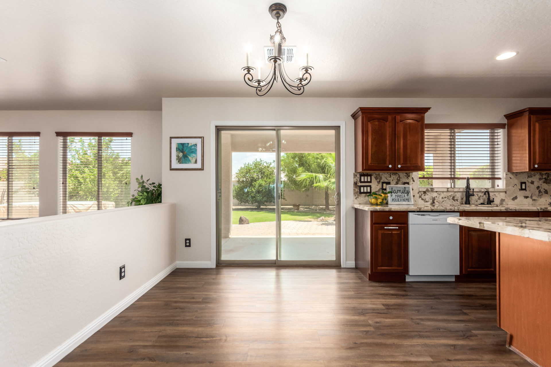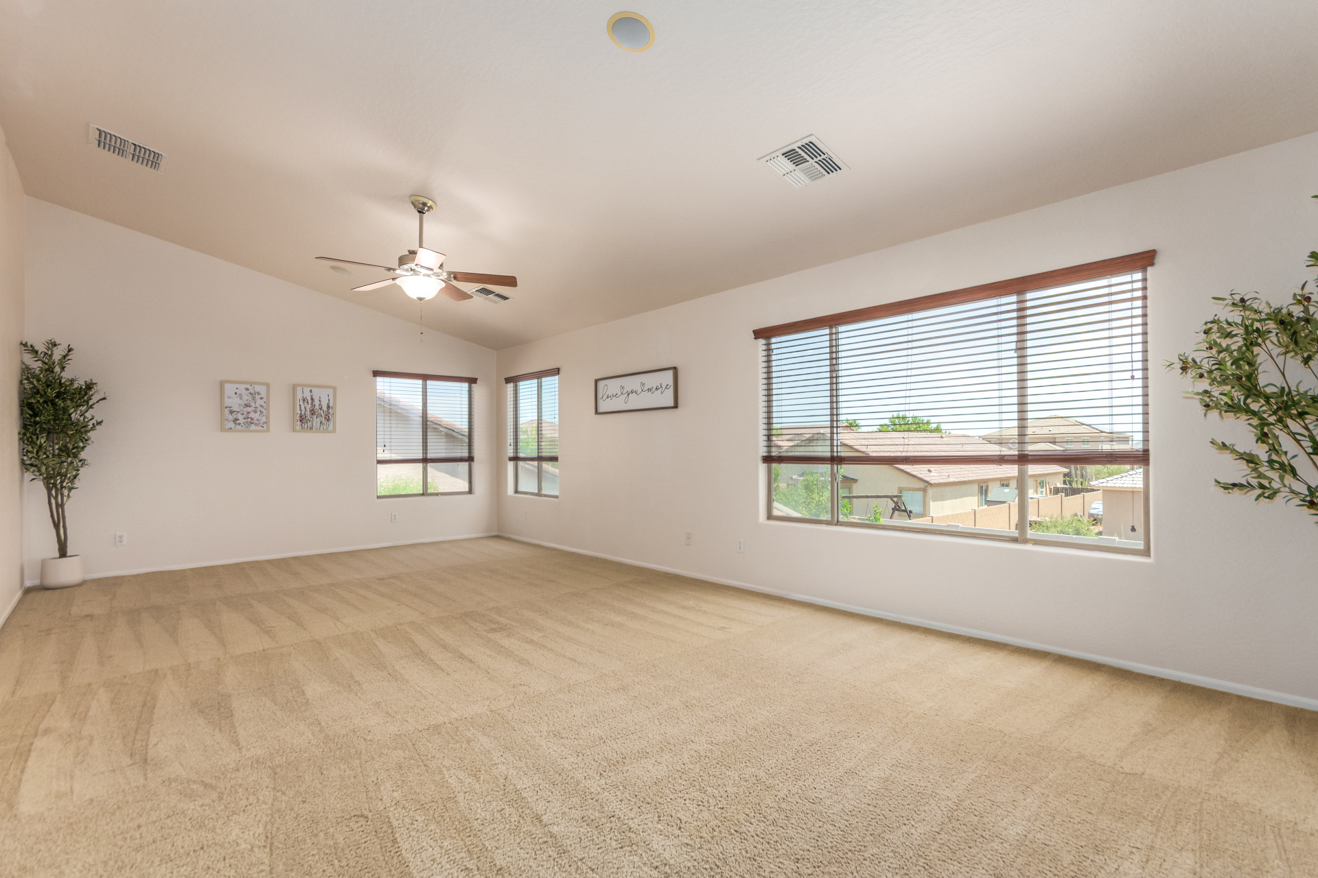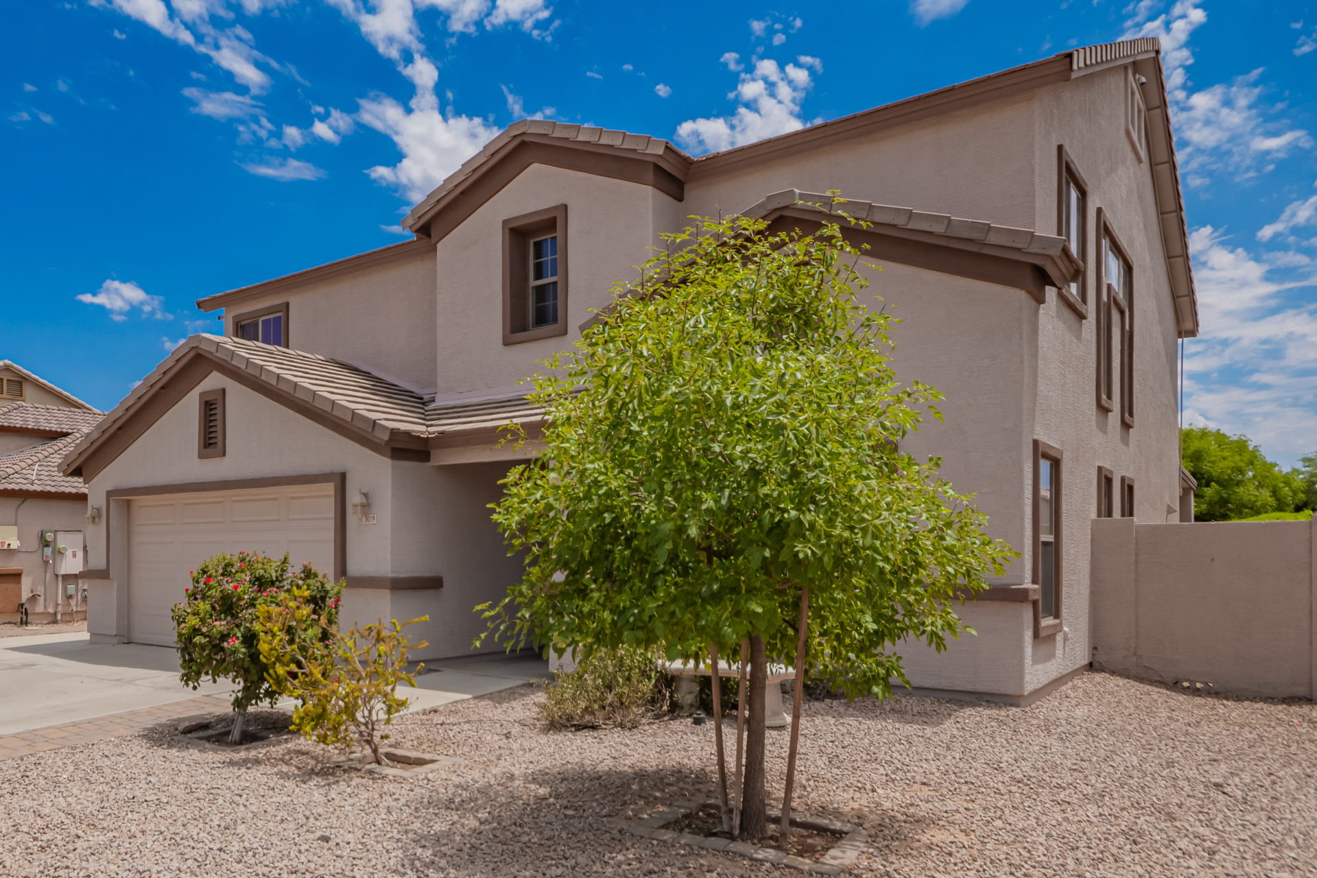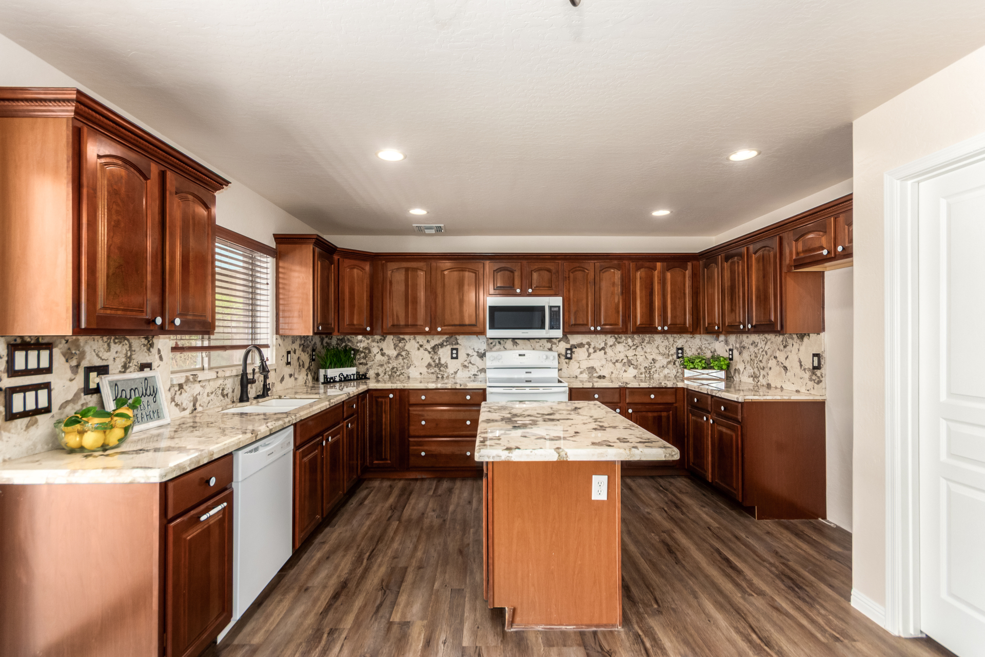 Gorgeous move-in ready residence at Rancho Bella Vista! This amazing home showcases a great curb appeal, a low-maintenance landscape, and a 2 car garage. The interior boasts a living/dining room with freshly cleaned carpet. The elegant wood-look floors flow throughout the large family room. The bright kitchen features recessed lighting, abundant cabinets, and granite backsplash & counters. The oversized loft has built-in desks & space for an entertainment area. The massive owner's suite has vaulted ceilings, plush carpet, and a full ensuite w/a dual granite vanity & a walk-in closet. The backyard offers a covered patio and lush greenery promoting easy entertaining. Close to the neighborhood's parks, easy access to major roads, and a short drive to restaurants & markets. Act now!