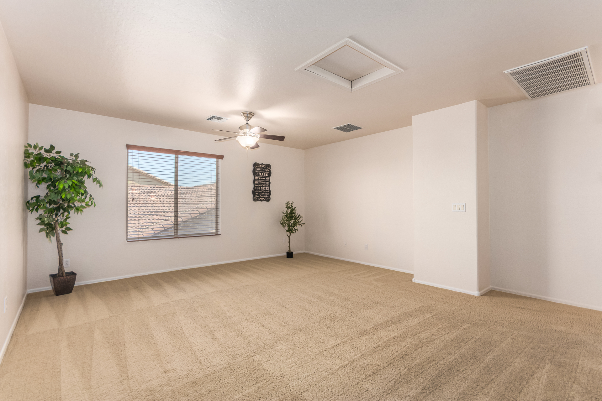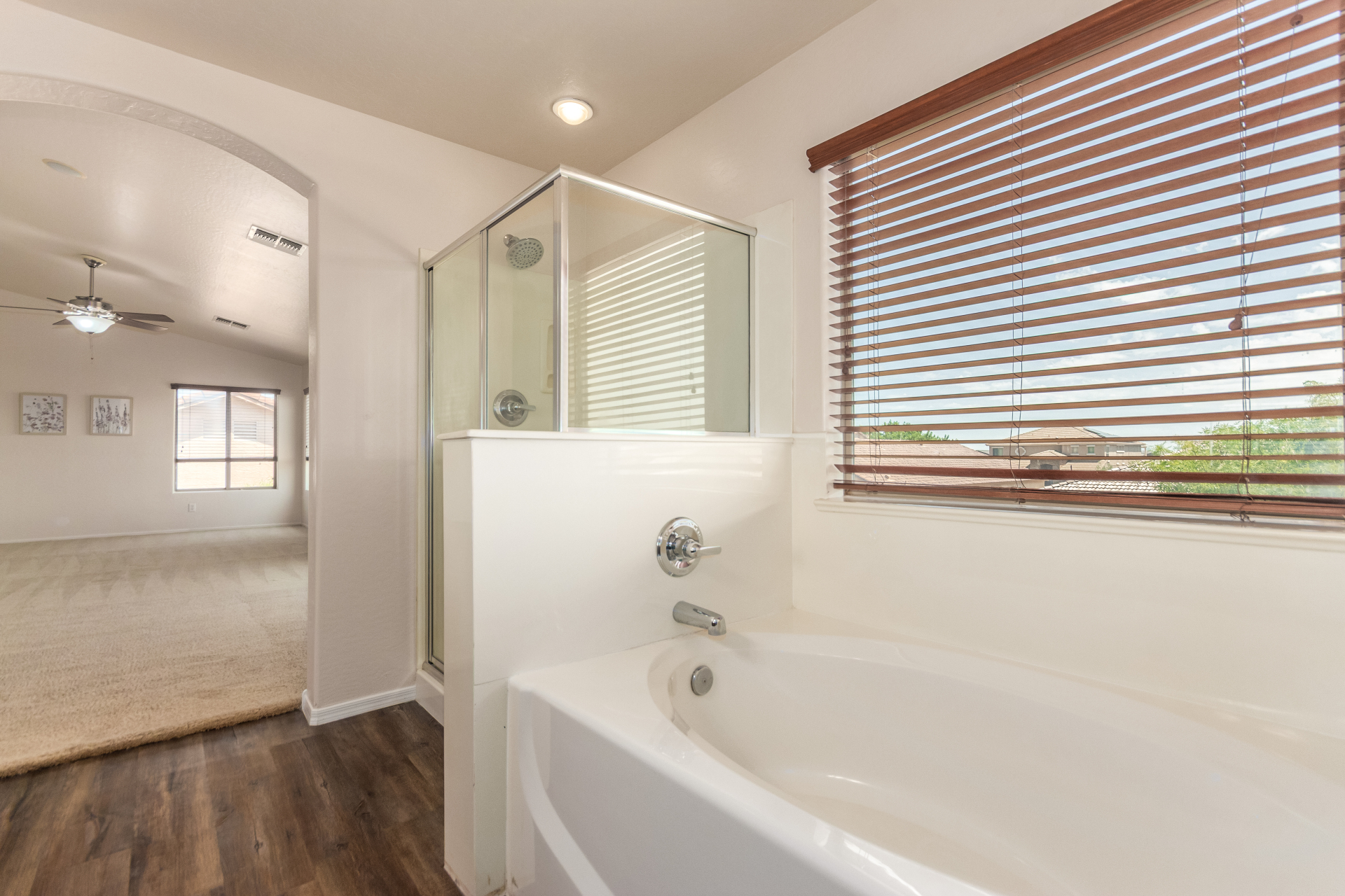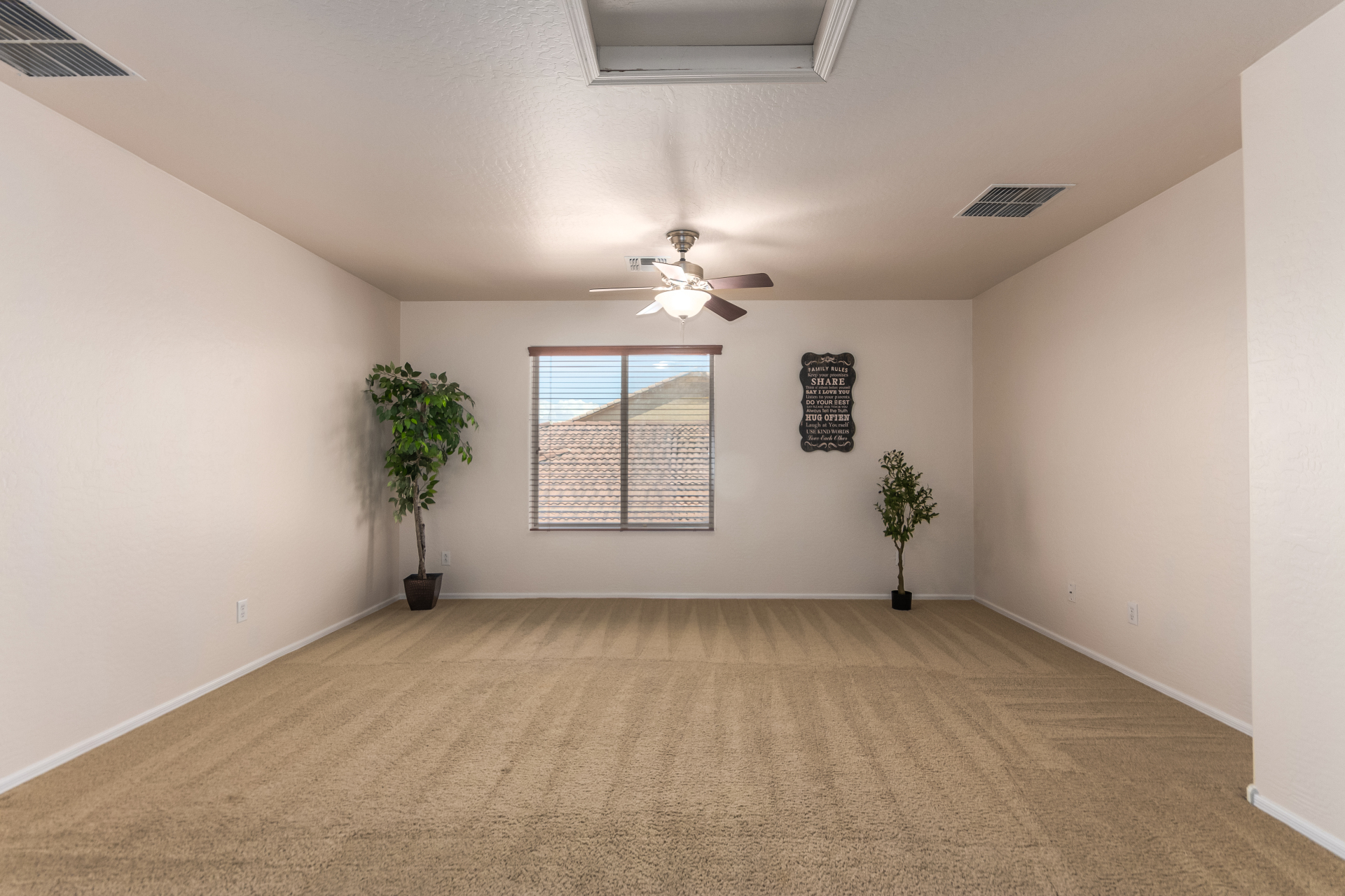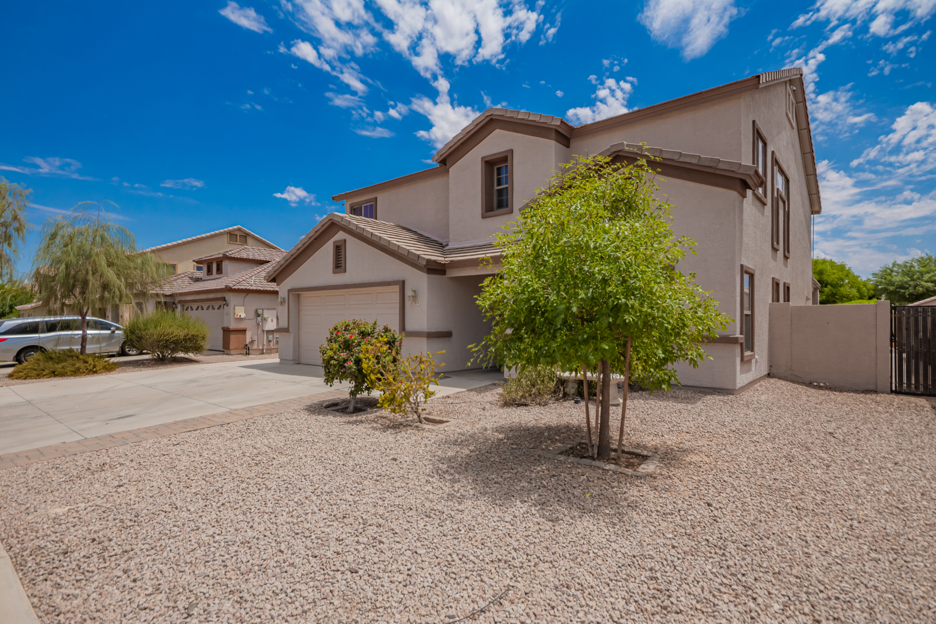 Gorgeous move-in ready residence at Rancho Bella Vista! This amazing home showcases a great curb appeal, a low-maintenance landscape, and a 2 car garage. The interior boasts a living/dining room with freshly cleaned carpet. The elegant wood-look floors flow throughout the large family room. The bright kitchen features recessed lighting, abundant cabinets, and granite backsplash & counters. The oversized loft has built-in desks & space for an entertainment area. The massive owner's suite has vaulted ceilings, plush carpet, and a full ensuite w/a dual granite vanity & a walk-in closet. The backyard offers a covered patio and lush greenery promoting easy entertaining. Close to the neighborhood's parks, easy access to major roads, and a short drive to restaurants & markets. Act now!