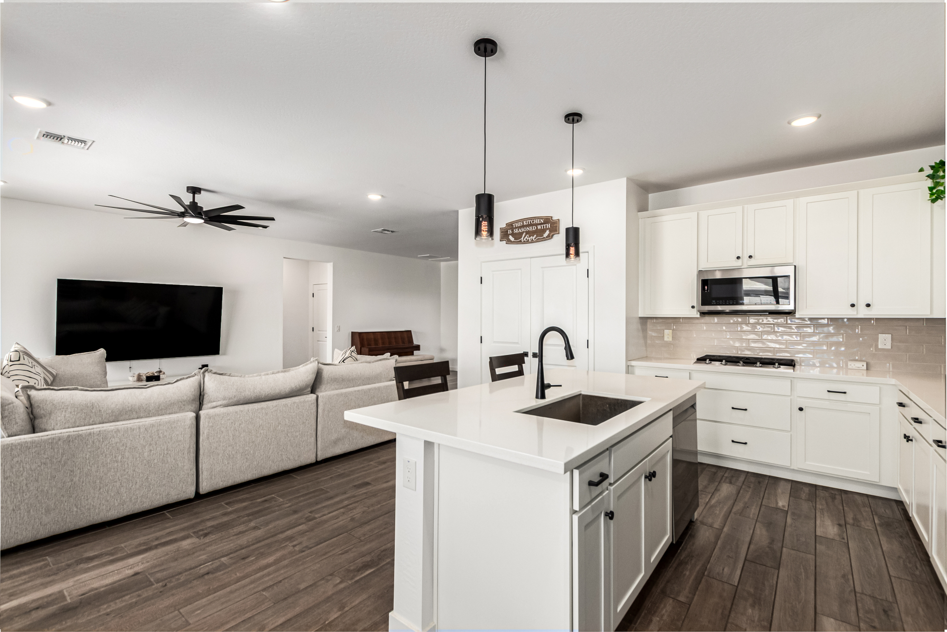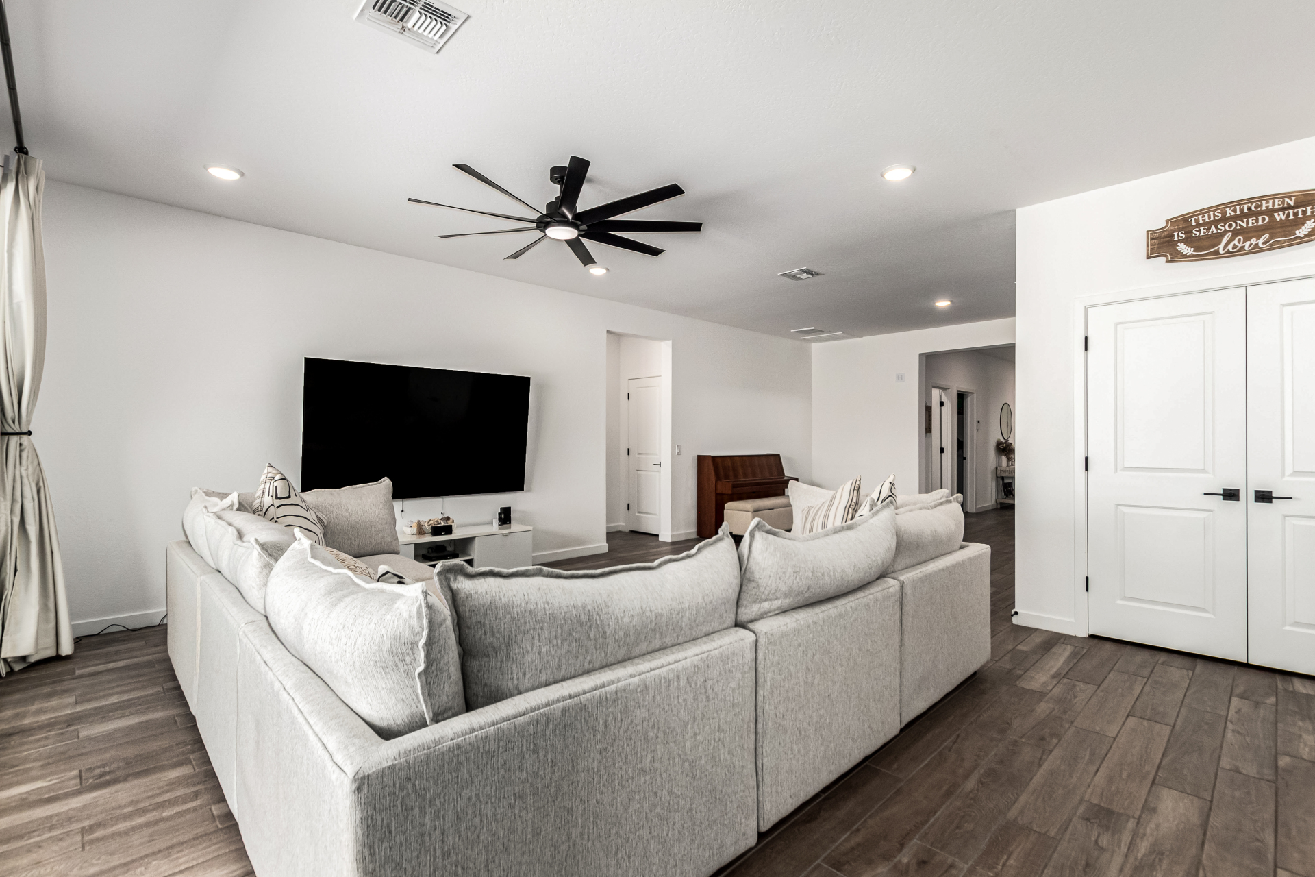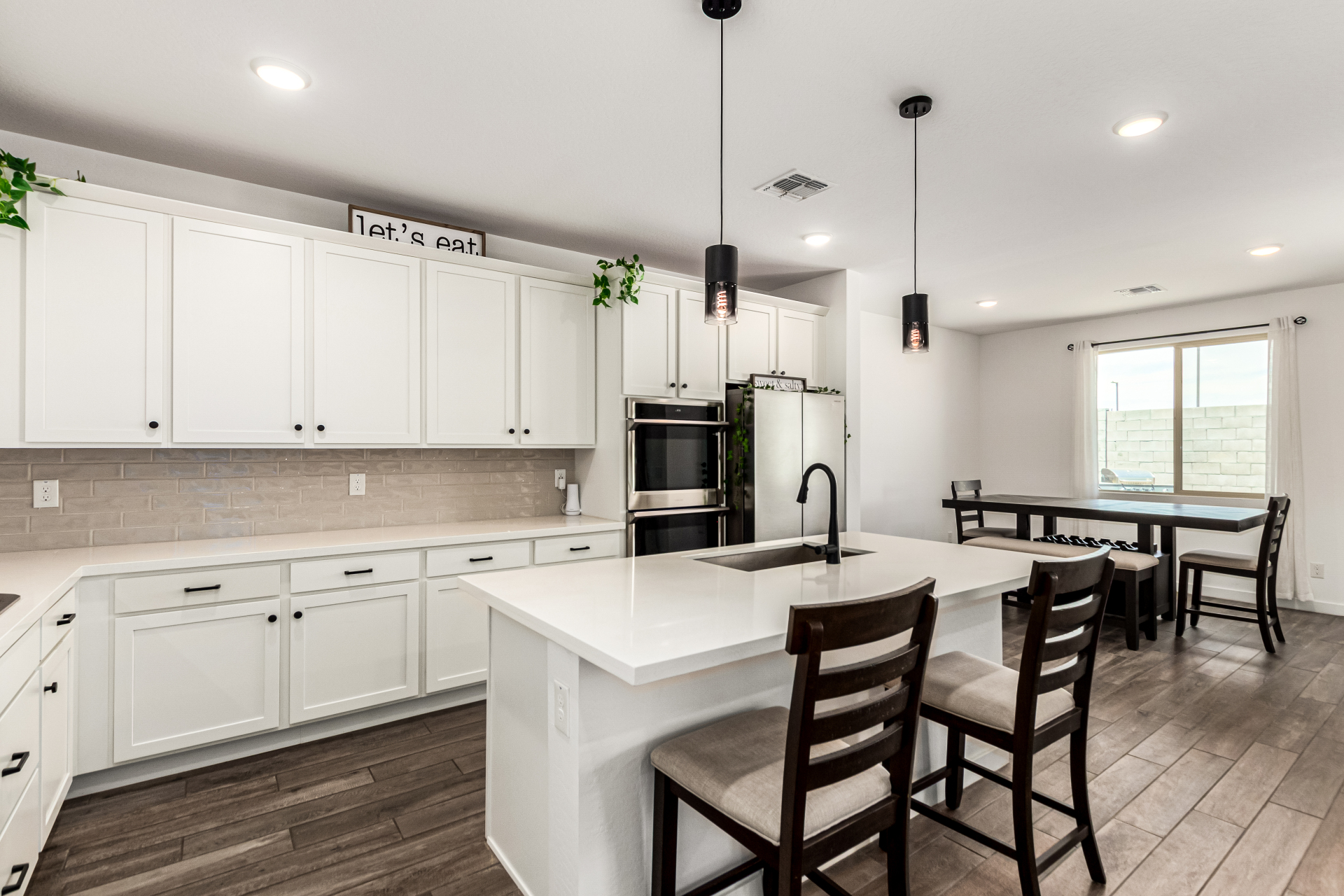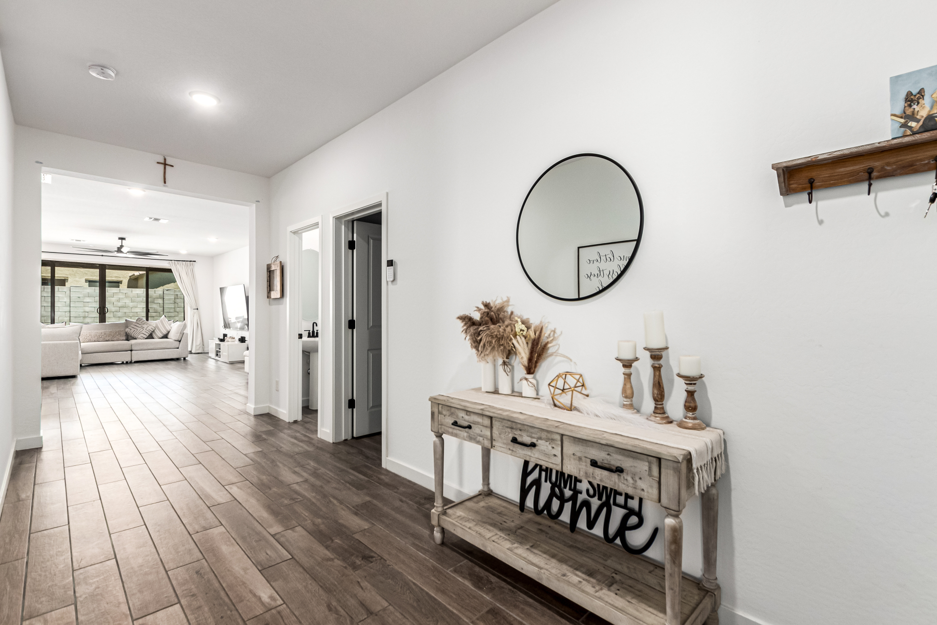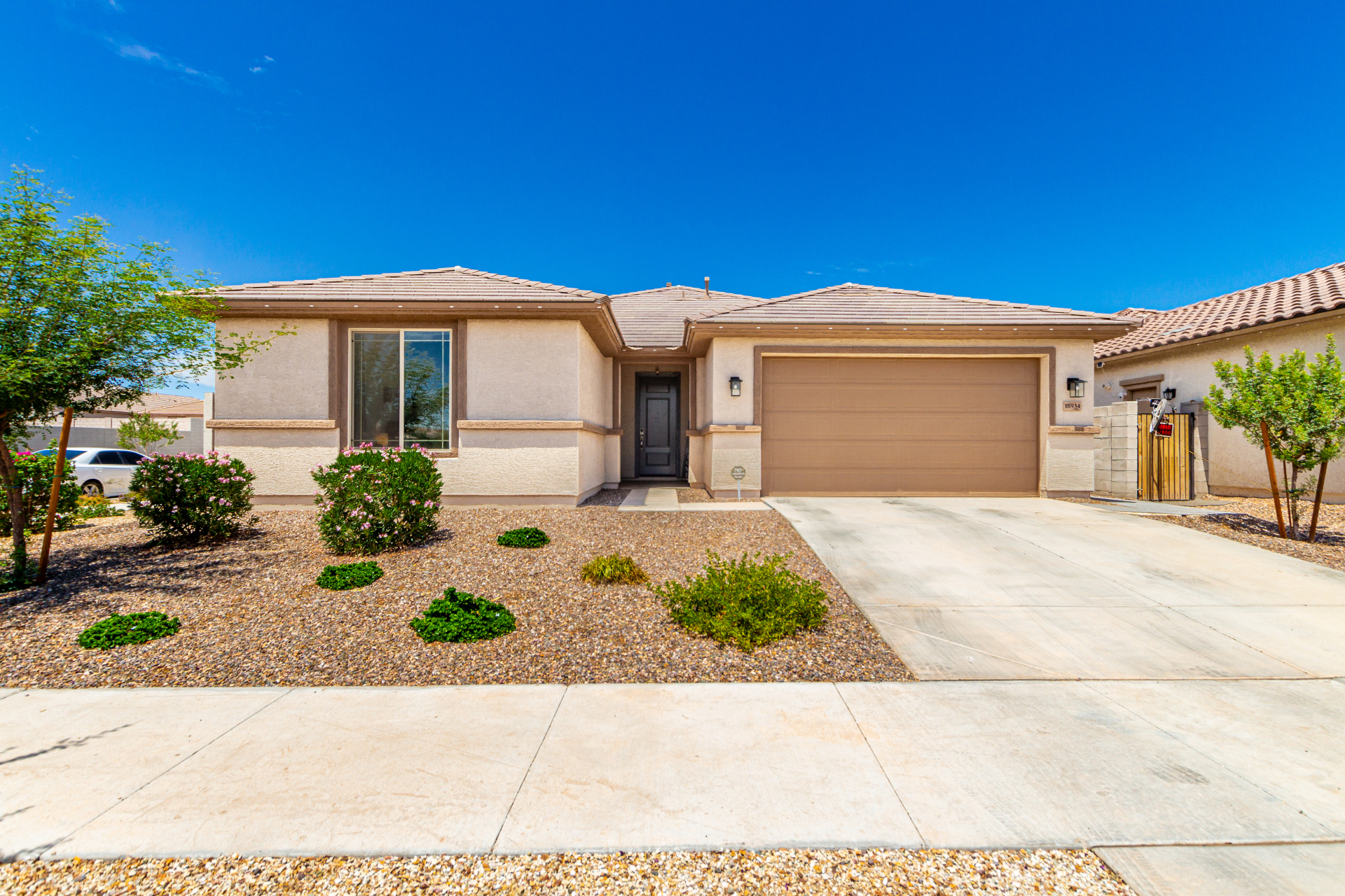Your dream corner lot home is within reach! Fall in love with the stunning open layout showcasing high ceilings, recessed lighting, a soothing palette, and attractive wood-look flooring. The gorgeous kitchen comes with quartz counters, white shaker cabinets with crown moulding, chic pendant lighting, stainless steel appliances, a pantry, and an island with a breakfast bar for casual meals. The serene primary bedroom boasts plush carpeting, an ensuite with double sinks, and a large walk-in closet. You'll also find a cozy den and a versatile bonus room, offering flexible living spaces to fit your lifestyle. Venture out onto the charming backyard, which includes a covered patio for dining al fresco and stylish pavers. Make this gem yours today!