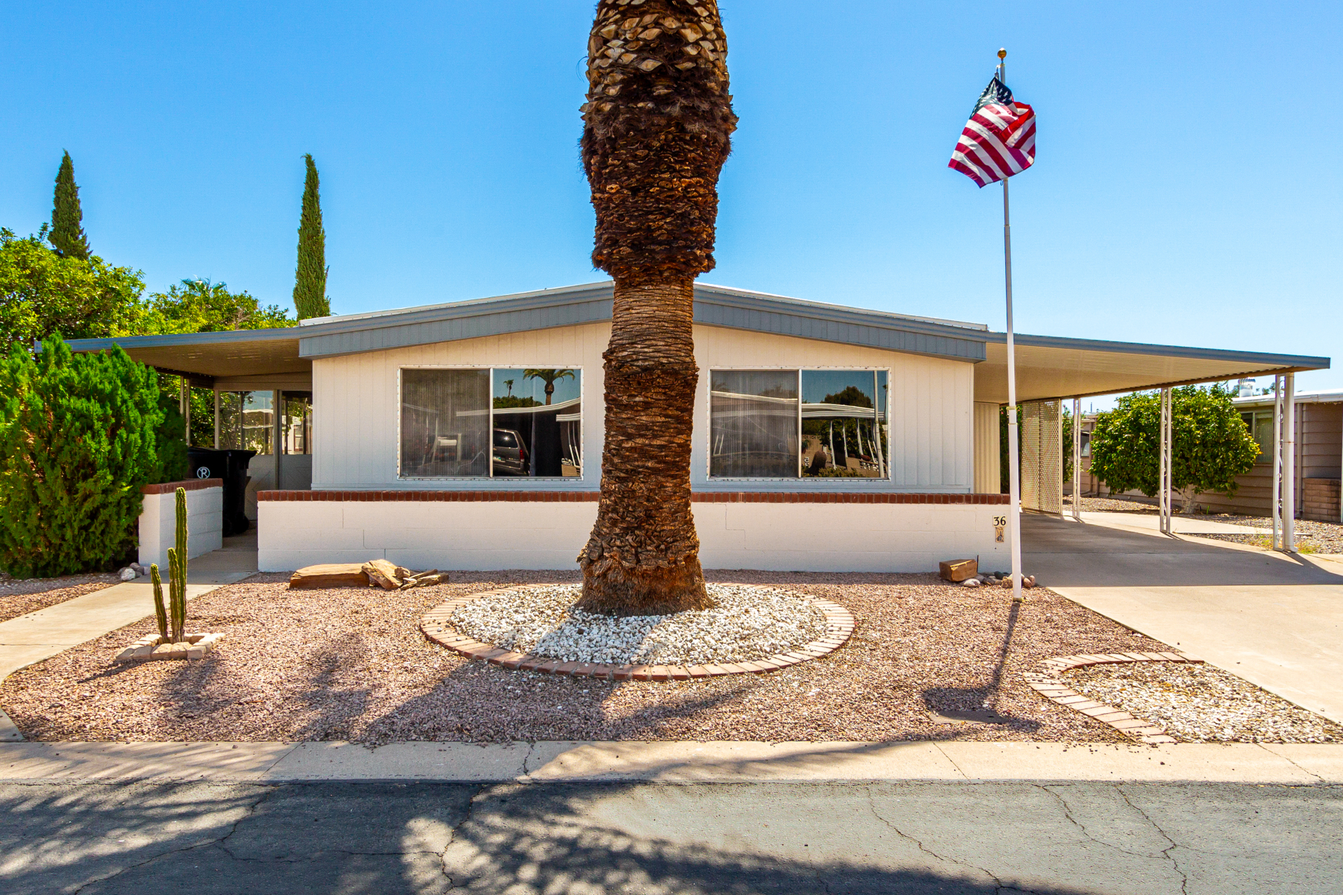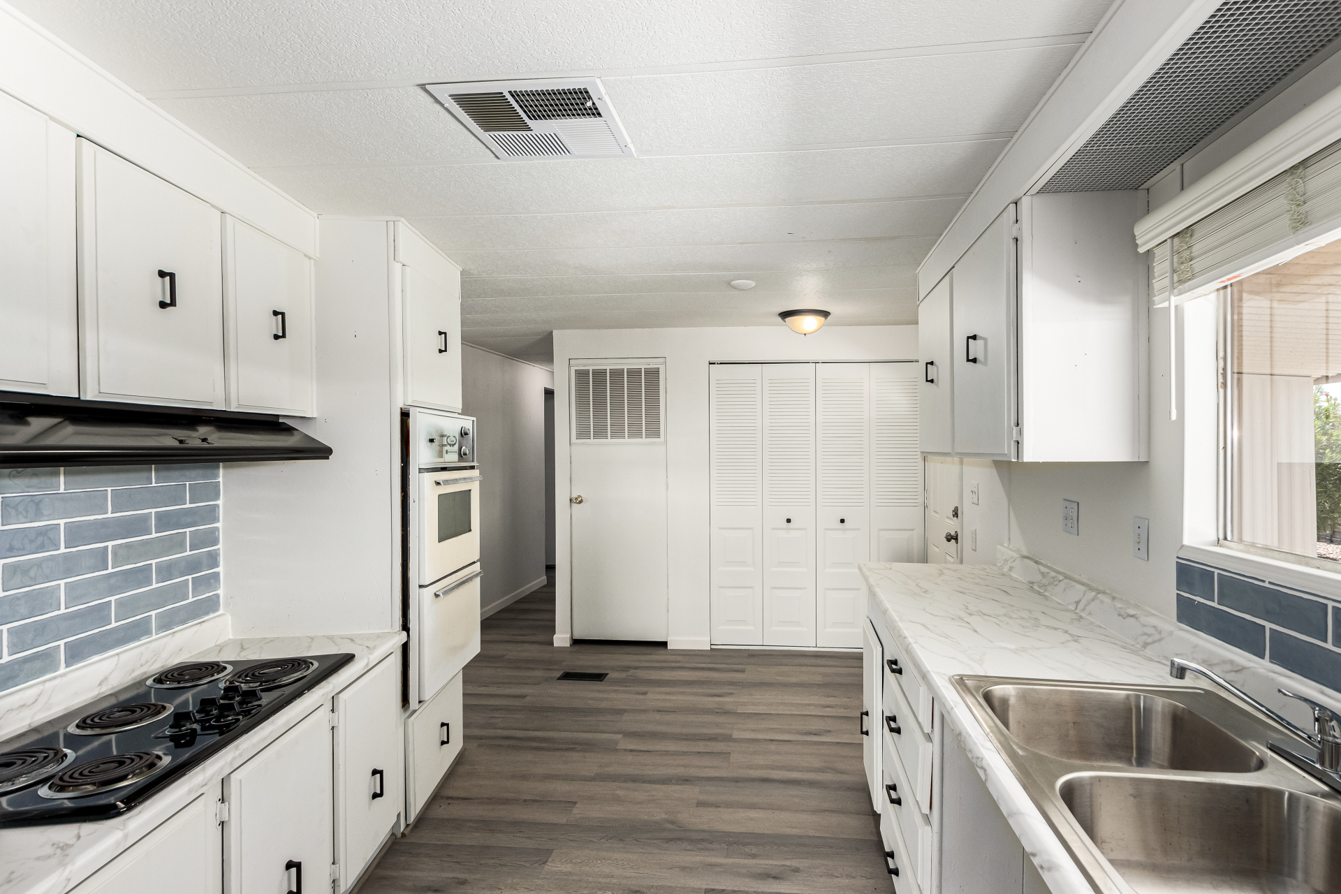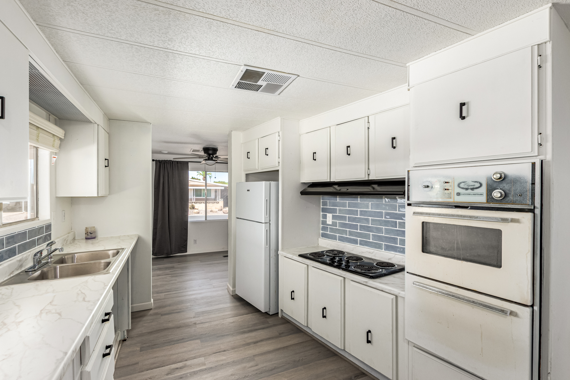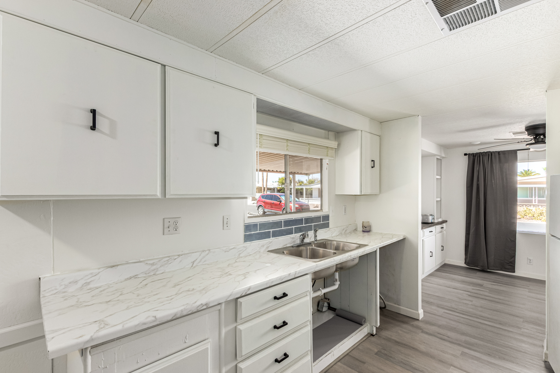 Welcome to this charming 2-bedroom mobile home in the adult Community of Village Grove! Inside, you'll find a serene living room with a soothing palette and attractive wood-look flooring for a timeless appeal. The well-appointed kitchen comes with flat-panel cabinetry, a tile backsplash, a pantry, and essential built-in appliances for an enjoyable cooking experience. The main bedroom offers a private bathroom for added comfort. Outside, discover a backyard with a covered patio and a shed for additional storage. Conveniently located close to bus stops and shopping options. Don't miss out on this one!