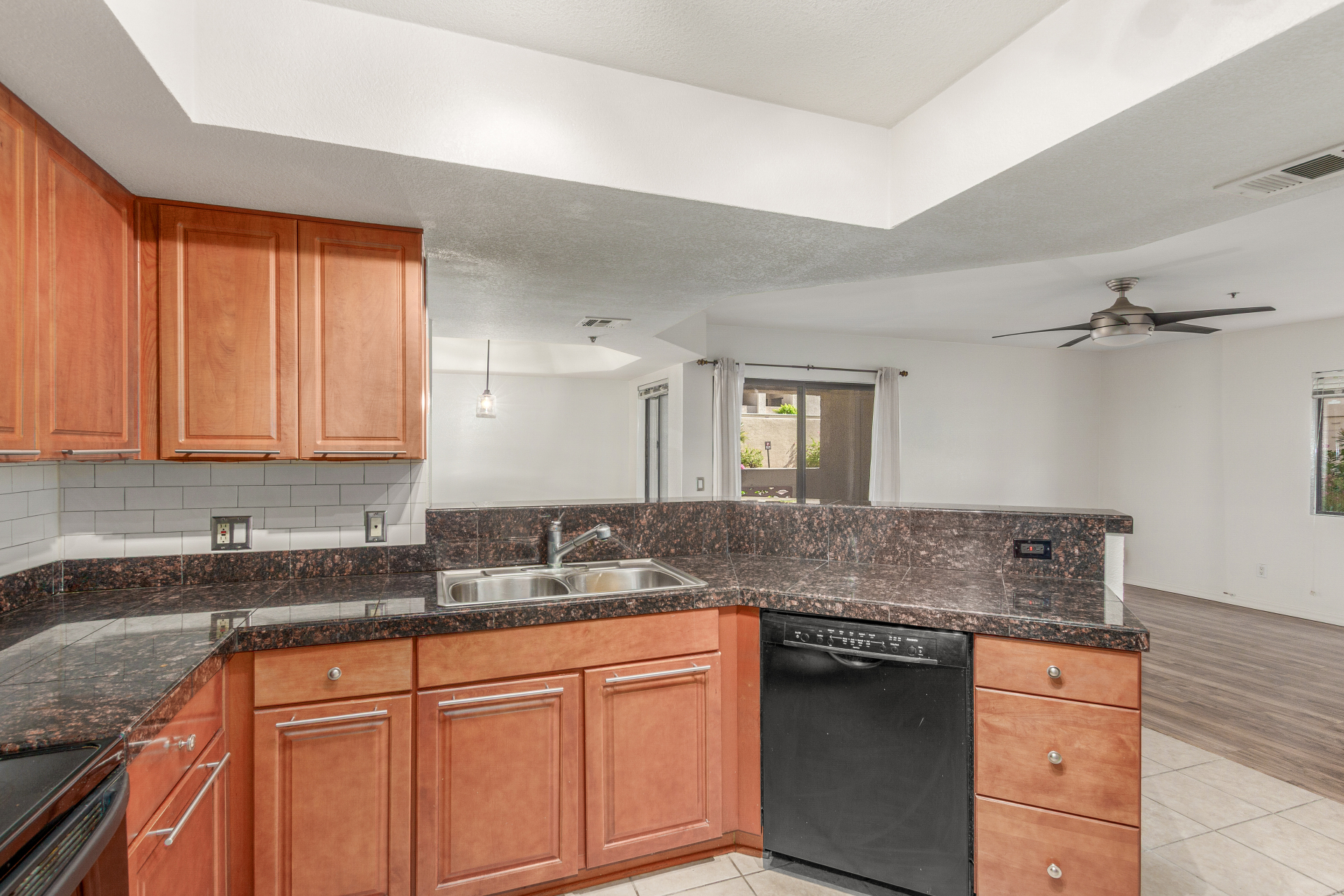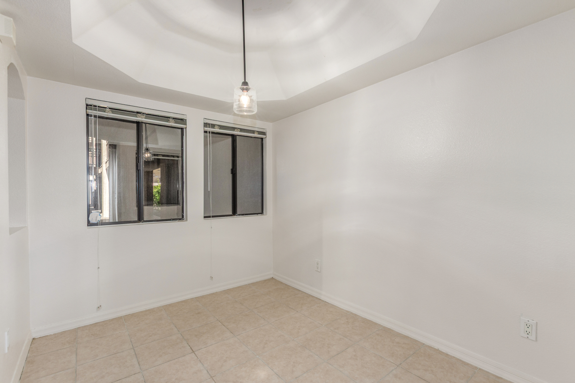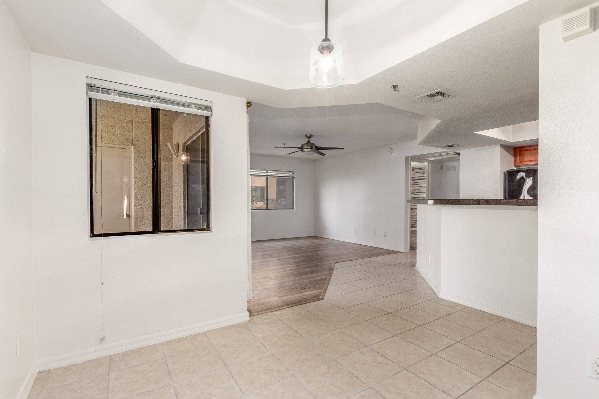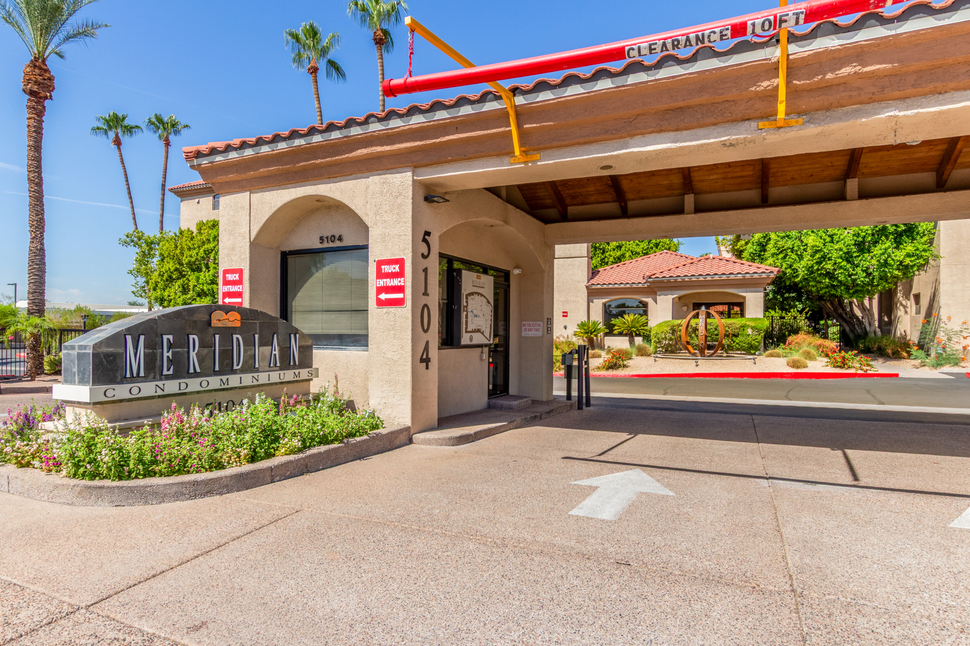 Ready to live in the great Biltmore area? This ground-level apartment in the Gated Meridian Community allows you to do it! Light and bright floor plan features a spacious living room for entertaining and a formal dining room for having a feast. Wood-style and tile floors, fire sprinklers, neutral paint, tray ceilings, and modern light fixtures can't be left unsaid. The kitchen has tile counters, beautiful cabinets, stainless steel appliances, subway backsplash, and a peninsula with a breakfast bar for quick meals. The bedroom offers a mirrored door in the walk-in closet, while the bathroom includes a tub/shower combo. Outside, you can relax in the lovely, covered patio with a convenient storage room. Enjoy the community pool, spa, clubhouse, and more. Owner is a licensed Agent in AZ