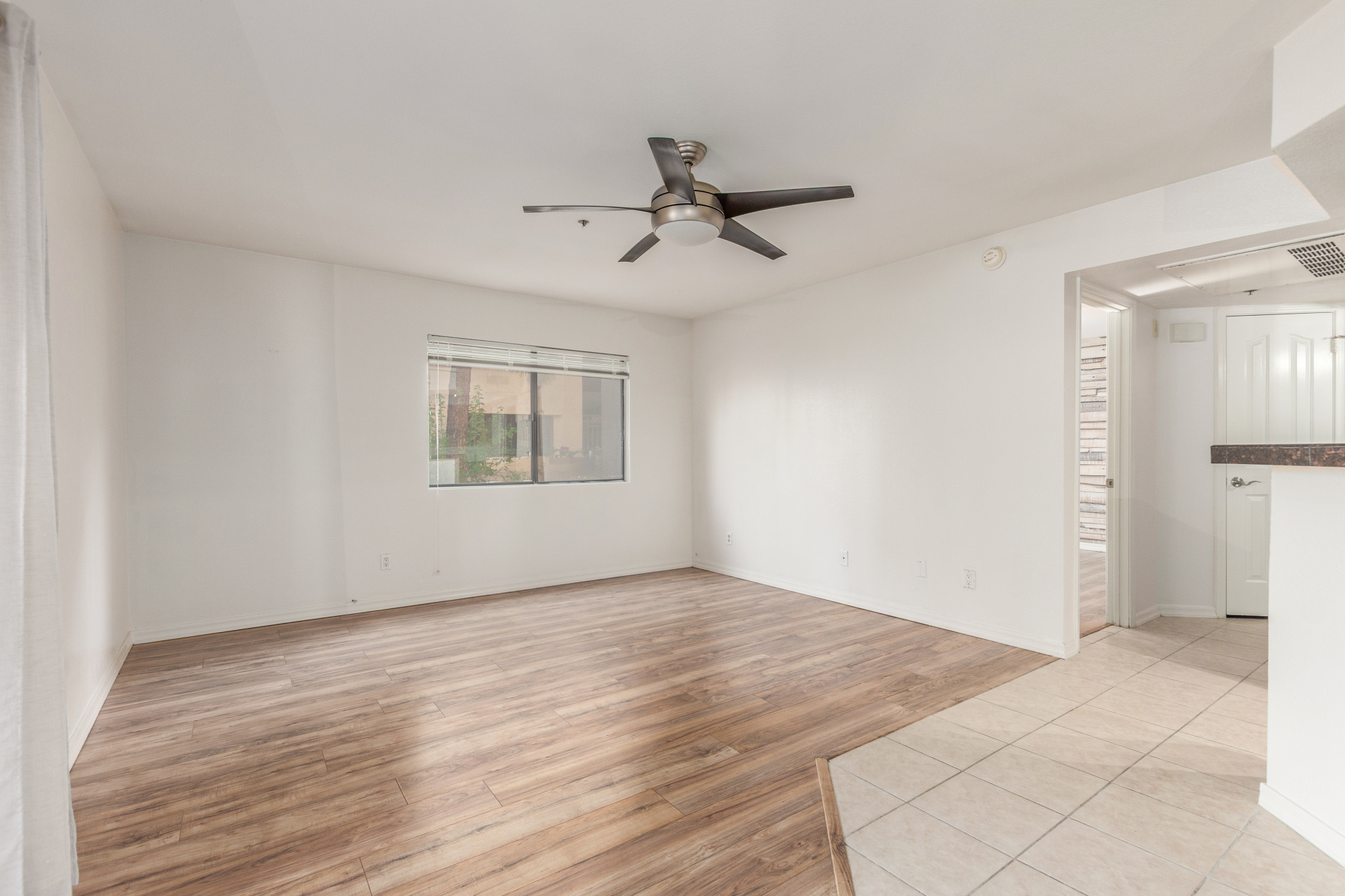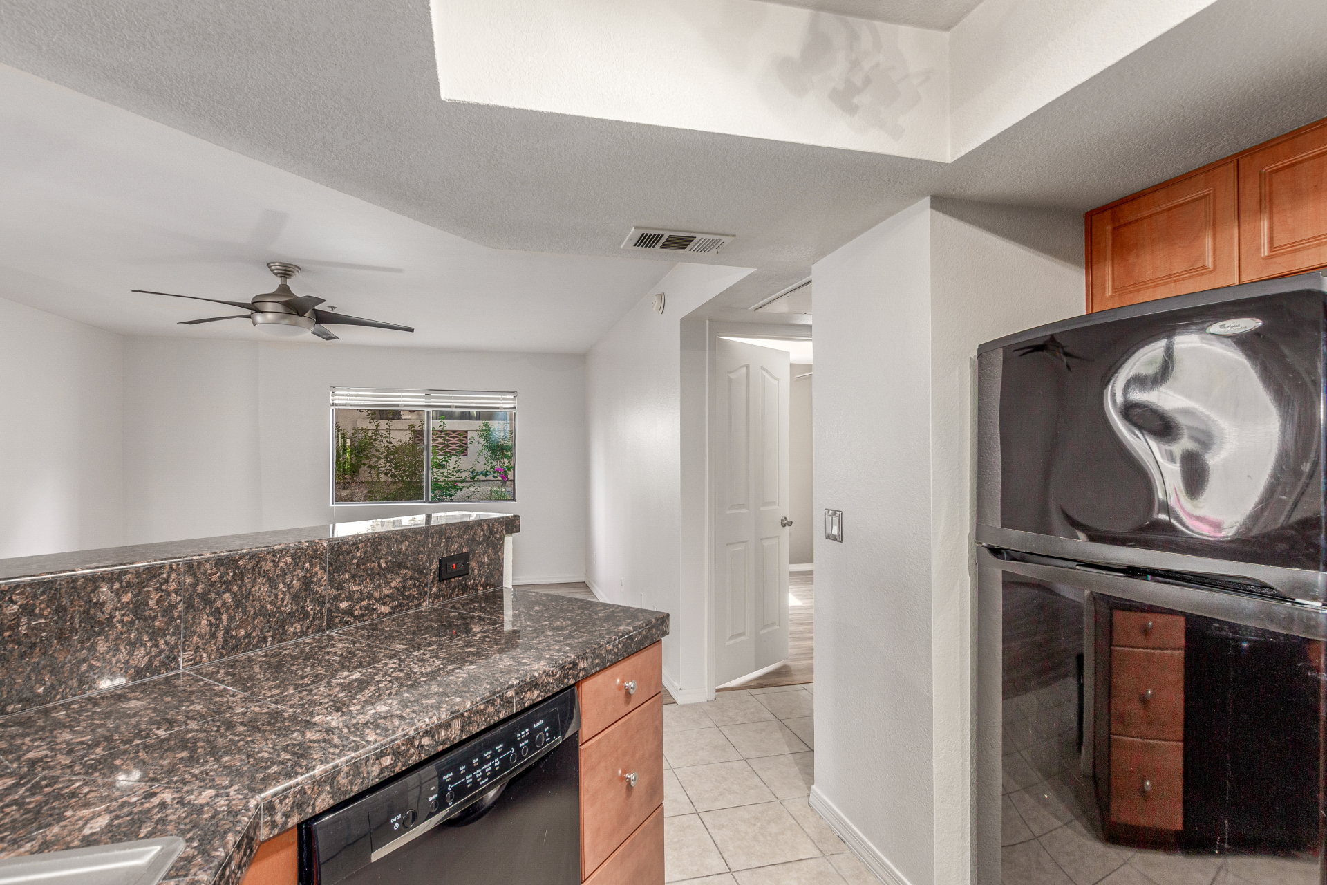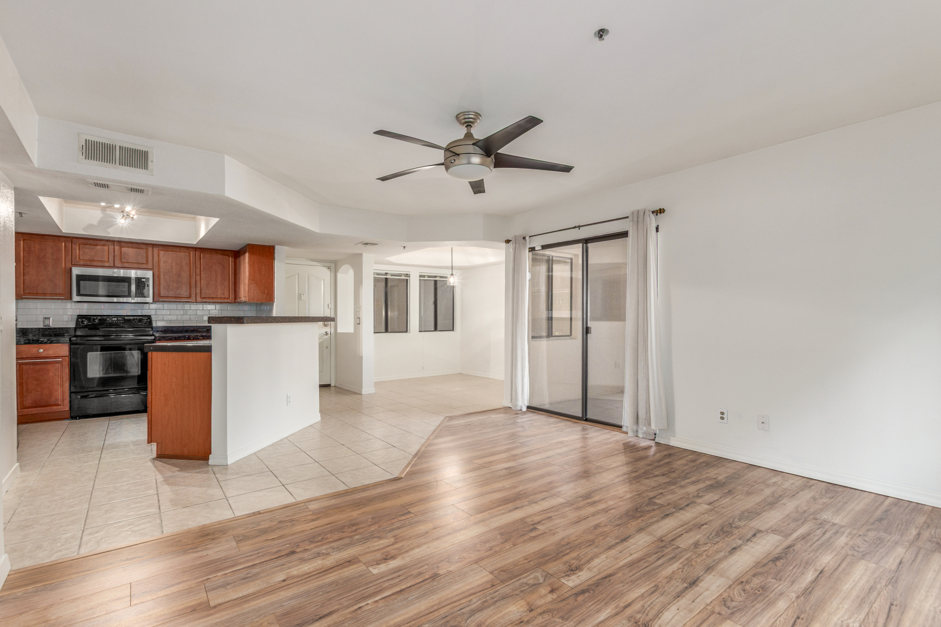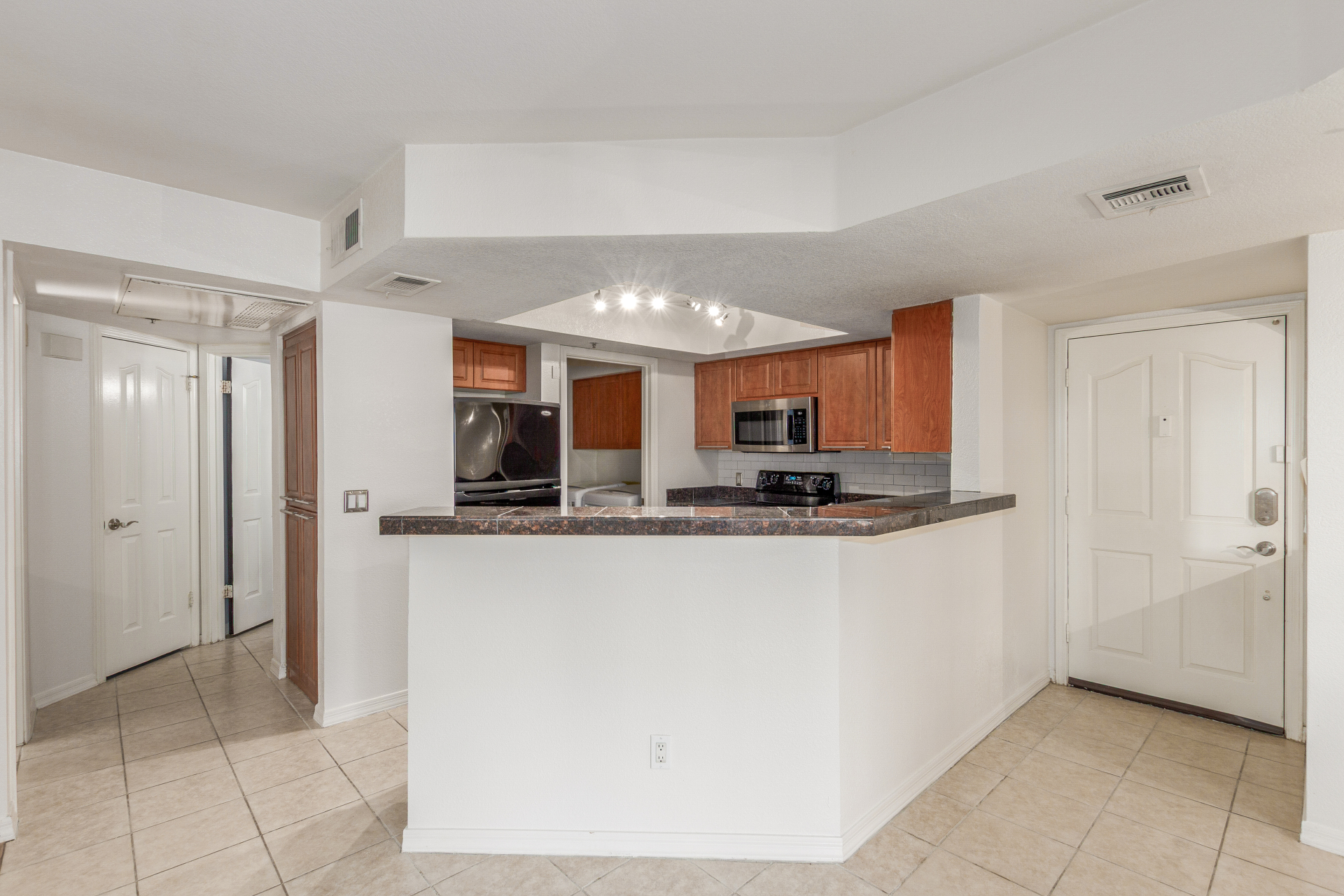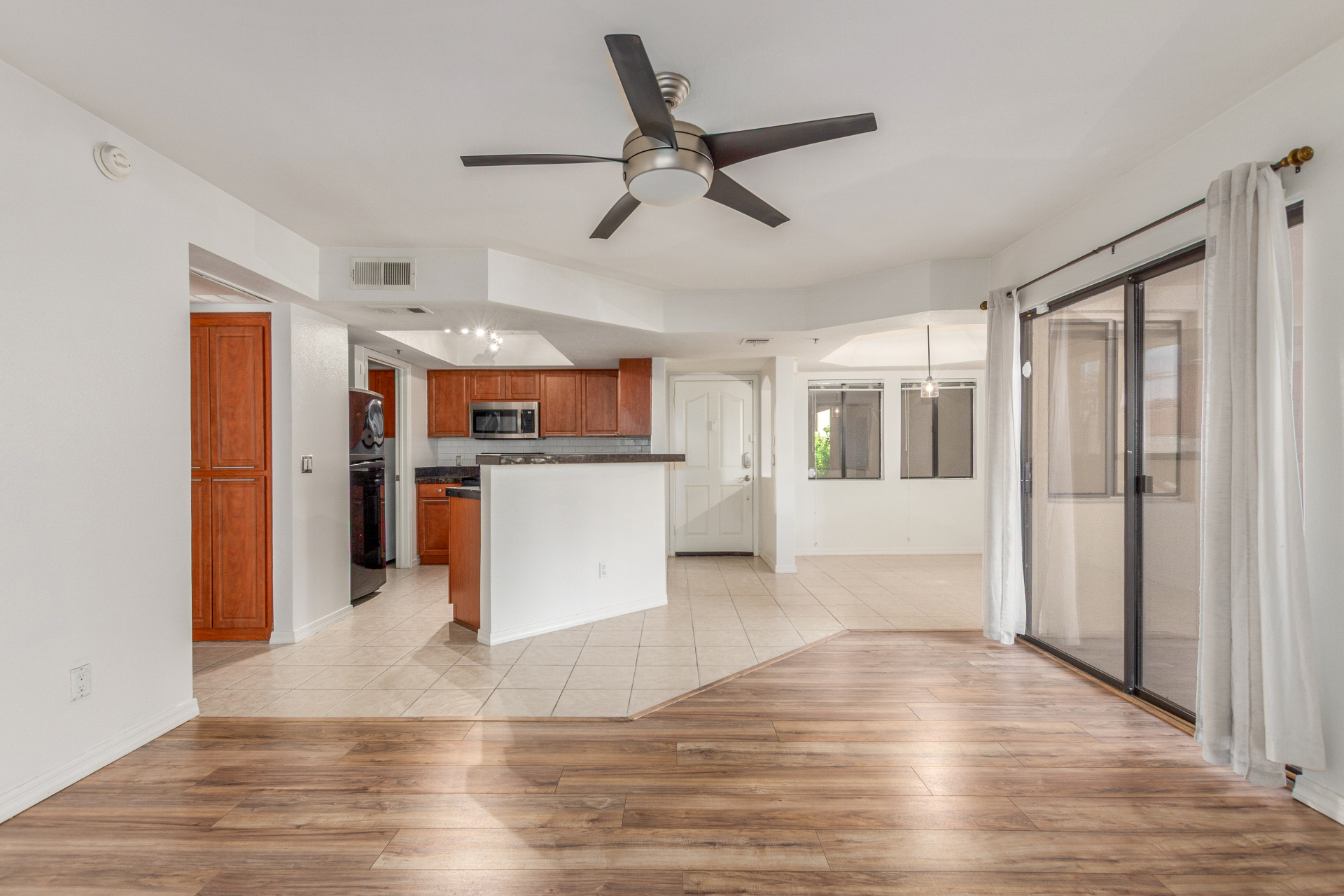 Ready to live in the great Biltmore area? This ground-level apartment in the Gated Meridian Community allows you to do it! Light and bright floor plan features a spacious living room for entertaining and a formal dining room for having a feast. Wood-style and tile floors, fire sprinklers, neutral paint, tray ceilings, and modern light fixtures can't be left unsaid. The kitchen has tile counters, beautiful cabinets, stainless steel appliances, subway backsplash, and a peninsula with a breakfast bar for quick meals. The bedroom offers a mirrored door in the walk-in closet, while the bathroom includes a tub/shower combo. Outside, you can relax in the lovely, covered patio with a convenient storage room. Enjoy the community pool, spa, clubhouse, and more. Owner is a licensed Agent in AZ