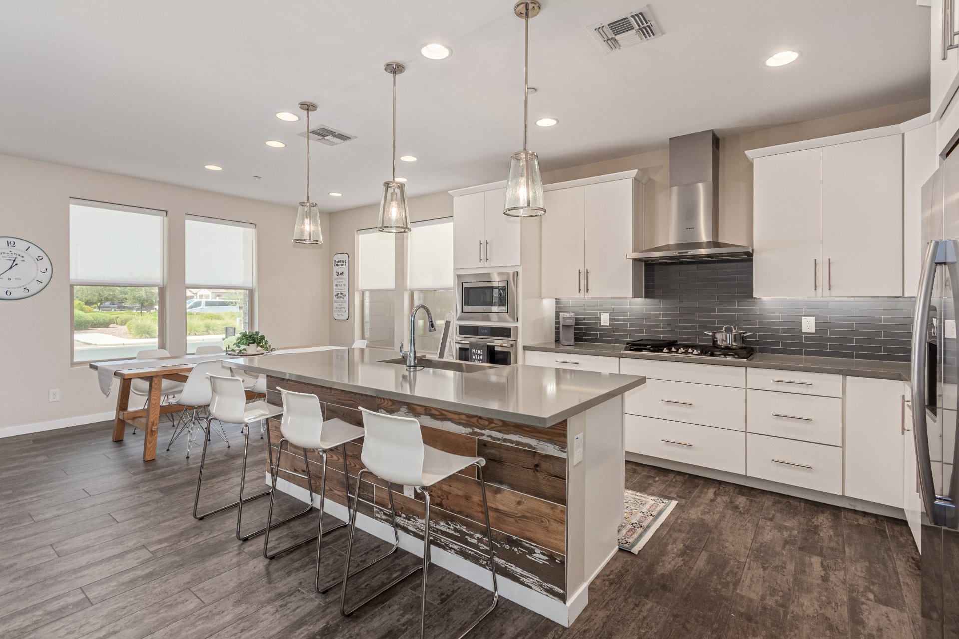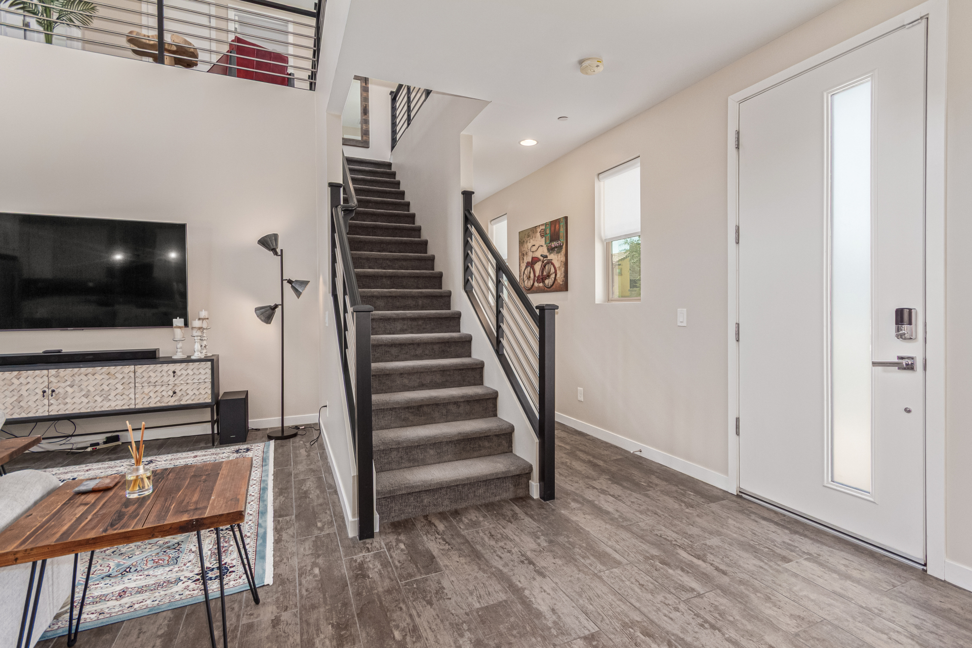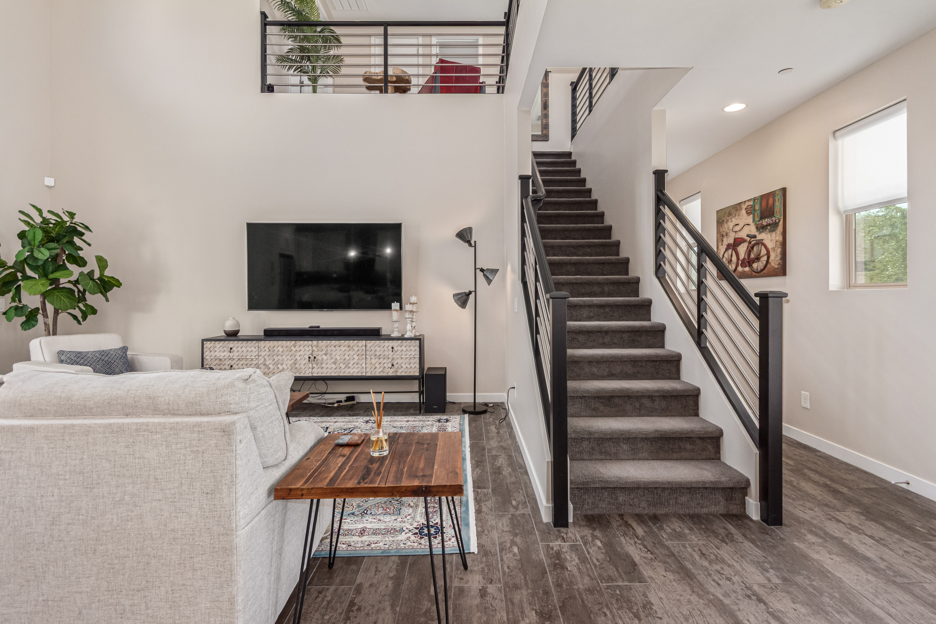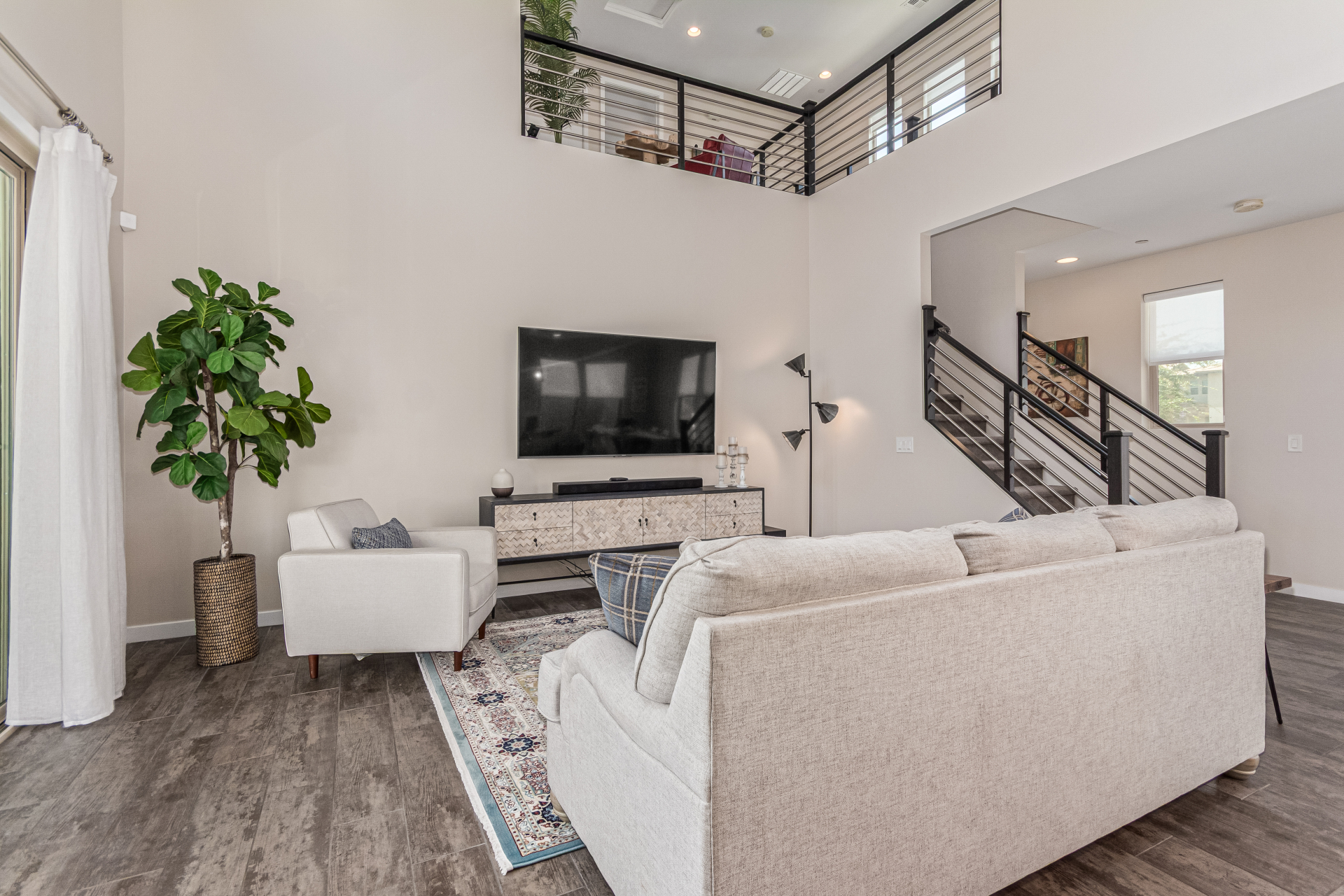 Stunning contemporary home. Open concept floor plan. Soaring ceiling. Gourmet kitchen, large island, quartz countertops, stainless steel appliances, gas cooktop, high profile vent-hood. Wood-plank-tile flooring at entire main level. Private primary suite with gorgeous shower, balcony.