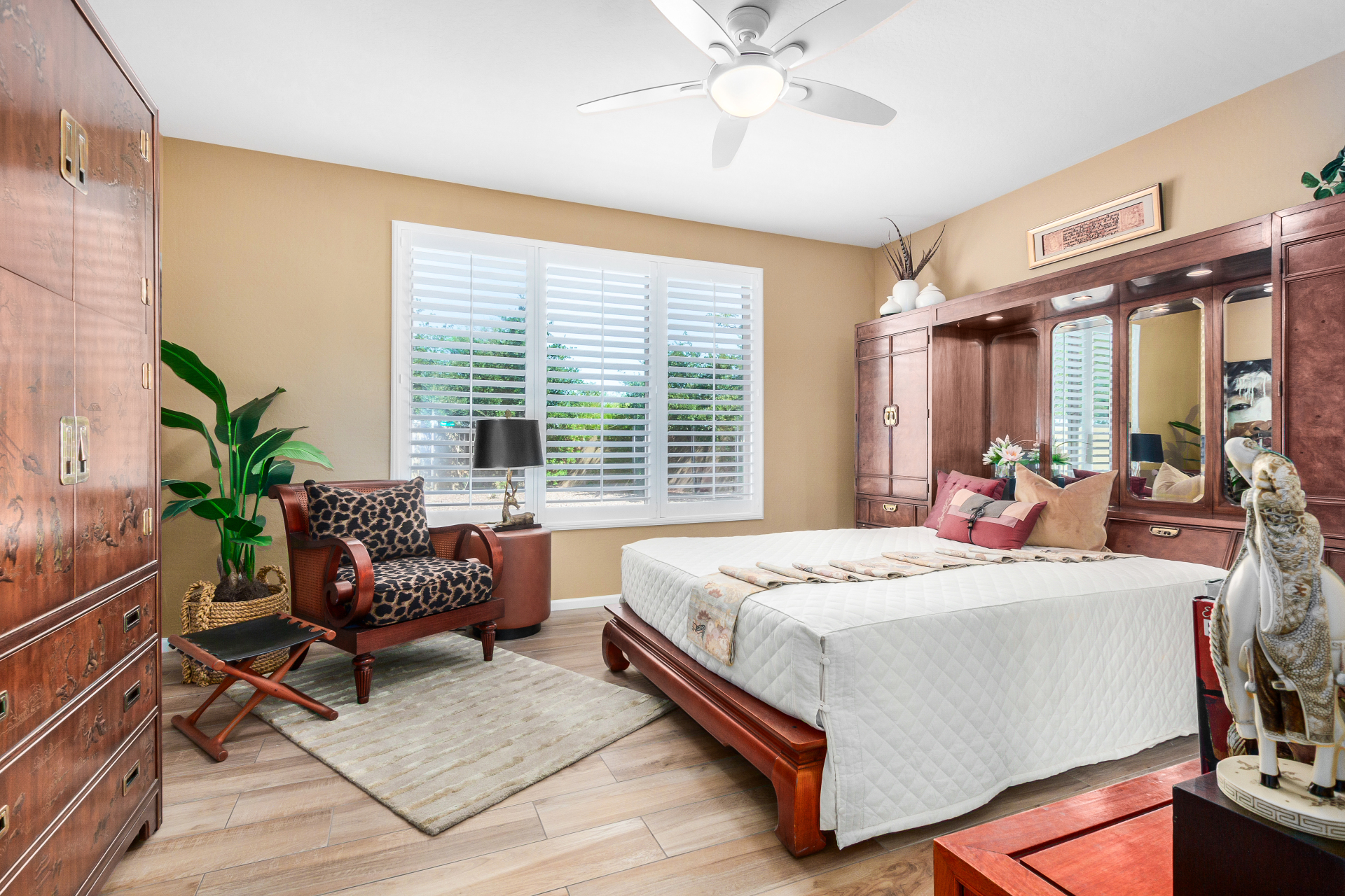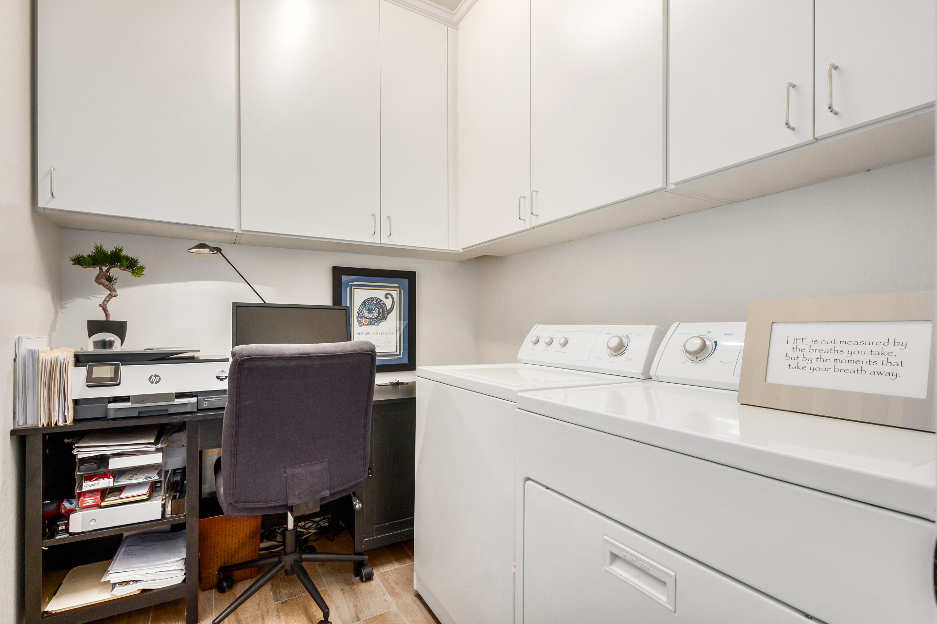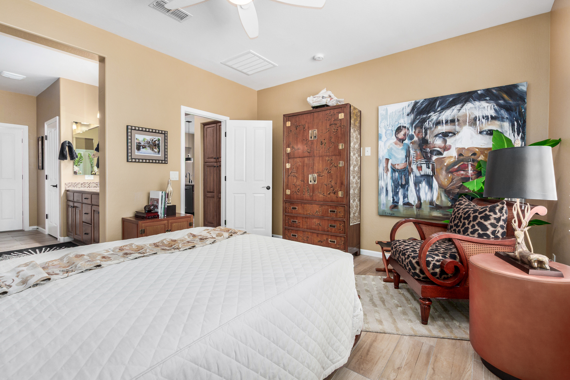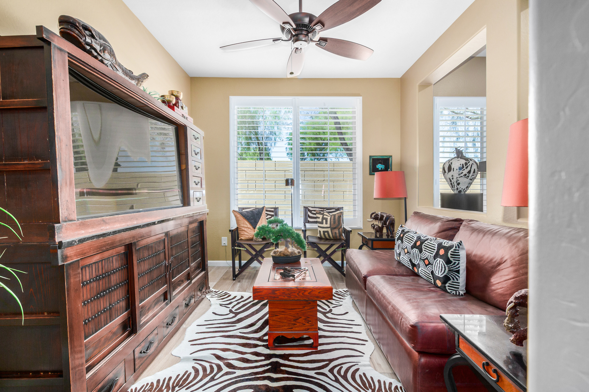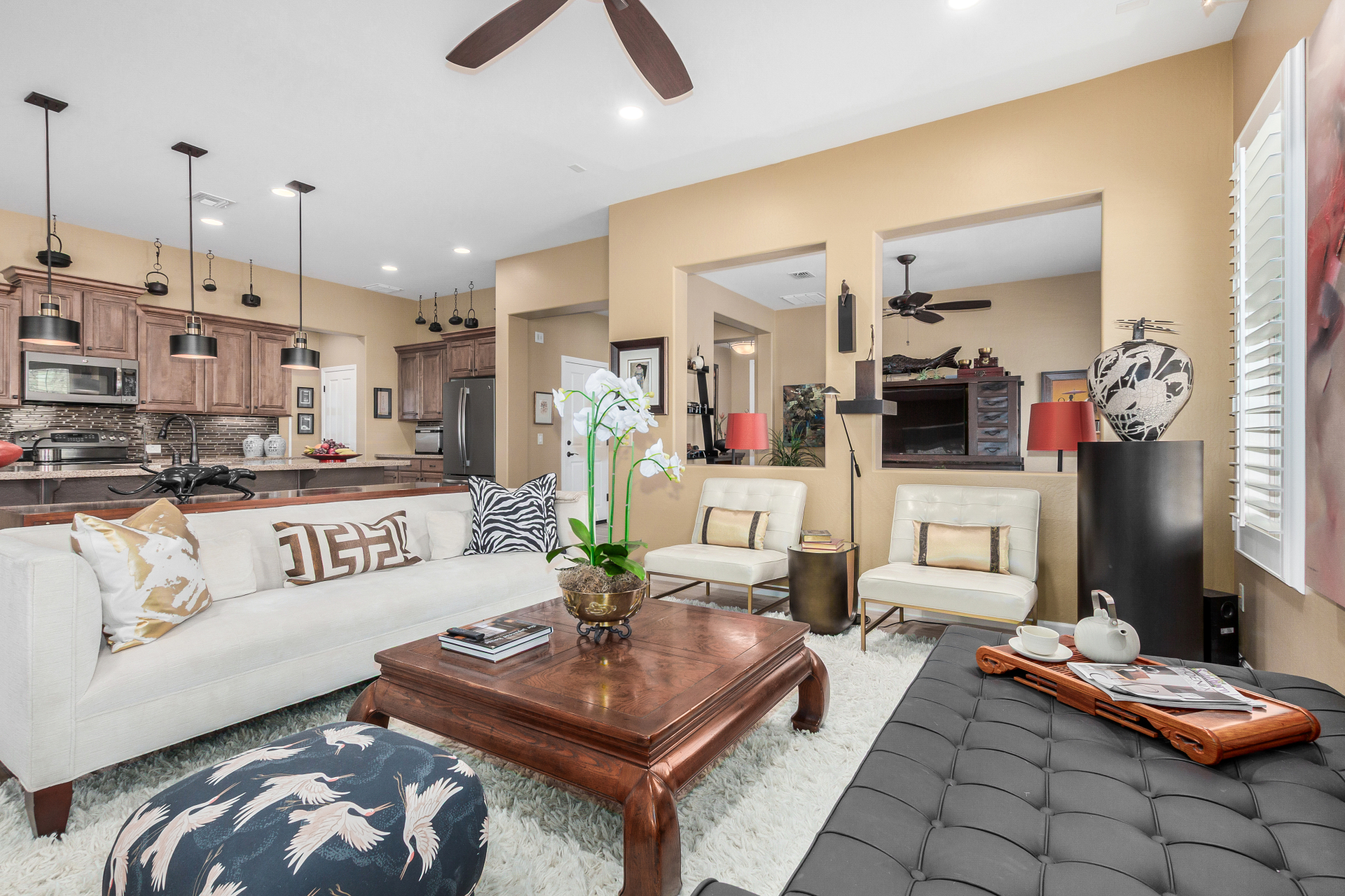 Beautiful, very well-maintained contemporary courtyard villa with spacious Lago floorplan is located on the Tuscany Falls side of the award-winning golf resort community of PebbleCreek. Designer touches and upgrades throughout. The kitchen boasts stately, upgraded Alder cabinetry with crown molding, pull-out shelving, a spacious pantry closet, GE Signature Collection stainless steel appliances, Silestone quartz countertops and interlocking full height porcelain tile backsplash. A fully furnished kitchen with all accessories, refrigerator, and washer & dryer convey with the home. The feel of this pristine villa is enhanced by 10-foot ceilings in the great room, kitchen, and separate dining area, and 9-foot ceilings throughout the rest of the home. Designer lighting in the kitchen and dining room and ceiling fans in the great room, den, and bedrooms. New recessed lighting in the great room. Plantation shutters, and wood-look porcelain tile flooring are throughout the home and create a clean modern look.