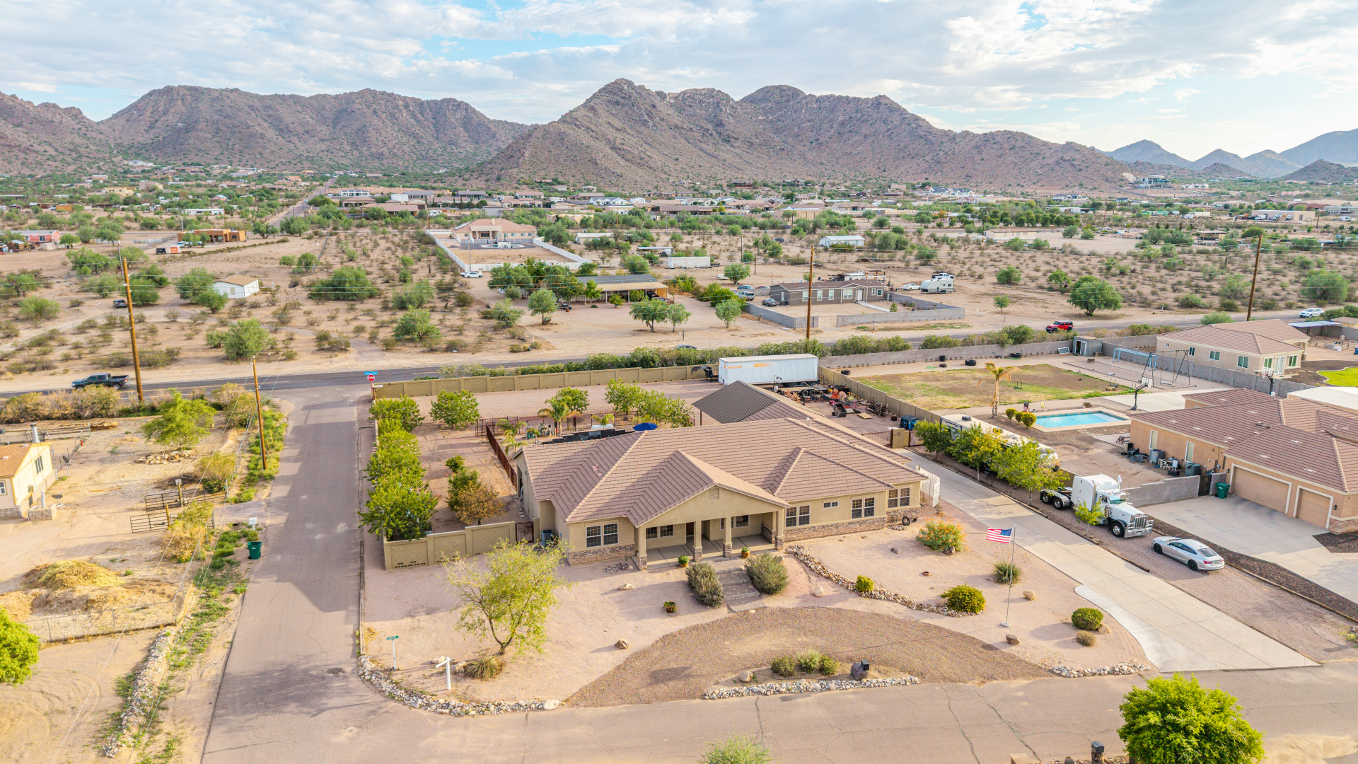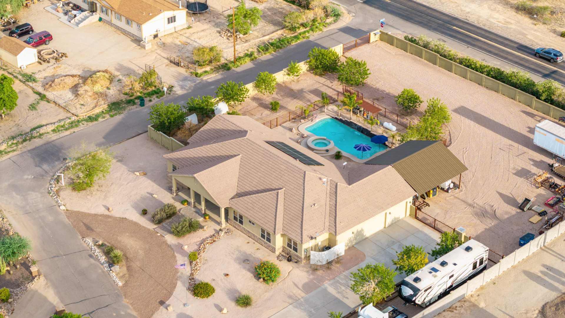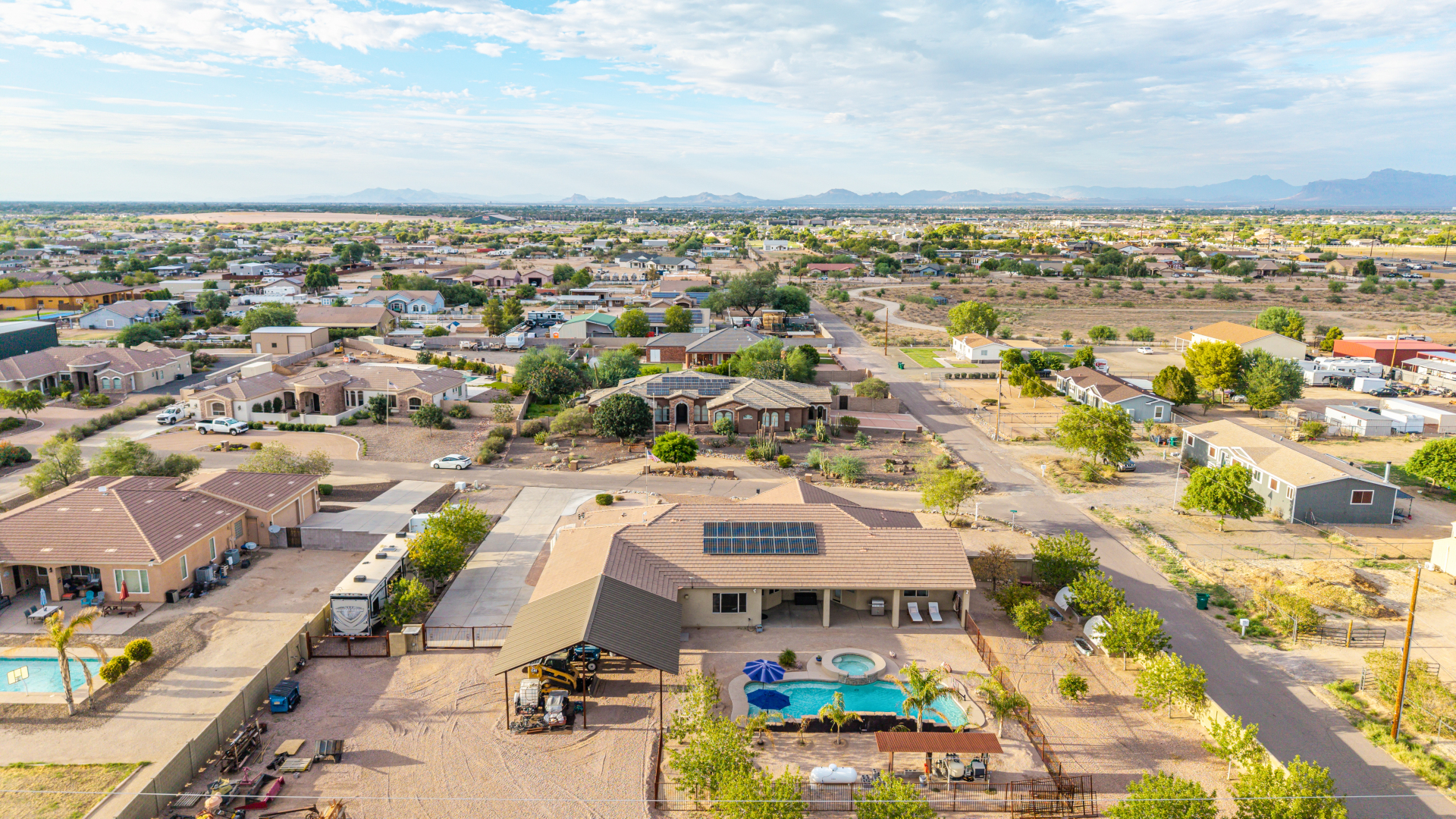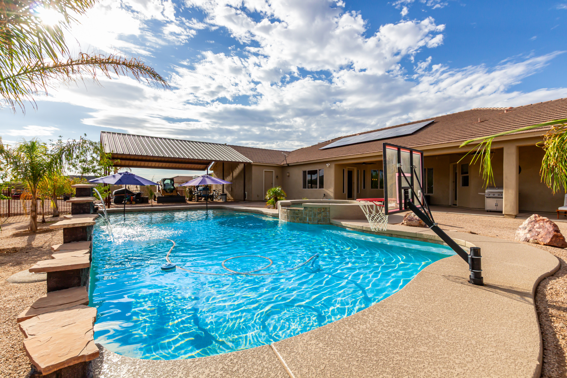 Beautiful 5-bedroom home with POOL in a desirable CORNER LOT is now on the market! Discover all the charm of this horse property, featuring a comfortable and generous layout with a blend of tile and wood-look flooring, abundant natural light, a floor-to-ceiling stone fireplace to add warmth to the family room, and a soothing, earthy palette throughout, making every space perfect for relaxation and entertaining. The impeccable culinary space showcases ample cabinetry, granite counters, a walk-in pantry, an island with a breakfast bar, and built-in appliances for a seamless cooking experience. Double doors lead to the main bedroom, offering a walk-in closet and a spa-like bathroom with double vanities. The sizable den is perfect for an office or hobby area. The expansive backyard hosts a