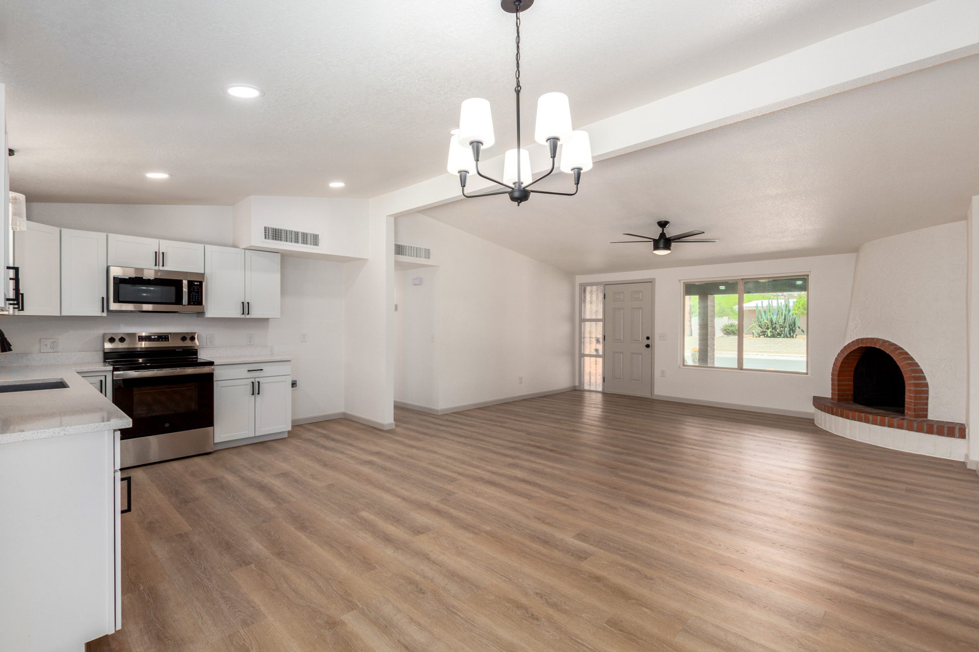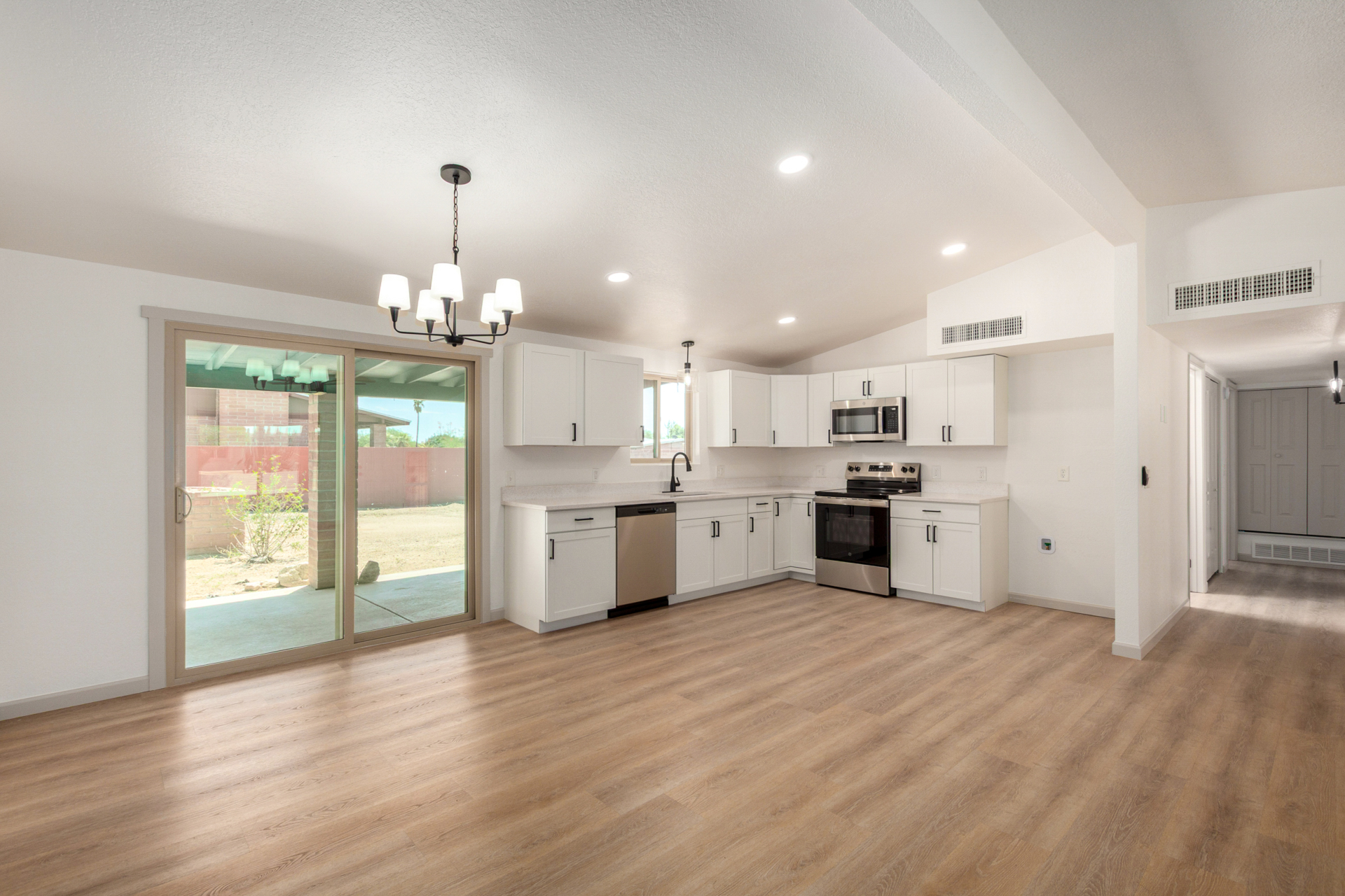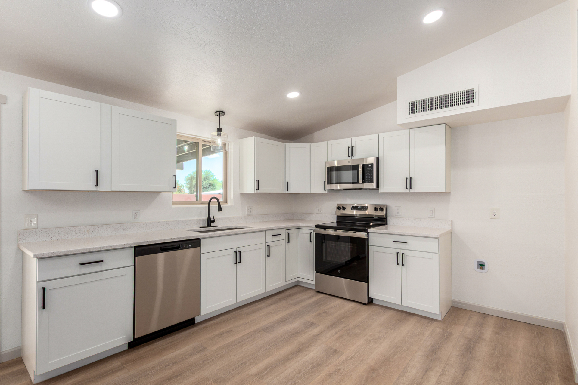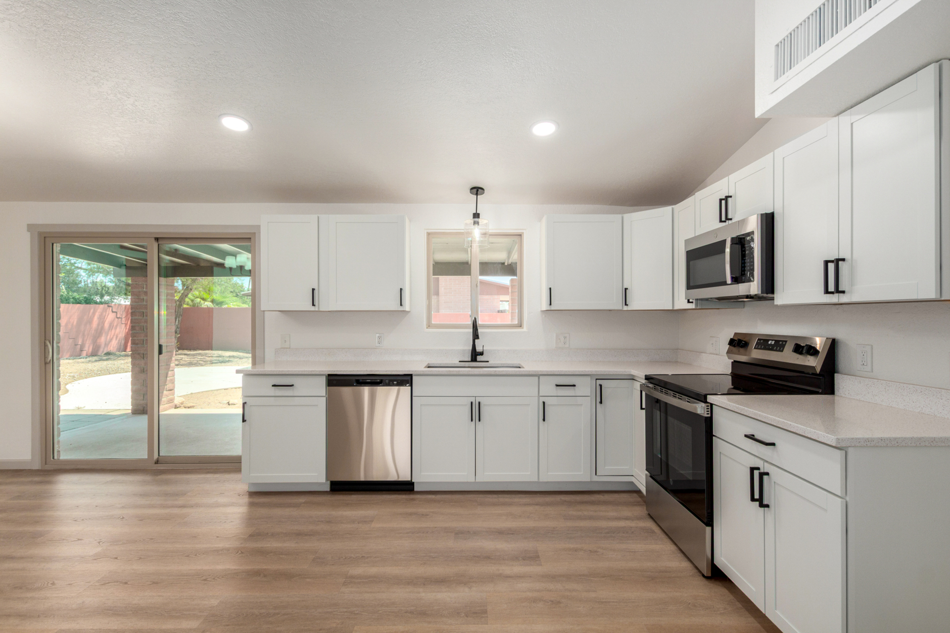Looking for a new home? You've found it! This energy efficient 3 bed, 2 bath residence sits on a premium corner lot & features a charming brick facade, low-care desert landscape, and a 2 car garage. Inside you will find a spacious open floor plan w/vaulted ceilings, wood-look flooring, a beehive fireplace, and neutral palette throughout. The kitchen is equipped w/everything you'll need for home cooking, shaker cabinetry, and granite counters. Brand new appliances featuring smooth top electric range, OTR microwave, and dishwasher (all installed). End your busy day in the primary bedroom, showcasing a private bath for added comfort. Lastly, the sizeable backyard includes a covered patio, extended seating area, and a side RV gate! Your new home is waiting for you, don't miss out! Agent/Owner