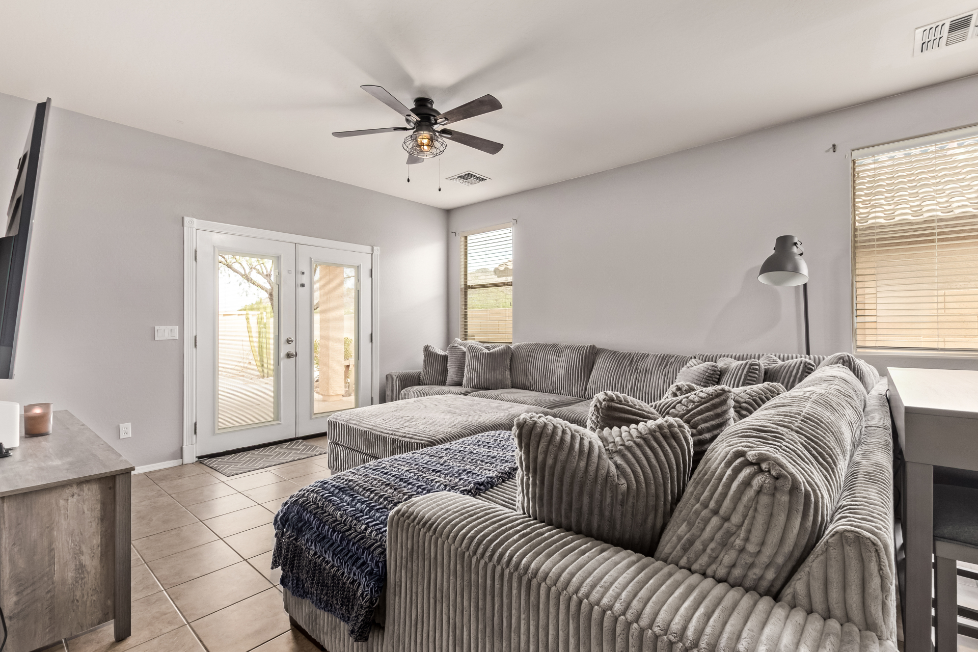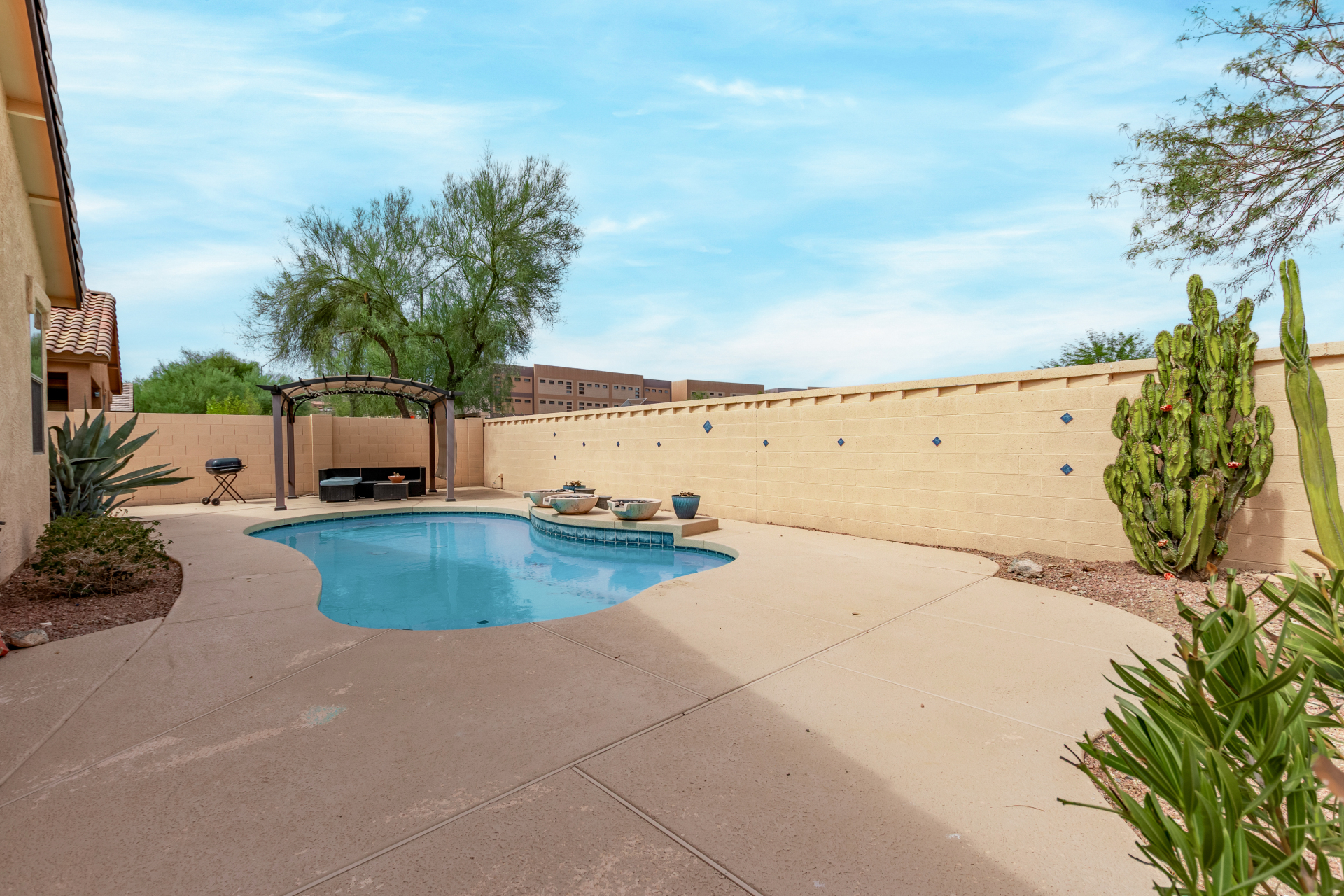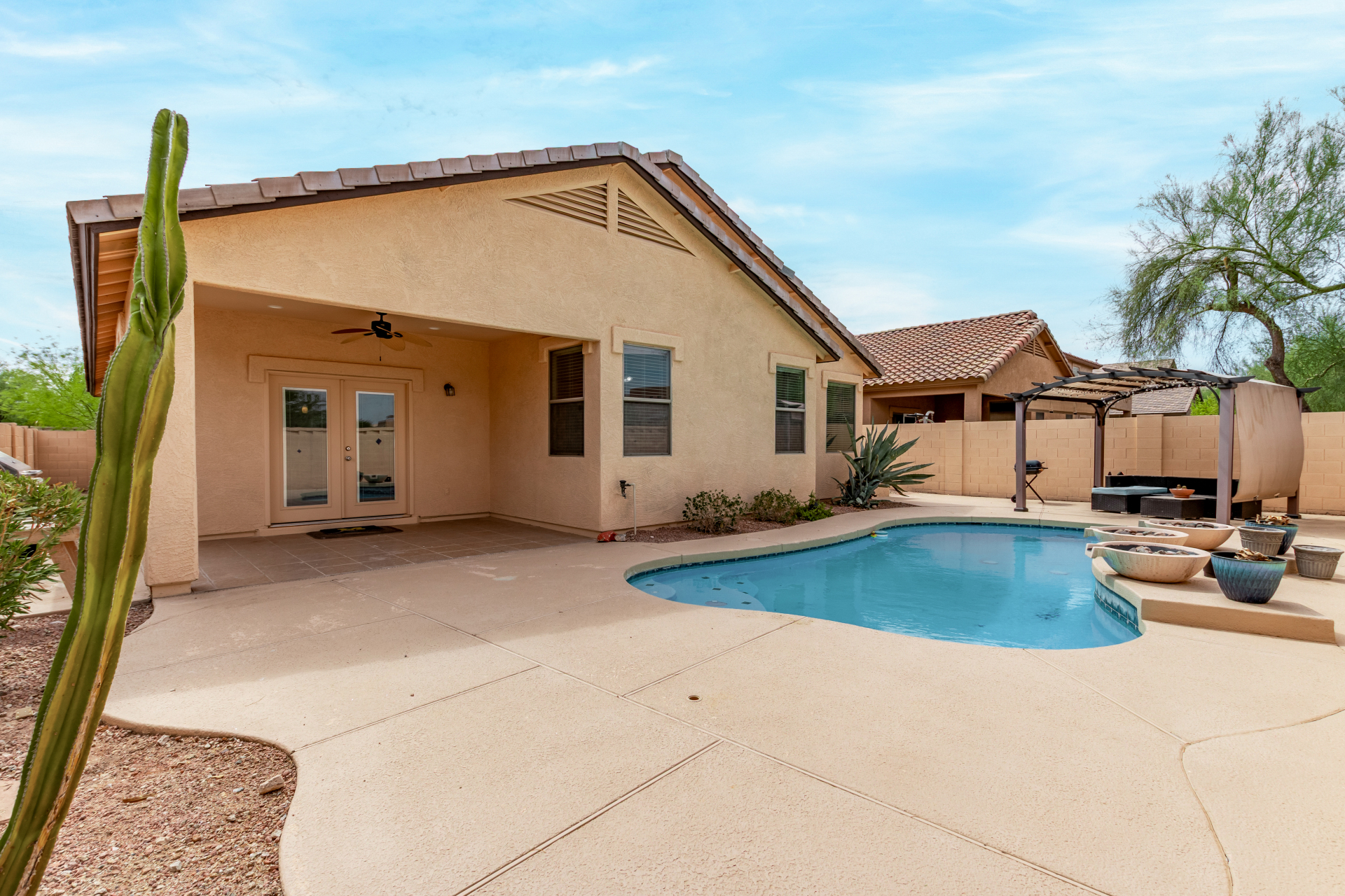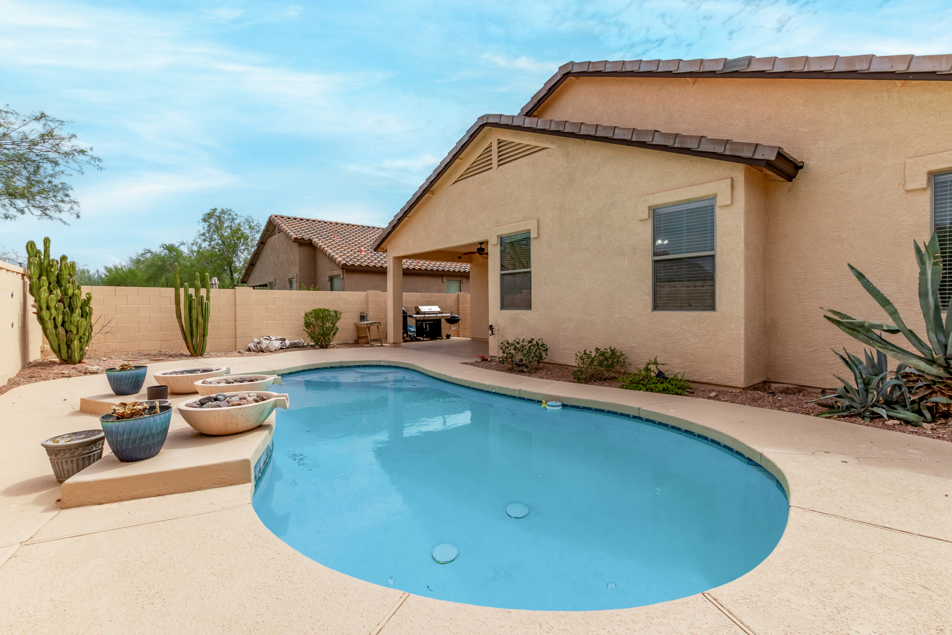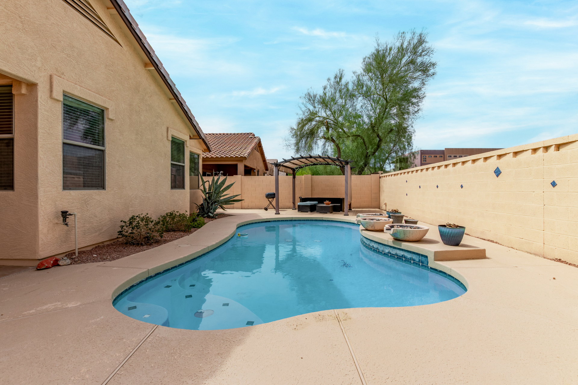 Welcome to this beautiful home with POOL & SOLAR PANELS in Westwing Mountain! Offering 4 beds, 2 baths, 2-car garage, & a low-care landscape. The inviting interior showcases tons of natural light, neutral paint, and tile & carpet t/out. You'll love the combined living & dining room, and a separate family room with French doors to the back! The impressive kitchen boasts SS appliances, granite counters, ample wood cabinets, recessed & pendant lights, and a 2-tier peninsula w/breakfast bar. Enter the large main bedroom to find a walk-in closet and an ensuite with dual sinks & a separate tub/shower. Designed for ultimate relaxation & entertainment, the backyard is sure to impress! Featuring a covered patio, Gazebo, multiple seating areas, & a sparkling pool for year-round enjoyment. Just WOW!