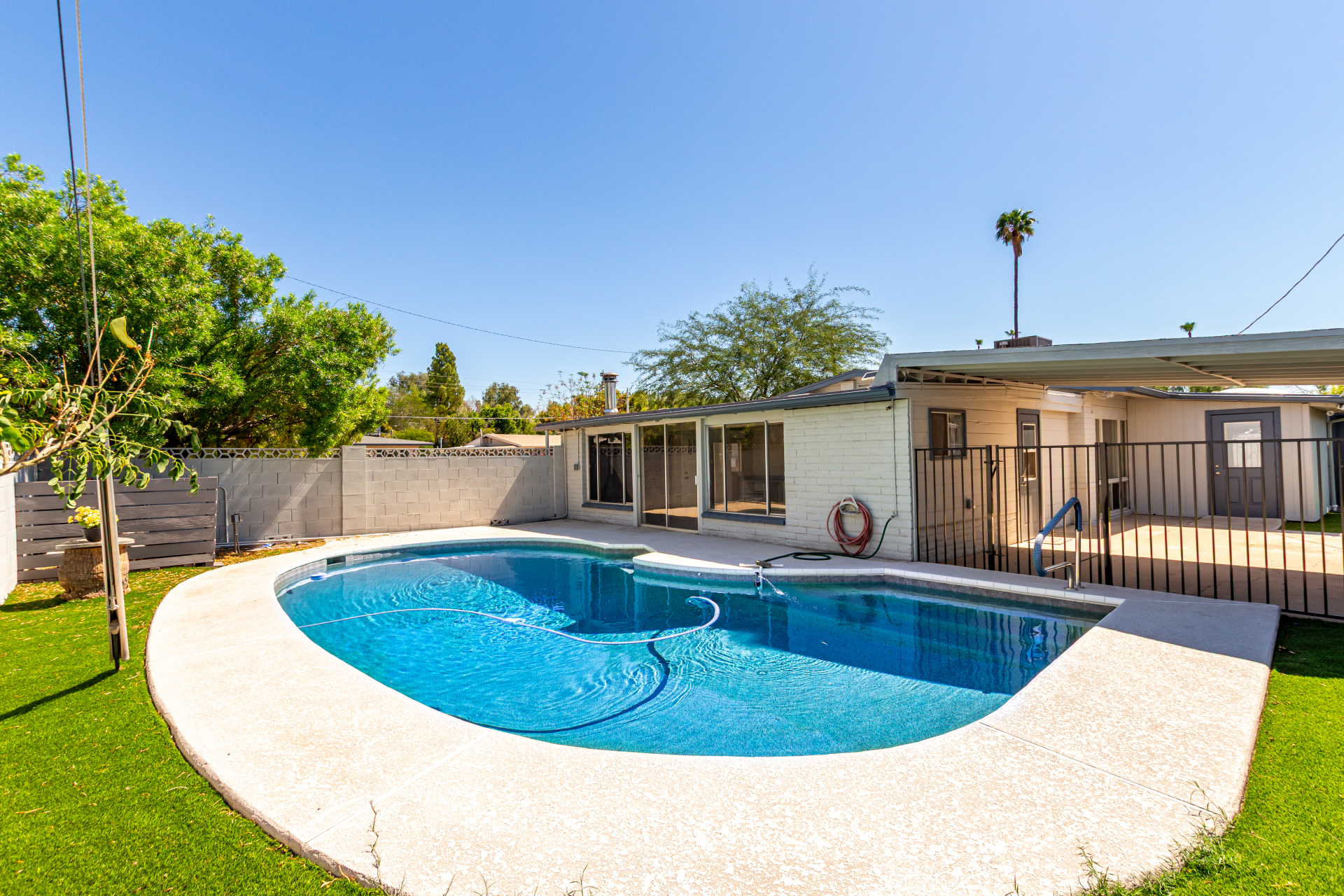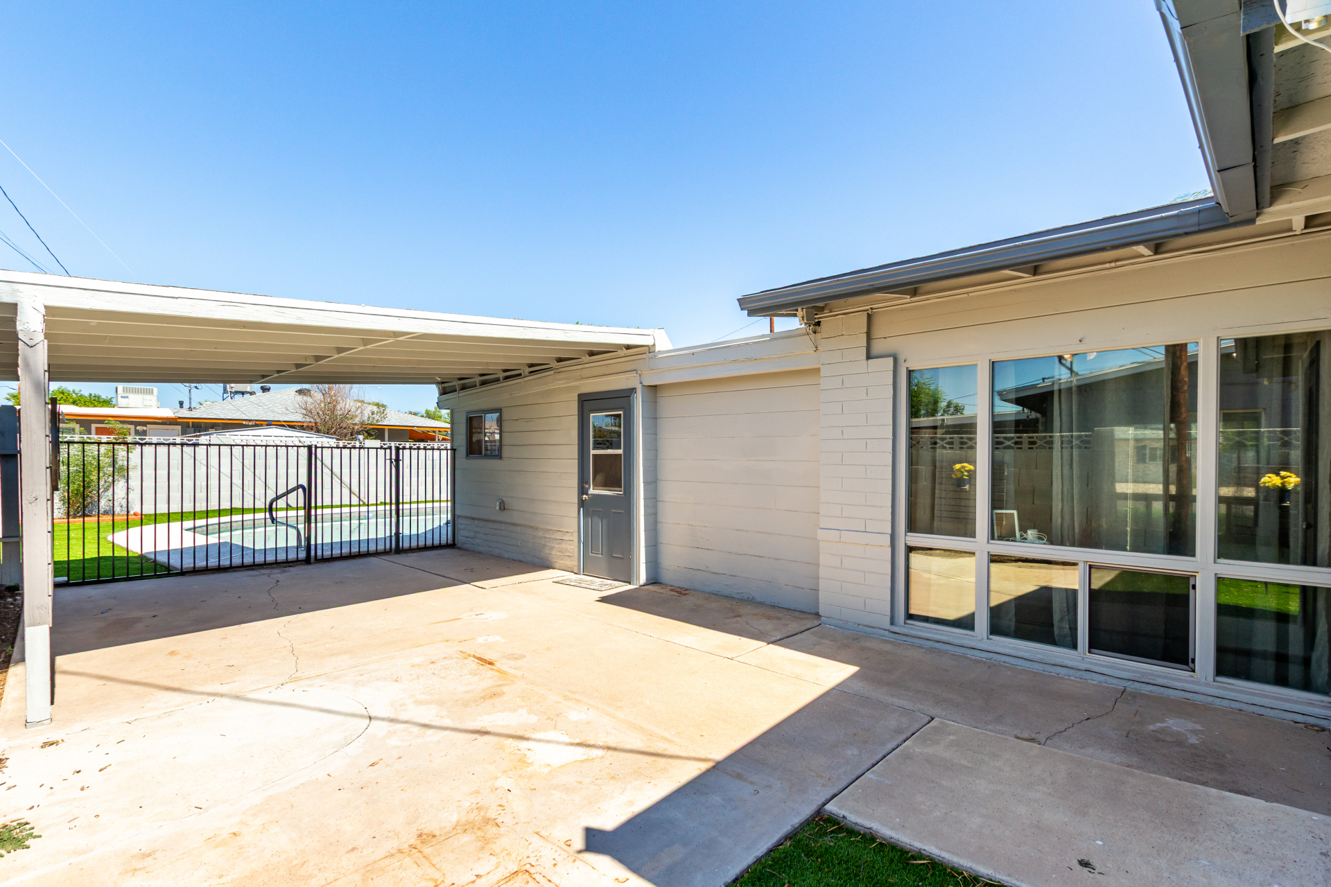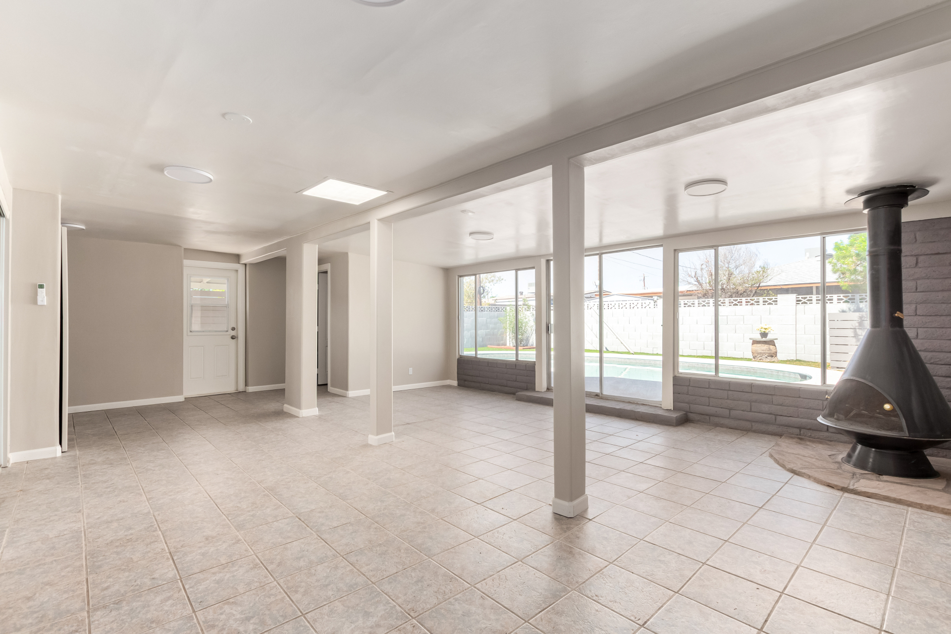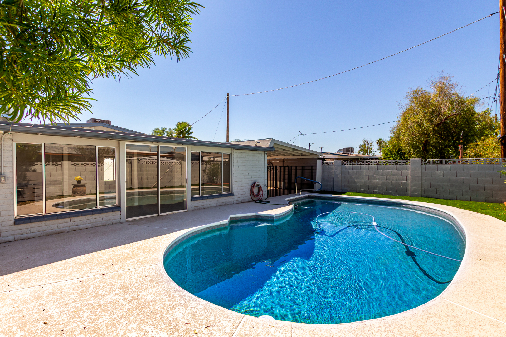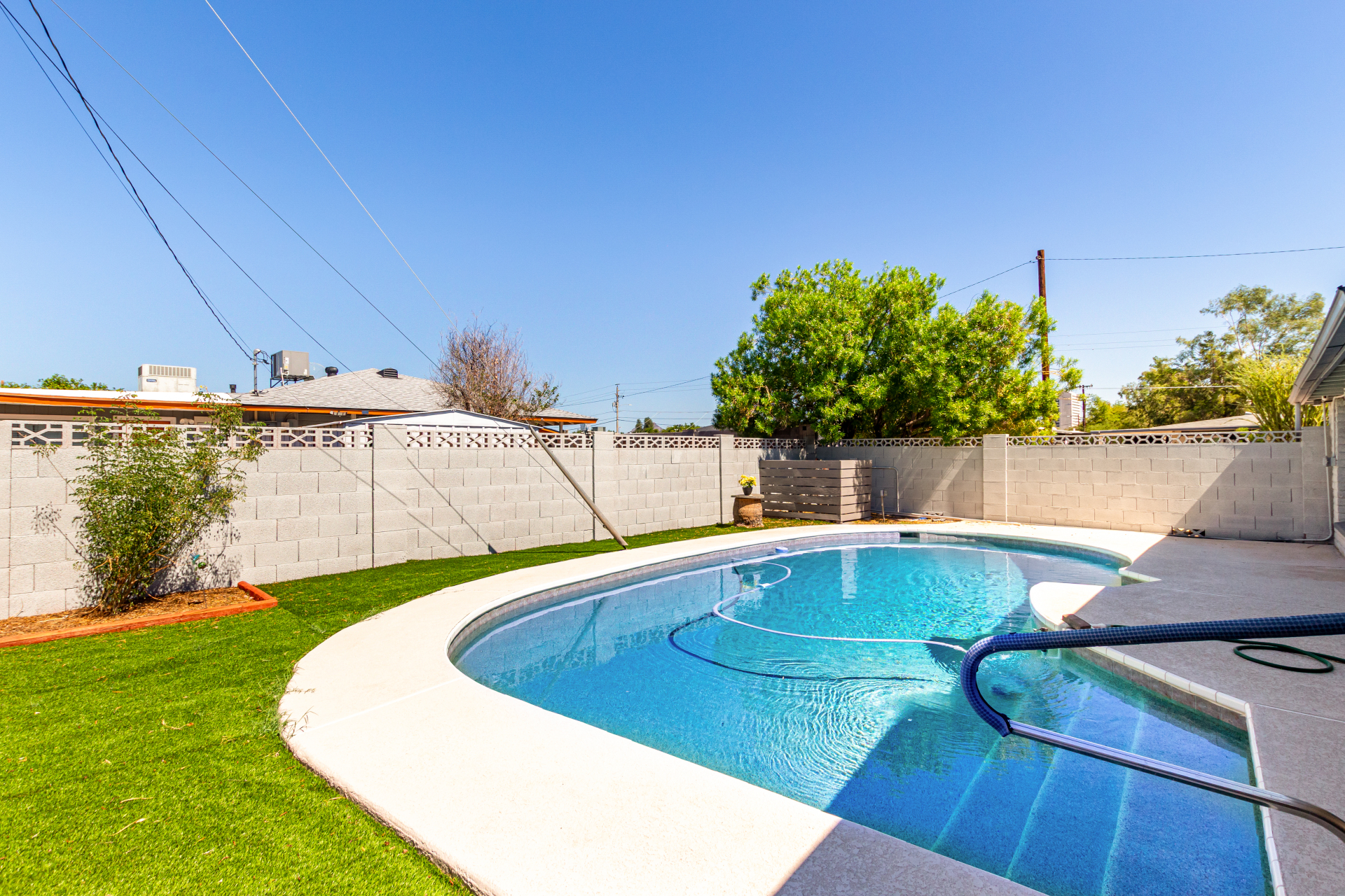 Take advantage of the fantastic opportunity to own this coveted corner lot property! This 3-bedroom home features an inviting living/dining room with a soothing palette and stylish wood-look flooring. The well-appointed kitchen comes with solid surface counters, white shaker cabinets, a handy pantry, and sleek stainless steel appliances. Spend enchanting evenings in the dedicated family room, boasting skylights for ample natural light and a free-standing fireplace for intimate moments. The main bedroom includes double built-in closets, a sitting room, and a private bathroom for added comfort. Spend quiet afternoons in the backyard, complete with a covered patio, pristine artificial turf, and a fenced pool for refreshing dips. Make it yours now!