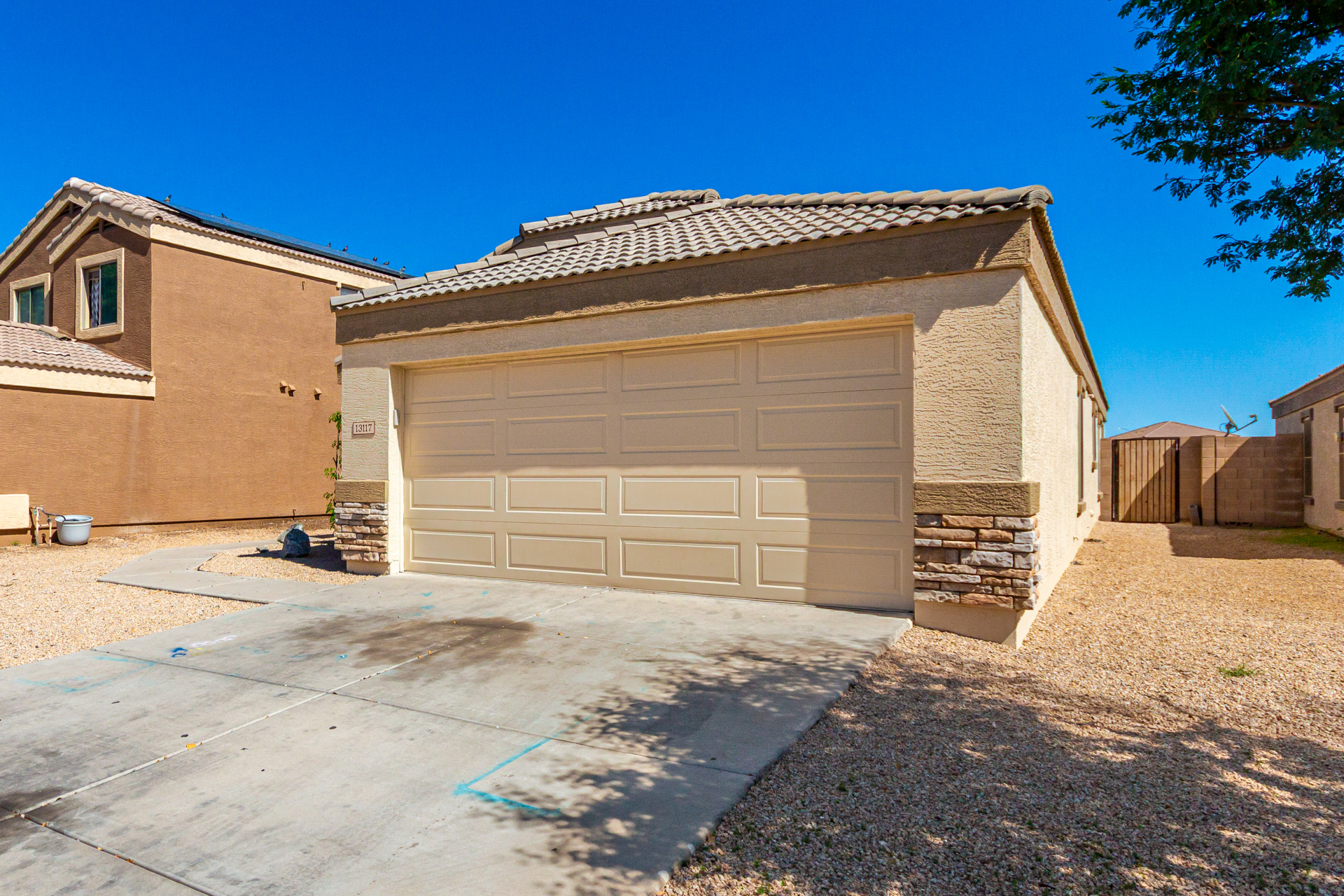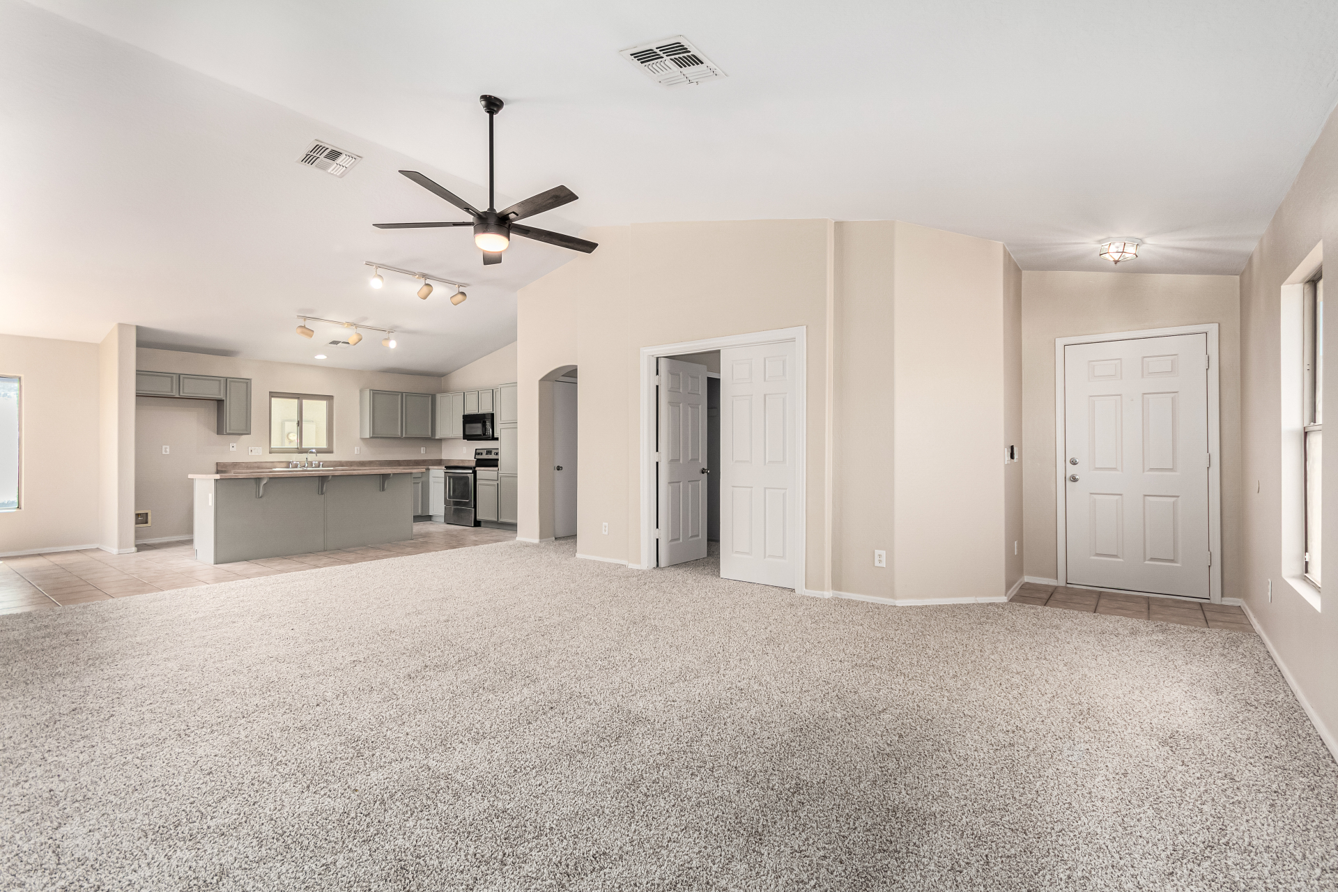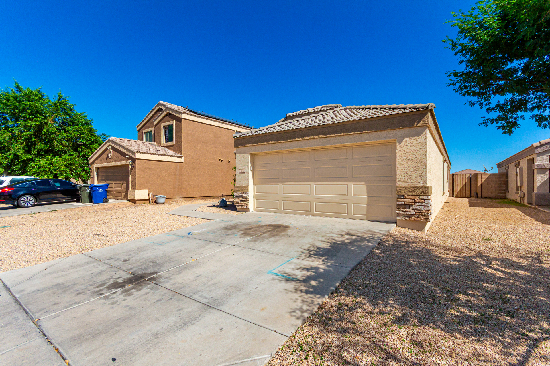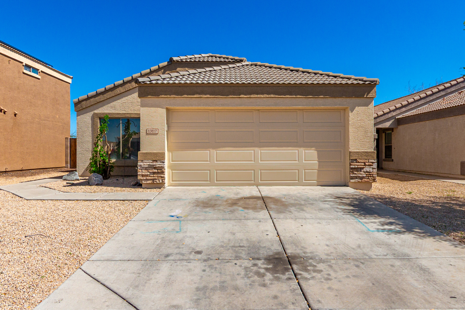 Welcome to this inviting residence! Showcasing a stone-accented façade, 2-car garage with extended driveway, and great curb appeal. Inside, the home features a spacious open layout with 3 bedrooms, 2 bathrooms, vaulted ceilings, neutral paint, and a cozy carpeted living area. A double-door den offers flexibility as a home office or potential 4th bedroom! The kitchen offers an island with breakfast bar, built-in appliances, ample counters, beautiful cabinetry, and track lighting. Split main bedroom ensures privacy with a walk-in closet and a bathroom. Both bathrooms are equipped with grab bars for added convenience and safety! The backyard is designed for relaxation and entertaining, featuring a covered patio, grassy area, and plenty of room for a pool, BBQ, or gazebo. Act now!