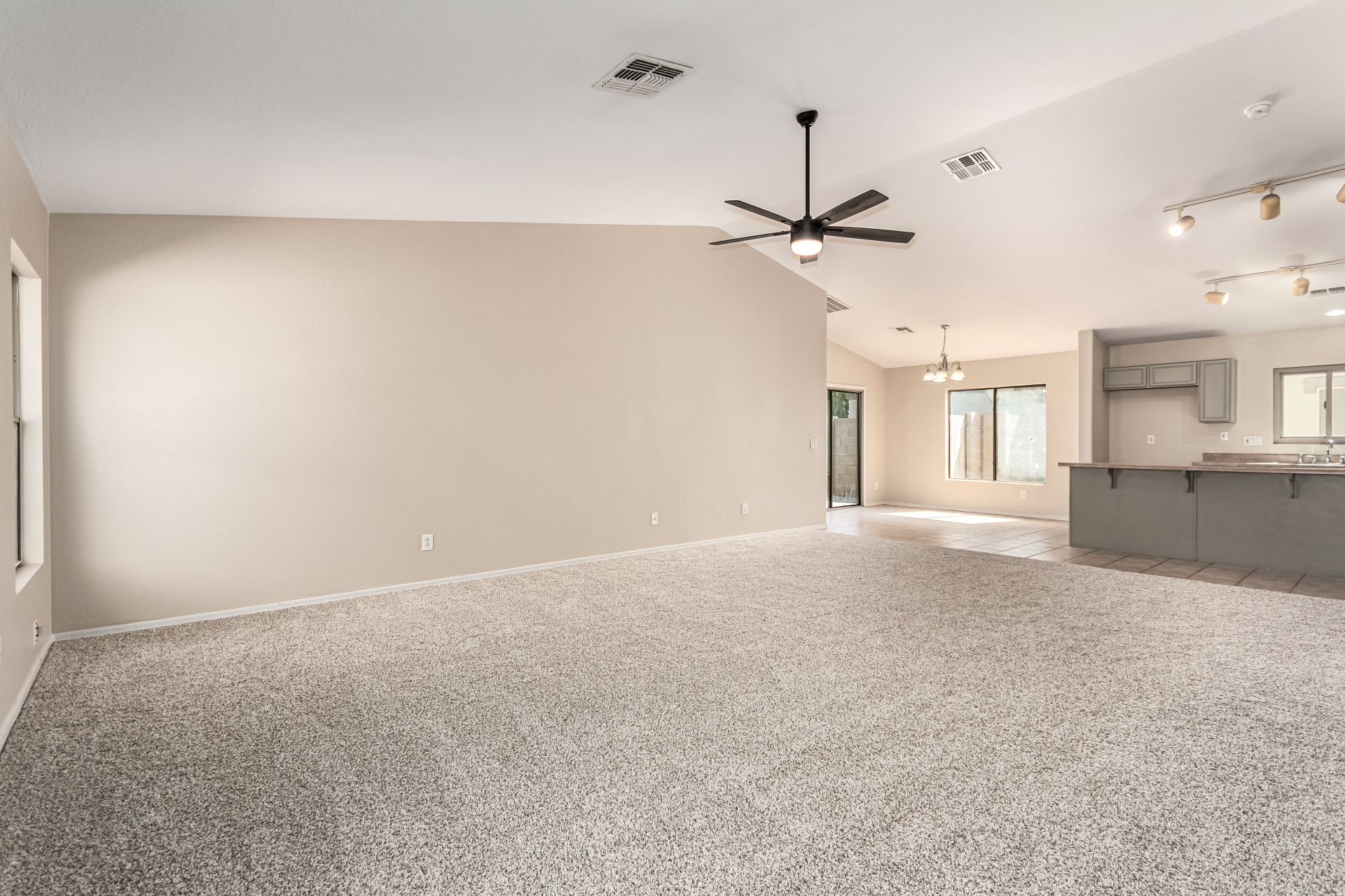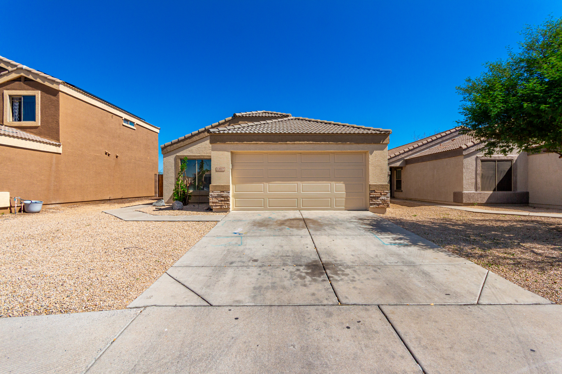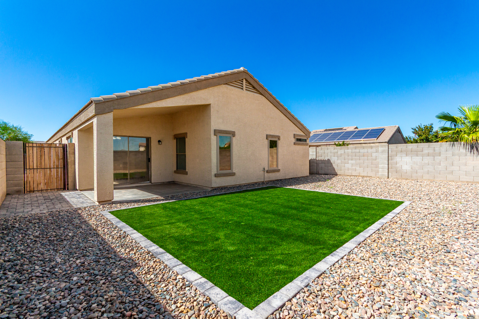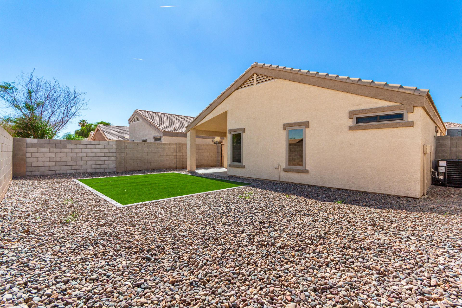 Welcome to this inviting residence! Showcasing a stone-accented façade, 2-car garage with extended driveway, and great curb appeal. Inside, the home features a spacious open layout with 3 bedrooms, 2 bathrooms, vaulted ceilings, neutral paint, and a cozy carpeted living area. A double-door den offers flexibility as a home office or potential 4th bedroom! The kitchen offers an island with breakfast bar, built-in appliances, ample counters, beautiful cabinetry, and track lighting. Split main bedroom ensures privacy with a walk-in closet and a bathroom. Both bathrooms are equipped with grab bars for added convenience and safety! The backyard is designed for relaxation and entertaining, featuring a covered patio, grassy area, and plenty of room for a pool, BBQ, or gazebo. Act now!