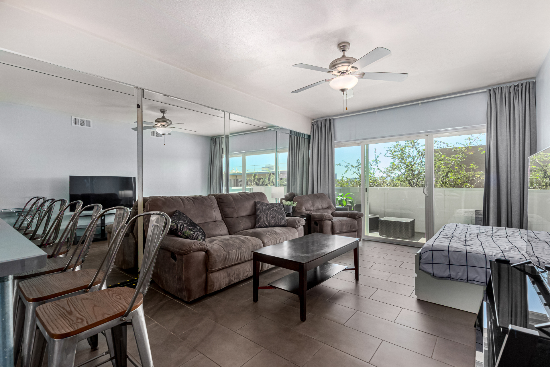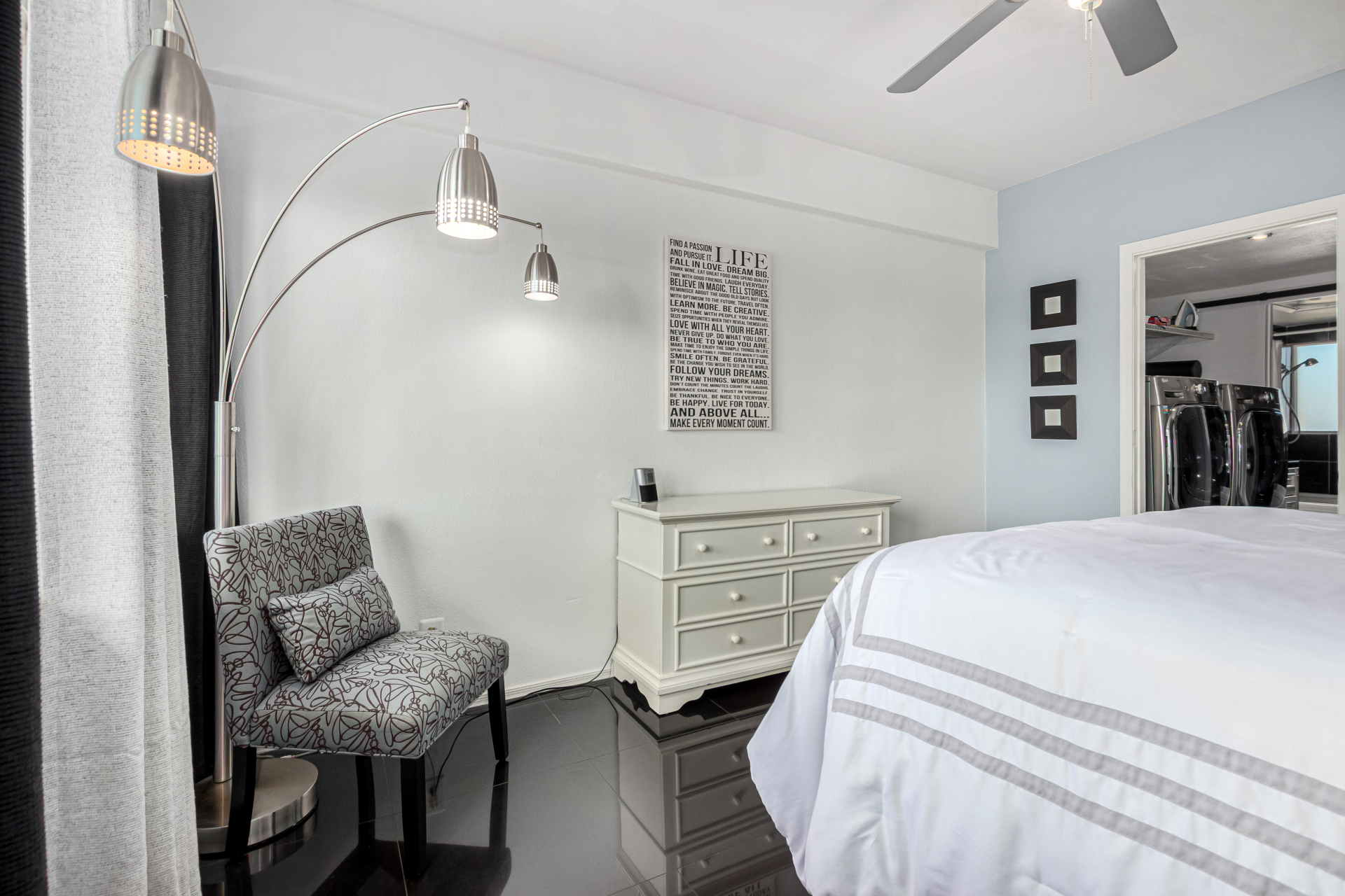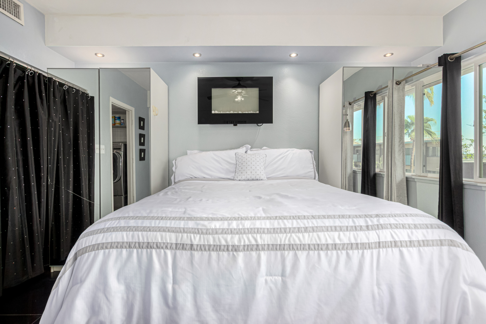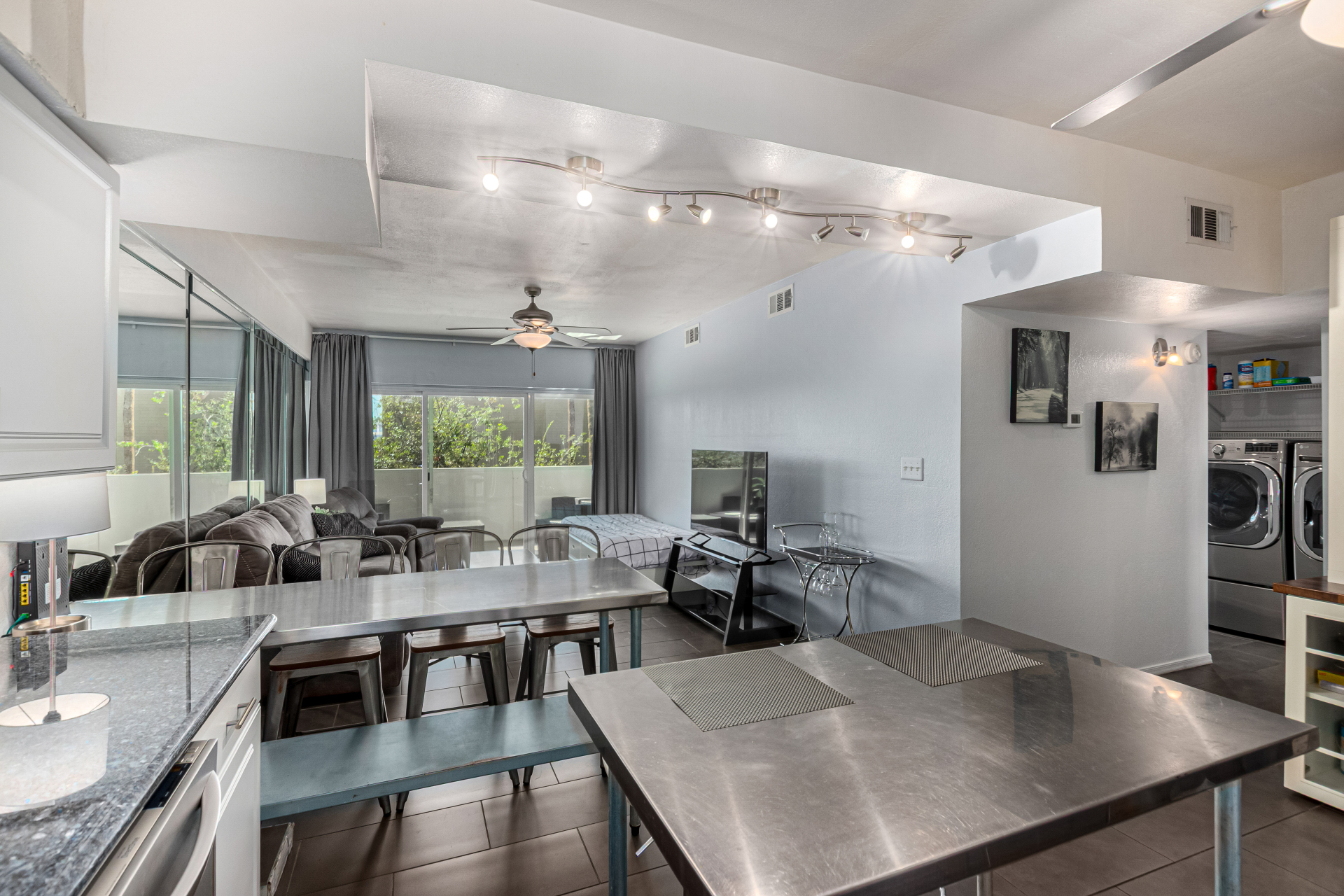 Enjoy easy living in this efficiently designed condo! With its 1 bed, 1 bath, and conveniently located near shopping spots, entertainment, and restaurants, this unit is a gem. Discover an inviting open floor plan enhanced by tile flooring, mirrored walls, multi-sliding glass doors that open to the balcony, ceiling fans throughout, abundant natural light, and neutral paint, creating a warm and welcoming atmosphere. The kitchen comes with mosaic tile backsplash, plenty of cabinet space, stainless steel appliances, granite counters, and track lighting. The sizable bedroom promises a good rest after a busy day. PLUS! A washer and dryer are included. Spend quiet afternoons on the cozy balcony or take a plunge in the Community pool. Don't miss the chance to own this turn-key abode! Hurry!