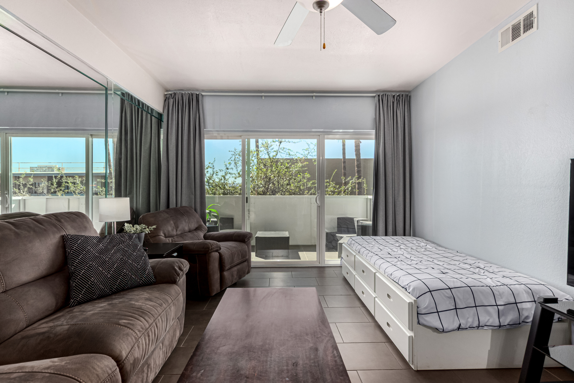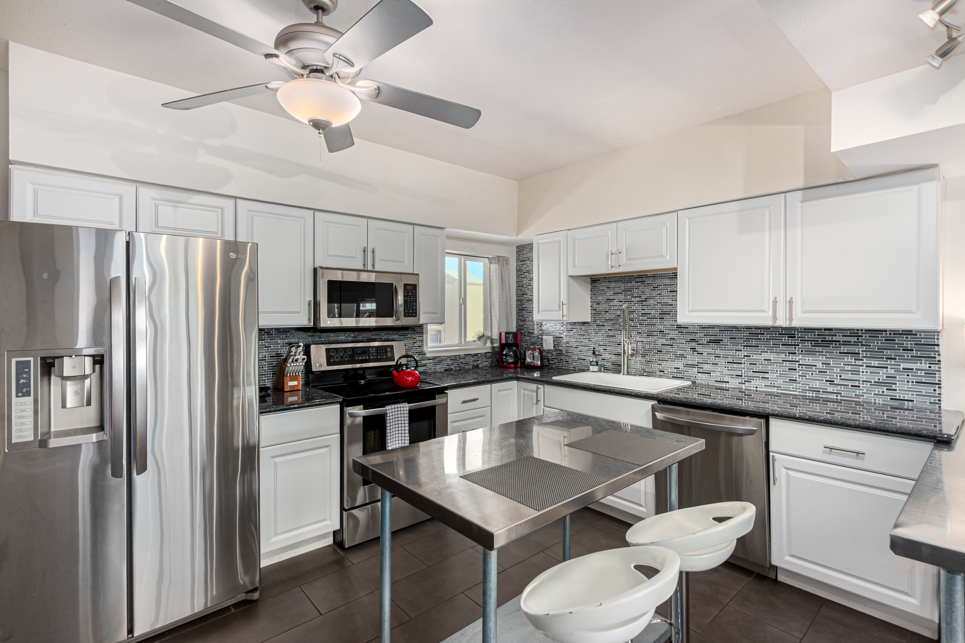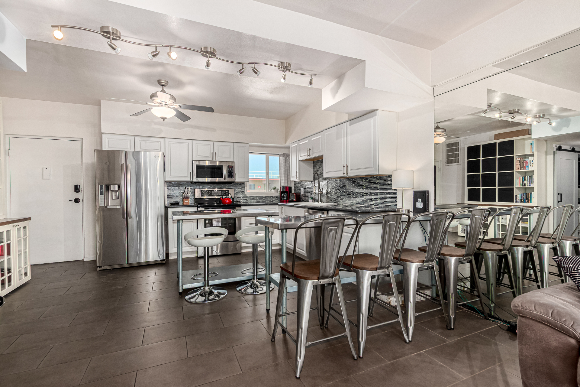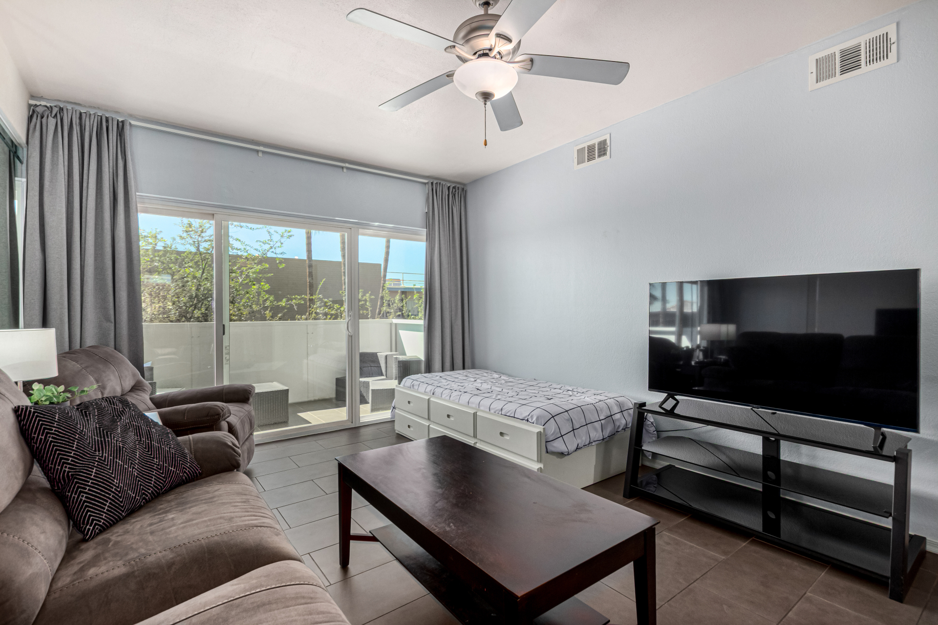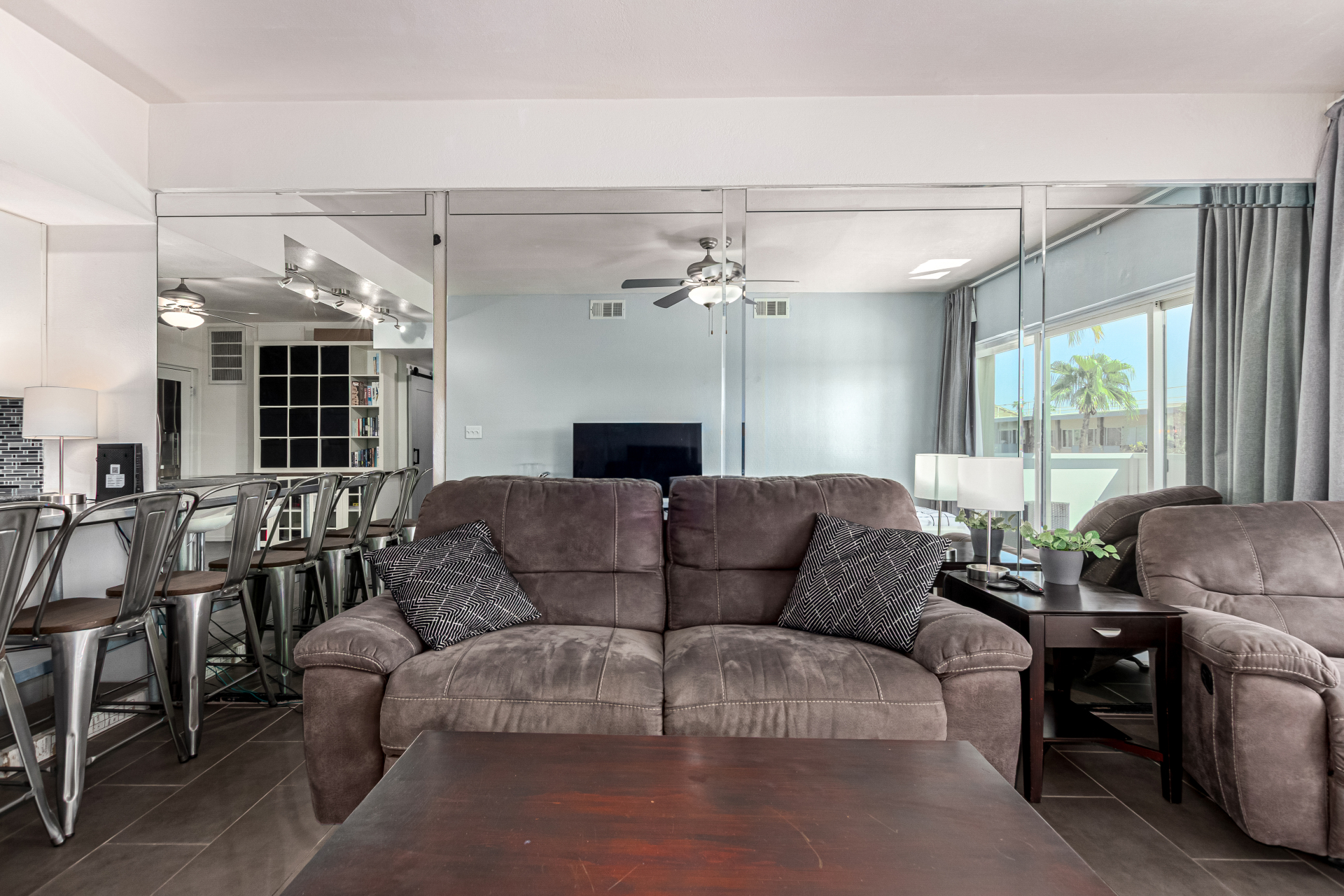 Enjoy easy living in this efficiently designed condo! With its 1 bed, 1 bath, and conveniently located near shopping spots, entertainment, and restaurants, this unit is a gem. Discover an inviting open floor plan enhanced by tile flooring, mirrored walls, multi-sliding glass doors that open to the balcony, ceiling fans throughout, abundant natural light, and neutral paint, creating a warm and welcoming atmosphere. The kitchen comes with mosaic tile backsplash, plenty of cabinet space, stainless steel appliances, granite counters, and track lighting. The sizable bedroom promises a good rest after a busy day. PLUS! A washer and dryer are included. Spend quiet afternoons on the cozy balcony or take a plunge in the Community pool. Don't miss the chance to own this turn-key abode! Hurry!