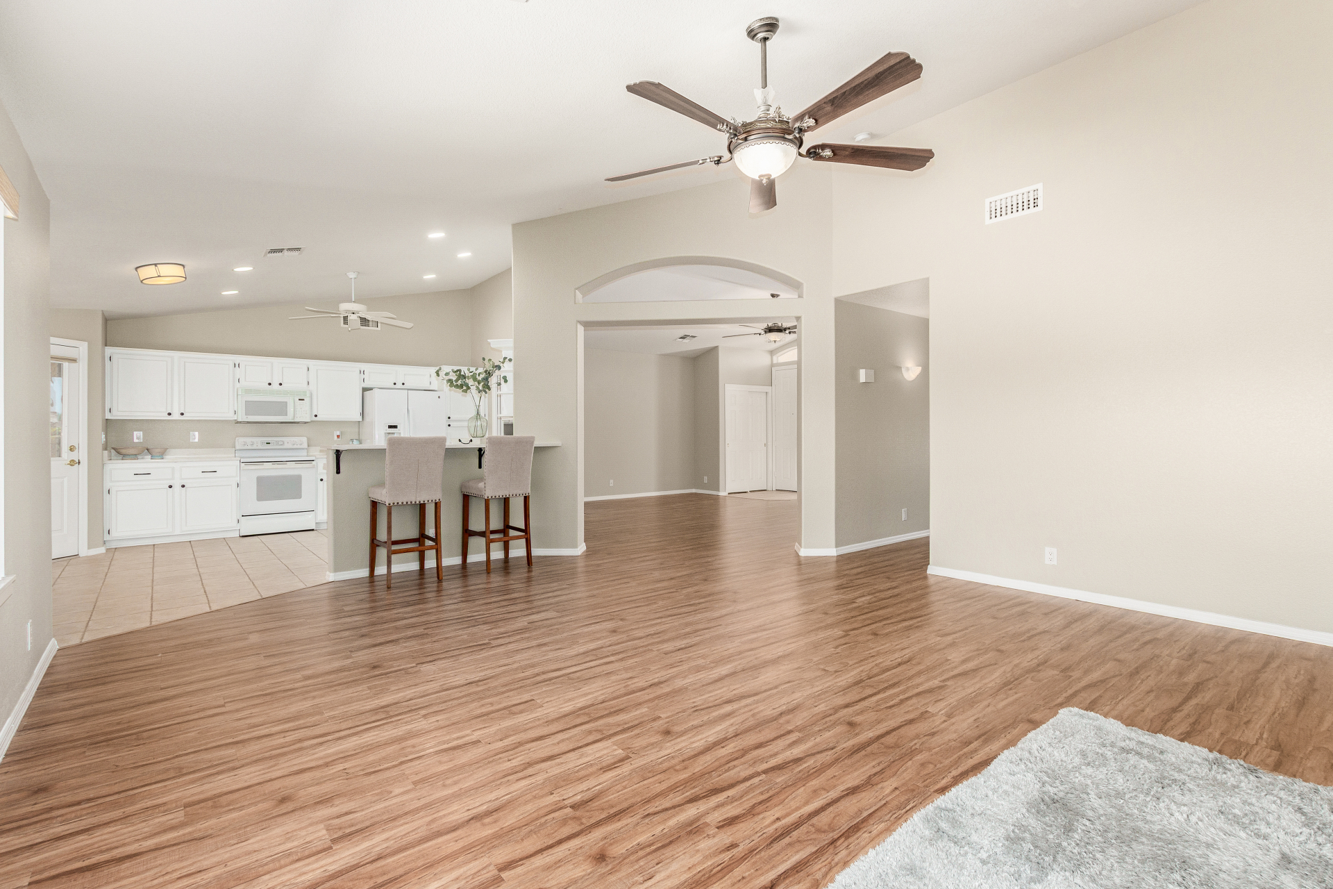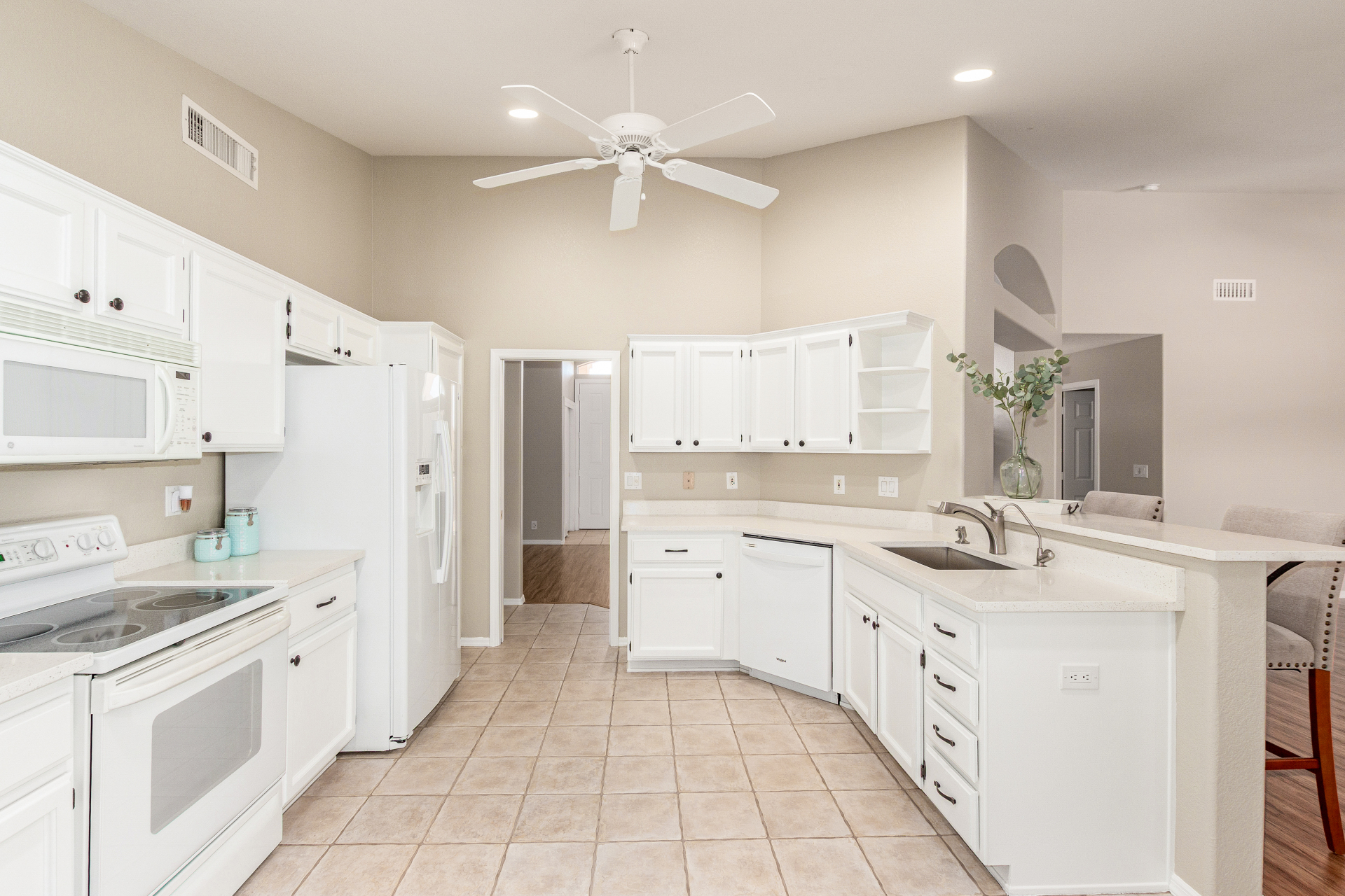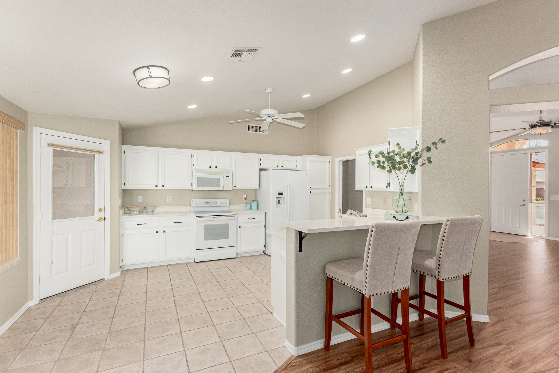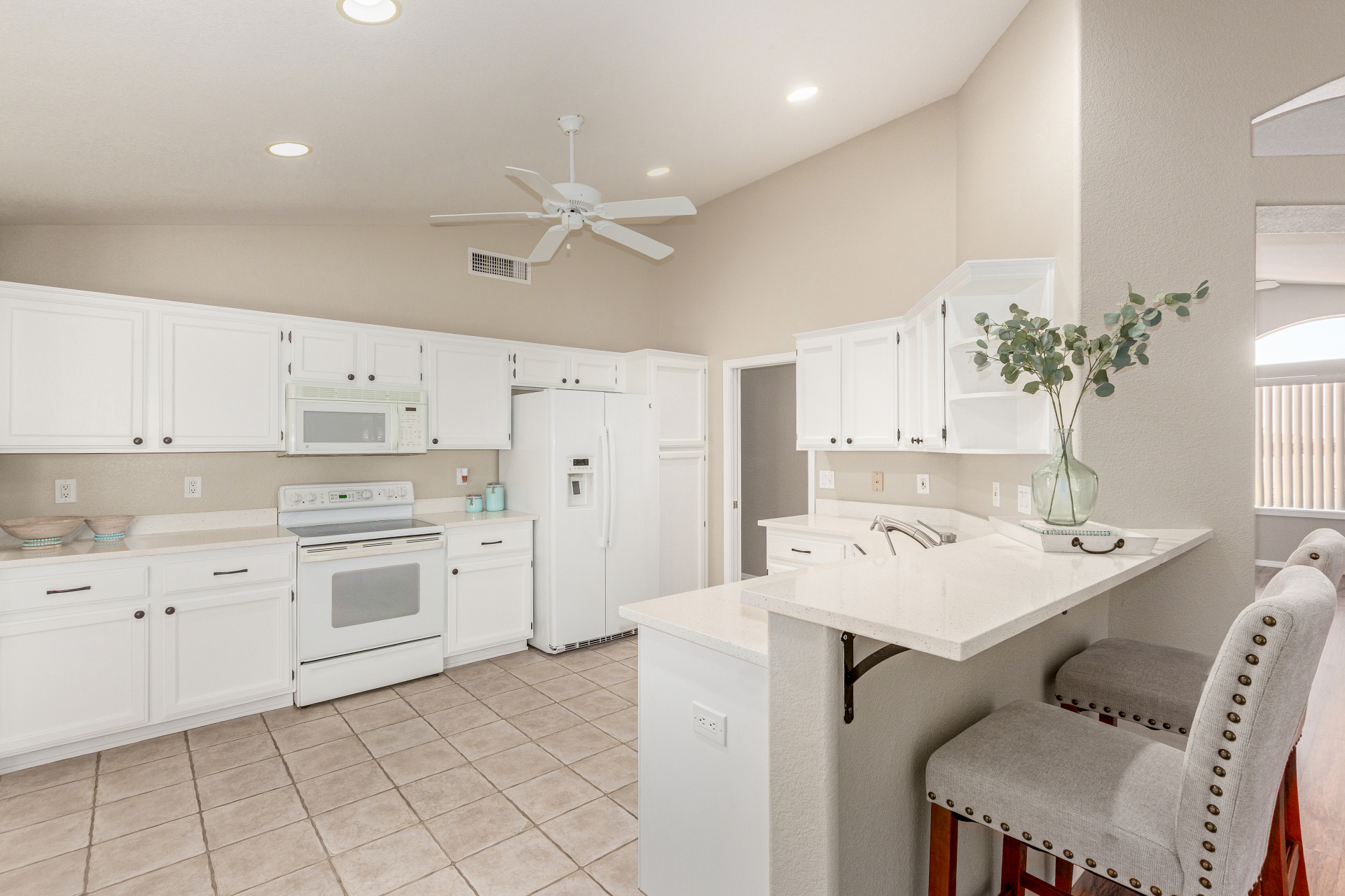 Prepare to be amazed by this absolute beauty, this fabulous home showcases! Upgraded interior boasts clean lines that promote a modern feel, enhanced by fresh paint, a blend of wood-look & tile flooring, ceiling fans, and vaulted ceilings. Entertain guests in the inviting living room and large great room filled with lots of natural light. The kitchen comes with recessed lighting, abundant white cabinets, built-in appliances, quartz counters, and a two-tier breakfast bar. Head to the main retreat, offering a private ensuite with dual sinks, soaking tub, and a walk-in closet. Enjoy the golf course view from the serene backyard, complete with a covered patio. Community amenities elevate your lifestyle with tennis courts, clubhouse, swimming pool, spa, and more. Act now before it's gone!
