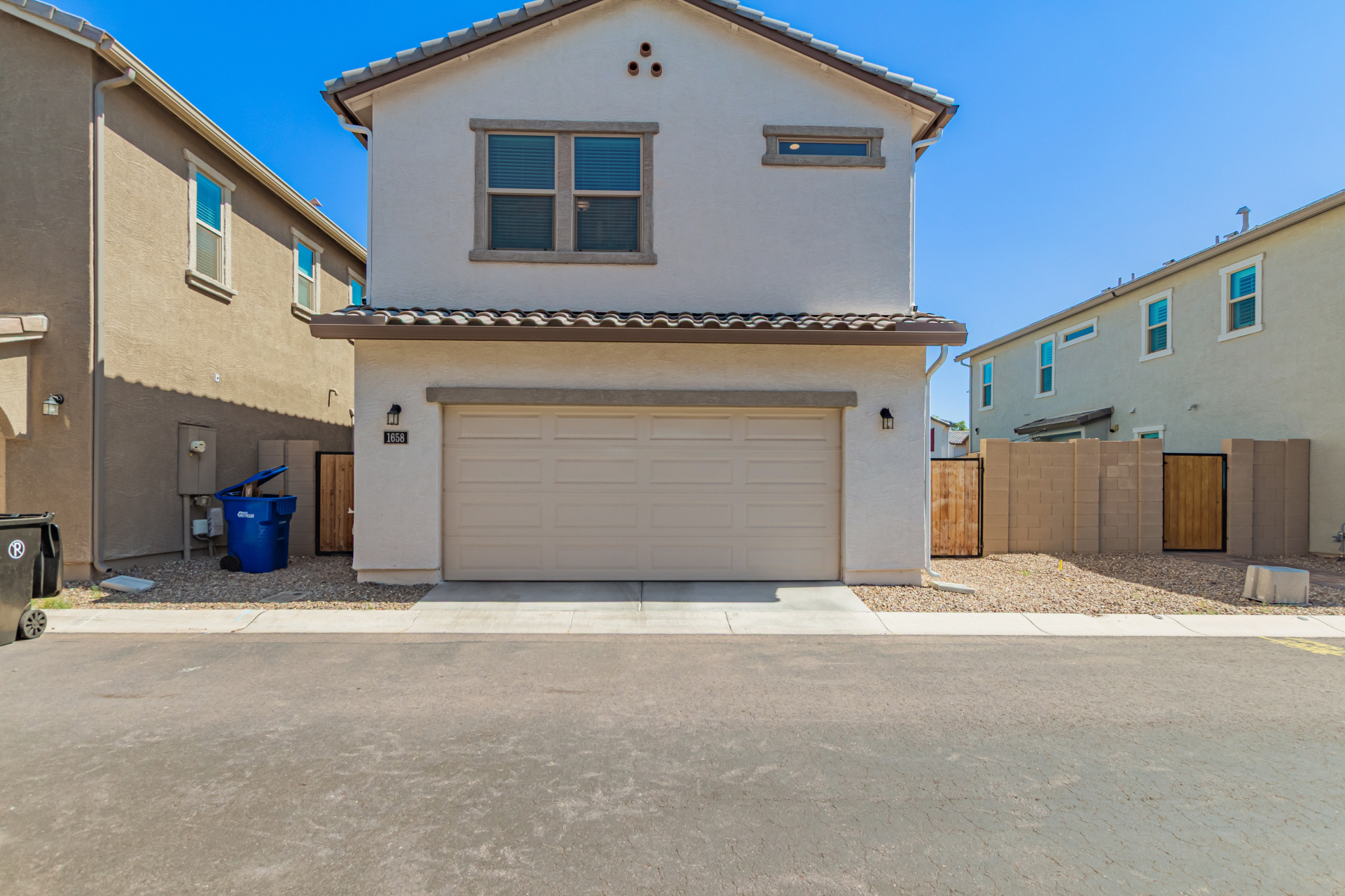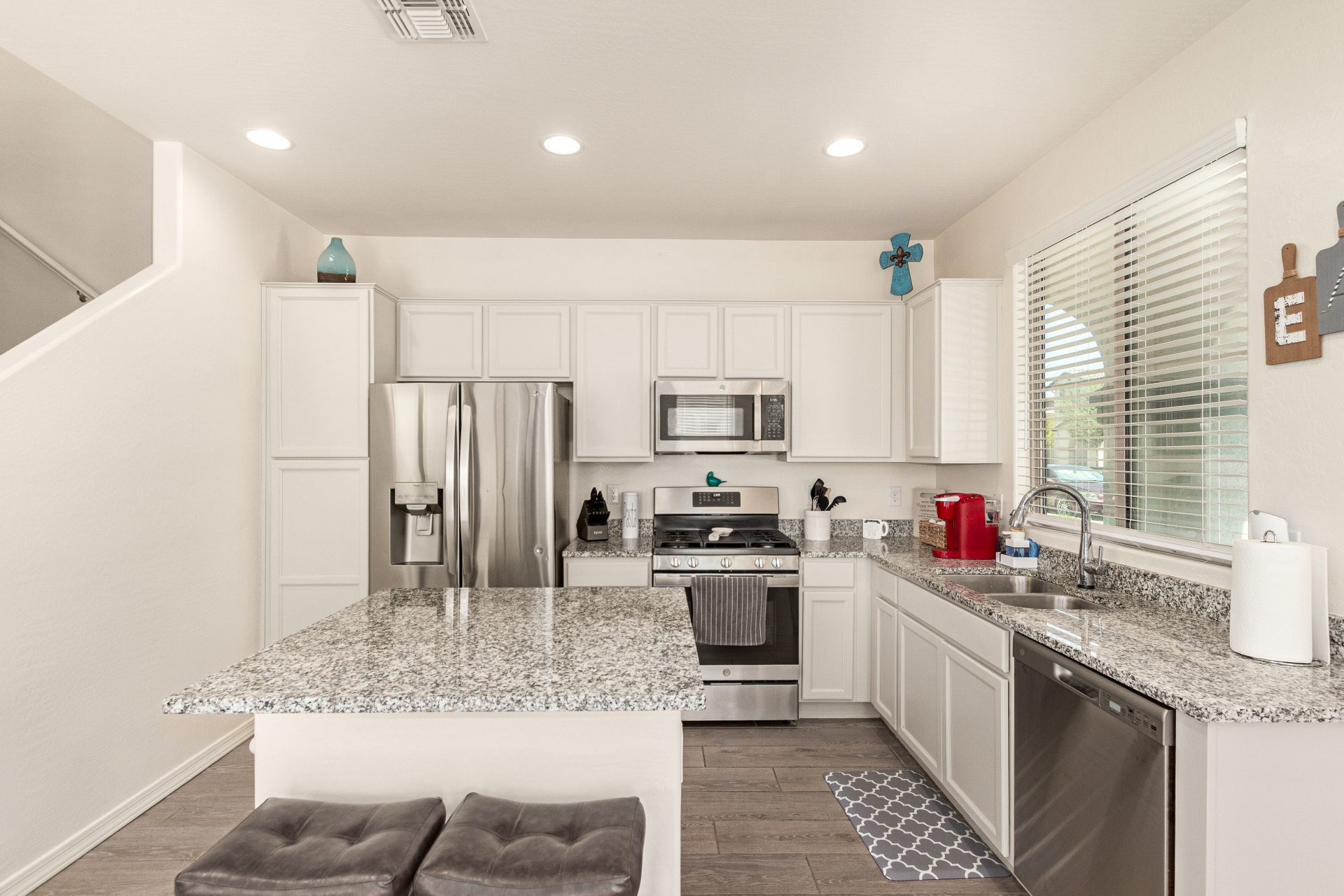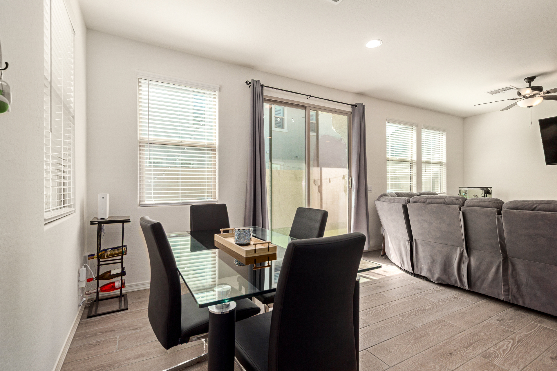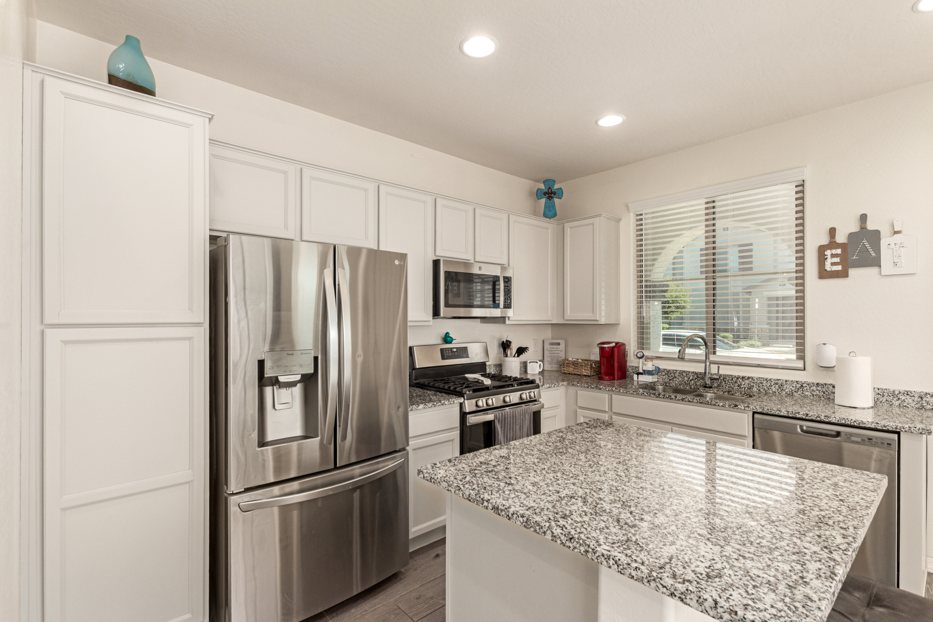 You don't want to miss this lovely two-story home in Heritage Crossing! Discover all the charm inside, featuring wood-look flooring, tons of natural light, sliding doors to the patio, and stylish neutral tones. Whip up your favorite meals in the pristine culinary space, equipped with white cabinetry, granite countertops, stainless steel appliances, and an island with a breakfast bar, for those casual conversations over quick meals. The main bedroom is a true retreat, adding extra comfort with carpeting underfoot, a walk-in closet, and a bathroom with double sinks. Enjoy delicious BBQ with your loved ones in the patio, complete with a lush lawn and a seating area with pavers, perfect for entertaining. Visit the community's pool, walking path, and playground for fun times! Welcome home!