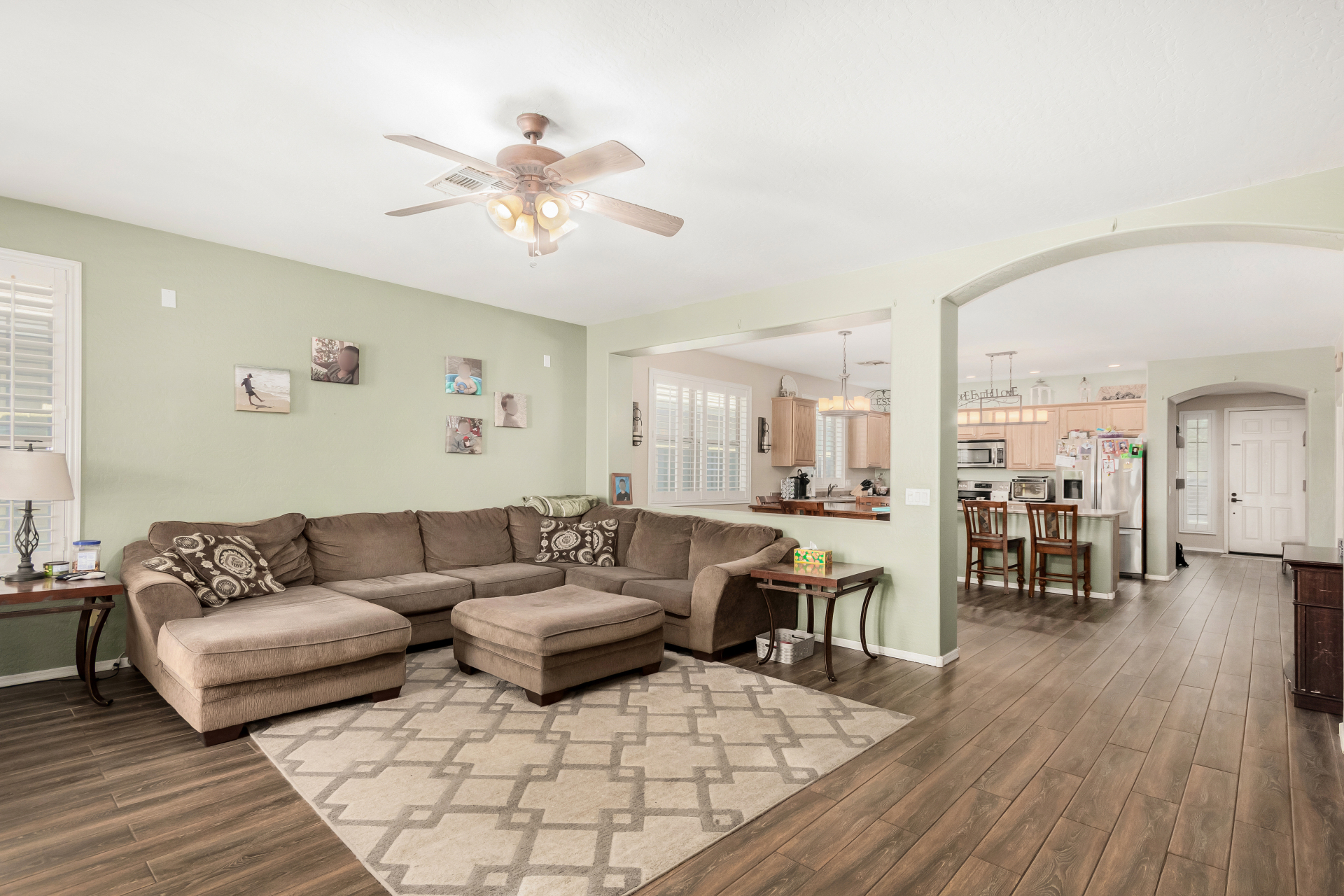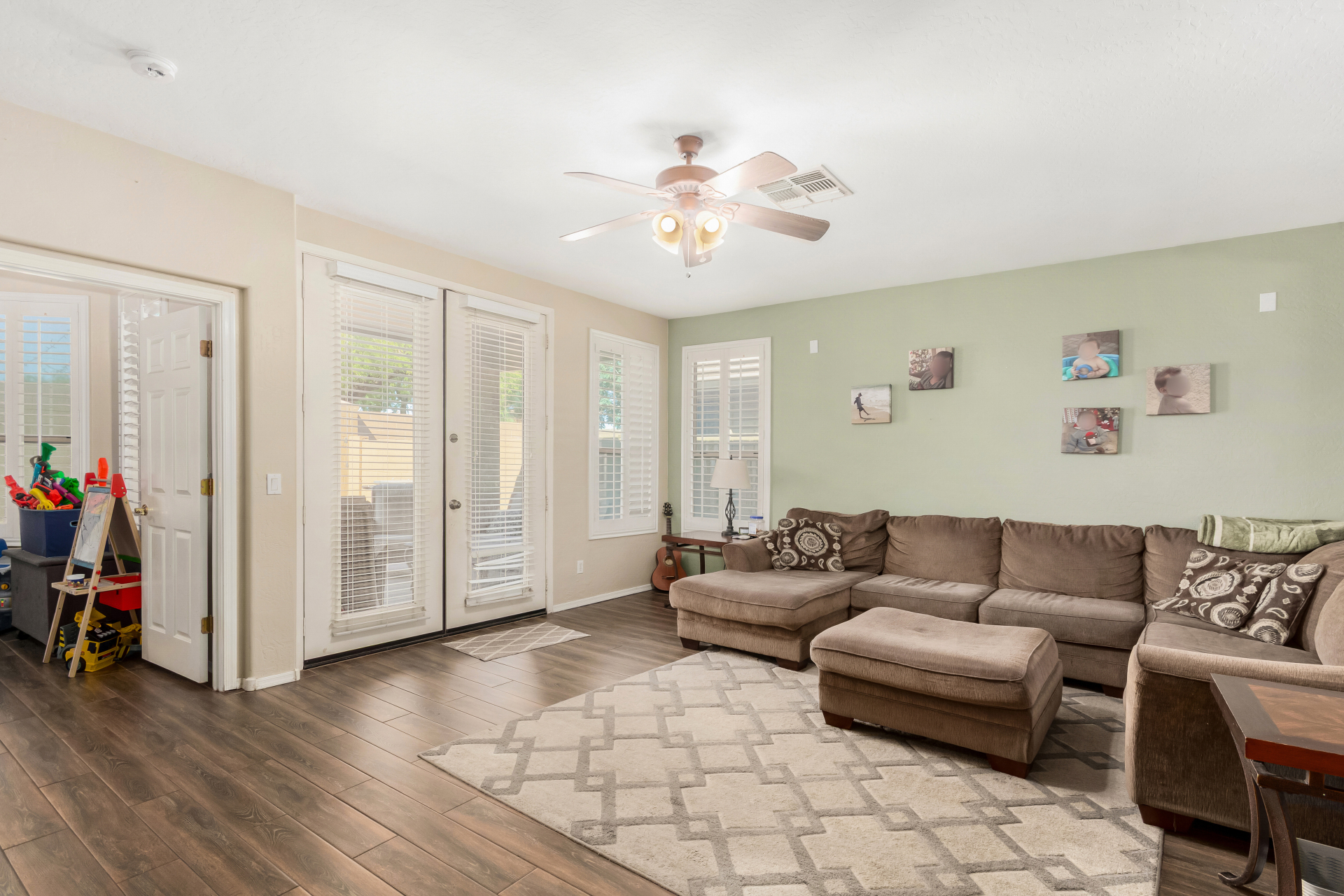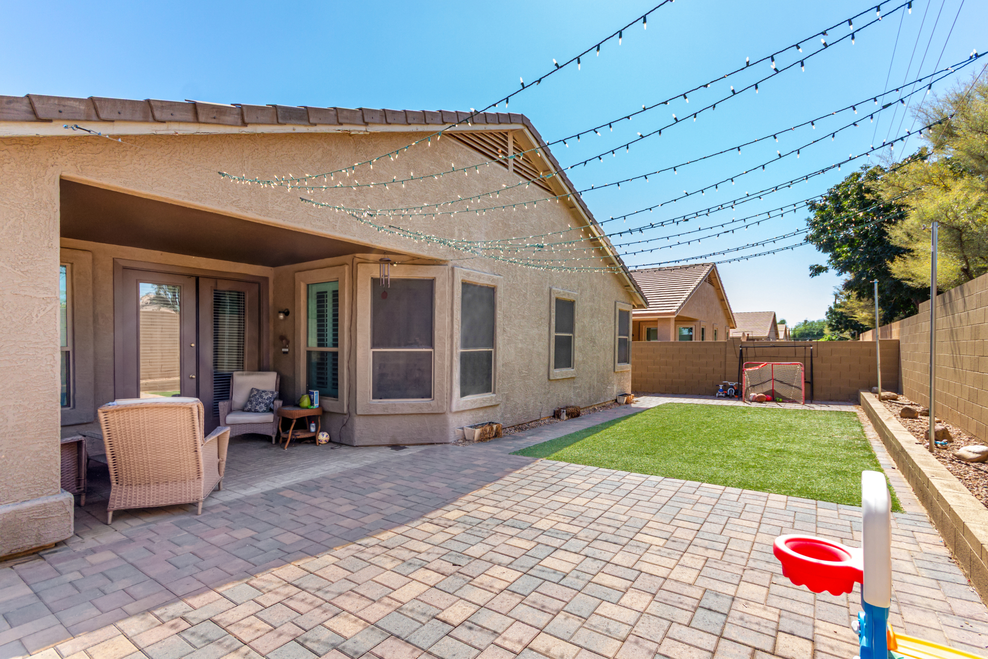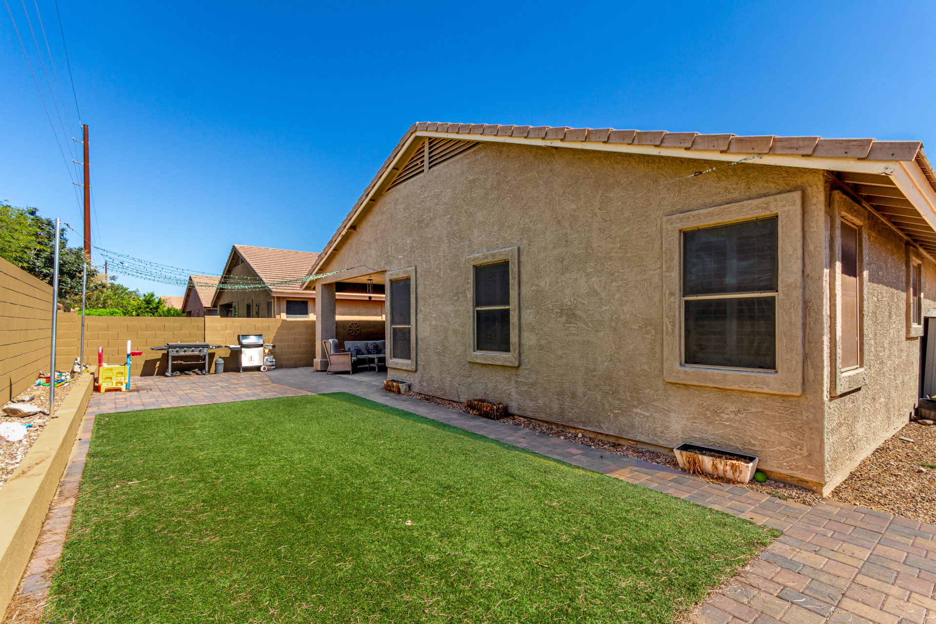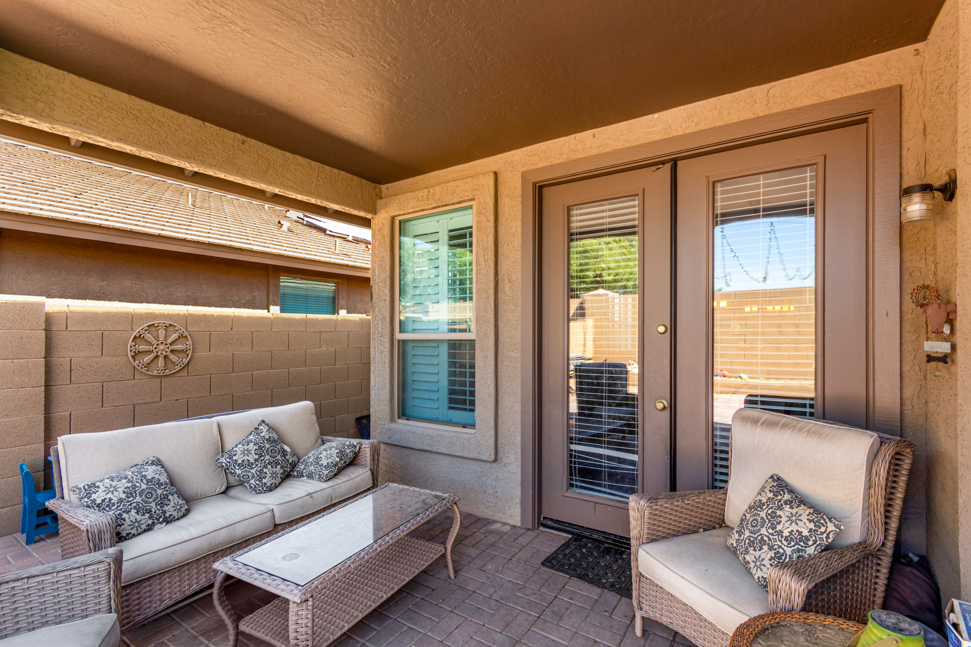 Spacious single-level home 3 bedrooms, 2 bathrooms, bonus room, 2 Car Garage in Dove Valley Ranch! A paver courtyard entrance leads to the front door. The inviting interior features tons of natural light, plantation shutters, designer paint, and wood-look tile flooring w/carpet in all the right places. You'll love the welcoming living room paired with French doors to the back! The eat-in kitchen boasts SS appliances, ample wood cabinetry, a pantry, recessed & pendant lights, and an island w/breakfast bar. Versatile den for an office or extra bedroom as well! Enter the primary bedroom to find an ensuite with dual sinks, a separate tub/shower, & a walk-in closet. The private backyard, with artificial turf & extended paver-covered patio is the ideal spot to relax or enjoy BBQ. Make it yours!