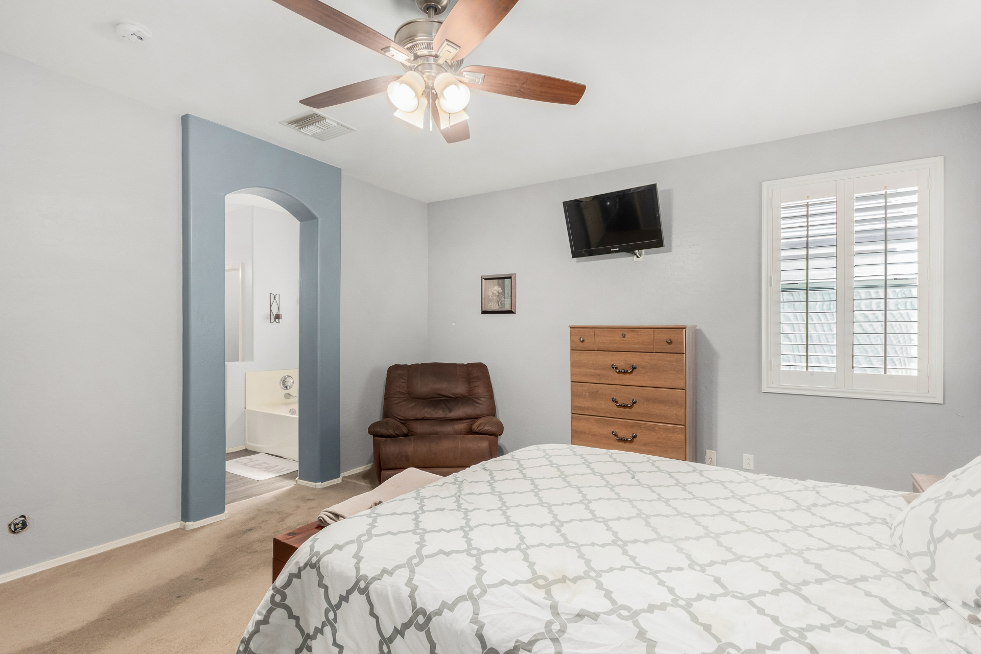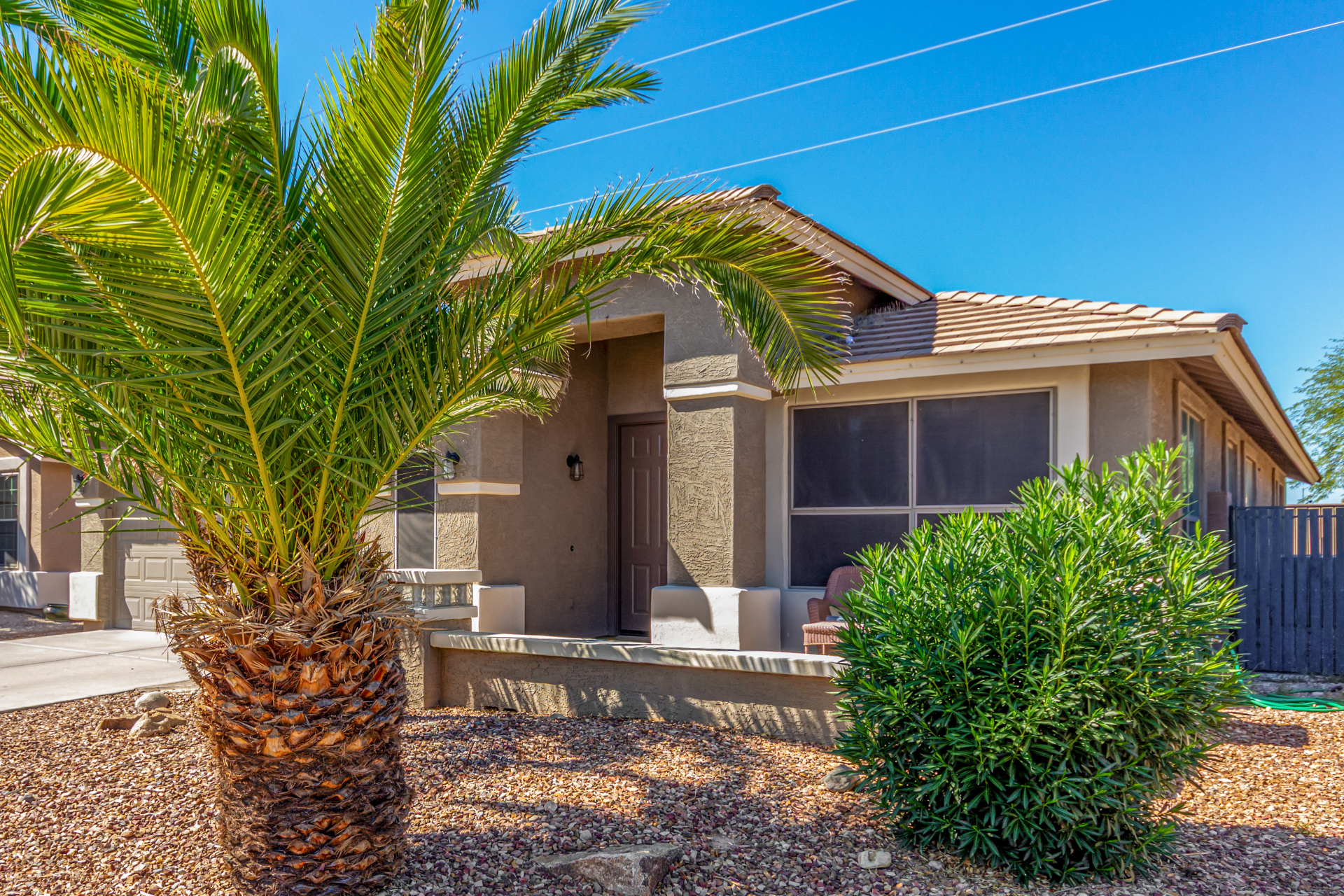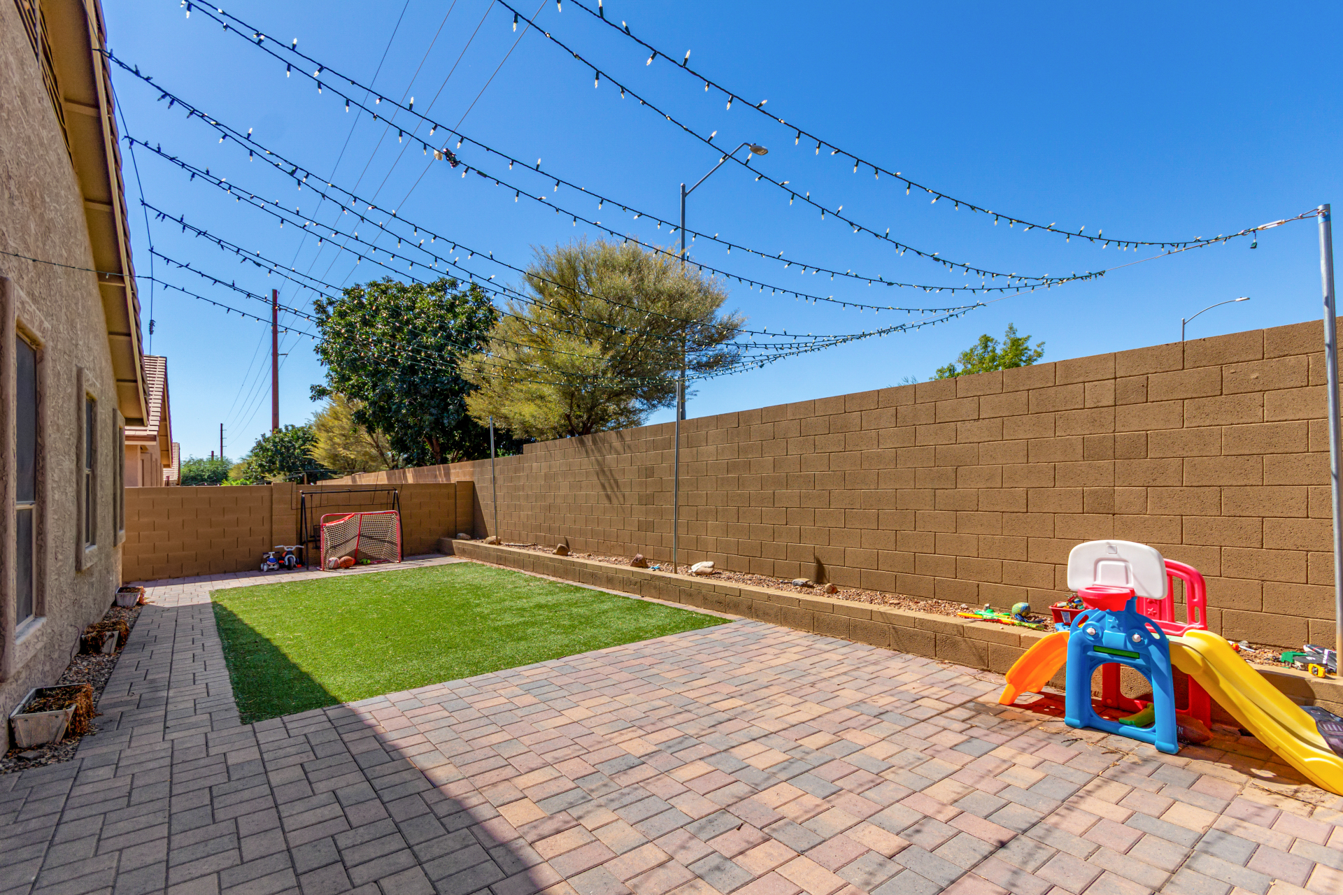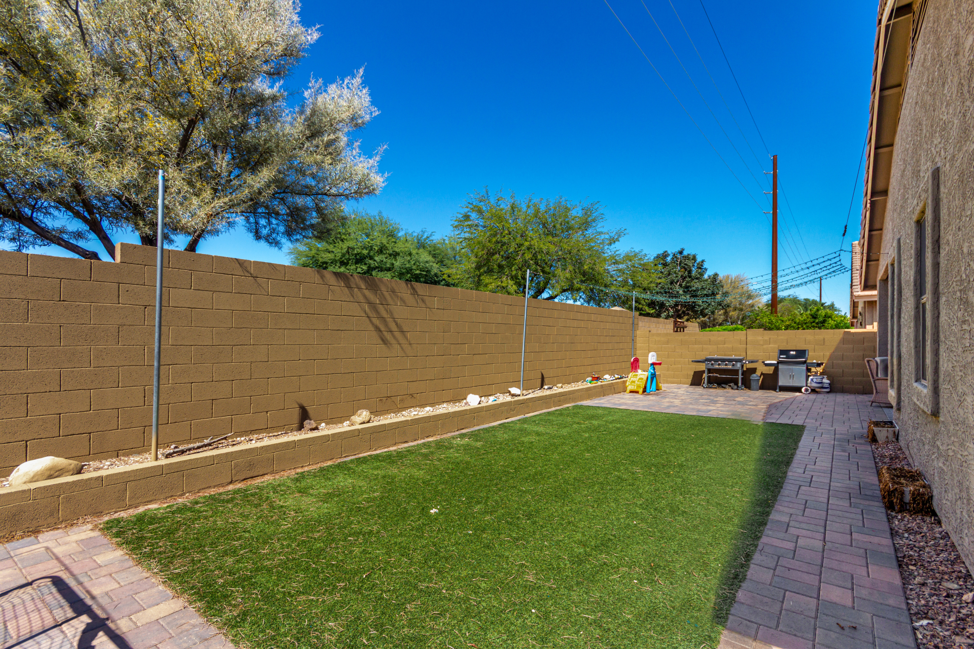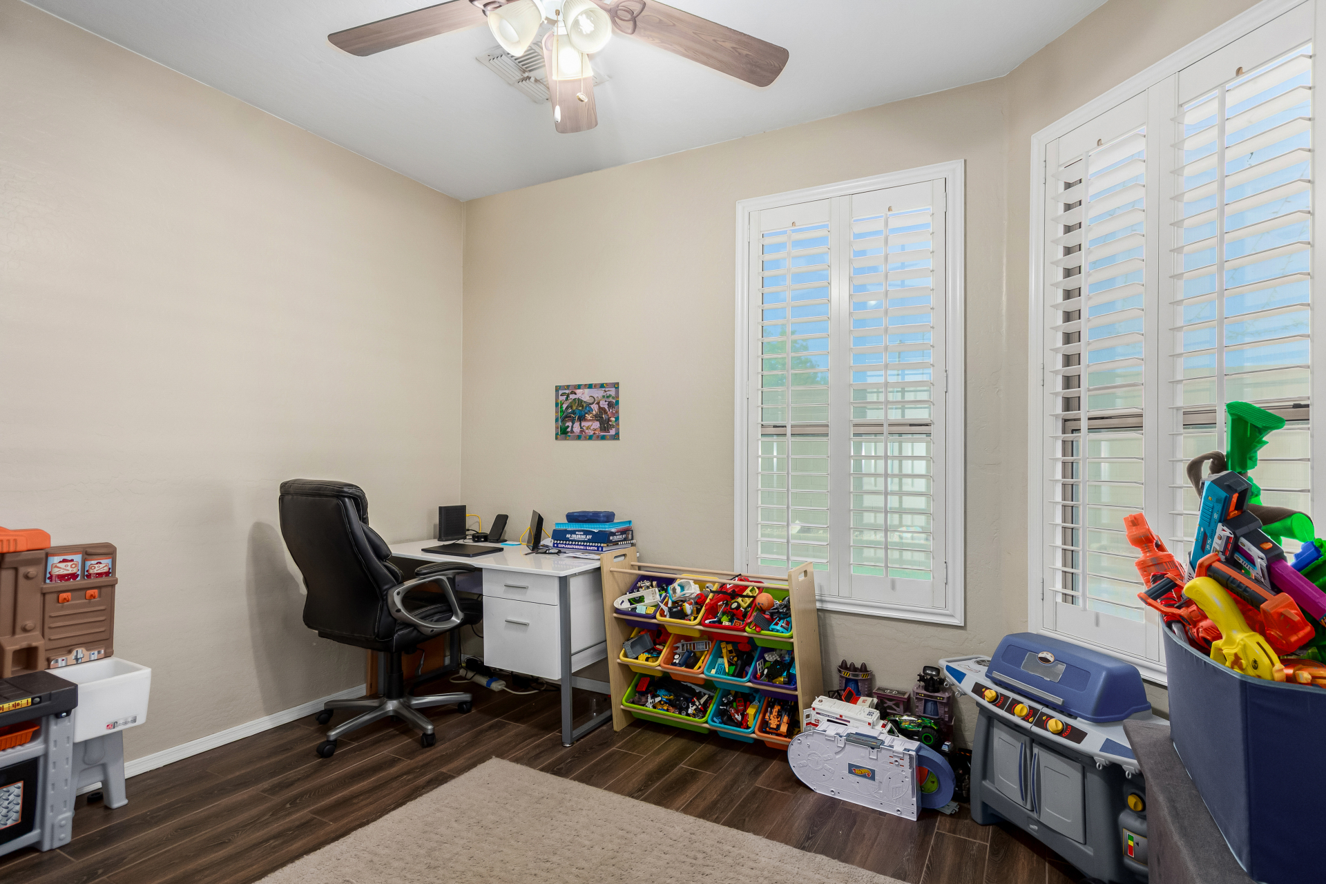 Spacious single-level home 3 bedrooms, 2 bathrooms, bonus room, 2 Car Garage in Dove Valley Ranch! A paver courtyard entrance leads to the front door. The inviting interior features tons of natural light, plantation shutters, designer paint, and wood-look tile flooring w/carpet in all the right places. You'll love the welcoming living room paired with French doors to the back! The eat-in kitchen boasts SS appliances, ample wood cabinetry, a pantry, recessed & pendant lights, and an island w/breakfast bar. Versatile den for an office or extra bedroom as well! Enter the primary bedroom to find an ensuite with dual sinks, a separate tub/shower, & a walk-in closet. The private backyard, with artificial turf & extended paver-covered patio is the ideal spot to relax or enjoy BBQ. Make it yours!
