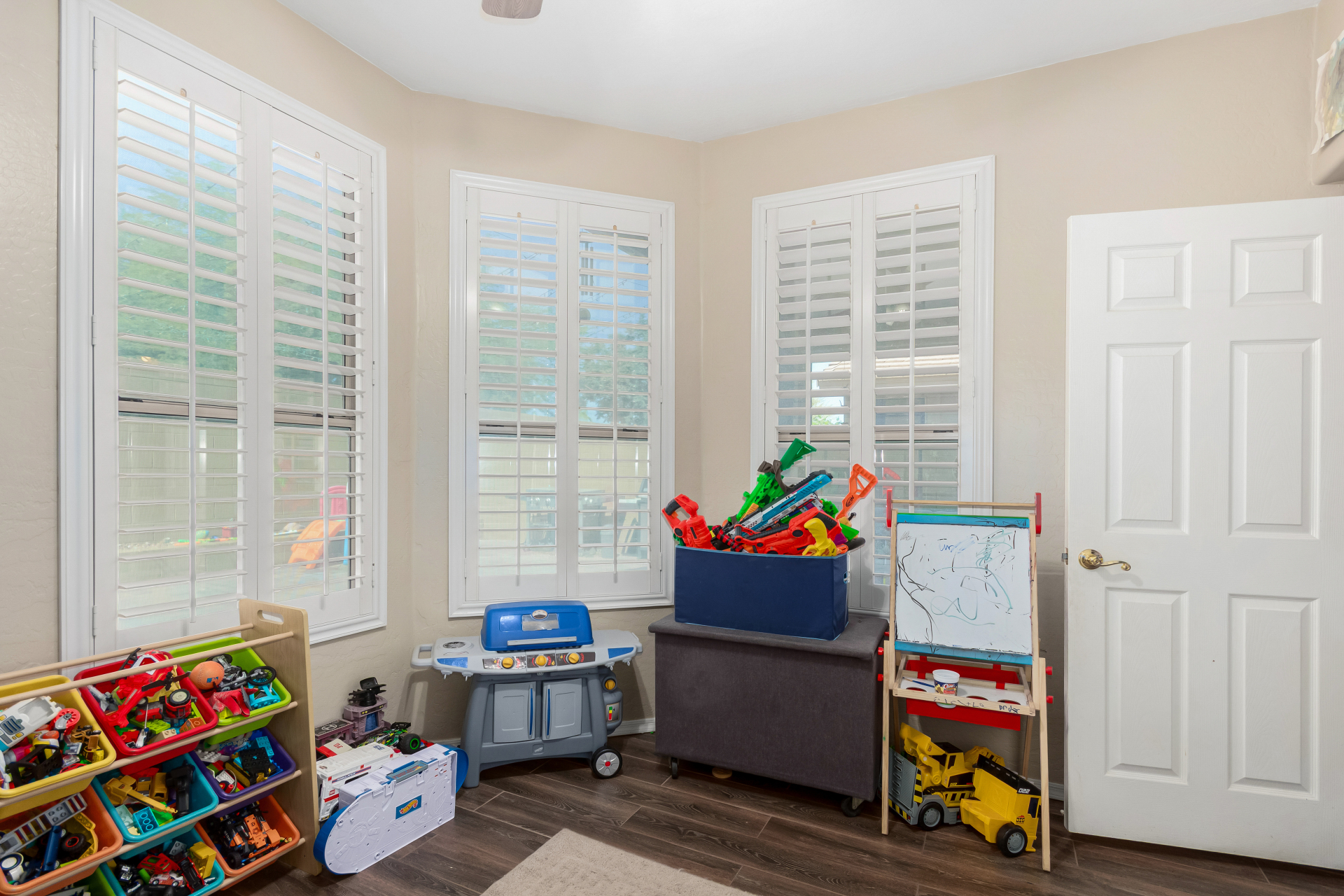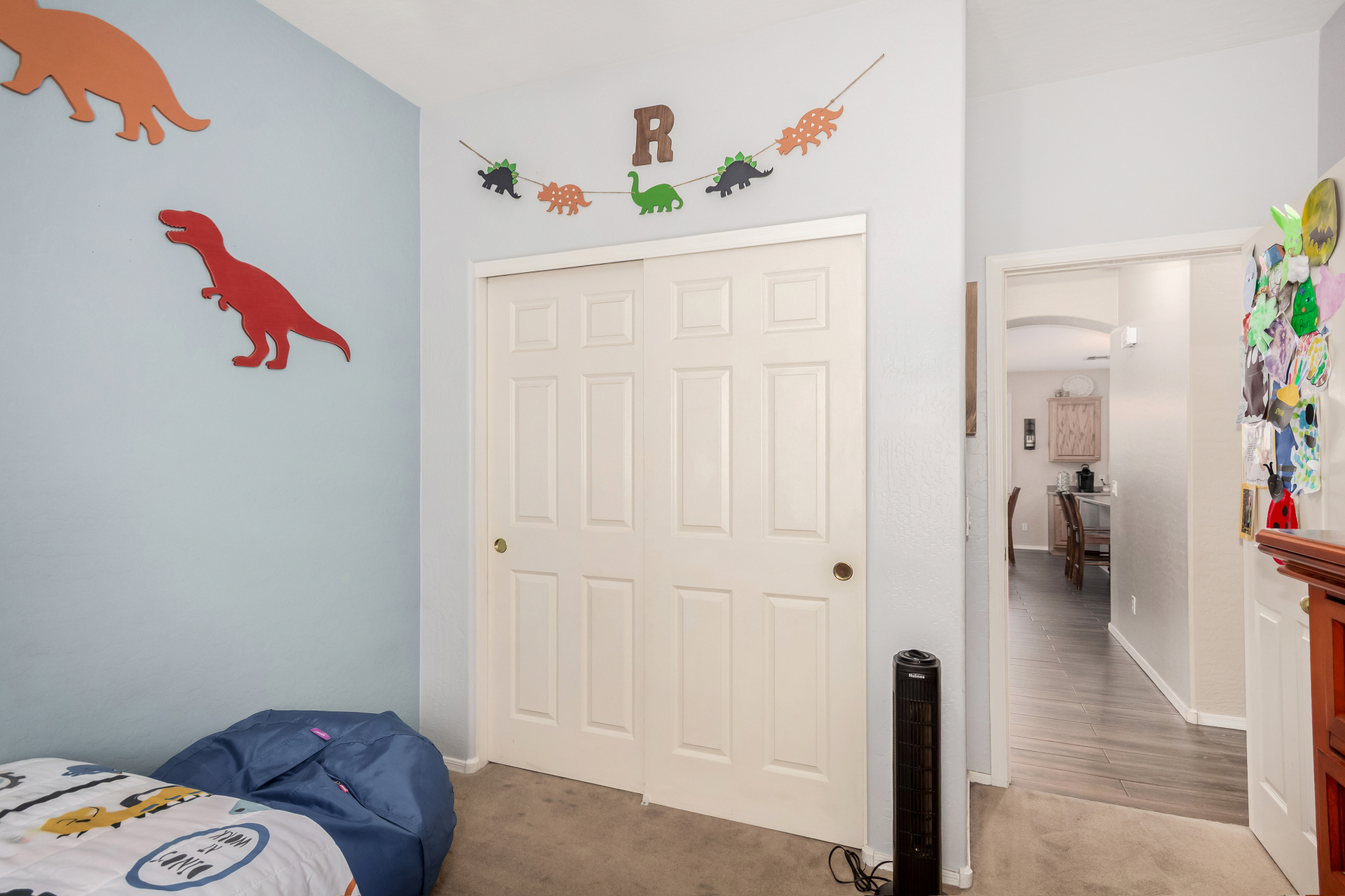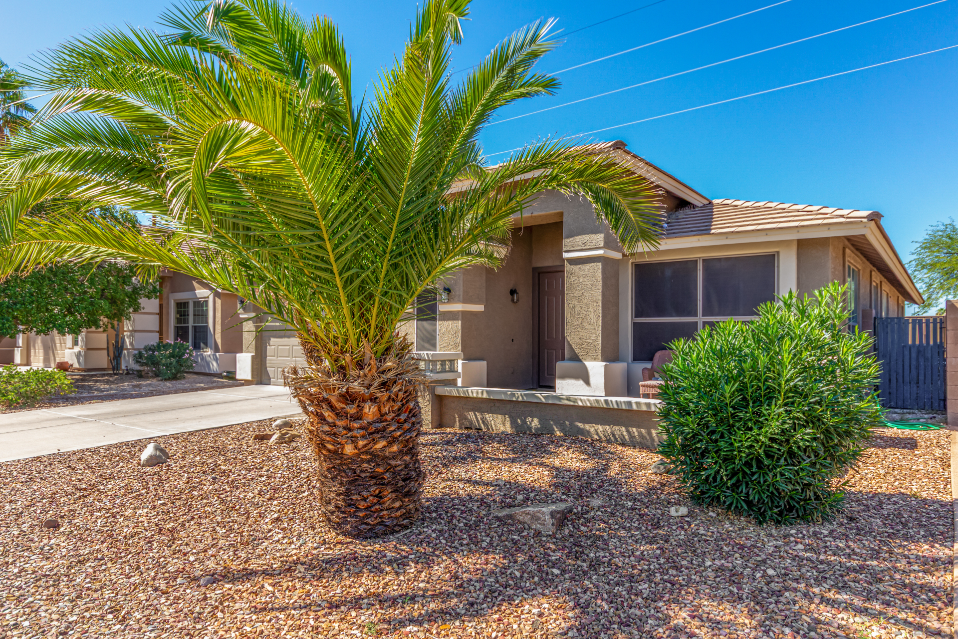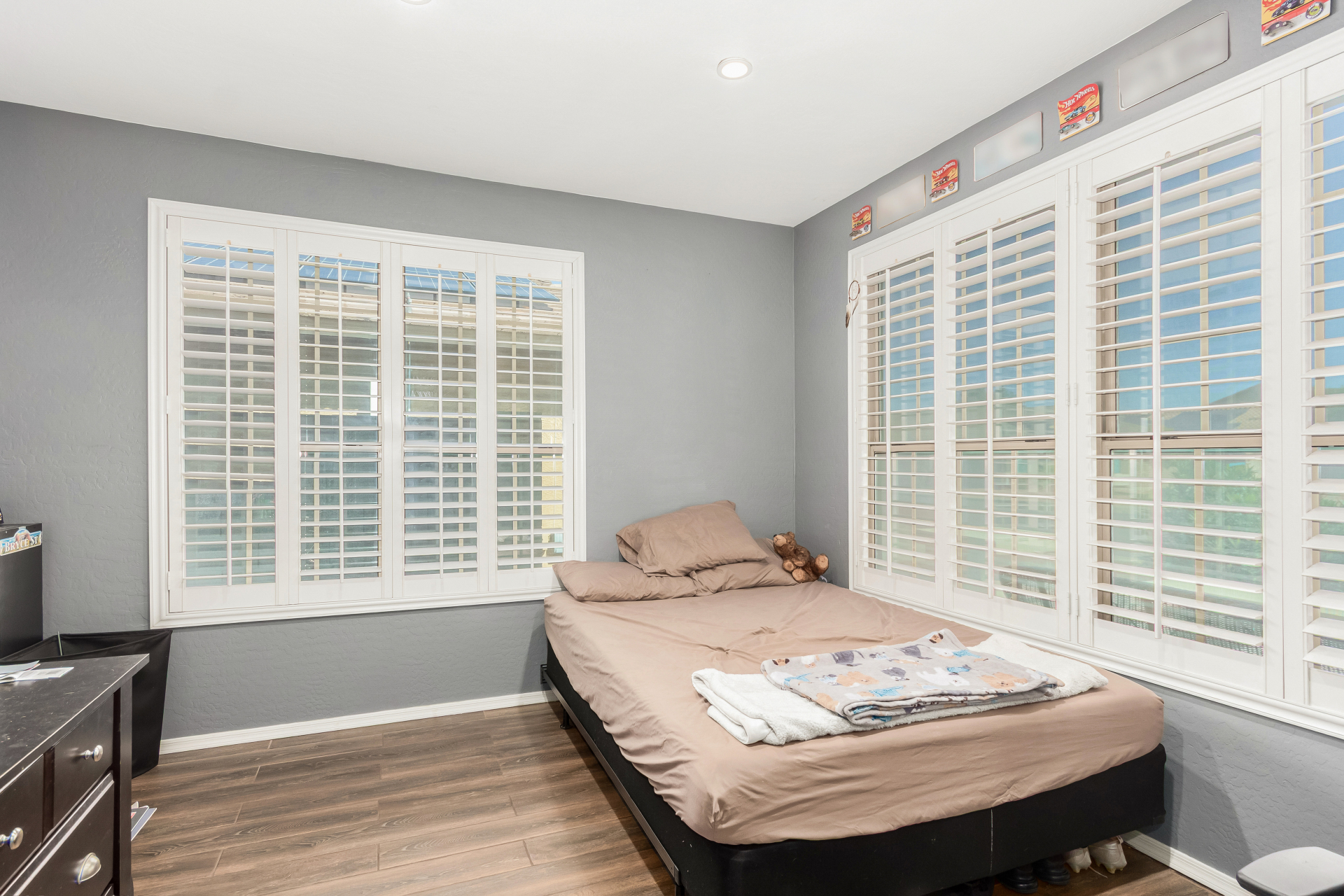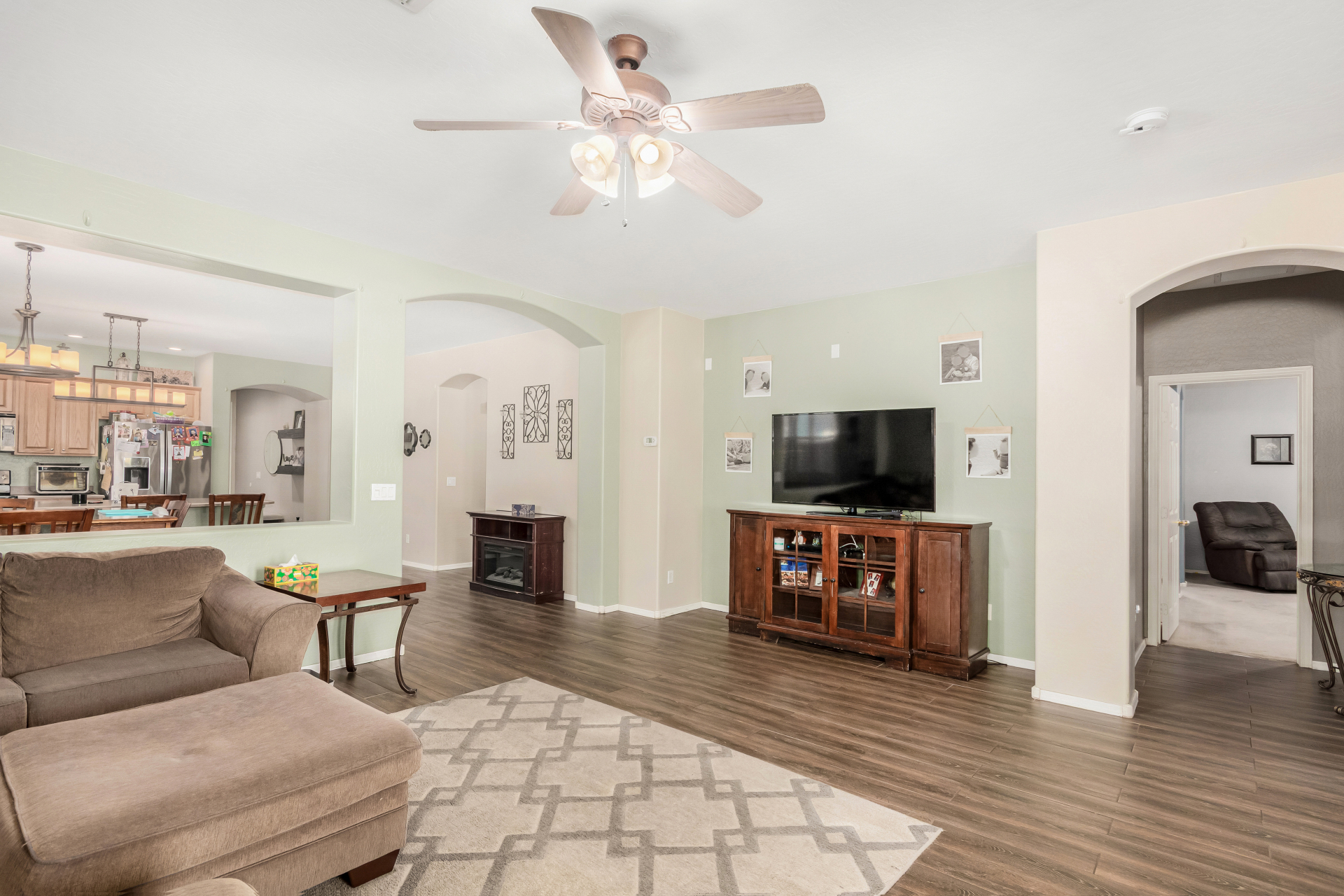 Spacious single-level home 3 bedrooms, 2 bathrooms, bonus room, 2 Car Garage in Dove Valley Ranch! A paver courtyard entrance leads to the front door. The inviting interior features tons of natural light, plantation shutters, designer paint, and wood-look tile flooring w/carpet in all the right places. You'll love the welcoming living room paired with French doors to the back! The eat-in kitchen boasts SS appliances, ample wood cabinetry, a pantry, recessed & pendant lights, and an island w/breakfast bar. Versatile den for an office or extra bedroom as well! Enter the primary bedroom to find an ensuite with dual sinks, a separate tub/shower, & a walk-in closet. The private backyard, with artificial turf & extended paver-covered patio is the ideal spot to relax or enjoy BBQ. Make it yours!